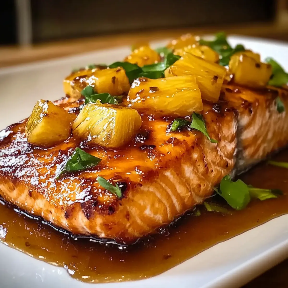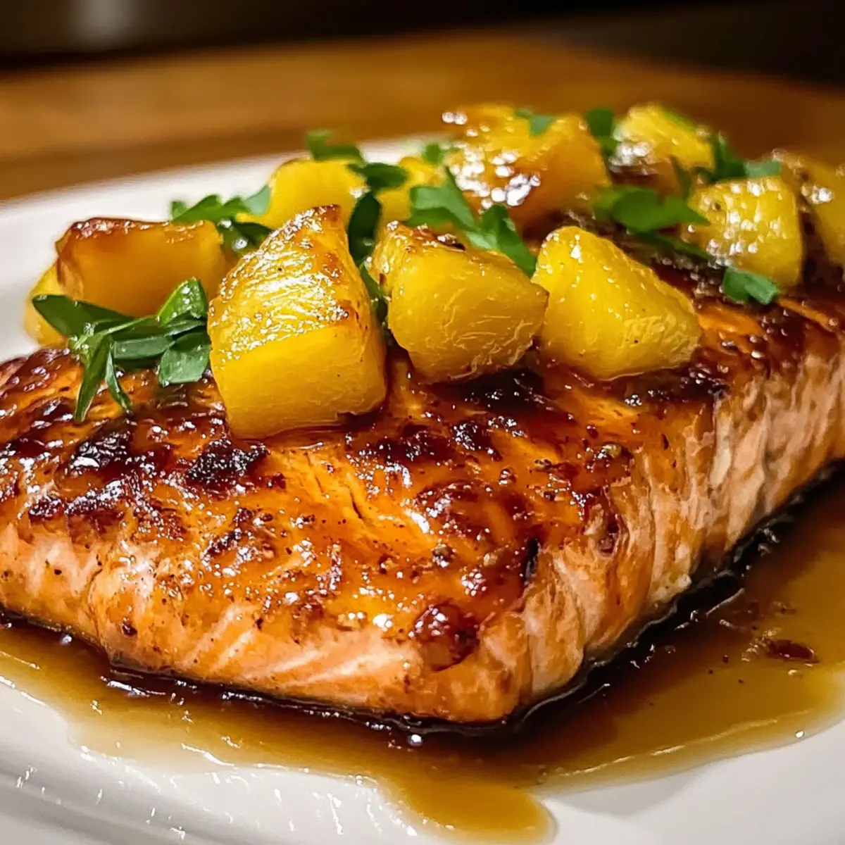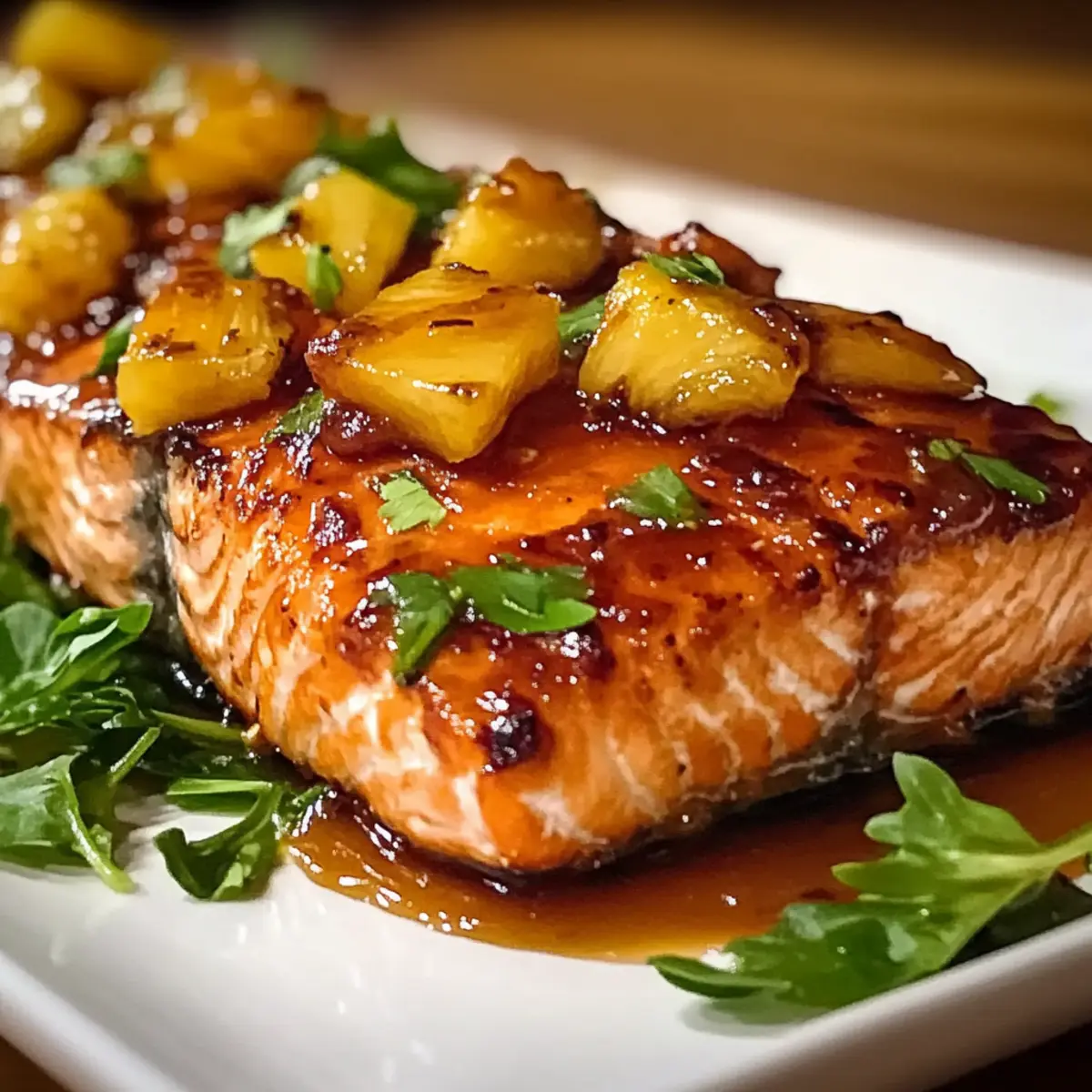 Wenn ich an ein schnelles Abendessen denke, das sowohl Erwachsene als auch Kinder begeistert, kommt mir sofort der Ananassirup-Lachs in den Sinn. Diese köstliche Komposition aus zartem Lachs und einem süß-sauren Ananassirup ist nicht nur eine wahre Gaumenfreude, sondern auch unglaublich leicht zuzubereiten. Mit nur wenigen Zutaten und in weniger als 30 Minuten auf dem Tisch, ist dieses Gericht der perfekte Abschluss eines langen Arbeitstags. Zudem enthält es gesunde Omega-3-Fettsäuren und zeigt, wie einfach gesunde Ernährung sein kann. Wer kann da widerstehen? Bist du bereit, deinen nächsten Abend mit einem Stück tropischen Paradies zu versüßen? Warum wirst du diesen Lachs lieben? Einfachheit: Die Zubereitung ist unkompliziert und erfordert nur wenige Zutaten, ideal für Kochanfänger oder vielbeschäftigte Eltern. Unvergleichlicher Geschmack: Die Kombination aus süßem Ananassirup und herzhaftem Lachs bietet ein Geschmackserlebnis, das sowohl Kinder als auch Erwachsene begeistert. Gesund und nahrhaft: Mit Omega-3-Fettsäuren aus dem Lachs und nährstoffreichen Zutaten ist dieses Gericht nicht nur lecker, sondern auch gesund. Vielfältig und anpassbar: Fühle dich frei, mit verschiedenen Früchten wie Mango zu experimentieren oder die Schärfe mit Chili zu verstärken – die Möglichkeiten sind endlos! Schnell und praktisch: In weniger als 30 Minuten auf dem Tisch, perfekt für ein schnelles Abendessen nach einem langen Tag. Lass dich auch von unseren anderen Rezepten inspirieren, um mehr köstliche und gesunde Gerichte zu entdecken! Ananassirup-Lachs Zutaten Für den Lachs • Lachsfilets – Die Hauptproteinquelle; sorgt für reichhaltigen Geschmack und gesunde Fette. • Olivenöl – Fügt Feuchtigkeit hinzu und hilft beim Würzen. • Salz – Verbessert den Gesamtschmack; für eine kalorienreduzierte Variante weniger verwenden. • Schwarzer Pfeffer – Liefert milde Schärfe; nach Geschmack anpassen. Für den Ananassirup • Ananas (frisch oder aus der Dose) – Gibt Süße und Säure; wichtig für die Glasur. Hinweis: Wenn aus der Dose, gut abtropfen lassen. • Brauner Zucker – Ein Süßungsmittel, das karamellisiert; kann durch Ahornsirup ersetzt werden, um einen anderen Geschmack zu erzielen. • Sojasauce – Fügt Umami hinzu; glutenfreie Sojasauce für eine glutenfreie Variante verwenden. • Reisessig – Balanciert die Süße der Glasur; Apfelessig kann alternativ verwendet werden. • Gehackter Knoblauch – Bringt aromatische Tiefe; optional, aber empfehlenswert. • Frischer Ingwer (optional) – Fügt Wärme und Würze hinzu; Menge nach Wunsch anpassen. Für die Garnitur • Frische Petersilie – Wird als Garnitur für Farbe und Frische verwendet. Es gibt nichts Besseres als diesen köstlichen Ananassirup-Lachs, um Ihr Abendessen zu einem besonderen Erlebnis zu machen! Schritt-für-Schritt-Anleitung für Ananassirup-Lachs Schritt 1: Ofen vorheizen Heize den Ofen auf 200 °C (400 °F) vor. Fette ein Backblech leicht mit etwas Olivenöl ein, um ein Ankleben des Fisches zu verhindern. Achte darauf, dass der Ofen die Temperatur erreicht, bevor du mit der Zubereitung des Ananassirup-Lachs fortfährst, damit der Lachs gleichmäßig gart. Schritt 2: Glasur vorbereiten Vermische in einer kleinen Schüssel den braunen Zucker, die Sojasauce, den Reisessig, den gehackten Knoblauch und den frisch geriebenen Ingwer zu einer homogenen Glasur. Rühre kräftig, bis der Zucker weitgehend aufgelöst ist. Diese köstliche Mischung wird später über den Lachs gegossen und verleiht ihm einen unwiderstehlichen Geschmack. Schritt 3: Lachs vorbereiten Trockne die Lachsfilets gründlich mit Küchenpapier ab, um die Feuchtigkeit zu entfernen. Reibe die Filets dann gleichmäßig mit Olivenöl ein und würze sie großzügig mit Salz und schwarzem Pfeffer. Dies sorgt dafür, dass der Lachs beim Garen saftig bleibt und gleichzeitig gut gewürzt wird. Schritt 4: Lachs in das Backblech legen Lege die gewürzten Lachsfilets mit der Hautseite nach unten in das vorbereitete Backblech. Gieße etwa zwei Drittel der vorbereiteten Glasur gleichmäßig über die Filets. Verteile die gewürfelte Ananas rund um den Lachs, um zusätzlichen Geschmack und eine leckere Beilage zu schaffen. Schritt 5: Lachs backen Schiebe das Backblech in den vorgeheizten Ofen und backe den Lachs 12 bis 15 Minuten lang. Der Lachs ist fertig, wenn er leicht mit einer Gabel auseinanderfällt und die Farbe und Textur schön suav und saftig sind. Für einen zusätzlichen Karamell-Effekt kannst du den Grill des Ofens für die letzten 1-2 Minuten aktivieren. Schritt 6: Lachs ruhen lassen und garnieren Nehme das Backblech aus dem Ofen und lasse den Ananassirup-Lachs etwa 5 Minuten ruhen. Diese Ruhezeit ermöglicht es dem Lachs, die Säfte zu behalten und die Aromen sich zu setzen. Vor dem Servieren mit frisch gehackter Petersilie garnieren, um zusätzlich Farbe und Frische hinzuzufügen. Vorbereitung des Ananassirup-Lachs für stressfreies Kochen Der Ananassirup-Lachs eignet sich hervorragend für die Vorbereitung, um dir Zeit während hektischer Wochentage zu sparen. Die Glasur kannst du bis zu 3 Tage im Voraus zubereiten und im Kühlschrank aufbewahren, sodass die Aromen intensiv werden. Auch die Lachsfilets kannst du bis zu 24 Stunden vorher marinieren, um ihnen einen zusätzlichen Geschmacksschub zu geben. Achte darauf, die Filets gut abzutrocknen, bevor du sie ins Backblech legst, damit sie beim Garen schön saftig bleiben. Wenn es Zeit zum Kochen ist, musst du nur noch den Ofen vorheizen, den Lachs etwa 12-15 Minuten backen und dann mit frisch gehackter Petersilie garnieren. So hast du ein köstliches Gericht mit minimalem Aufwand! Ananassirup-Lachs: Abwechslungsreiche Ideen zur Anpassung Fühle dich frei, dieses köstliche Rezept ganz nach deinem Geschmack zu gestalten und dabei neue Aromen zu entdecken! Glutenfrei: Verwende Tamari anstelle von Sojasauce, um die glutenfreie Variante zu genießen. So behältst du de