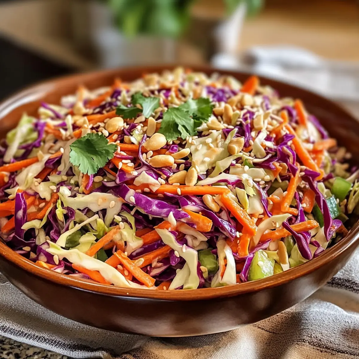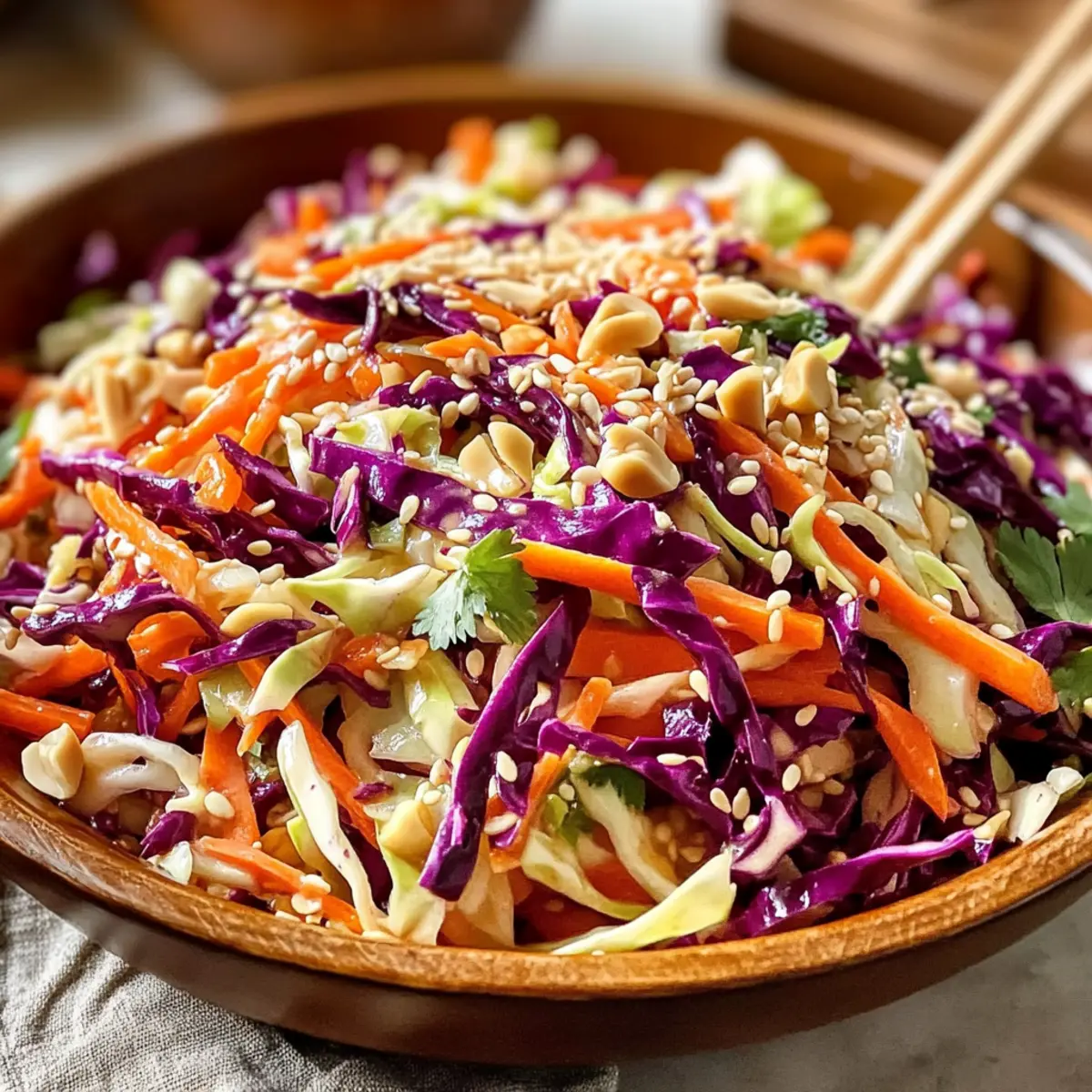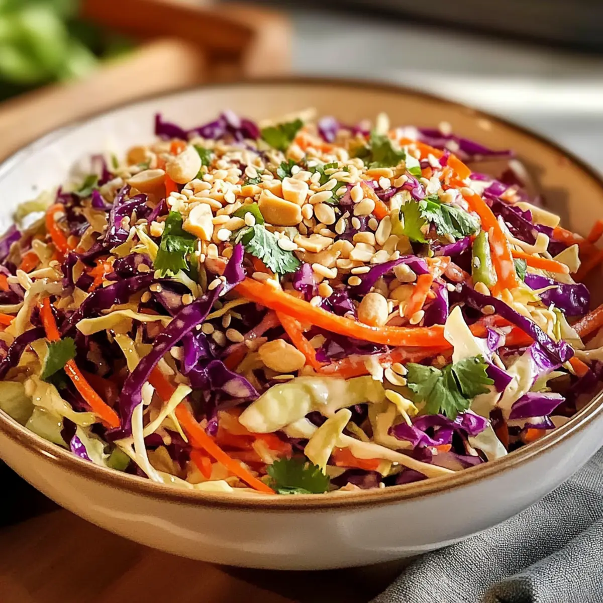 Ein knackiger Biss, gefolgt von einer Welle aus süßem und würzigem Geschmack – das ist der erste Eindruck, den dieser Asiatische Krautsalat mit Sesamdressing hinterlässt. Wenn ich diesen erfrischenden Salat zubereite, fühle ich mich immer, als würde ich eine leckere Reise nach Asien antreten, ohne die eigenen vier Wände zu verlassen. Die Kombination aus frischen, knackigen Zutaten macht ihn nicht nur zu einer idealen Beilage für gegrillte Köstlichkeiten, sondern auch zu einem perfekten Meal-Prep-Gericht, das mit der Zeit sogar noch besser wird. Und das Beste? Die Zubereitung geht so schnell, dass du mehr Zeit für die schönen Dinge im Leben hast. Bist du bereit, dein nächstes Beilagen-Highlight zu entdecken? Warum wirst du diesen Krautsalat lieben? Frische Aromen: Der Asiatische Krautsalat begeistert mit einer Mischung aus knackigen Gemüsesorten und einem unwiderstehlichen Sesamdressing, das süß und würzig zugleich ist. Einfache Zubereitung: In nur wenigen Schritten hast du einen bunten Salat, der den Aufwand nicht vermuten lässt! Ideal für Kochanfänger und erfahrene Chefs gleichermaßen. Vielseitigkeit: Ob als Beilage zu gegrilltem Fleisch, in Buddha-Bowls oder einfach als erfrischender Snack – dieser Salat passt zu jedem Anlass. Zeitersparnis: Perfekt für Meal-Prep, da du ihn im Voraus zubereiten kannst – die Aromen verbinden sich im Kühlschrank noch besser. Gesund und Glutenfrei: Mit frischen Zutaten ist dieser Salat nicht nur geschmacklich ein Hit, sondern auch eine gesunde Wahl für dich und deine Lieben. Zutaten für den Asiatischen Krautsalat mit Sesamdressing • Für eine einfache Übersicht: Hier sind die Zutaten, die du für deinen Asiatischen Krautsalat mit Sesamdressing benötigst. Für das Dressing Cider-Essig – Liefert Säure und einen pikanten Geschmack; Reisessig kann für einen milderen Geschmack verwendet werden. Zucker – Fügt Süße hinzu und gleicht die Säure des Essigs aus; Honig oder Agavennektar sind natürliche Alternativen. Sesamöl – Verleiht ein tiefes, nussiges Aroma; das Toasten verstärkt den Geschmack. Verwende bei Bedarf Olivenöl für eine andere Note. Sesamsamen – Sorgt für Knusprigkeit und Nussigkeit; in einer trockenen Pfanne anrösten für das beste Aroma. Salz – Verstärkt den Gesamtgeschmack; nach Geschmack anpassen. Gemahlener Ingwer – Fügt Wärme hinzu; frischer Ingwer kann für intensiveren Geschmack verwendet werden. Schwarzer Pfeffer – Für die Würze; nach Geschmack anpassen. Für den Salat Karotte – In Streifen für Farbe und Süße; kann durch Radieschen für einen schärferen Crunch ersetzt werden. Koriander – Frisches Kraut, das das Gericht aufhellt; kann weggelassen werden, wenn du weniger Kräuter magst. Frühlingszwiebeln – Fügt einen milden Zwiebelgeschmack hinzu; Schalotten können eine Alternative sein. Rote Kohl – Sorgt für Crunch und Farbe; alternativ kann grüner Kohl verwendet werden. Grüner Kohl – Mild im Geschmack, trägt zur Textur bei; beide Sorten können allein oder zusammen verwendet werden. Geschälte Edamame – Fügt Protein und Textur hinzu; kann durch Erbsen für eine ähnliche Süße ersetzt werden. Rote Paprika – Für Süße und Farbe; kann durch gelbe oder orange Paprika ersetzt werden. Erdnüsse – Geben einen knackigen Biss; können durch Cashews ersetzt oder weggelassen werden für eine nussfreie Version. Schritt-für-Schritt-Anleitung für Asiatischer Krautsalat mit Sesamdressing Step 1: Dressing vorbereiten In einer großen Schüssel vermischst du Cider-Essig, Zucker, Sesamöl, Salz, gemahlenen Ingwer und schwarzen Pfeffer. Verrühre alles gründlich mit einem Schneebesen, bis sich der Zucker vollständig aufgelöst hat, und das Dressing eine homogene Konsistenz erreicht. Dieser Schritt sorgt dafür, dass das Dressing gleichmäßig verteilt wird und die Aromen gut miteinander harmonieren. Step 2: Sesamsamen rösten Erhitze eine trockene Pfanne bei mittlerer Hitze und gib die Sesamsamen hinein. Röste sie für etwa 2-3 Minuten, bis sie goldbraun und duftend sind, und achte darauf, sie regelmäßig umzurühren, um ein Anbrennen zu vermeiden. Wenn sie bereit sind, gib die gerösteten Samen zum Dressing und vermische alles gut. Step 3: Gemüse waschen und schneiden Wasche den roten und grünen Kohl gründlich und lasse sie gut abtropfen. Anschließend schneidest du beide Kohlsorten in feine Streifen und raspelst die Karotte in gleichmäßige, etwa 0,5 cm dicke Stücke. Achte darauf, dass das Gemüse frisch und knackig ist, um den leckeren Crunch des Asiatischen Krautsalats zu gewährleisten. Step 4: Zutaten kombinieren Füge in die große Schüssel mit dem Dressing die geschnittenen Kohlsorten, die geraspelte Karotte, gewürfelte rote Paprika, geschälte Edamame, frischen Koriander und die geschnittenen Frühlingszwiebeln hinzu. Diese bunte Mischung sorgt für eine ansprechende Präsentation und ergänzt den Geschmack des Dressings perfekt. Step 5: Alles gut vermengen Mit einer Zange oder zwei Gabeln vermengst du das Gemüse sorgfältig, damit es gleichmäßig mit dem Dressing umhüllt wird. Achte darauf, alle Zutaten gut zu mischen, sodass jede Komponente des Asiatischen Krautsalats mit dem köstlichen Dressing in Kontakt kommt und intensiviert wird. Step 6: Kühlen Decke die Schüssel mit Frischhaltefolie ab und stelle den Asiatischen Krautsalat mit Sesamdressing für mindestens 30 Minuten in den Kühlschrank. Das Kühlen ermöglicht es den Aromen, sich zu verbinden und intensiviert den Geschmack, wodurch der Salat noch erfrischender wird. Step 7: Servieren Kurz vor dem Servieren streust du die gehackten Erdnüsse über den Salat, um einen knusprigen Kontrast zu schaffen. Dieser letzte Schritt sorgt dafür, dass die Nüsse ihren Crunch behalten und der Asiatische Krautsalat mit Sesamdressing perfekt serviert wird. Aufbewahrungstipps für Asiatischen Krautsalat mit Sesamdressing Kühlschrank: Bewahre den Asiatischen Krautsalat in einem luftdicht verschl
