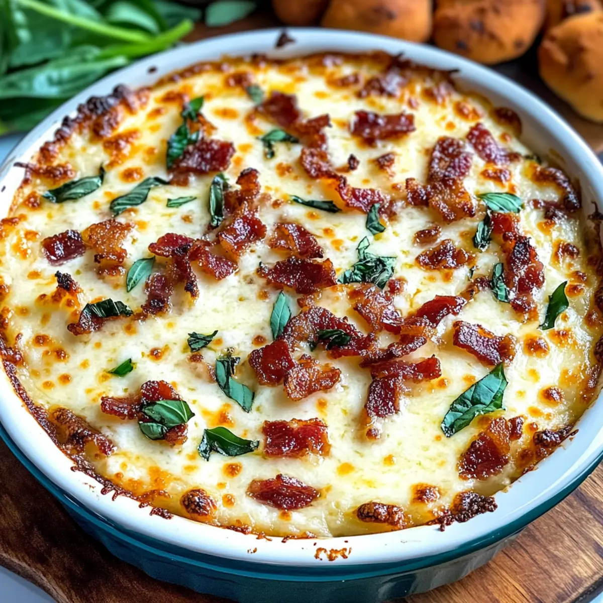 7. Nehme den Dip aus dem Ofen und streue die restlichen Baconstruktur und frisch gehacktes Basilikum darauf.