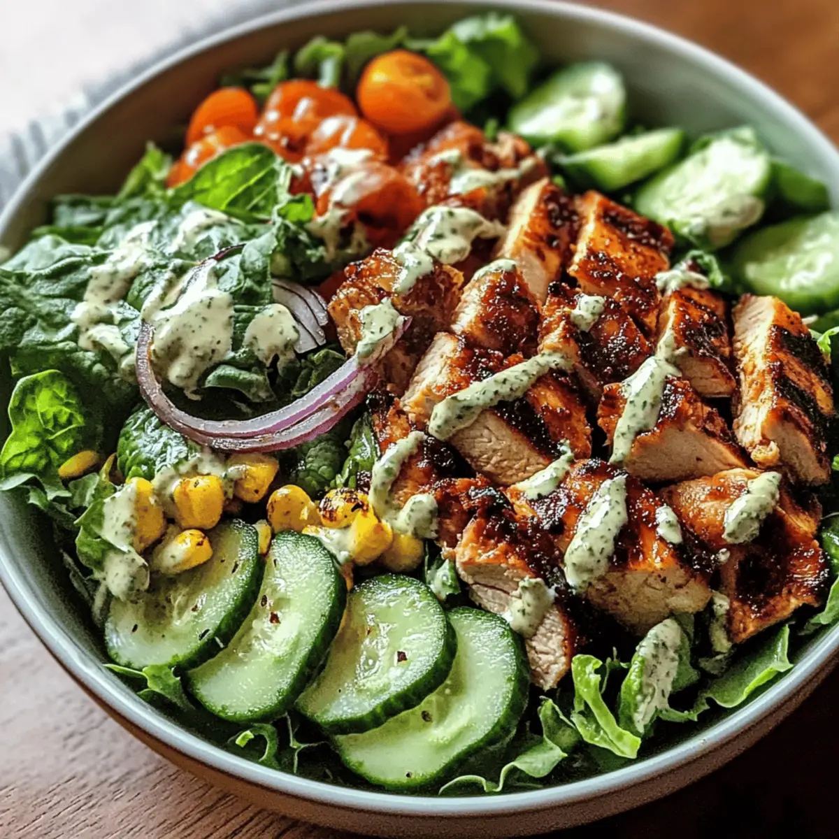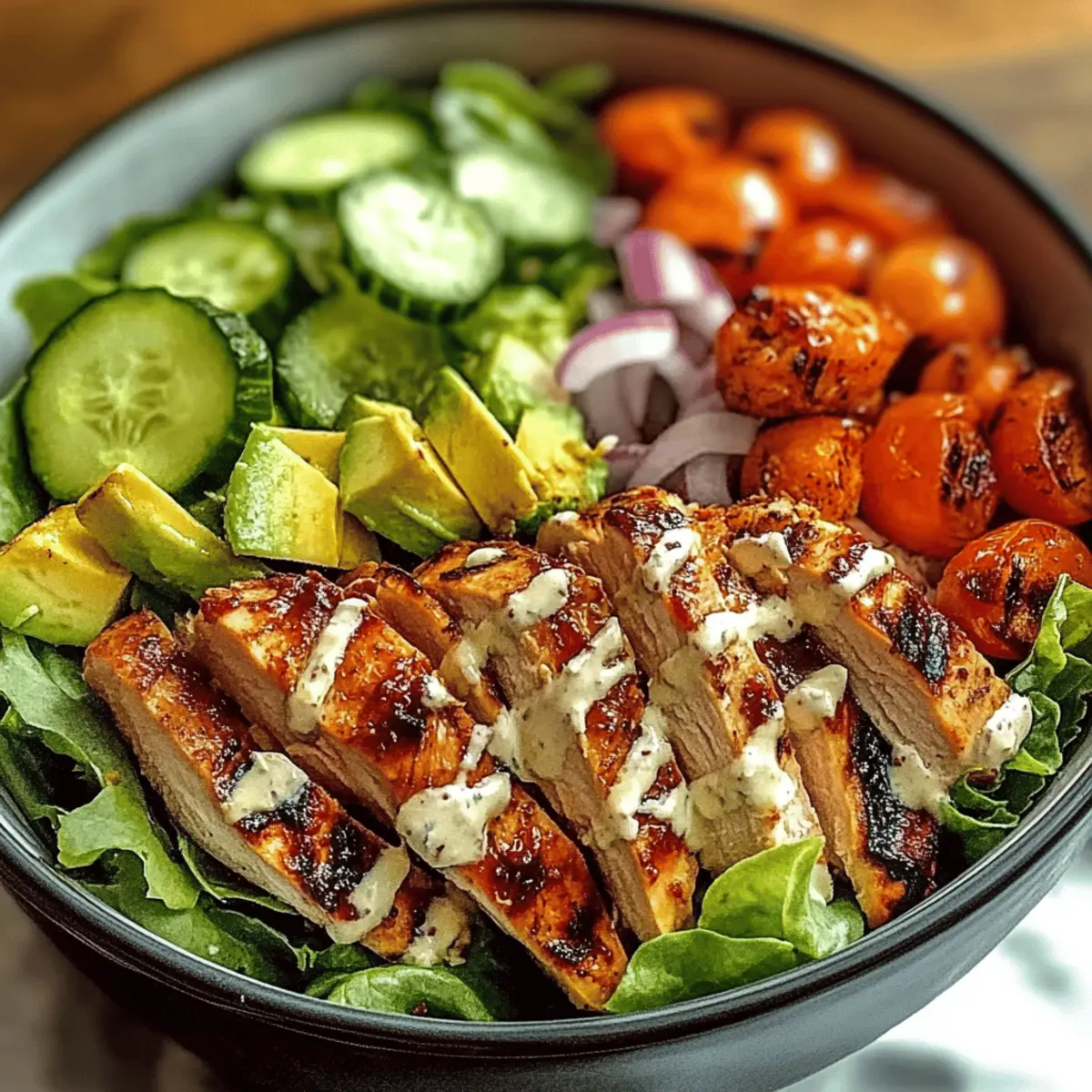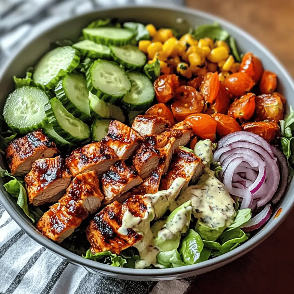 Die Sonne strahlt und es ist Zeit für frische, leckere Gerichte! Inmitten all dieser warmen Tage ist mein BBQ Hähnchen geschnittener Salat der perfekte Begleiter. Diese erfrischende Kombination aus rauchigem, zartem Hähnchen und knackigem Gemüse hebt jedes Mittagessen auf ein neues Niveau. Was ich so an diesem Rezept liebe, ist nicht nur die einfache Zubereitung, sondern auch die unendlichen Anpassungsmöglichkeiten – perfekt, um verschiedene Geschmäcker zu bedienen oder neue Zutaten auszuprobieren. Egal, ob als leichtes Mittagessen oder als Beilage zum Grillen, dieser Salat wird sicherlich zum neuen Favoriten in deiner Küche! Bist du bereit, deinen nächsten Grillabend aufzupeppen? Warum wirst du diesen Salat lieben? Einfache Zubereitung: Die Schritte sind übersichtlich, du benötigst nur ein paar grundlegende Kochfähigkeiten, um diesen leckeren Salat zu zaubern. Vielseitig kombinierbar: Du kannst die Zutaten nach Lust und Laune anpassen, zum Beispiel mit Tofu oder anderen Gemüsesorten. Frischer Geschmack: Die Kombination aus rauchigem Hähnchen und knackigem Gemüse sorgt für ein Geschmackserlebnis, das deine Geschmacksknospen begeistert. Gesunde Wahl: Dieser Salat ist nicht nur köstlich, sondern auch nährstoffreich und hat den perfekten Balanceakt zwischen Eiweiß und Vitaminen. Perfekt für jede Gelegenheit: Ob als leichtes Mittagessen oder als Beilage zu deinem BBQ, dieser Salat wird garantiert zum Hit auf deinem Tisch! Du wirst den Unterschied im Vergleich zu herkömmlichen Fast-Food-Salaten sofort merken – probiere ihn mit etwas hausgemachter BBQ-Sauce! BBQ Hähnchen geschnittener Salat Zutaten • Bereite dich darauf vor, einen erfrischenden und gesunden Salat zu genießen! Für das Hähnchen Hähnchenbrust – sorgt für eine proteinreiche Basis; in BBQ-Sauce marinieren für zusätzlichen Geschmack. BBQ-Sauce – gibt eine rauchige Süße; wähle eine zuckerreduzierte oder hausgemachte Variante für mehr Gesundheit. Für das Gemüse Tomaten – bringen frische Saftigkeit; beliebige Sorten sind möglich, aber Kirschtomaten sind süßer. Avocado – sorgt für Cremigkeit und gesunde Fette; ersetze sie durch Hummus für mehr Creaminess oder lasse sie weg, um den Fettgehalt zu senken. Gurken – bieten einen knackigen Biss und sorgen für Hydration; Zucchini ist eine kreative Alternative. Rote Zwiebeln – fügen Schärfe und Farbe hinzu; grünen Zwiebeln können für einen milderen Geschmack verwendet werden. Salatmix – bildet die Grundlage; Arugula oder Spinat sorgen für zusätzliche Nährstoffe. Du kannst diesen BBQ Hähnchen geschnittenen Salat ganz nach deinem Geschmack anpassen! Step-by-Step Instructions for BBQ Hähnchen geschnittener Salat Step 1: Hähnchen marinieren Bestreiche die Hähnchenbrust großzügig mit der BBQ-Sauce und lasse sie mindestens 30 Minuten marinieren. Dadurch zieht der rauchige Geschmack ins Fleisch ein. Du kannst die Hähnchenbrust auch über Nacht im Kühlschrank marinieren, um das Aroma zu intensivieren. Step 2: Hähnchen grillen Heize deinen Grill auf mittlere bis hohe Temperatur vor (ungefähr 200 °C). Lege die marinierten Hähnchenbrüste auf den Grill und koche sie jeweils 6-7 Minuten pro Seite, bis sie eine goldene Kruste haben und der Saft klar austritt. Die Hähnchenbrust sollte eine Innentemperatur von 75 °C erreichen, um sicher zu sein, dass sie durchgegart ist. Step 3: Salatbasis vorbereiten Während das Hähnchen grillt, wasche und schneide den Salatmix, die Gurken, die Tomaten, die Avocado und die roten Zwiebeln in mundgerechte Stücke. Achte darauf, dass die Gemüse frisch und knackig sind, um den besten Geschmack für deinen BBQ Hähnchen geschnittenen Salat zu erhalten. Step 4: Salat anrichten Nimm das gegrillte Hähnchen vom Grill und lasse es einige Minuten ruhen, bevor du es in Scheiben schneidest. In einer großen Schüssel vermischst du die vorbereiteten Gemüsestücke. Lege die geschnittenen Hähnchenstücke obenauf und genieße den bunten Anblick. Step 5: Anrichten & servieren Tropfe bei Bedarf etwas zusätzliche BBQ-Sauce oder dein Lieblingsdressing über den Salat. Vermische alles vorsichtig, um die Aromen zu verbinden. Sofort servieren und dich an einer köstlichen, gesunden Mahlzeit mit BBQ Hähnchen geschnittenem Salat erfreuen! Meal Prep Tipps für BBQ Hähnchen geschnittenen Salat Bereite deinen BBQ Hähnchen geschnittenen Salat im Voraus zu, um Zeit zu sparen und stressfreie Mahlzeiten zu genießen! Das Hähnchen kannst du bis zu 24 Stunden im Voraus marinieren. Einfach in BBQ-Sauce eintauchen und im Kühlschrank aufbewahren, damit es die Aromen intensiv aufnehmen kann. Das Gemüse, wie Tomaten, Gurken und Avocado, kannst du ebenfalls vorbereiten und in luftdichten Behältern bis zu 3 Tage im Kühlschrank lagern – so bleibt alles frisch und knackig. Achte darauf, die Avocado erst kurz vor dem Servieren hinzuzufügen, um eine Braunfärbung zu vermeiden. Wenn du bereit bist, das Gericht zusammenzustellen, grille das Hähnchen und schneide es direkt vor dem Servieren auf den vorbereiteten Salat. So kannst du trotz deiner vollen Woche großartige, gesunde Mahlzeiten genießen! Variationen des BBQ Hähnchen geschnittenen Salats Mach diesen Salat ganz nach deinem Geschmack und genieße die Vielfalt der Möglichkeiten! Vegetarisch: Tausche das Hähnchen gegen gewürfelten Tofu aus, der in BBQ-Sauce mariniert wurde, für eine leckere pflanzenbasierte Option. So bleibt der rauchige Geschmack erhalten und du verpasst nichts! Glutenfrei: Achte darauf, dass deine BBQ-Sauce glutenfrei ist, um diese Mahlzeit für alle Genüsse geeignet zu machen. So kann jeder in den Genuss kommen. Extra Protein: Füge schwarze Bohnen oder Kichererbsen hinzu, um den Salat noch nährstoffreicher zu machen. Diese Hülsenfrüchte bringen nicht nur Proteine, sondern auch eine angenehme Cremigkeit mit. Würzige Note: Mische etwas eingelegte Jalapeños oder eine scharfe Salsa in den Salat, um ihm einen feurigen Kick zu verleihen. Ide
