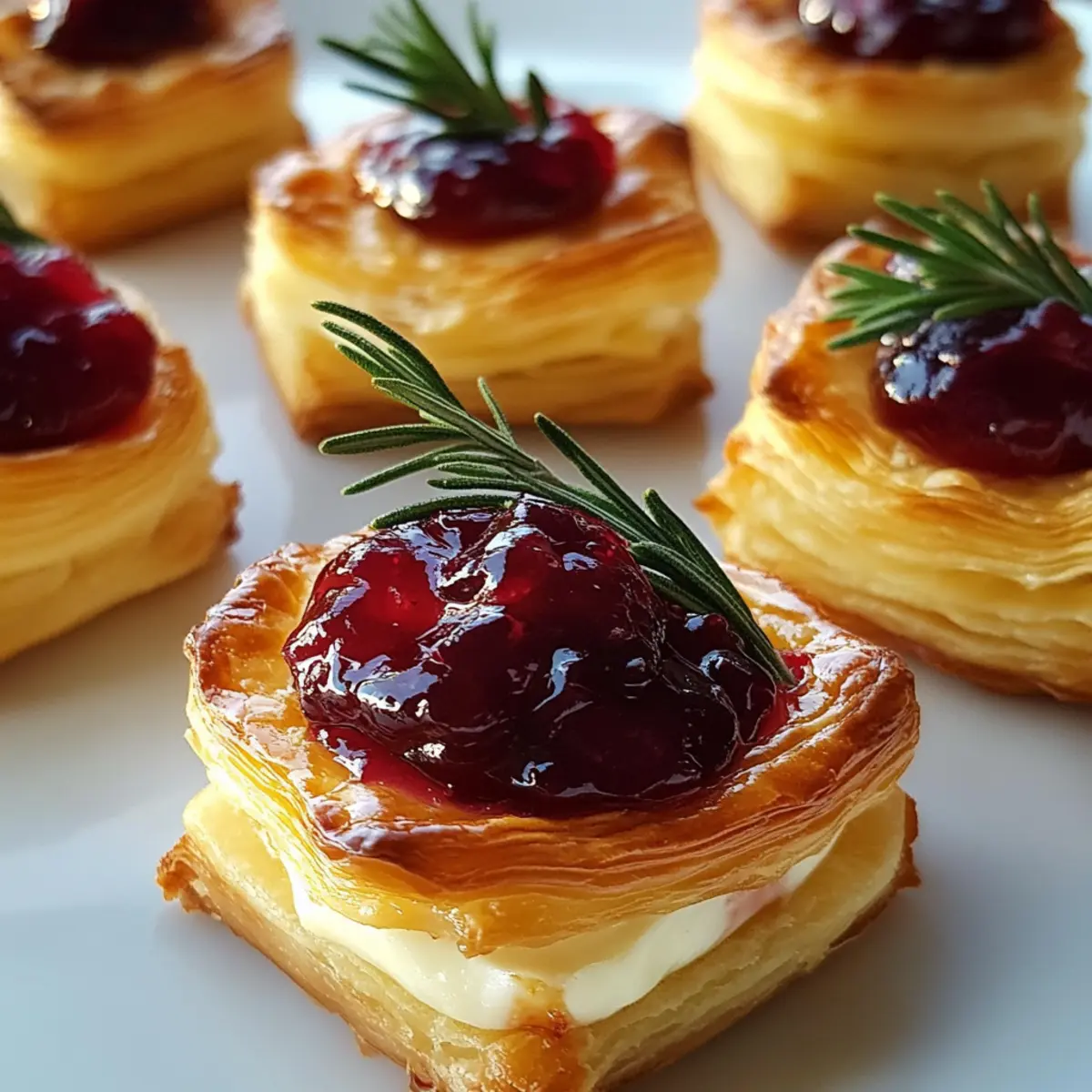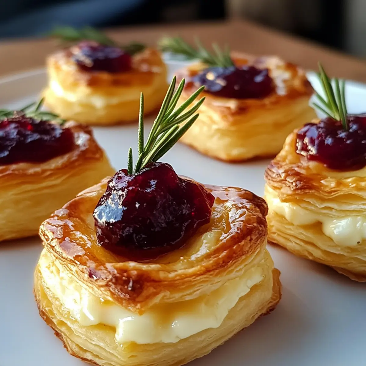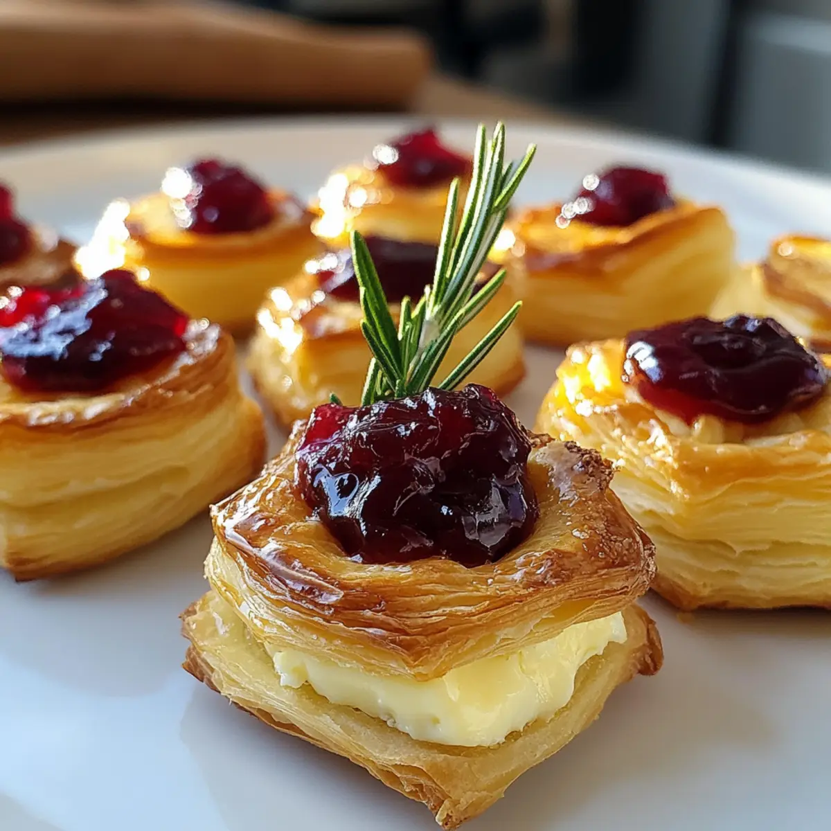 Die goldene Kruste des Blätterteigs knistert verführerisch, während ich die kleinen Häppchen aus dem Ofen hole. Diese Blätterteig-Häppchen mit Camembert sind nicht nur ein Augenschmaus, sondern auch ein wahrer Genuss für den Gaumen. Mit ihrem geschmolzenen, cremigen Kern und der perfekten Kombination aus süßer Preiselbeermarmelade und aromatischem Rosmarin sind sie die ideale Fingerfood-Option für jede Gelegenheit, sei es eine festliche Feier oder ein gemütliches Beisammensein mit Freunden. Darüber hinaus sind sie kinderleicht zuzubereiten, was sie zu einer wahren Rettung für jeden Kochabend macht. Neugierig, wie einfach diese kleinen Highlights umzusetzen sind? Lass uns gemeinsam in die Zubereitung eintauchen! Warum wirst du diese Häppchen lieben? Einfachheit pur: Die Zubereitung dieser Blätterteig-Häppchen erfordert kaum Erfahrung in der Küche und ist schnell erledigt – ideal für spontane Gäste oder den kleinen Hunger zwischendurch. Himmlischer Geschmack: Die Kombination aus cremigem Camembert und süßer Preiselbeermarmelade sorgt für ein Geschmacksfeuerwerk, das einfach begeistert. Vielseitige Alternativen: Variiere die Marmelade oder probiere andere Käsesorten aus, um deinem eigenen Stil gerecht zu werden. Perfekt für jede Gelegenheit: Ob auf Partys, beim Familienessen oder als Snack – dieses Fingerfood ist ein echter Publikumsmagnet. Wunderbare Textur: Das blätterteigähnliche Äußere ist knusprig und golden, während das Innere geschmolzen und cremig bleibt, ein echter Genuss für alle Sinne. Verpasse nicht auch unsere anderen leckeren Rezepte, wie die Käseplatte voll mit Variationen, um deine Gäste zu begeistern! Blätterteig-Häppchen mit Camembert Zutaten Zutatenübersicht: Diese schmackhaften Blätterteig-Häppchen mit Camembert sind schnell und einfach zuzubereiten und machen dein Kochen zu einem Vergnügen! Für den Teig • Blätterteig – Dieser sorgt für einen herrlich knusprigen und luftigen Biss; am besten frisch oder gefroren aus dem Supermarkt verwenden. Für die Füllung • Camembert – Gibt den Häppchen eine cremige und reichhaltige Note; Brie kann ebenfalls verwendet werden, wenn du eine ähnliche Geschmackserfahrung suchst. Für die Süße • Preiselbeermarmelade – Sie bringt eine süße, fruchtige Note in die Häppchen; probiere auch Feigen- oder Aprikosenmarmelade für einen neuen Twist. Für den Glanz • Ei – Das verquirlte Ei sorgt für eine goldbraune, appetitliche Oberfläche; ein tolles Finish für deine Häppchen. Für das Extra • Frisch gemahlener Pfeffer – Ein Hauch von Würze, um die Aromen zu intensivieren; optional, aber absolut empfehlenswert. Für den Duft • Rosmarin – Dieser aromatische Kräuter wird die Häppchen verfeinern; kannst du durch Thymian ersetzen oder ganz weglassen, wenn gewünscht. Mit diesen Zutaten bist du bestens gerüstet, um die köstlichen Blätterteig-Häppchen mit Camembert zu zaubern. Lass deiner Kreativität freien Lauf und überrasche deine Gäste! Schritt-für-Schritt-Anleitung für Blätterteig-Häppchen mit Camembert Step 1: Ofen vorheizen Heize deinen Ofen auf 220°C vor. Während der Ofen aufheizt, bereite die Arbeitsfläche vor. Ein sauberes Schneidebrett oder eine große Arbeitsplatte ist ideal, um den Blätterteig gleichmäßig auszurollen. Step 2: Blätterteig ausrollen Rolle den Blätterteig auf der vorbereiteten Fläche gleichmäßig aus, bis er etwa 3 mm dick ist. Achte darauf, dass er nicht an der Fläche kleben bleibt. Anschließend bestreiche die Oberfläche mit dem verquirlten Ei, um einen schönen Glanz zu erhalten. Step 3: Teig falten und würzen Falte den ausgerollten Teig in der Mitte, sodass die bestrichene Seite innen ist. Bestreiche die Oberseite des gefalteten Teigs erneut mit Ei und streue frisch gemahlenen Pfeffer darüber, um den Geschmack der Blätterteig-Häppchen mit Camembert zu intensivieren. Step 4: Teig schneiden Nutze ein scharfes Messer oder einen Pizzaschneider, um den gefalteten Teig in 16 gleich große Stücke zu schneiden. Achte darauf, gleichmäßige Quadrate zu formen, damit alle Häppchen gleichmäßig backen. Lege die Teigstücke auf ein mit Backpapier ausgelegtes Backblech. Step 5: Camembert vorbereiten Schneide den Camembert in 16 gleichmäßige Scheiben. Jede Scheibe sollte etwa einen halben Zentimeter dick sein, damit sie beim Backen gleichmäßig schmilzt. Lege eine Scheibe Camembert auf jedes Teigstück und drücke sie leicht an, sodass der Käse in den Teig sinkt. Step 6: Backen Schiebe das Backblech in den vorgeheizten Ofen und backe die Häppchen für etwa 15 Minuten. Sie sind fertig, wenn der Blätterteig knusprig und goldbraun ist und der Käse zu schmelzen beginnt. Step 7: Anrichten und garnieren Lass die Blätterteig-Häppchen mit Camembert nach dem Backen kurz abkühlen. Toppe jedes Häppchen mit einem Klecks Preiselbeermarmelade und garniere es mit einem Zweig frischem Rosmarin, um zusätzliches Aroma und eine ansprechende Optik zu erzielen. Was serviert man zu Blätterteig-Häppchen mit Camembert? Die perfekte Kombination aus knusprigem Teig und cremigem Käse lässt sich wunderbar durch eine Auswahl an Beilagen ergänzen. Frischer Salat: Ein leichter grüner Salat mit einem Zitronen-Dressing bringt eine frische Säure, die die reichhaltigen Häppchen perfekt ausbalanciert. Dip aus Kräutern: Ein cremiger Kräuterdip sorgt für zusätzliche Frische und hebt die Aromen der Blätterteig-Häppchen mit Camembert hervor. Ein Hauch von Knoblauch kann die Kombination abrunden. Minz-Joghurt-Dip: Dieser erfrischende Dip ergänzt die herzhaften Noten des Camemberts ideal und bringt eine angenehme Frische, die den Gaumen belebt. Rotwein: Ein leichter Rotwein, wie ein Pinot Noir, rundet das Geschmackserlebnis ab und harmoniert wunderbar mit dem geschmolzenen Käse und der Marmelade. Oliven: Die salzigen, aromatischen Oliven bieten einen tollen Kontrast zu den süßen Häppchen und fügen eine interessante Textur hinzu. Obstplatt