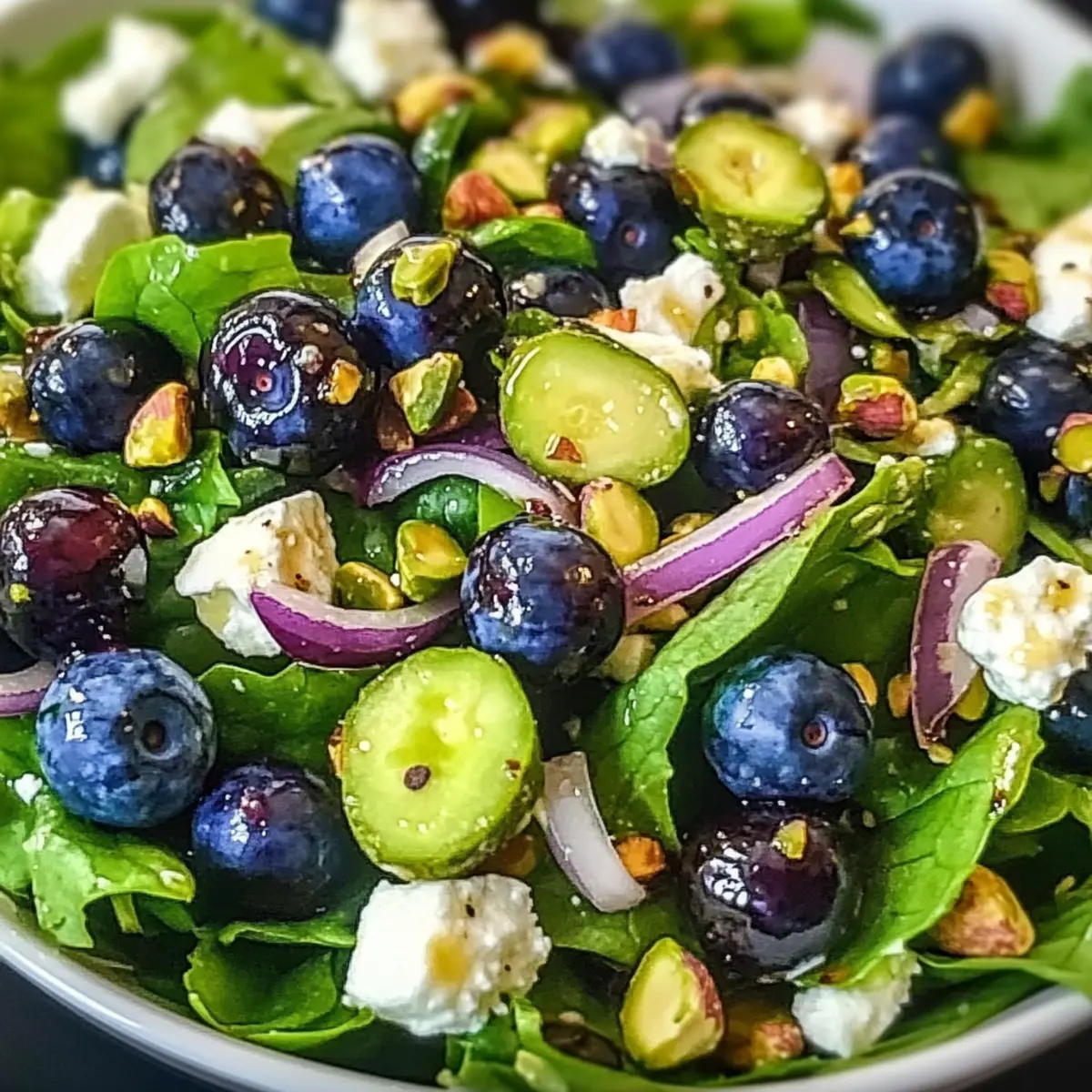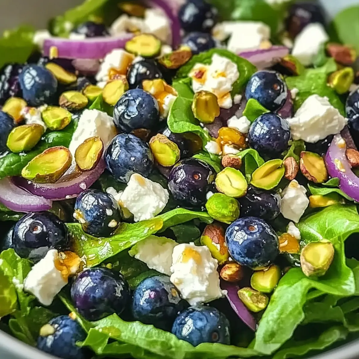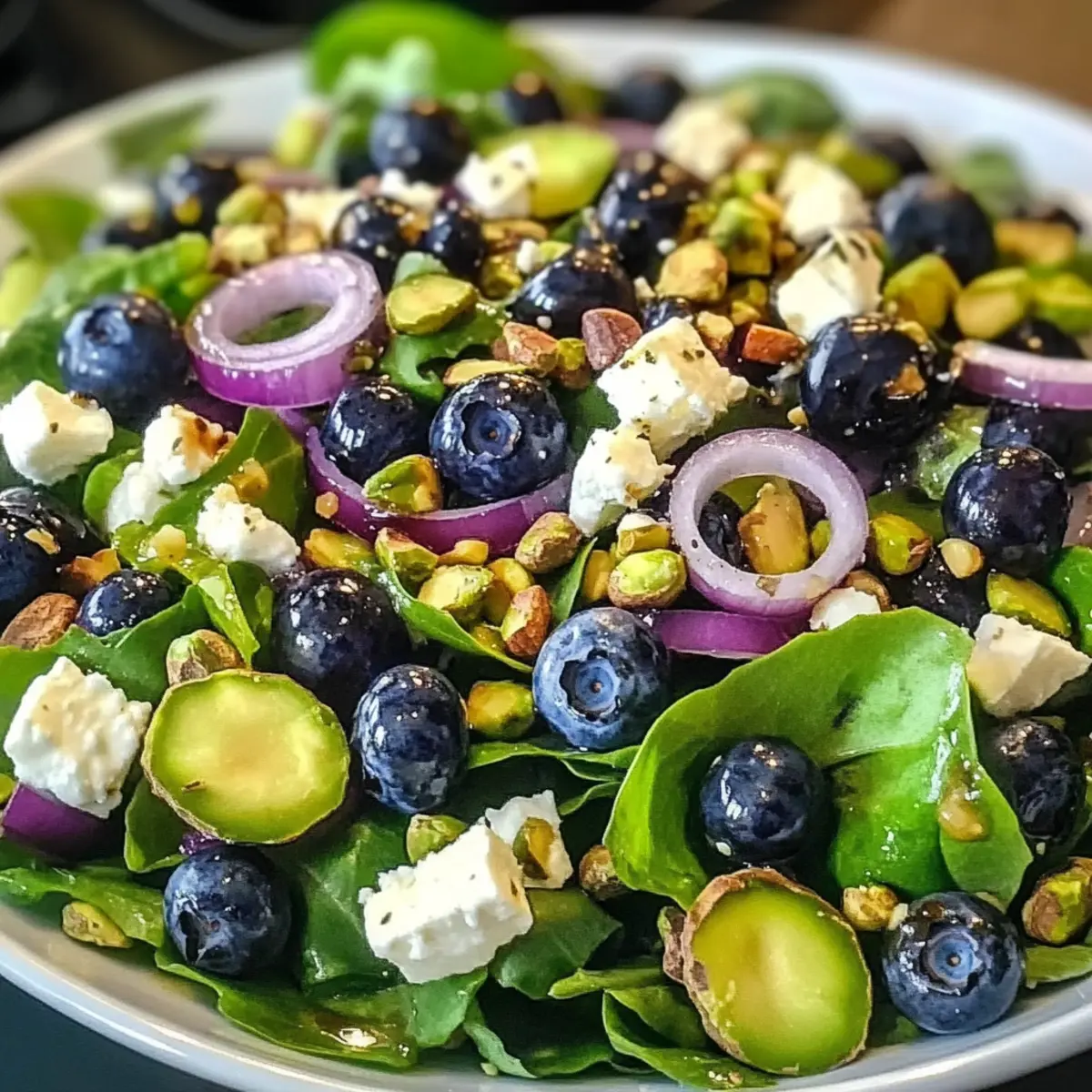 „Kann man einen Salat lieben?“ fragte mich neulich eine Freundin mit einem skeptischen Blick, während wir in einem Café saßen. Ich konnte nur lächeln und sie an meinen neuesten kulinarischen Versuch erinnern: den erfrischenden Blaubeer-Pistazien-Frühlingssalat. Dieser Salat ist nicht nur ein Fest für die Sinne, sondern auch eine gesunde Wahl für jeden Tag. Mit seiner bunten Mischung aus saftigen Blaubeeren, knackigen Pistazien und cremigem Feta verleiht er jedem Essen einen Hauch von Frühling, egal ob als schnelles Mittagessen oder als beeindruckende Beilage bei einem Grillabend. Und das Beste daran? Er ist in kürzester Zeit zubereitet und lässt sich wunderbar variieren. Was könnte also besser sein, um die Frühlingsgefühle auf den Teller zu bringen? Bleib dran, um herauszufinden, wie du diesen bezaubernden Salat nachmachen kannst! Warum du diesen Blaubeer-Pistazien-Salat lieben wirst Frische und Farben: Die Kombination aus leuchtenden Blaubeeren und knackigen Pistazien macht diesen Salat nicht nur optisch ansprechend, sondern auch geschmacklich aufregend. Einfach zuzubereiten: Innerhalb kürzester Zeit hast du ein köstliches Gericht auf dem Tisch, das sich ideal für spontane Dinnerpartys eignet. Vielfältige Varianten: Dieser Salat lässt sich wunderbar anpassen – probiere ihn mit anderen Früchten oder Käsesorten aus, um deiner Kreativität freien Lauf zu lassen! Gesund und nährstoffreich: Mit einer ausgewogenen Mischung aus Vitaminen und Ballaststoffen ist er perfekt für gesundheitsbewusste Esser. Crowd-Pleaser: Egal ob bei einem Grillfest oder als leichtes Mittagessen, dieser Salat wird garantiert alle begeistern! Blaubeer-Pistazien-Salat Zutaten • Für den Salat Gemischte Salatblätter – Diese bilden die Basis des Salats; du kannst auch Spinat oder Rucola verwenden. Frische Blaubeeren – Sie bringen eine süße, saftige Note; für Abwechslung können auch Himbeeren oder Erdbeeren genutzt werden. Gehackte Pistazien – Sie sorgen für den nötigen Crunch; alternativ schmecken auch Mandeln oder Walnüsse gut. Zerbröselter Feta – Er bietet einen herzhaften Kontrast; teste auch Ziegenkäse für eine cremigere Textur. Rotzwiebel, dünn geschnitten – Sie fügt ein mildes Zwiebelaroma hinzu; wähle eine mildere Zwiebel, um den Salat nicht zu overpowern. • Für das Dressing Natives Olivenöl – Es dient als Basis für das Dressing; alternativ kannst du auch Avocadoöl verwenden. Honig – Er süßt das Dressing; für eine vegane Variante eignet sich Ahornsirup. Balsamico-Essig – Er bringt eine angenehme Säure ins Spiel; auch Apfelessig ist dafür geeignet. Dijon-Senf – Er wirkt als Emulgator für das Dressing; jede Senfsorte funktioniert, jedoch kann der Geschmack variieren. Salz und schwarzer Pfeffer – Sie verstärken die Aromen; passe die Menge nach deinem persönlichen Geschmack an. Schritt-für-Schritt-Anleitung für den Blaubeer-Pistazien-Frühlingssalat Step 1: Salatblätter vorbereiten Wasche und trockne die gemischten Salatblätter gründlich, um jeglichen Schmutz zu entfernen. Verwende eine Salatschleuder, um sicherzustellen, dass sie richtig trocken sind und nicht wässerig werden. Platziere die Salatblätter anschließend in einer großen Servierschüssel. Diese frische Basis wird das Herzstück deines Blaubeer-Pistazien-Frühlingssalats bilden. Step 2: Blaubeeren reinigen Spüle die frischen Blaubeeren unter kaltem Wasser ab und achte darauf, die Stiele zu entfernen. Tupfe sie sanft mit einem Küchentuch trocken, damit sie nicht zerdrückt werden. Setze die gewaschenen Blaubeeren beiseite; sie werden später dem Salat eine süße, saftige Note verleihen. Step 3: Pistazien hacken Nehme die geschälten Pistazien und hacke sie grob in kleinere Stücke. Dies erhöht den Crunch-Faktor und verteilt den nussigen Geschmack gleichmäßiger im Salat. Streue die gehackten Pistazien über die vorbereiteten Salatblätter und bringe die ersten Texturen in dein frühlingshaftes Gericht. Step 4: Feta hinzufügen Bröckele den Feta-Käse in kleine Stücke und füge ihn zum Salat hinzu. Der cremige Feta sorgt für einen herzhaften Kontrast zu den süßen Blaubeeren und den knackigen Pistazien. Berücksichtige bei dieser Zutat, dass sie gleichmäßig verteilt wird, um jedem Bissen eine perfekte Balance zu verleihen. Step 5: Zwiebel schneiden Schneide die rote Zwiebel in dünne Ringe oder Halbmonde und integriere sie in die Salatschüssel. Die Zwiebel verleiht dem Blaubeer-Pistazien-Frühlingssalat eine milde Schärfe und ergänzt die Aromen der anderen Zutaten. Achte darauf, dass die Zwiebel gleichmäßig unter die anderen Zutaten gemischt wird. Step 6: Dressing zubereiten In einer kleinen Schüssel vermenge das native Olivenöl, den Honig, den Balsamico-Essig, den Dijon-Senf, Salz und schwarzen Pfeffer. Verwende einen kleinen Schneebesen, um alle Zutaten gut zu emulgieren, bis eine homogene Mischung entsteht. Dieses Dressing wird deinem Salat Frische und Tiefe verleihen. Step 7: Salat anrichten Gieße das Dressing gleichmäßig über den Salat und verwende eine Zange, um die Zutaten sanft zu vermengen. Achte darauf, dass alle Salatbestandteile gut mit dem Dressing überzogen sind, ohne die Blaubeeren zu zerdrücken. Dein Blaubeer-Pistazien-Frühlingssalat sollte jetzt lebendig und ansprechend aussehen. Step 8: Abschmecken und servieren Kosten Sie den Salat und passe das Dressing nach deinem Geschmack an – vielleicht etwas mehr Salz oder ein zusätzlicher Spritzer Honig? Serviere den Salat sofort, um die frischen Aromen zu genießen, oder kühle ihn kurz, wenn du ihn leicht gekühlt bevorzugst. Genieße jeden Biss! Lagerungstipps für Blaubeer-Pistazien-Frühlingssalat Zimmertemperatur: Bewahre den Blaubeer-Pistazien-Frühlingssalat nicht bei Zimmertemperatur auf, da die Zutaten schnell verderben können. Kühlschrank: Stelle die Reste in einem luftdichten Behälter für bis zu 3 Tage in den Kühlschrank. Um die Frische zu gewährleisten, verwahre das D