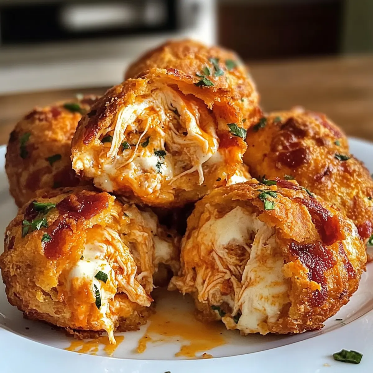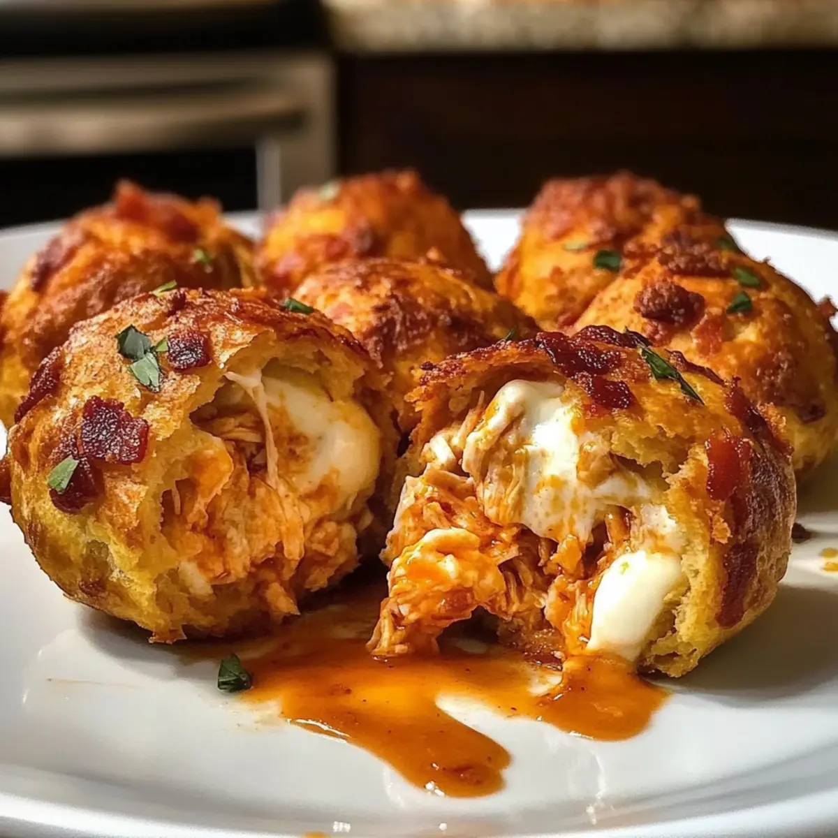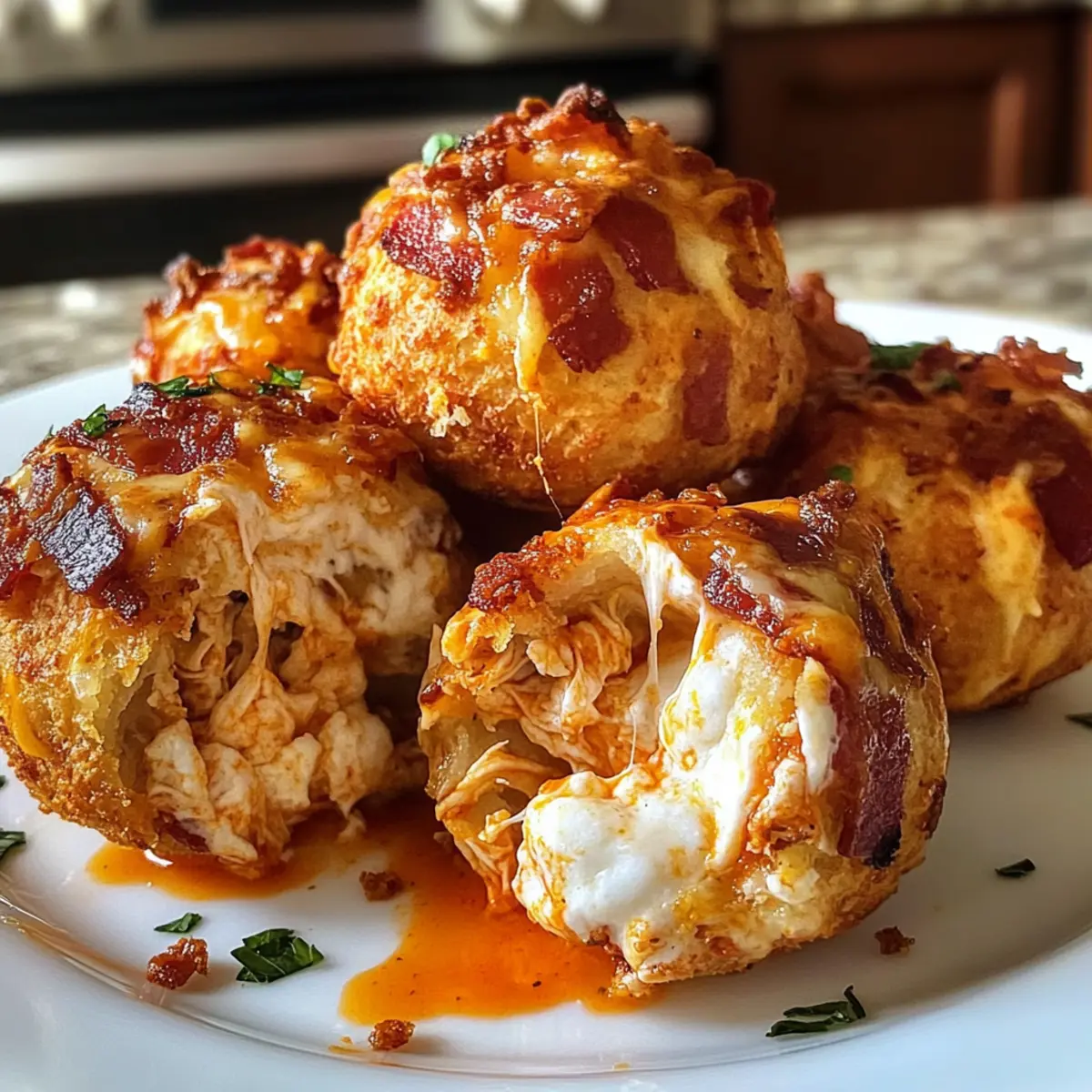 Was für eine großartige Entdeckung! Diese Buffalo-Hühnchen-Bacon-Mozzarella-Bomben sind mehr als nur ein Snack; sie sind ein Erlebnis für Ihre Geschmacksknospen. Saftiges Hühnchen, würzige Buffalo-Sauce, geschmolzener Mozzarella und knuspriger Bacon umhüllen sich in einem goldbraunen Bisquitteig – das perfekte Rezept für jeden Anlass. Besonders wenn Sie eine schnelle und dennoch eindrucksvolle Partyvorspeise oder einen besonderen Leckerbissen für die nächste Fußballübertragung suchen, sind diese Bomben genau das Richtige. Die Zubereitung ist unkompliziert und auch für jeden Anfänger machbar, während die Aromen sicherlich alle Gäste begeistern werden. Neugierig, wie Sie diese köstlichen Happen selbst zubereiten können? Lassen Sie uns gemeinsam ins Kochen eintauchen! Warum sind diese Bomben ein Muss? Unglaublicher Geschmack: Die Kombination aus würzigem Buffalo-Hühnchen und geschmolzenem Mozzarella sorgt für ein Geschmackserlebnis, das Ihren Gaumen erfreuen wird. Einfache Zubereitung: Auch Kochanfänger können diese schmackhaften Snacks problemlos kreieren – die Schritte sind klar und unkompliziert. Vielseitige Optionen: Sie können die Bomben nach Belieben abwandeln, sei es durch vegetarische Alternativen oder unterschiedliche Saucen. Perfekte Partyhäppchen: Diese Bomben sind ideal für jede Veranstaltung, ob beim Fußballabend oder beim gemütlichen Beisammensein mit Freunden. Schnelles Gericht: In weniger als 30 Minuten sind Sie bereit, Ihre Gäste mit diesen herzhaften Leckerbissen zu begeistern! Entdecken Sie auch meine anderen leckeren Rezepte wie die Zucchini Pfannkuchen Mit oder den Gesunden Zucchinikuchen Ohne, die ebenso einfach und köstlich sind! Buffalo-Hühnchen-Bacon-Mozzarella-Bomben Zutaten Für die Füllung Gekochtes Hühnchen – liefert das wichtige Protein und die Hauptfüllung; kann durch zerrissenes Jackfruit als vegetarische Option ersetzt werden. Buffalo-Sauce – sorgt für die nötige Schärfe; je nach Vorliebe kann die Menge angepasst werden (1/3 Tasse für mild, bis zu 3/4 Tasse für extra Schärfe). Mozzarella-Käse – bietet eine cremige, schmelzende Textur; Alternativen sind Cheddar oder Pfefferjack für unterschiedliche Geschmäcker. Bacon – fügt einen rauchigen und knusprigen Geschmack hinzu; für eine vegetarische Version kann er weggelassen oder durch gekochte Wurst ersetzt werden. Frischkäse – trägt zur Reichhaltigkeit und Cremigkeit der Füllung bei. Ranch-Dressing – sorgt für Cremigkeit und einen Hauch von Säure; alternativ kann auch Blauschimmelkäse-Dressing verwendet werden. Knoblauchpulver und Zwiebelpulver – intensivieren den Geschmack; frischer Knoblauch oder Zwiebeln können ebenfalls hinzugefügt werden, wenn gewünscht. Für den Teig Kühlregal-Bisquit-Teig – bildet die äußere Schicht; einfach zu handhaben; kann durch selbstgemachten Pizzateig oder Croissant-Teig, der ausgerollt wird, ersetzt werden. Non-Stick-Kochspray – stellt sicher, dass die Bomben leicht vom Backblech abgehen. Für die Garnitur Frische Petersilie – zur Garnierung, fügt Farbe und einen frischen Akzent hinzu. Jede der Zutaten trägt dazu bei, dass diese Buffalo-Hühnchen-Bacon-Mozzarella-Bomben zu einem unvergesslichen Erlebnis werden. Bereiten Sie sich darauf vor, Ihre Gäste mit diesen köstlichen Snacks zu begeistern! Schritt-für-Schritt-Anleitungen für Buffalo-Hühnchen-Bacon-Mozzarella-Bomben Step 1: Ofen vorheizen Heizen Sie den Ofen auf 190 °C vor und bereiten Sie ein Backblech mit Backpapier vor. Das Backpapier sorgt dafür, dass die Buffalo-Hühnchen-Bacon-Mozzarella-Bomben nicht ankleben und gleichmäßig garen können. Lassen Sie den Ofen vollständig vorheizen, um eine schöne, goldene Farbe der Bomben zu gewährleisten. Step 2: Füllung vorbereiten In einer großen Schüssel vermengen Sie das zerrissene Hühnchen, die Buffalo-Sauce, den Mozzarella, den zerbröckelten Bacon, den Frischkäse, das Ranch-Dressing sowie das Knoblauch- und Zwiebelpulver. Mischen Sie alle Zutaten gut durch, bis Sie eine cremige und gleichmäßige Füllung erhalten, die in den Bomben köstlich schmeckt. Step 3: Bisquit-Teig ausrollen Nehmen Sie den Kühlregal-Bisquit-Teig und rollen Sie ihn auf einer leicht bemehlten Arbeitsfläche zu etwa 10 cm großen Kreisen aus. Achten Sie darauf, dass die Teigstücke gleichmäßig dick sind, damit die Buffalo-Hühnchen-Bacon-Mozzarella-Bomben gleichmäßig backen. Verwenden Sie eventuell ein Nudelholz für eine leichtere Handhabung, falls erforderlich. Step 4: Füllung platzieren Legen Sie etwa 2 Esslöffel der vorbereiteten Füllung in die Mitte jedes Teigkreises. Achten Sie darauf, die Füllung nicht zu überfüllen, damit die Bomben beim Backen nicht auslaufen. Diese Kombination aus würzigem Hühnchen und schmelzendem Käse wird den gesamten Teig umhüllen! Step 5: Bomben formen Falten Sie die Ränder des Teigs über der Füllung zusammen und drücken Sie sie gut fest, um sicherzustellen, dass keine Lücken oder dünnen Stellen entstehen. Formen Sie die Teigballen vorsichtig zu runden Bomben und achten Sie darauf, dass die Füllung gut eingeschlossen ist. Das hilft, ein Auslaufen während des Backens zu vermeiden. Step 6: Auf dem Backblech anrichten Legen Sie die geformten Bomben mit der Nahtseite nach unten auf das vorbereitete Backblech, wobei Sie genügend Platz zwischen ihnen lassen, damit sie beim Backen aufgehen können. Dies sorgt dafür, dass die Buffalo-Hühnchen-Bacon-Mozzarella-Bomben gleichmäßig backen und schön knusprig werden. Step 7: Backen und würzen Sprayen Sie die Oberseiten der Bomben leicht mit Non-Stick-Kochspray ein und streuen Sie optional etwas Knoblauchpulver darüber, um zusätzlichen Geschmack zu verleihen. Stellen Sie das Backblech dann in den vorgeheizten Ofen und backen Sie die Bomben für 15–20 Minuten, bis sie goldbraun und gut aufgegangen sind. Step 8: Abkühlen und garnieren Nehmen Sie die Buffalo-Hühnchen-Bacon-Mozzarella-Bomben aus dem Ofen und las