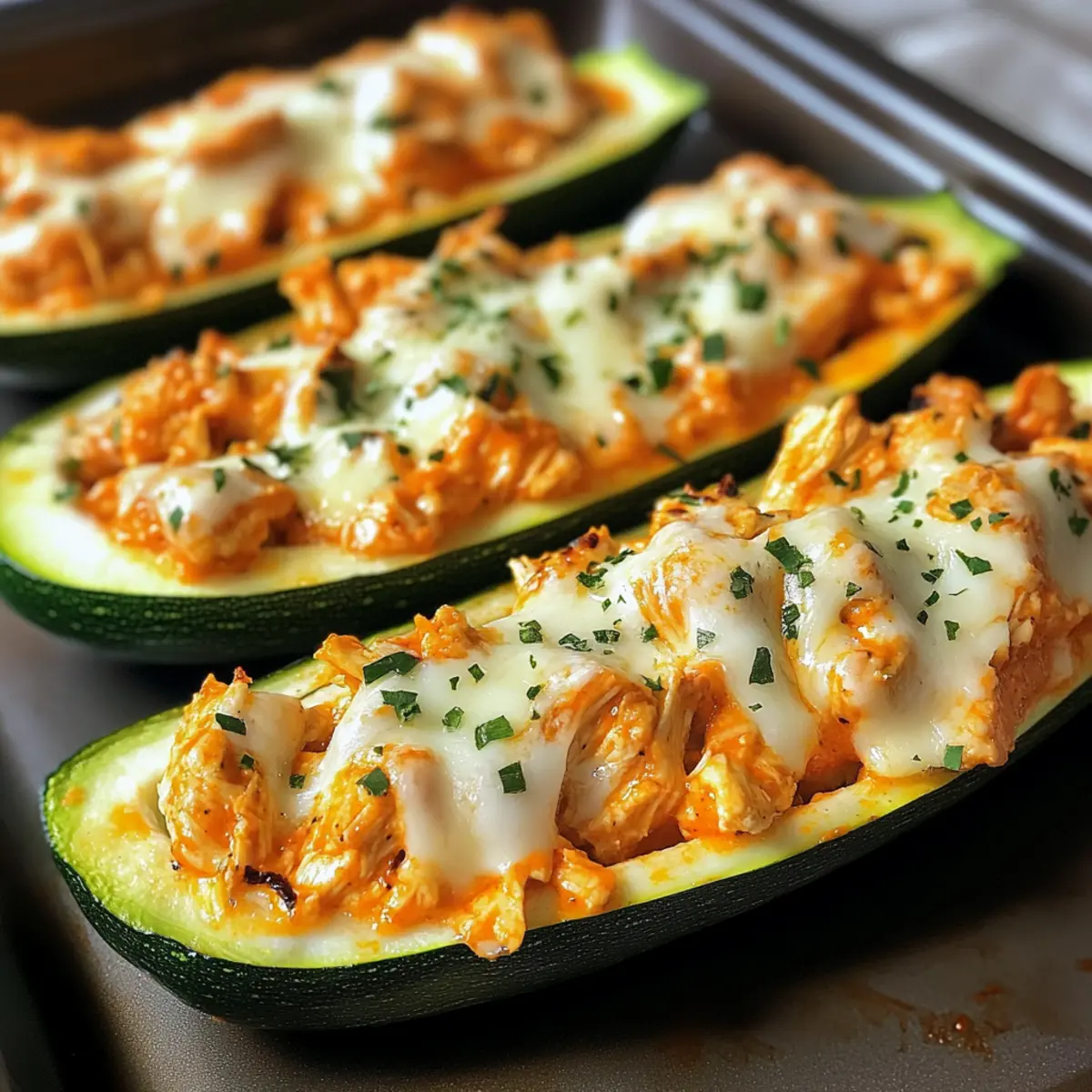 • Variation des Geschmacks: Experimentiere mit unterschiedlichen Saucen in der Füllung, um deiner Version der Buffalo-Hühnchen-Zucchini-Boote eine persönliche Note zu verleihen.