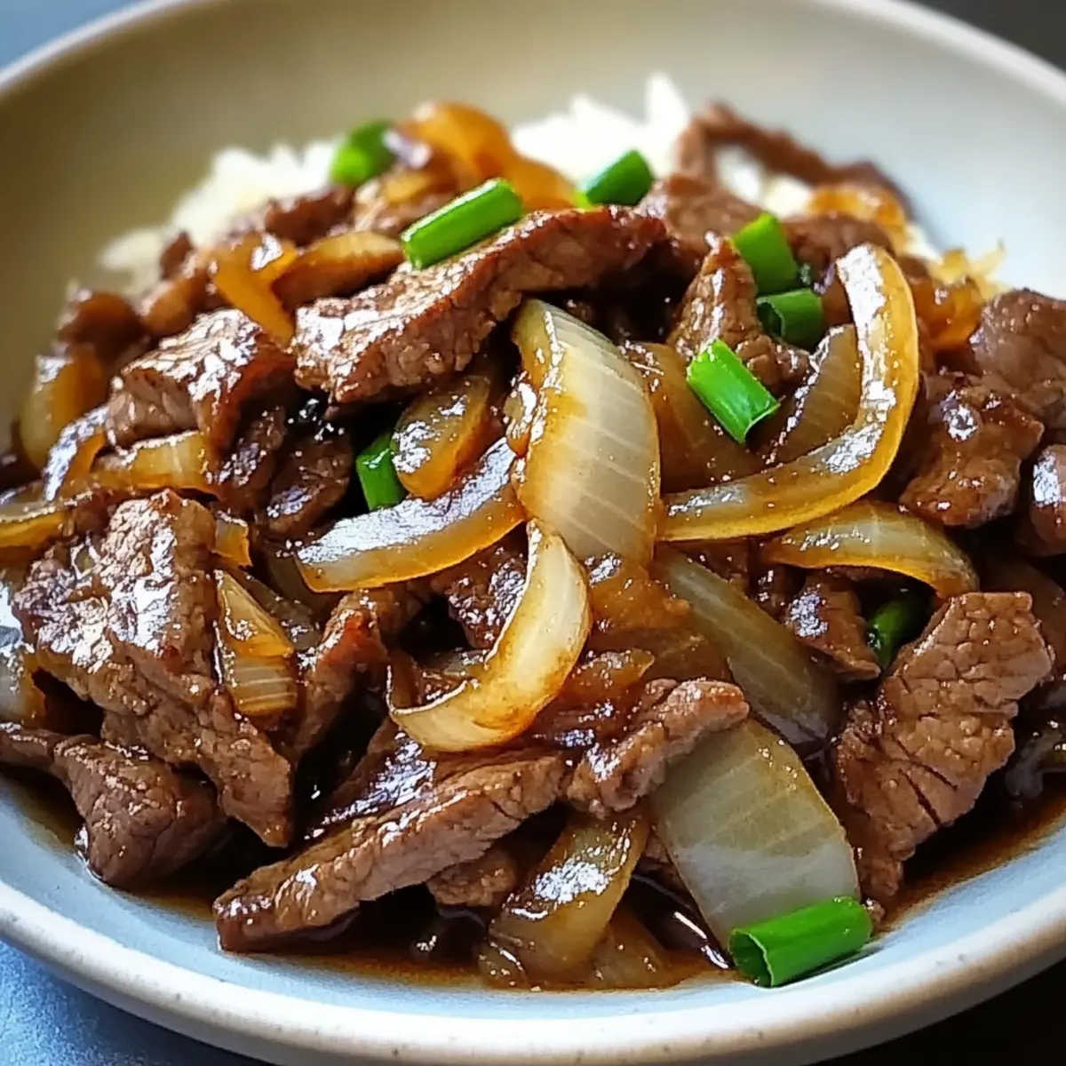 1. Zutaten vorbereiten: Rindfleisch in dünne Scheiben und Zwiebeln in Ringe schneiden.