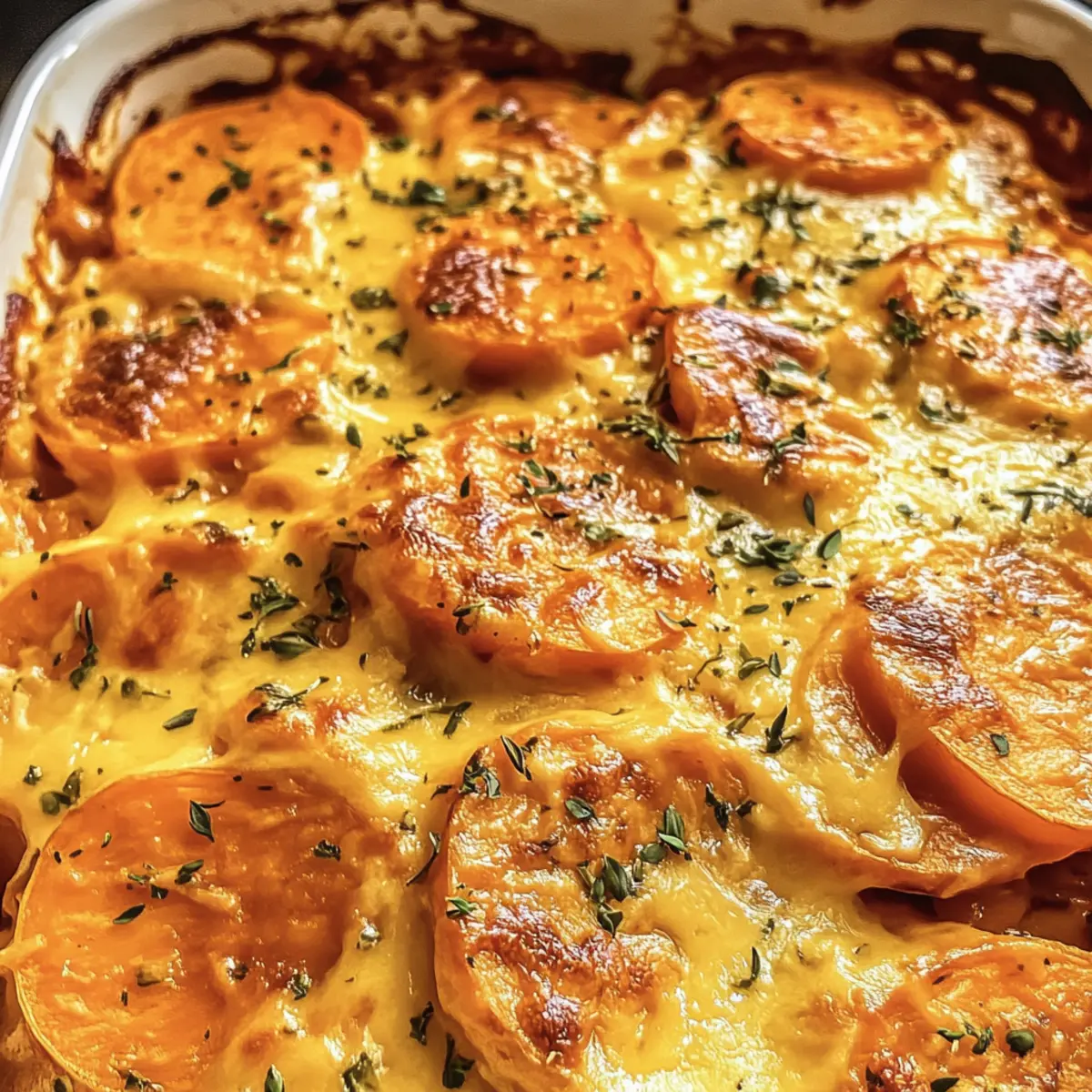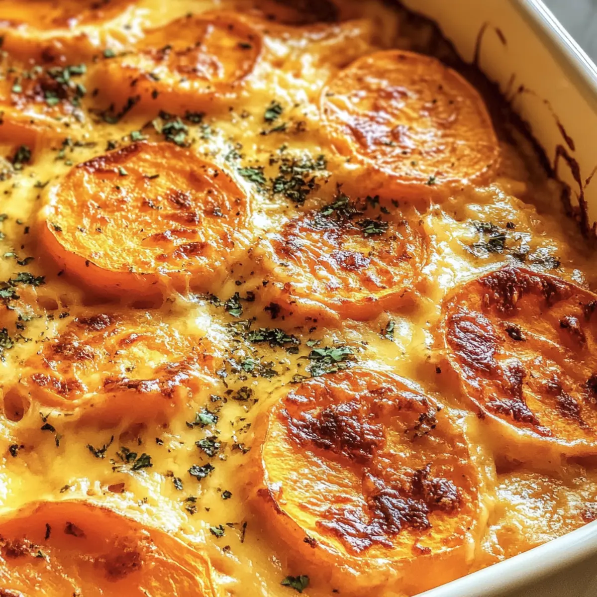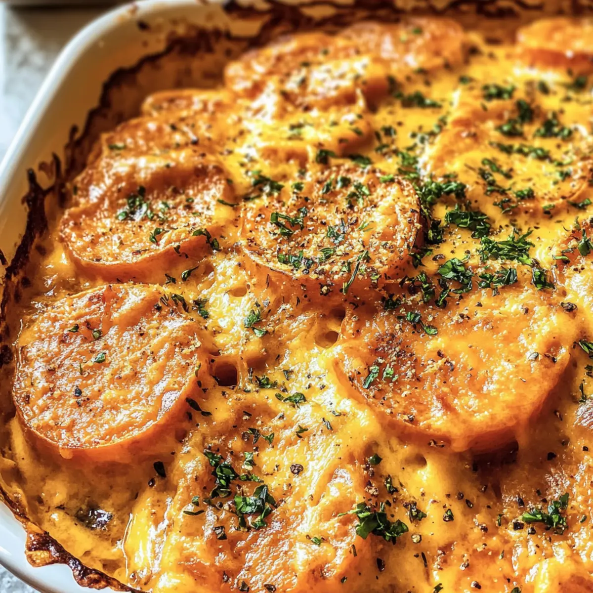 „Hast du schon mal das verführerische Aroma von gerösteten Süßkartoffeln mit rauchigem Chipotle-Gouda-Sirup erlebt?“ Diese Kombination aus cremigen Schichten und pikantem Geschmack macht die Chipotle Gouda Auflaufkartoffeln zum perfekten Komfortessen. Es ist ein Gericht, das sowohl in gemütlichen Abenden allein als auch bei festlichen Zusammenkünften mit Freunden glänzt. Die Zubereitung ist schnell und unkompliziert, ideal für alle, die nach einem leckeren Rezept suchen, das leicht abgewandelt werden kann – sei es durch Variationen oder für spezielle diätetische Bedürfnisse. Schmeißt du ein paar Zutaten in die Auflaufform, und schon bald verwöhnst du deine Familie mit einem Gericht, das sowohl den Gaumen als auch das Herz erfreut. Bist du bereit, dich in dieses köstliche Abenteuer zu stürzen? Warum wirst du dieses Rezept lieben? Einfachheit: Die Zubereitung ist kinderleicht, selbst mit grundlegenden Kochkenntnissen kannst du schnell ein köstliches Gericht zaubern. Reicher Geschmack: Die Kombination aus rauchigem Gouda und Chipotle sorgt für ein unverwechselbares Geschmackserlebnis, das jede Geschmacksnerv kitzelt. Vielseitigkeit: Egal, ob du eine vegane Alternative suchst oder glutenfrei kochen möchtest, dieses Rezept lässt sich problemlos anpassen – hier erfährst du mehr über Variationen. Perfekte Präsentation: Mit seinem goldbraunen Käsebelag und den bunten Schichten ist dieser Auflauf nicht nur lecker, sondern auch ein echter Augenschmaus auf jedem Tisch. Schnell und nahrhaft: Ideal für hektische Wochentage oder zum Vorbereiten für größere Zusammenkünfte, ohne Kompromisse bei der Qualität eingehen zu müssen. Mach dich bereit, mit diesem Rezept ein wahres Festmahl für deine Liebsten zu kreieren! Chipotle Gouda Auflaufkartoffeln Zutaten Für den Auflauf • Süßkartoffeln – Sie bilden die Basis des Gerichts mit ihrer natürlichen Süße. Alternative: Für andere Texturen können auch Russet-Kartoffeln verwendet werden. • Salzbutter – Sorgt beim Roux für Reichhaltigkeit. Ersatz: Vegane Butter für eine milchfreie Variante. • Mehl (Vollkorn, Allzweck oder glutenfreies 1:1) – Verdickt die Käsesauce. Eine glutenfreie Mischung kann für die glutenfreie Version verwendet werden. • Milch (fettarm, 2%, Vollmilch) – Schafft eine cremige Sauce. Hinweis: Vollmilch sorgt für das cremigste Ergebnis. • Rauchiger Gouda-Käse – Verleiht einen robusten, rauchigen Geschmack. Ersatz: Scharfer Cheddar für einen würzigen Geschmack oder Pepper Jack für zusätzlichen Schwung. • Chipotle-Chile-Adobo-Sauce – Fügt dem Gericht rauchige Schärfe hinzu. Je nach Schärfetoleranz anpassen; starte mit weniger. • Knoblauchpulver – Verstärkt das herzhaft-savory Geschmacksprofil. • Koscheres Salz – Essenziell zum Würzen; nach Geschmack anpassen. • Frisch gemahlener schwarzer Pfeffer – Für zusätzliche Wärme und Würze. • Parmesan-Käse – Sorgt für ein herzhaft-nussiges Finish oben drauf. • Frisch gehackte Petersilie – Für die Garnitur, die Farbe und Frische hinzufügt. Die Chipotle Gouda Auflaufkartoffeln sind ein wunderbares Gericht, das gleich auf den Tisch kommt und Genuss für die ganze Familie verspricht! Schritt-für-Schritt-Anleitung für Chipotle Gouda Auflaufkartoffeln Step 1: Ofen vorheizen Heize deinen Ofen auf 190°C vor und fette eine 20×20 cm große Auflaufform ein. Diese Vorbereitung sorgt dafür, dass deine Chipotle Gouda Auflaufkartoffeln gleichmäßig und perfekt gebacken werden, während du die anderen Schritte durchführst. Step 2: Süßkartoffeln arrangieren Schneide die Süßkartoffeln in dünne Scheiben (ca. 3 mm) und schichte sie aufrecht in die Auflaufform. Achte darauf, dass sie nicht zu eng aneinander liegen, damit sie beim Backen gleichmäßig garen. So schaffst du die perfekte Grundlage für die köstliche Käse- und Chipotle-Sauce. Step 3: Käsesauce zubereiten Erhitze eine Pfanne bei mittlerer Hitze und lasse die Butter schmelzen. Sobald sie geschmolzen ist, rühre das Mehl ein, bis eine glatte Paste entsteht. Gieße langsam die Milch unter ständigem Rühren dazu, um Klumpen zu vermeiden. Lass die Mischung köcheln, bis sie etwas eingedickt ist und eine cremige Konsistenz erreicht. Step 4: Käse und Gewürze einarbeiten Nehme die Käsesauce vom Herd und füge den rauchigen Gouda, das Knoblauchpulver, die Chipotle-Sauce, das Salz und den Pfeffer hinzu. Rühre, bis der Käse vollständig geschmolzen ist und alles gut vermischt ist. Probiere die Sauce und passe die Gewürze nach deinem Geschmack an, um die perfekte Balance zu finden. Step 5: Gericht kombinieren Gieße die heiße Käsesauce gleichmäßig über die angeordneten Süßkartoffeln in der Auflaufform. Achte darauf, dass alle Kartoffelscheiben gut mit der Sauce bedeckt sind, wodurch sie während des Backens zart und schmackhaft werden. Step 6: Backen Decke die Auflaufform mit Alufolie ab und backe die Chipotle Gouda Auflaufkartoffeln für 45-60 Minuten. Prüfe gegen Ende der Backzeit, ob die Süßkartoffeln zart sind, indem du mit einer Gabel hineinpikst. Dies stellt sicher, dass sie perfekt gegart sind. Step 7: Toppings hinzufügen Nehme die Folie ab und bestreue die Auflaufkartoffeln mit dem reservierten Parmesan-Käse. Stelle die Form zurück in den Ofen und grille die Oberseite für 1-2 Minuten, bis der Käse goldbraun und blubbernd ist. Achte darauf, dass du in dieser Phase aufmerksam bist, damit der Käse nicht verbrennt. Step 8: Garnieren und servieren Nehme den Auflauf aus dem Ofen und garniere ihn mit frisch gehackter Petersilie. Lass die Chipotle Gouda Auflaufkartoffeln kurz abkühlen, bevor du sie servierst. Genieße das Gericht noch warm für das beste Geschmackserlebnis! Expertentipps für Chipotle Gouda Auflaufkartoffeln Schärfe anpassen: Beginne mit weniger Chipotle-Sauce, um die Schärfe zu kontrollieren. Du kannst beim nächsten Mal mehr hinzufügen, wenn du es würziger magst. Gleichmäßige Scheiben: Achte darauf, die S