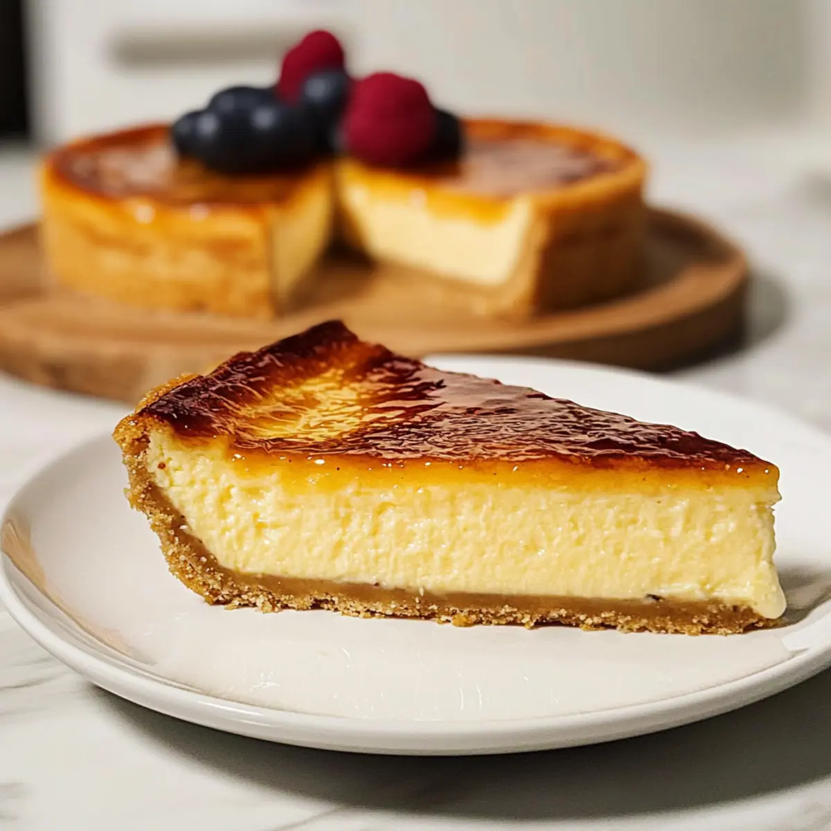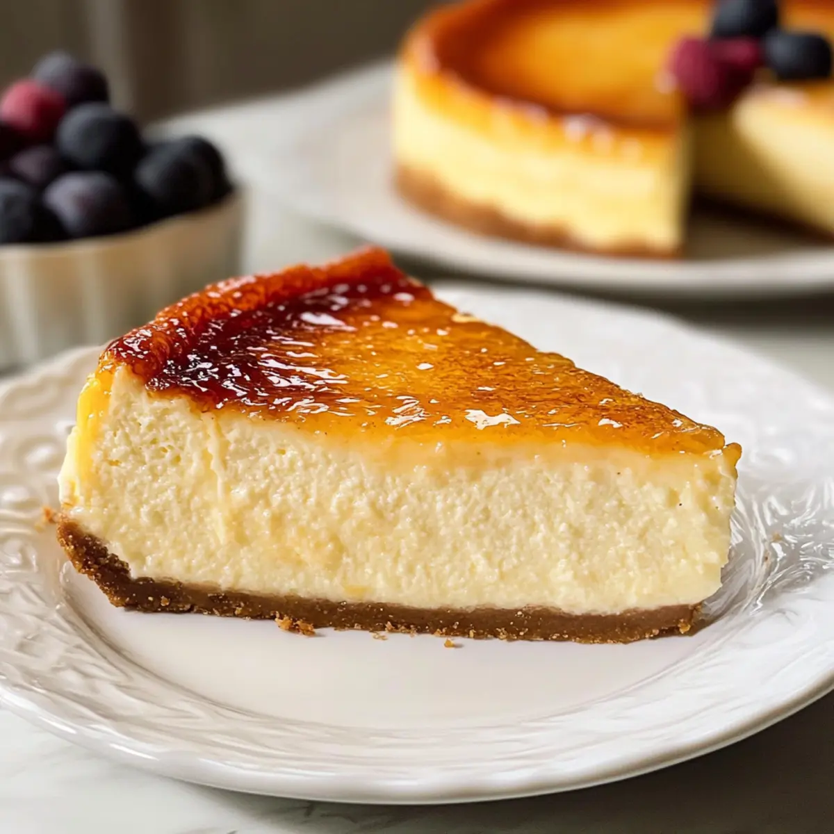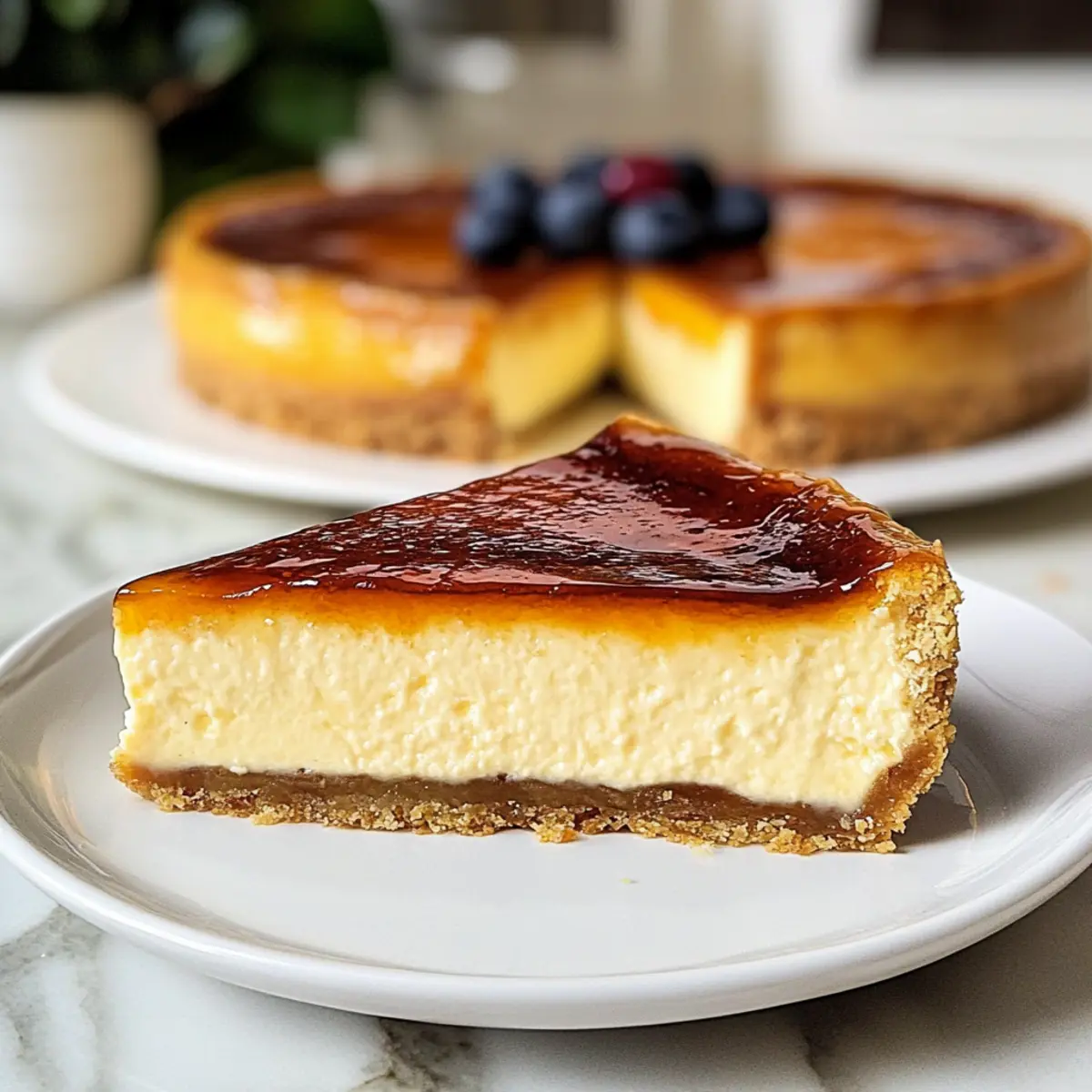 Als ich das erste Mal eine Crème Brûlée Käsekuchen in einem kleinen, charmanten Café in Paris probierte, war ich sofort verzaubert. Die Kombination aus einer samtigen, cremigen Füllung und einer knusprigen Karamellschicht hat mich in einen Geschmacksrausch versetzt, den ich nie vergessen werde. In diesem Rezept für unseren Silky Crème Brûlée Käsekuchen bringe ich diese exquisiten französischen Aromen direkt in deine Küche. Mit einer einfachen Zubereitung und dem Wow-Faktor eines Brûlée-Toppings wird dieses Dessert nicht nur deine Gäste beeindrucken, sondern ist auch perfekt für jeden Anlass. Egal, ob du eine Dinnerparty planst oder einfach nur etwas Besonderes für dich selbst kreieren möchtest – dieser Käsekuchen ist ein wahrer Genuss, der sowohl reichhaltig als auch unglaublich cremig ist. Bist du bereit, ihm ein Zuhause in deiner Dessert-Auswahl zu geben? Warum wirst du dieses Dessert lieben? Creme Brûlée Käsekuchen kombiniert das Beste aus zwei Welten – die Cremigkeit eines Käsekuchens und das knusprige Vergnügen einer klassischer Crème Brûlée. Einfach zuzubereiten: Selbst wenn du kein Küchenprofi bist, gelingt dir dieses Rezept mit Leichtigkeit. Unvergesslicher Geschmack: Die harmonische Balance aus süßer, sahniger Füllung und dem krossen Karamell-Topping wird deine Sinne verzaubern. Ideal für jeden Anlass: Ob bei einem festlichen Dinner oder einem gemütlichen Abend zu Hause, dieser Käsekuchen zieht alle Blicke auf sich und sorgt für Begeisterung bei deinen Gästen. Variationsmöglichkeiten: Füge deiner Mischung verschiedene Aromen hinzu oder bereite eine Schokoladenversion zu, um neue Geschmackserlebnisse zu schaffen. Mach dich bereit, deinen Gaumen mit diesem luxuriösen Dessert zu verwöhnen! Crème Brûlée Käsekuchen Zutaten Für den Boden • Graham-Cracker-Krümel – sorgt für eine knusprige Basis. Alternativ: Kekskrümel können verwendet werden. • Zucker (für den Boden) – süßt den Boden. Alternativ: Brauner Zucker kann den Geschmack verbessern. • Ungesalzene Butter – bindet die Bodenmischung. Alternativ: Kokosöl ist eine gute Option für eine milchfreie Variante. Für die Füllung • Frischkäse – ist die Hauptzutat für die Füllung und sorgt für die cremige Textur. Alternativ: Mascarpone kann für einen noch reichhaltigeren Geschmack verwendet werden. • Zucker (für die Füllung) – fügt Süße zum Käsekuchen hinzu. Hinweis: Verwende Kristallzucker für eine einfache Verarbeitung. • Sauerrahm – trägt zur Cremigkeit und zum leicht säuerlichen Geschmack bei. Alternativ: Griechischer Joghurt ist eine gesunde Alternative. • Vanilleextrakt – verstärkt das Geschmacksprofil. Alternativ: Vanillepaste kann einen intensiveren Geschmack geben. • Koscheres Salz – balanciert die Aromen aus. Hinweis: Auch normales Speisesalz kann verwendet werden. • Große Eier – geben Struktur und Reichhaltigkeit. Hinweis: Zimmertemperatur-Eier sorgen für eine bessere Integration. Für das Brûlée-Topping • Superfeiner Zucker – für das Brûlée-Topping, ermöglicht eine einfache Karamellisierung. Hinweis: Normale Kristallzucker können in einer Küchenmaschine zu superfine verarbeitet werden. Dieser Crème Brûlée Käsekuchen wird zum Highlight jeder Dessert-Tafel! Schritt-für-Schritt-Anleitung für den Cremigen Crème Brûlée Käsekuchen Step 1: Die Form vorbereiten Heize den Ofen auf 160 °C vor. Nimm eine 23 cm große Springform und wickle sie mit drei Schichten schwerer Alufolie ein, um ein Eindringen von Wasser zu verhindern. Diese Vorbereitung ist entscheidend, damit unser Crème Brûlée Käsekuchen gleichmäßig gart und nicht überläuft. Step 2: Den Boden herstellen Mische die Graham-Cracker-Krümel mit dem Zucker und der geschmolzenen Butter in einer Schüssel. Drücke die Mischung gleichmäßig und fest in den Boden und die Seiten der Springform. Dies bildet eine leckere, knusprige Basis für deinen Käsekuchen, die im Ofen etwa 10 Minuten vorgebacken wird, bis sie goldbraun ist. Step 3: Die Füllung vorbereiten In einer großen Schüssel schlage den Frischkäse mit einem Handmixer cremig auf. Füge dann den Sauerrahm, den Zucker, den Vanilleextrakt und das Salz hinzu und rühre weiter, bis alles gut vermischt ist. Die Mischung sollte glatt und glänzend sein, ohne Klumpen. Nun füge nacheinander die Eier hinzu, dabei jedes Mal nur kurz rühren, um Luftblasen zu vermeiden. Step 4: Füllen und backen Gieße die Füllung vorsichtig in die vorbereitete Form mit dem Boden. Setze die Springform in eine große Auflaufform und fülle diese mit heißem Wasser, bis es zur Hälfte der Springform reicht. Backe den Crème Brûlée Käsekuchen 65-75 Minuten lang oder bis die Mitte sanft wackelt, aber nicht mehr flüssig ist. Step 5: Den Käsekuchen abkühlen lassen Schalte den Ofen aus und lasse den Käsekuchen eine Stunde lang im Ofen, um ihn langsam abzukühlen. Nimm ihn dann aus dem Wasserbad und lasse ihn bei Raumtemperatur weitere zwei Stunden abkühlen, bevor du ihn für mindestens vier Stunden, besser über Nacht, in den Kühlschrank stellst. Step 6: Das Brûlée-Topping erstellen Vor dem Servieren streue eine gleichmäßige Schicht aus superfinen Zucker auf die Oberfläche des gekühlten Käsekuchens. Verwende einen Küchenbrenner, um den Zucker gleichmäßig zu karamelisieren, bis er goldbraun und knusprig ist. Lass das Topping für 2-3 Minuten abkühlen, damit es fest wird. Step 7: Servieren Schneide den Crème Brûlée Käsekuchen mit einem heißen Messer in Stücke und serviere ihn mit frischen Beeren, wenn gewünscht. Der Kontrast zwischen der cremigen Füllung und dem knusprigen Karamell wird deine Gäste begeistern! Vorbereitung für den Crème Brûlée Käsekuchen Der Crème Brûlée Käsekuchen ist ideal für die Vorbereitung, besonders wenn du wenig Zeit hast! Du kannst die Graham-Cracker-Kruste bis zu 24 Stunden im Voraus zubereiten und im Kühlschrank aufbewahren, damit sie schön fest bleib