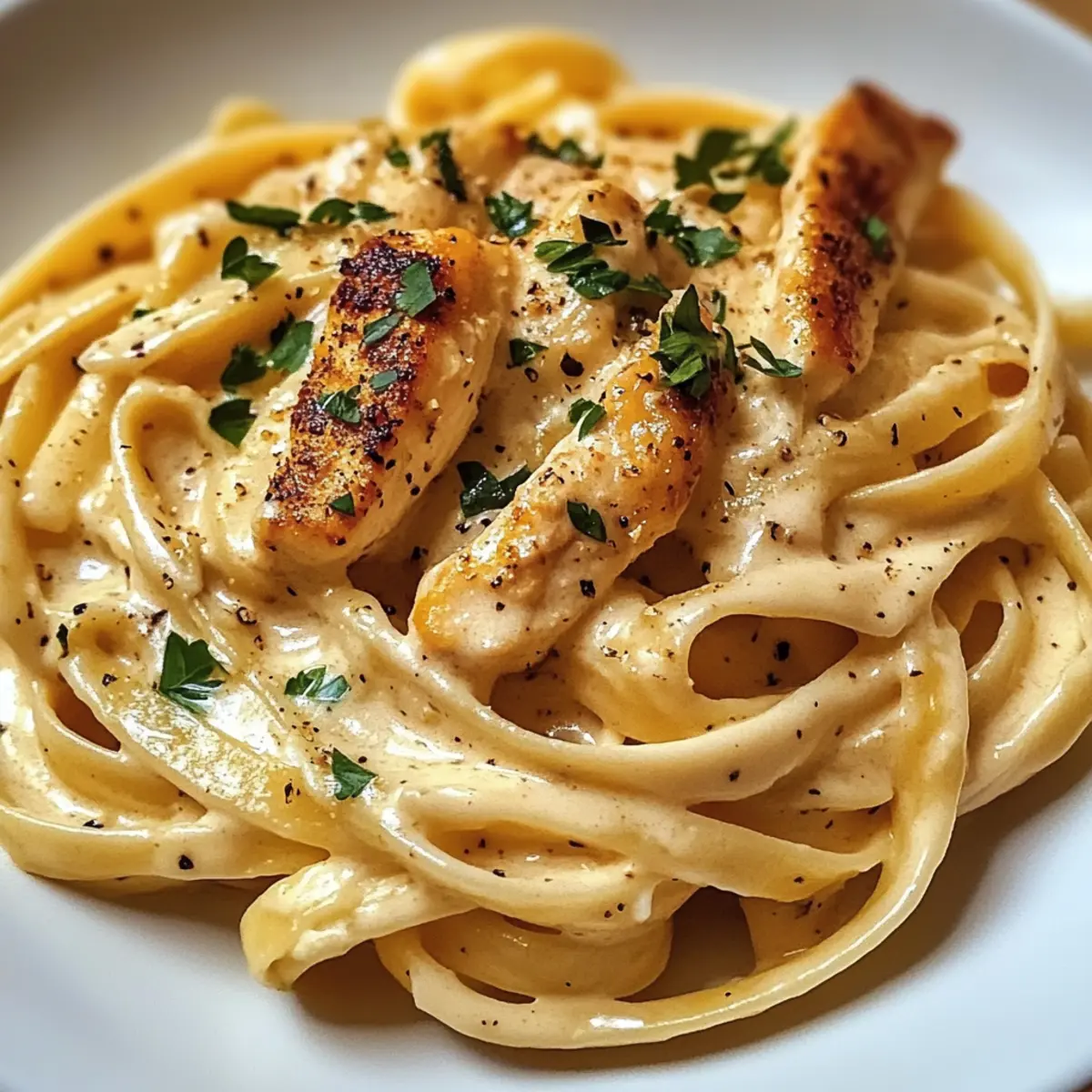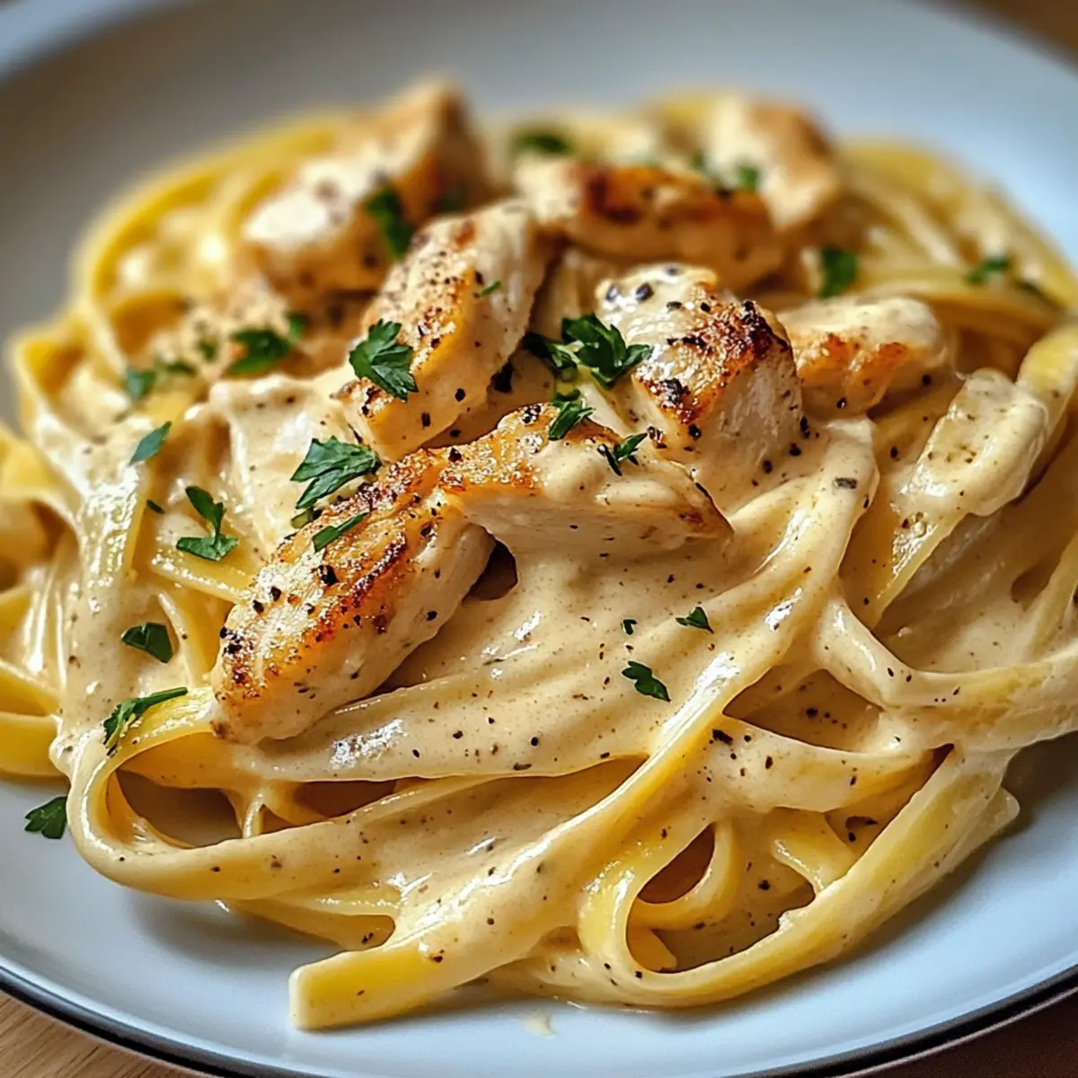 Es war ein dieser hektischen Abende, an denen die Zeit schneller vergeht als die Uhr tickt. Plötzlich wollte ich eine köstliche Mahlzeit zaubern, aber der Hunger war drängend. Genau in diesem Moment kam mir die Idee zu meinen cremigen Hähnchen-Alfredo-Nudeln! Diese italienisch inspirierte Pasta ist nicht nur ein wahrer Gaumenschmaus, sondern auch so schnell zubereitet, dass sie in weniger als 30 Minuten auf dem Tisch steht. Mit ihrem unwiderstehlich cremigen Geschmack und der herzhaften Kombination aus zartem Hähnchen und Parmesan sind sie das perfekte Comfort Food für alle, die sich eine kleine Auszeit vom hektischen Alltag gönnen möchten. Und das Beste daran? Diese Nudeln sind ideal für sowohl Anfänger als auch erfahrene Köche. Neugierig, wie du dieses köstliche Gericht nachkochen kannst? Lass uns loslegen! Warum wirst du dieses Rezept lieben? Schnelligkeit: In weniger als 30 Minuten zauberst du eine köstliche Mahlzeit, die perfekt für hektische Abende ist. Cremige Textur: Die Kombination aus Sahne und Parmesan sorgt für einen himmlischen, cremigen Geschmack, der einfach unwiderstehlich ist. Vielseitigkeit: Du kannst die Hähnchenbrust durch Gemüse ersetzen, um eine vegetarische Variante zu kreieren, die ebenso lecker ist. Einfachheit: Auch Kochanfänger werden mit diesem Rezept ganz leicht zurechtkommen und es im Handumdrehen meistern. Crowd-Pleasing: Ob Familie oder Freunde, jeder wird von diesen cremigen Hähnchen-Alfredo-Nudeln begeistert sein! Mach dich bereit, auf die Suche nach weiteren schnellen Pastarezepten zu gehen, um deine Kochkünste zu erweitern und abwechslung in deinen Speiseplan zu bringen! Zutaten für cremige Hähnchen-Alfredo-Nudeln • Um sicherzustellen, dass deine Nudeln perfekt werden, hier die benötigten Zutaten: Für die Sauce Sahne (Cream) – Verleiht der Sauce ihre reichhaltige und cremige Konsistenz; für eine leichter Variante kannst du auch halb und halb verwenden. Parmesan – sorgt für den unverwechselbaren nussigen Geschmack und dient als Verdickungsmittel; frisch gerieben ist ideal für das beste Aroma. Butter – Fügt eine tolle Depth und Reichhaltigkeit hinzu; kann bei Bedarf durch Olivenöl ersetzt werden. Knoblauch (Garlic) – Intensiviert die Aromen; alternativ kann auch Knoblauchpulver verwendet werden. Salz und Pfeffer (Salt and Pepper) – Grundlegende Gewürze, die den Geschmack abrunden; nach Belieben anpassen. Italienische Gewürze (Italian Spices) – Optional für zusätzliche Geschmackstiefe; ein italienisches Gewürzgemisch oder Kräuter der Provence passen gut. Für die Pasta Fettuccine – Die perfekte Pasta-Basis, die die Sauce optimal aufnimmt; du kannst auch Penne oder Linguine verwenden, wenn du magst. Hähnchenbrustfilet (Chicken Breast) – Liefert Proteine und macht das Gericht herzhaft; kann durch Pute oder eine pflanzliche Proteinquelle ersetzt werden. Für die Garnierung Frische Petersilie (Fresh Parsley) – Optional zum Garnieren; verleiht dem Gericht Farbe und Frische; auch Basilikum ist eine gute Alternative, wenn du keinen Petersilie hast. Diese cremigen Hähnchen-Alfredo-Nudeln sind einfach zuzubereiten und eine wahre Freude für jeden Gaumen! Schritt-für-Schritt-Anleitung für cremige Hähnchen-Alfredo-Nudeln Step 1: Nudeln kochen Bringe in einem großen Topf ausreichend gesalzenes Wasser zum Kochen. Füge die Fettuccine hinzu und koche sie gemäß den Anweisungen auf der Verpackung, bis sie al dente sind, etwa 8-10 Minuten. Rühre gelegentlich um, damit die Nudeln nicht zusammenkleben. Wenn sie fertig sind, gieße sie in ein Sieb ab und stelle sie beiseite. Step 2: Hähnchen vorbereiten Während die Nudeln kochen, würfle das Hähnchenbrustfilet in mundgerechte Stücke und würze sie großzügig mit Salz und Pfeffer. Dies verleiht deinem Gericht mehr Geschmack. Bereite eine große Pfanne vor, indem du sie bei mittlerer Hitze auf den Herd stellst, und warte darauf, dass sie heiß wird. Step 3: Hähnchen braten Füge die Butter in die heiße Pfanne und lasse sie schmelzen. Gib die gewürfelten Hähnchenstücke hinein und brate sie für 5-7 Minuten, bis sie von allen Seiten goldbraun sind und kein rosa Fleisch mehr sichtbar ist. Rühre gelegentlich um, damit das Hähnchen gleichmäßig gart. Step 4: Knoblauch hinzufügen Sobald das Hähnchen gut durchgegart ist, füge den gehackten Knoblauch zur Pfanne hinzu. Brate ihn für etwa 1 Minute an, bis er köstlich duftet. Achte darauf, dass der Knoblauch nicht anbrennt, da er sonst bitter wird. Dies wird den Aromen der cremigen Hähnchen-Alfredo-Nudeln eine tolle Tiefe verleihen. Step 5: Sauce zubereiten Reduziere die Hitze auf niedrig und gieße die Sahne in die Pfanne mit dem Hähnchen und Knoblauch. Rühre gut um und lasse die Mischung für 2-3 Minuten simmern, damit die Aromen sich verbinden und die Sauce etwas eindickt. Behalte die Farbe im Auge – die Sauce sollte eine cremige, leicht dicke Konsistenz haben. Step 6: Parmesan einrühren Streue den frisch geriebenen Parmesan in die Sauce und rühre kräftig um, bis der Käse geschmolzen und die Sauce dicker wird. Dies geschieht schnell, daher ist es wichtig, kontinuierlich zu rühren. Würze die Mischung nach Belieben mit italienischen Gewürzen, Salz und Pfeffer für extra Geschmack. Step 7: Pasta hinzufügen Nehme die abgetropften Fettuccine und füge sie direkt in die Pfanne mit der Hähnchen-Alfredo-Sauce. Tossiere die Nudeln vorsichtig, damit sie gleichmäßig mit der Sauce überzogen werden. Lasse sie für etwa 1-2 Minuten warm werden, damit die Aromen richtig durchziehen. Step 8: Anrichten und servieren Sobald alles gut vermischt ist und die Nudeln warm sind, serviere die cremigen Hähnchen-Alfredo-Nudeln sofort. Garniere das Gericht nach Belieben mit frisch gehackter Petersilie für einen zusätzlichen Farbtupfer. Bereite dich darauf vor, Komplimente für diese köstliche italienische Mahlzeit zu erhalten! Variationen für cremige Hähnchen-Alfredo-Nudeln Gestalte das Rezept nach deinem Ges