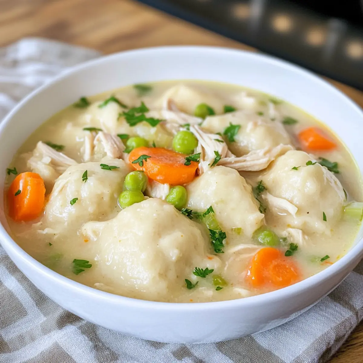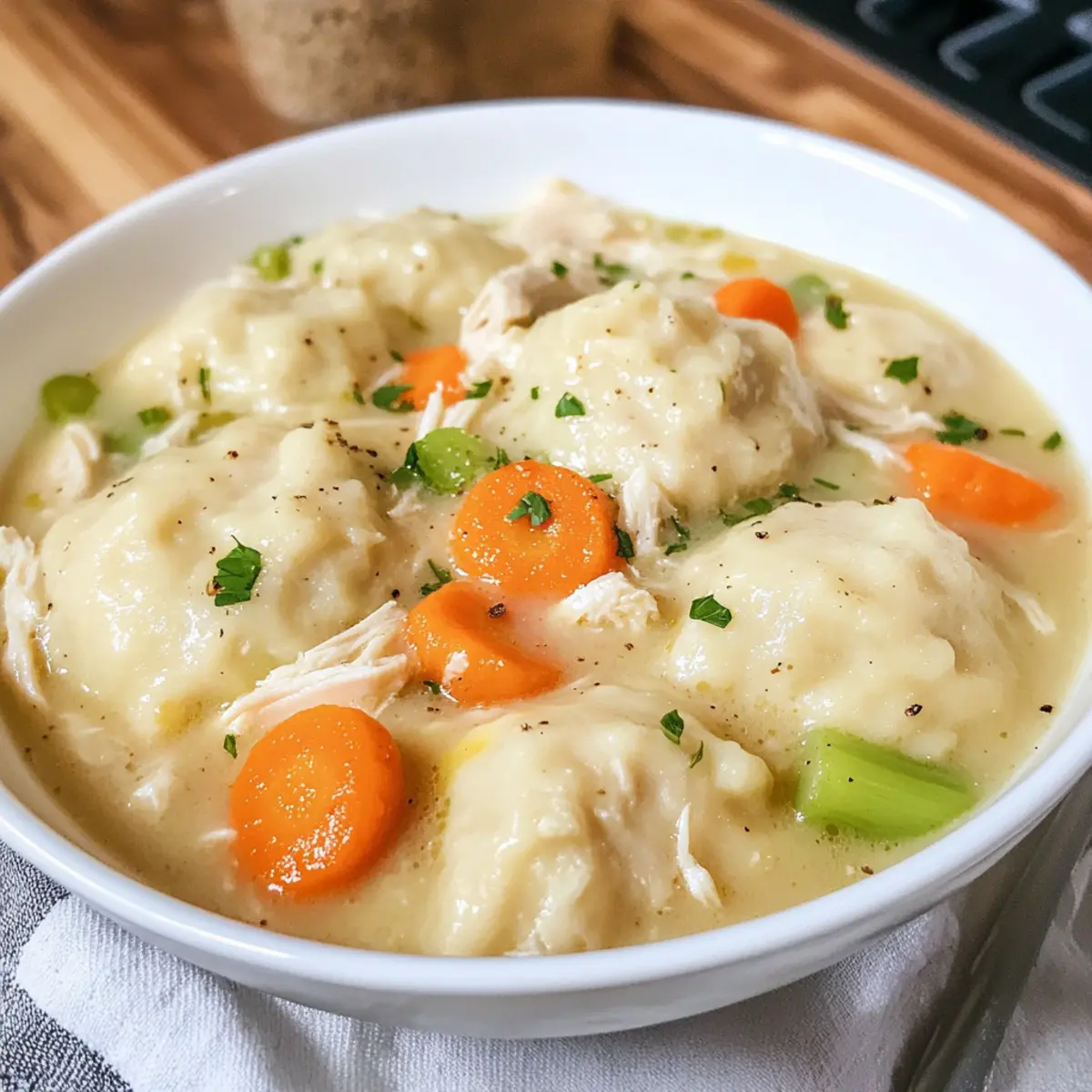 Wenn ich an die Seele der Südstaatenküche denke, kommt mir sofort ein Gericht in den Sinn, das mich immer wieder umhüllt wie eine warme Decke: Cremige Hähnchen und Knödel. Dieses Rezept für cremige Hähnchen und Knödel bietet nicht nur eine einfache Zubereitung ohne langes Kneten, sondern verwöhnt auch den Gaumen mit seiner herzhaften und cremigen Brühe. Mit zartem Hähnchen, bunten Gemüse und fluffigen Knödeln wird es zum echten Seelenfutter, das die Familie zusammenbringt. Zudem kann man es an einem regnerischen Abend genauso genießen wie an einem sonnigen Sonntagnachmittag – ein wahrer Alleskönner für jede Gelegenheit! Wer könnte da schon widerstehen? Lass uns gemeinsam herausfinden, wie du dieses köstliche Gericht zubereitest! Warum sind cremige Hähnchen und Knödel so beliebt? Herzhafter Komfort: Dieses Gericht ist der Inbegriff von Komfortessen und bringt Wärme an kalten Tagen. Einfache Zubereitung: Mit nur wenigen Zutaten und ohne aufwendige Teigvorbereitung gelingt es jedem, dieses Rezept zu meistern. Vielfältige Aromen: Die Kombinationsmöglichkeiten mit frischen Kräutern oder verschiedenen Gemüsesorten machen es spannend und wandelbar. Perfekte Konsistenz: Fluffige Knödel treffen auf eine cremige Brühe – ein Vergnügen bei jedem Bissen. Familienfreundlich: Ob für ein schnelles Abendessen unter der Woche oder an einem gemütlichen Sonntag, dieses Gericht begeistert Groß und Klein. Entdecke auch andere köstliche Rezepte wie Tiramisu Kekse Den oder Iced Matcha Latte für noch mehr Genuss! Cremige Hähnchen und Knödel Zutaten Für das Gericht: Olivenöl – Fügt Geschmack hinzu und hilft, das Gemüse anzubraten. Große Karotten (3) – Sorgt für Süße und Textur in der Suppe. Selleriestangen (3) – Bringt aromatischen Geschmack ins Spiel. Gelbe Zwiebel – Fügt der Brühe eine tiefere Geschmacksbasis hinzu. Gekochtes und zerrissenes Hähnchenbrustfleisch (2-3 Tassen) – Das Hauptprotein des Gerichts. Ungesalzene Hühnerbrühe (7 ½ Tassen) – Die flüssige Basis für die Suppe. Schlagsahne (1 Tasse) – Verstärkt die Cremigkeit und den Reichtum der Brühe. Kosher Salt und schwarzer Pfeffer – Unentbehrliche Gewürze zur Geschmacksverstärkung. Für die Knödel: Allzweckmehl (2 ¼ Tassen) – Schlüsselzutat zur Herstellung der Knödel. Backpulver (1 Esslöffel) – Lässt die Knödel aufgehen und gibt ihnen eine fluffige Textur. Kosher Salt (3 ¼ Teelöffel, getrennt) – Benutzt für sowohl die Suppe als auch die Knödel für ein optimales Aroma. Vollmilch (1 Tasse + 2 Esslöffel) – Hilft, den Knödelteig zu formen. Schwarzer Pfeffer (½ Teelöffel) – Fügt der Suppe zusätzlichen Geschmack hinzu. Mit diesen Zutaten bist du bereit, die Aromen der cremigen Hähnchen und Knödel zum Leben zu erwecken, während du die Seele der Südstaatenküche in deine Küche bringst! Step-by-Step Instructions for Cremige Hähnchen und Knödel Rezept Step 1: Gemüse anbraten Erhitze in einem Dutch Oven das Olivenöl bei mittlerer bis hoher Temperatur. Füge die in Scheiben geschnittenen Karotten, Sellerie und die fein gewürfelte Zwiebel hinzu. Sauté das Gemüse etwa 5 bis 8 Minuten lang, bis es leicht weich ist und appetitlich duftet. Dies bildet die Geschmacksbasis für die cremige Brühe. Step 2: Brühe köcheln lassen Gieße die ungesalzene Hühnerbrühe in den Topf und bringe sie zum Kochen. Reduziere die Hitze und lasse die Brühe 15 Minuten lang sanft köcheln, damit sich die Aromen gut entfalten. Du wirst sehen, wie die Suppe beginnt, schön zu dampfen und die Farben der Zutaten lebendig werden. Step 3: Hähnchen hinzufügen Nachdem die Brühe gekocht hat, füge das zerrissene Hähnchenfleisch hinzu und rühre gut um, damit sich das Hähnchen gleichmäßig verteilt. Lasse alles weitere 5 Minuten einkochen, bis das Hähnchen gut durchgewärmt ist und die Brühe köstlich aussieht, während sich die Aromen verbinden. Step 4: Knödelteig vorbereiten In einer separaten Schüssel vermische das Allzweckmehl, das Backpulver und 1 ¼ Teelöffel Salz. Vermenge die Zutaten gut, bevor du die Milch langsam einrührst, bis der Teig gerade so verbunden ist. Achte darauf, nicht zu lange zu rühren, damit die Knödel fluffig werden. Step 5: Knödel kochen Setze esslöffelgroße Portionen des Knödelteigs vorsichtig in die köchelnde Brühe. Decke den Topf ab und lasse die Knödel 20 Minuten lang sanft garen. Sie sollten oben schwimmen und in der Mitte durchgegart sein, wenn du sie leicht mit einer Gabel anstichst. Step 6: Finaler Feinschliff Sobald die Knödel fertig sind, rühre die Schlagsahne ein und würze mit dem verbleibenden Salz und Pfeffer nach Geschmack. Lasse das Gericht kurz abkühlen, bevor du es servierst, und genieße die cremige Hähnchen und Knödel. Lagerungstipps für cremige Hähnchen und Knödel Zimmertemperatur: Diese Speise sollte nicht länger als 2 Stunden bei Zimmertemperatur stehen gelassen werden, um die Frische und Sicherheit zu gewährleisten. Kühlschrank: Bewahre die cremigen Hähnchen und Knödel in einem luftdichten Behälter im Kühlschrank für bis zu 4 Tage auf. So bleiben die Aromen erhalten und die Brühe cremig. Gefrierer: Friere die Portionen in einem gut verschlossenen Gefrierbeutel oder Behälter für bis zu 3 Monate ein. Achte darauf, die Luft herauszudrücken, um Gefrierbrand zu vermeiden. Wiedererwärmen: Zum Wiedererwärmen tau die gefrorene Portion über Nacht im Kühlschrank auf. Erwärme sie dann vorsichtig in einem Topf bei mittlerer Hitze, bis sie vollständig durchgewärmt ist, und füge eventuell einen Schuss Brühe oder Sahne hinzu, um die Cremigkeit zu bewahren. Vorbereitungen für cremige Hähnchen und Knödel Rezept Dieses cremige Hähnchen und Knödel Rezept ist perfekt für alle, die Zeit sparen möchten! Du kannst das zerrissene Hähnchenfleisch bis zu 3 Tage im Voraus zubereiten und im Kühlschrank aufbewahren, damit es bereits durchgezogen ist. Auch die geschnittenen Gemüse wie Karotten und Sellerie