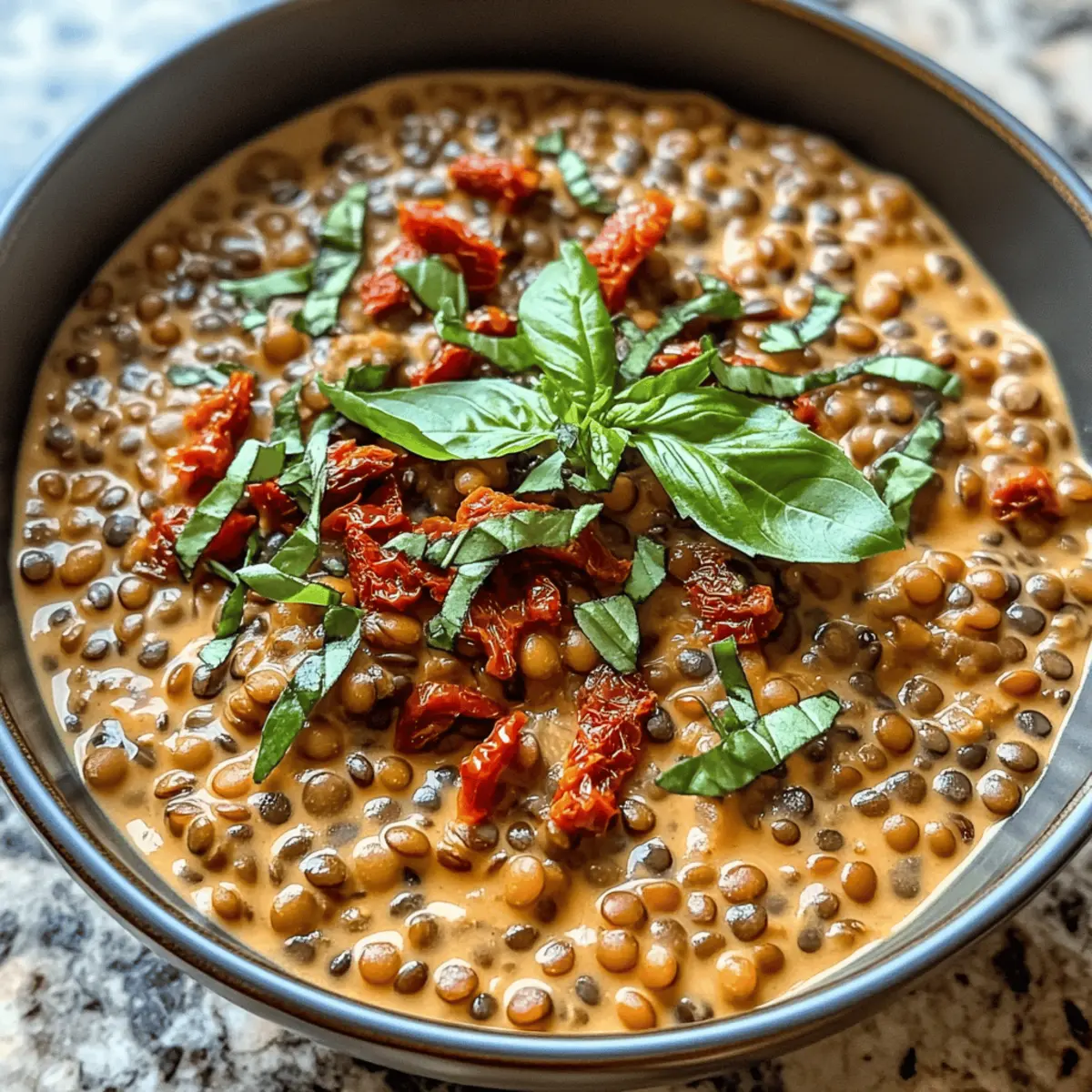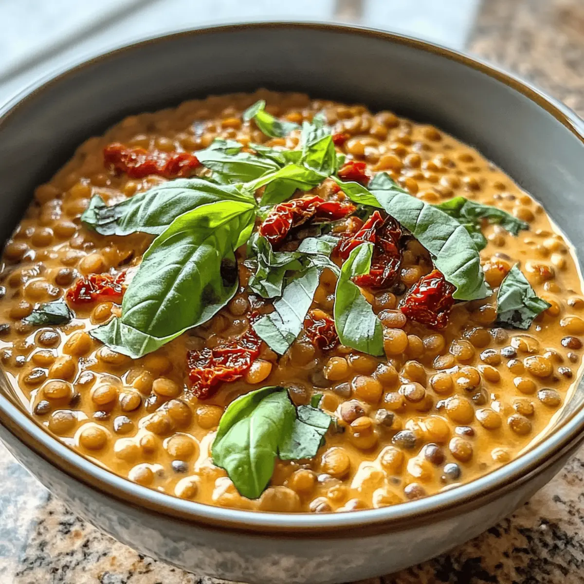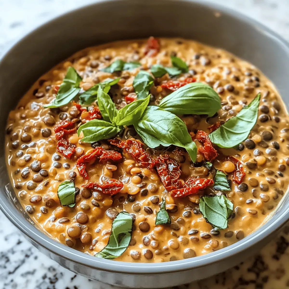 Hektische Wochenenden und der Wunsch nach etwas Warmem und Beruhigendem können manchmal eine kleine Herausforderung darstellen. Genau hier kommen meine Cremigen Heirate Mich Linsen ins Spiel! Diese herzhafte und proteinreiche Mahlzeit vereint die nussigen Aromen von Puy-Linsen mit sonnengetrockneten Tomaten und aromatischen Kräutern. In nur 30 Minuten ist dieses gesunde One-Pot-Gericht zubereitet und verwöhnt jeden Gaumen – perfekt für Vegetarier und Fleischliebhaber gleichermaßen. Ob als wärmendes Abendessen nach einem langen Tag oder als schnelles Mittagessen, es bietet nicht nur ein volles Aroma, sondern auch die Leichtigkeit der schnellen Zubereitung. Neugierig, wie man eine schmackhafte und nahrhafte Mahlzeit im Handumdrehen auf den Tisch zaubert? Lass uns loslegen! Warum wirst du diese Linsen lieben? Einfachheit: Die Zubereitung der Cremigen Heirate Mich Linsen ist denkbar einfach und erfordert keine ausgeklügelten Kochtechniken. Perfekt für Anfänger und vielbeschäftigte Köche! Reichhaltiger Geschmack: Die Kombination aus Puy-Linsen und sonnengetrockneten Tomaten sorgt für ein intensives und herzhaftes Aroma, das die ganze Familie begeistert. Vielseitig: Dieses Rezept lässt sich leicht anpassen; füge gebratenes Gemüse, frische Kräuter oder sogar etwas Würze hinzu, um neue Geschmackserlebnisse zu schaffen! Schnell: In nur 30 Minuten steht dieses gesunde One-Pot-Gericht auf dem Tisch – ideal für hektische Wochentage! Nahrhaft: Mit etwa 15g Protein pro Portion sind die Linsen eine hervorragende Proteinquelle, die sich perfekt für eine ausgewogene Ernährung eignet. Köstliche Beilage: Serviere die Linsen mit Cremiger Herzhaft Halloumi oder kombiniere sie mit frischen Salaten für ein komplettes Mahlzeit-Erlebnis! Cremige Heirate Mich Linsen Zutaten Hinweis: Hier sind die einfachen und schmackhaften Zutaten, die du benötigst, um die Cremigen Heirate Mich Linsen zuzubereiten. Für die Basis Öl von sonnengetrockneten Tomaten – verleiht Reichtum und Geschmackstiefe; substituiere es mit Olivenöl für eine leichtere Note. Rote Zwiebel – sorgt für Süße und Tiefe beim Anbraten; achte darauf, sie fein zu würfeln für gleichmäßiges Garen. Knoblauch (2 Zehen) – verbessert den Gesamteindruck; benutze frischen Knoblauch für das beste Aroma. Gekochte Puy-Linsen (250 g) – Hauptquelle für Protein mit nussigem Geschmack; wenn du getrocknete Linsen verwendest, justiere die Kochzeit und Flüssigkeitsmenge. Für den Geschmack Sonnengetrocknete Tomaten (8 Stück) – bringt konzentrierten, würzigen Geschmack; nutze in Öl eingelegte Tomaten für zusätzliche Feuchtigkeit. Weißwein (60 ml) – deglasiert die Pfanne und fügt Säure hinzu; ersetze ihn durch Gemüsebrühe für eine alkoholfreie Option. Tomatenmark (2 Esslöffel) – verdickt die Sauce und intensiviert den Tomatengeschmack; notwendig für die Reichhaltigkeit. Räucherpaprika (2 Teelöffel) – bietet ein warmes, rauchiges Aroma; ersetze ihn durch normale Paprika für einen milderen Geschmack. Italienische Kräuter (2 Teelöffel) – ergänzt die Gerichte mit aromatischen Aromen; frische Kräuter können für ein intensiveres Profil verwendet werden. Cayennepfeffer (1 Teelöffel) – bringt milde Schärfe; passe die Menge nach deinem Geschmack an. Salz und Pfeffer – nach Geschmack abschmecken; wichtig zum Ausbalancieren der Aromen. Für die cremige Konsistenz Gemüsebrühe (220 ml) – sorgt für Geschmack und Feuchtigkeit; kann bei Bedarf mit Wasser ersetzt werden. Schlagsahne (150 ml) – erzeugt eine reichhaltige, cremige Sauce; verwende Kokosnusscreme für eine vegane Alternative. Hartkäse (30 g) – erhöht die Cremigkeit; ersetze mit Nährhefe für eine milchfreie Option. Für den frischen Geschmack Frisches Basilikum (eine Handvoll) – bringt Frische als Garnitur; ersetze es durch Petersilie, wenn Basilikum nicht verfügbar ist. Saft von ½ Zitrone – belebt das Gericht; frisch gepresster Zitronensaft wird für den besten Geschmack empfohlen. Schritt-für-Schritt-Anleitung für Cremige Heirate Mich Linsen Step 1: Sauté Base Erhitze das Öl von den sonnengetrockneten Tomaten in einer großen Pfanne bei mittlerer Hitze. Füge die fein gewürfelte rote Zwiebel und die sonnengetrockneten Tomaten hinzu und brate sie für 6–8 Minuten an, bis die Zwiebel glasig und weich ist. Achte darauf, die Hitze nicht zu hoch einzustellen, um ein Anbrennen zu vermeiden. Step 2: Add Garlic Gib den fein gehackten Knoblauch hinzu und koche ihn für eine weitere Minute, dabei ständig rühren, damit er nicht anbrennt. Der aromatische Duft des Knoblauchs wird beginnen, sich zu entfalten und verleiht den Cremigen Heirate Mich Linsen eine köstliche Geschmacksbasis. Step 3: Mix in Spices Rühre das Tomatenmark, den geräucherten Paprika, die italienischen Kräuter und den Cayennepfeffer unter. Lass die Mischung für 2–3 Minuten köcheln, bis die Gewürze intensiv aromatisch sind. Die Farbe sollte tief und einladend sein, was die Reichhaltigkeit der Linsen verstärkt. Step 4: Deglaze Gieße den Weißwein in die Pfanne und kratze mit einem Holzlöffel den Boden ab, um eventuell angebratene Reste zu lösen. Lass die Mischung 2 Minuten lang köcheln, damit der Alkohol verfliegt und die Aromen sich vereinen. Der aromatische Dampf wird dir einen Vorgeschmack auf die Cremigen Heirate Mich Linsen geben. Step 5: Combine Lentils & Sauce Füge die gekochten Puy-Linsen, die Gemüsebrühe und die Schlagsahne hinzu. Koche alles für 10–15 Minuten ohne Deckel bei mittlerer Hitze, bis die Sauce eingedickt ist und die Linsen schön durchzogen werden. Rühre gelegentlich um, um ein Anbrennen zu verhindern, und genieße die Entwicklung des leckeren Aromas. Step 6: Finish Nimm die Pfanne vom Herd und rühre den geriebenen Käse sowie den Zitronensaft und frisches Basilikum unter. Die Mischung wird cremig und vollmundig werden, perfekt als köstliche Beilage oder Hauptgericht. Serviere die Cremigen Heirate Mich Linsen warm mit k