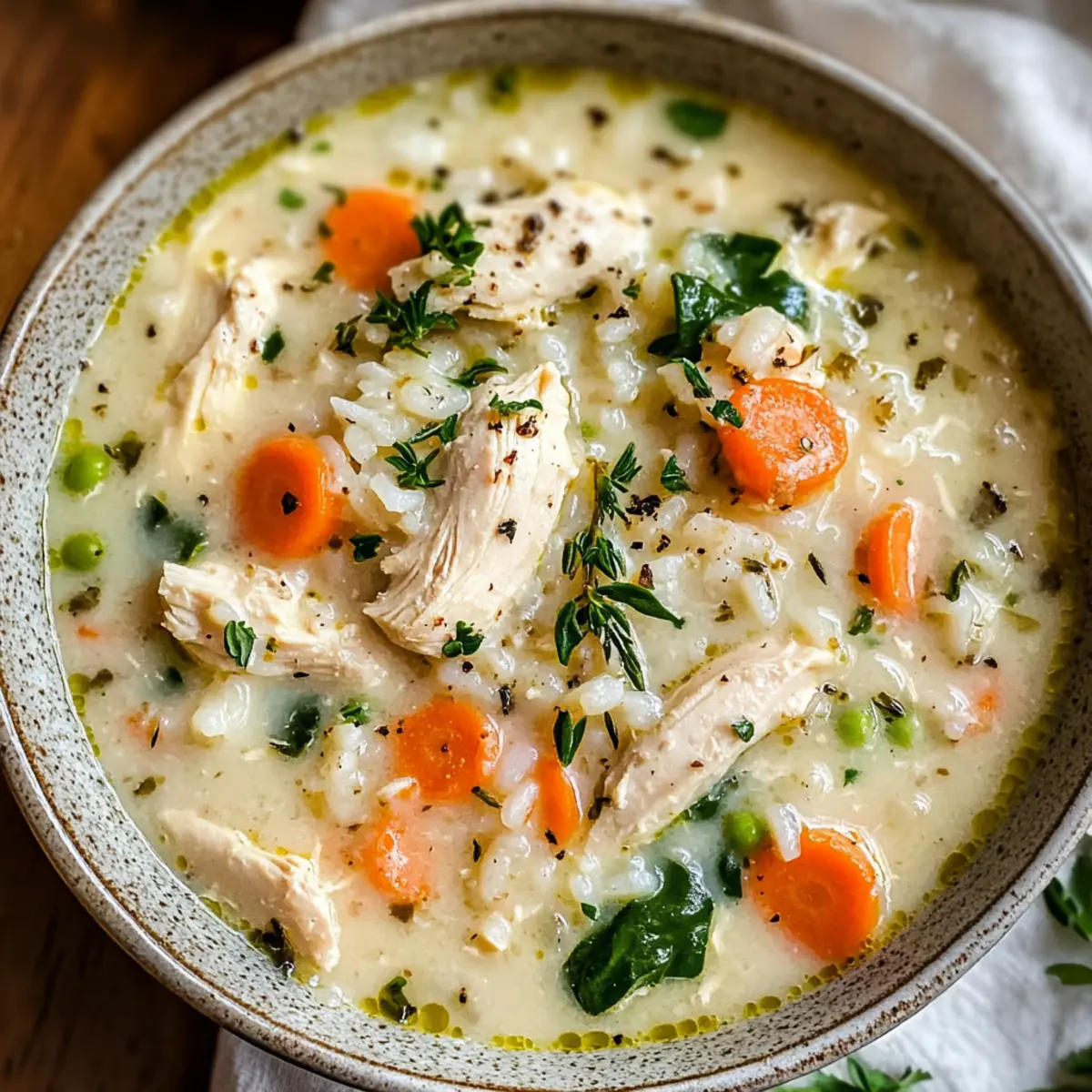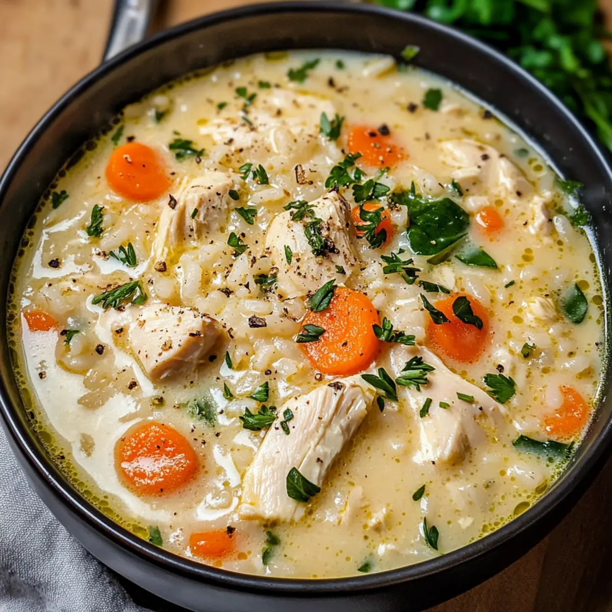 Wenn die Temperaturen sinken und die Abende kühler werden, gibt es kaum etwas Beruhigenderes als eine dampfende Schüssel Cremige Hühner-Reis-Suppe. Die samtige Brühe kombiniert zarte Hähnchenstücke und sättigenden Reis zu einem unvergleichlichen Komfortessen, das mit all seinen Aromen jeden in den Bann zieht. Was ich an diesem Rezept besonders schätze, ist die einfache Zubereitung – ideal für vielbeschäftigte Tage. Außerdem lässt sich die Suppe wunderbar an verschiedene Ernährungsbedürfnisse anpassen, sodass jeder am Tisch etwas davon hat. Habt ihr schon einmal darüber nachgedacht, wie viel Freude eine warme Suppe bringen kann? Lasst uns gemeinsam dieses wärmende Gericht entdecken! Warum wirst du diese Suppe lieben? Herzlichkeit, die verbindet: Diese cremige Hühner-Reis-Suppe zaubert ein Lächeln auf jedes Gesicht und ist mit ihren Aromen der Inbegriff von Gemütlichkeit. Einfach zuzubereiten: Mit nur wenigen Schritten ist dieses Rezept perfekt für unkomplizierte Abendessen nach einem langen Tag. Vielseitigkeit pur: Ob glutenfrei oder mit gesunden Alternativen – die Suppe passt sich ganz euren Bedürfnissen an. Gesunde Zutaten: Mit frischem Gemüse und magerem Hähnchen ist sie eine nahrhafte Wahl, die euch sättigt. Familienfreundlich: Jeder wird begeistert sein, und diese Suppe wird schnell zum neuen Lieblingsgericht am Tisch. Entdeckt, wie diese Cremige Hühner-Reis-Suppe nicht nur die Seele wärmt, sondern auch für jede Diätvariante eine passende Option bietet! Cremige Hühner-Reis-Suppe Zutaten • Hier sind die notwendigen Zutaten, um deine eigene cremige Hühner-Reis-Suppe zuzubereiten: Für die Brühe Hähnchen – sorgt für mageres Protein und Geschmack; Hähnchenbrust oder -schenkel für optimalen Biss verwenden. Brühe – bildet die Basis und verleiht der Suppe Tiefe; auf natriumarme oder selbstgemachte Brühe zurückgreifen für besseren Geschmack. Für die cremige Basis Milch/Sauerrahm – sorgt für die samtige Textur; kann durch pflanzliche Milch oder griechischen Joghurt für gesündere Optionen ersetzt werden. Butter – fügt Reichtum hinzu; kann reduziert oder durch Olivenöl für eine leichtere Version ersetzt werden. Mehl – dient als Bindemittel in der Brühe; glutenfreies Mehl ist eine hervorragende Wahl für glutenfreie Optionen. Für die Füllung Reis – fungiert als sättigende Kohlenhydratquelle; brauner oder wildreis kann gegen weißen Reis eingetauscht werden für zusätzliche Nährstoffe. Gemüse (Karotten, Sellerie, Spinat) – steigert die Nährstoffe und die Farbe der Suppe; die Auswahl kann je nach Vorliebe oder Saison angepasst werden. Entdecke, wie einfach es ist, eine köstliche Cremige Hühner-Reis-Suppe zuzubereiten, die die ganze Familie begeistern wird! Schritt-für-Schritt-Anleitung für Cremige Hühner-Reis-Suppe Step 1: Gemüse anbraten In einem großen Topf die Butter bei mittlerer Hitze schmelzen. Die gewürfelten Karotten, Sellerie und eventuell gewünschte Gemüse hinzufügen. Diese Mischung etwa 5 Minuten lang anbraten, bis das Gemüse weich und leicht goldbraun ist. Step 2: Hähnchen hinzufügen Das zerkleinerte oder gewürfelte Hähnchen in den Topf geben und unter Rühren braten, bis es leicht bräunlich wird. Dies dauert ungefähr 5-7 Minuten. Achten Sie darauf, dass das Hähnchen gleichmäßig gegart wird, um eine optimale Textur zu erreichen. Step 3: Mehl einarbeiten Das Mehl gleichmäßig über das Hähnchen und Gemüse streuen, dabei kontinuierlich umrühren. Etwa 1 Minute garen, um eine Mehlschwitze zu erzeugen; dies sorgt für eine cremige Konsistenz in der Suppe. Step 4: Brühe hinzufügen Langsam die Hühnerbrühe in den Topf gießen und dabei ständig umrühren, um Klumpenbildung zu vermeiden. Die Mischung aufkochen lassen und dann die Hitze reduzieren, um sie zum Simmern zu bringen. Step 5: Reis einrühren Den Reis in die Suppe geben und 15-20 Minuten lang köcheln lassen, bis der Reis zart ist und die Brühe leicht eingedickt erscheint. Gelegentlich umrühren, um ein Ankleben am Topfboden zu vermeiden. Step 6: Cremigkeit vollenden Milch oder Sahne hinzufügen und gründlich umrühren, bis alles erwärmt ist. Dies dauert etwa 2-3 Minuten. Nach Geschmack mit Salz und Pfeffer würzen, um die Aromen der Cremigen Hühner-Reis-Suppe perfekt abzurunden. Step 7: Servieren Die Suppe in Schalen schöpfen und nach Belieben mit frischen Kräutern garnieren. Diese cremige Hühner-Reis-Suppe ist ein köstliches, wärmendes Gericht für jede Gelegenheit. Cremige Hühner-Reis-Suppe Variationen Lass deiner Kreativität freien Lauf und passe dieses Rezept ganz nach deinem Geschmack an! Dairy-Free: Ersetze die Milch durch pflanzliche Milch wie Mandel- oder Hafermilch für eine cremige, milchfreie Variante. Glutenfrei: Verwende glutenfreies Mehl, um die Suppe zu binden, ohne Kompromisse bei der Konsistenz einzugehen. Protein-Power: Tausche das Hähnchen gegen Putenfleisch oder Tofu aus, um pflanzliche Proteine zu integrieren und den Geschmack zu variieren. Würzige Note: Füge eine Prise Cayennepfeffer oder Paprika hinzu, um deiner Suppe ein wenig Schwung und Wärme zu verleihen. Mediterraner Twist: Integrieren Sie getrocknete Tomaten und Oliven für ein geschmackvolles, mediterranes Flair – perfekt für Abwechslung in den Aromen! Gemüsevielfalt: Experimentiere mit saisonalem Gemüse wie Zucchini oder grünen Bohnen, um die Nährstoffe zu erhöhen und die Farben lebendig zu halten. Quinoa als Boost: Tausche den Reis gegen Quinoa aus – es ist nahrhaft, glutenfrei und fügt eine angenehme Textur hinzu. Kräuter-Liebhaber: Verfeinere die Suppe mit frischem Basilikum oder Thymian, um die Aromen zu intensivieren und einen frischen Geschmack zu erzielen. Entdecke, wie einfach es ist, die Cremige Hühner-Reis-Suppe nach deinen Vorstellungen zu gestalten und eine Menge Freude beim Kochen zu haben! Cremige Hühner-Reis-Suppe vorbereiten für stressfreie Mahlzeiten Die Cremige Hühner-Reis-Suppe ist perfekt für die Vorbe