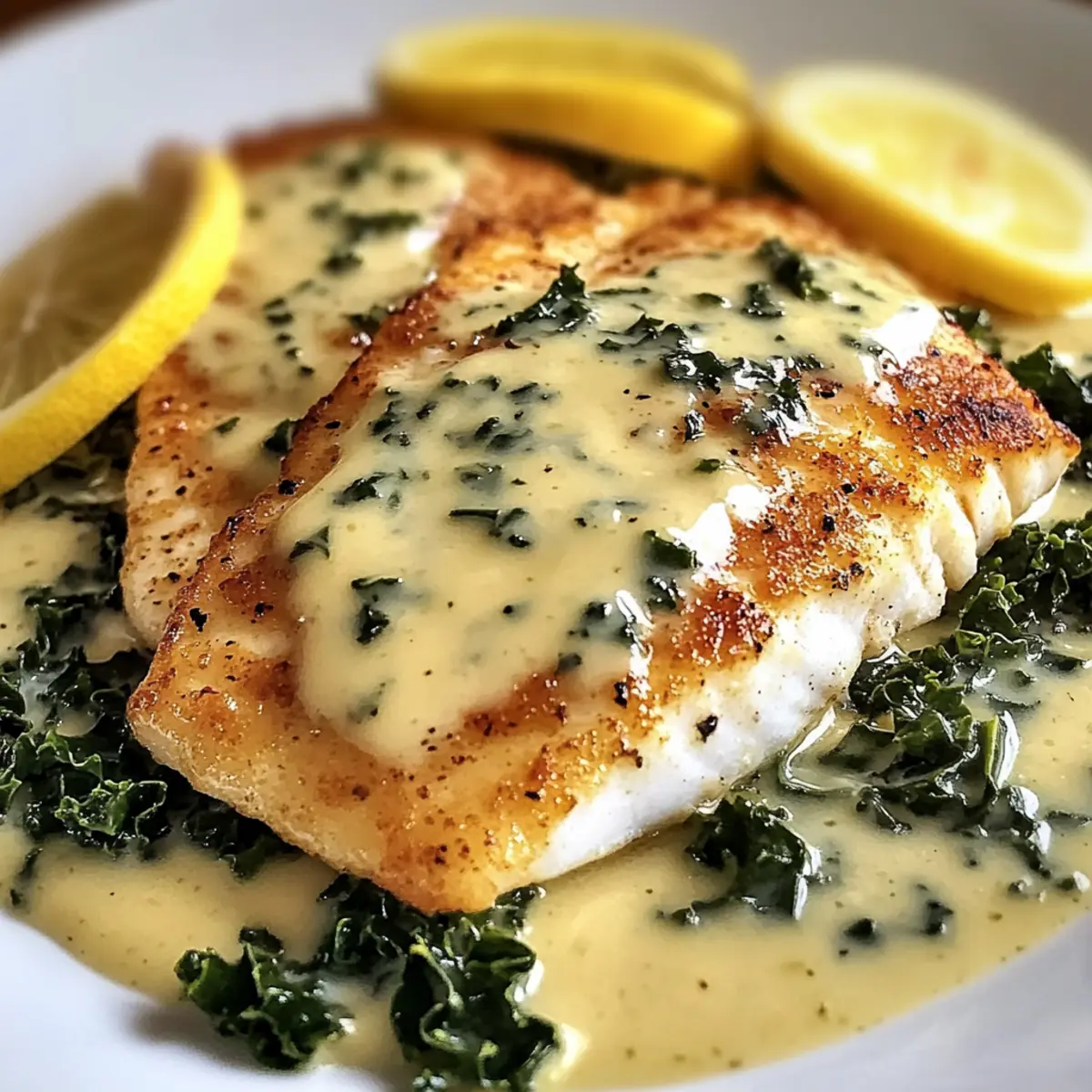 Als ich neulich in der Küche stand, fiel mein Blick auf die frischen Zutaten, die darauf warteten, zu einem köstlichen Gericht verwandelt zu werden. Mit meinem Rezept für Cremige Zitronen-Knoblauch-Kräuter-Glasierte Tilapia bringe ich den frischen Geschmack des Meeres direkt auf den Tisch – und das in weniger als 30 Minuten! Diese einfache, gesunde Zubereitung überzeugt nicht nur mit einer leckeren Kombination aus cremiger Kokosnusssoße, spritziger Zitrone und aromatischem Knoblauch, sondern ist auch ideal für glutenfreie und milchfreie Ernährungsweisen. Egal ob für ein schnelles Abendessen nach einem langen Arbeitstag oder als beeindruckendes Gericht für deine Liebsten – dieses Rezept hat alles, was das Herz begehrt. Welche Beilage wirst du wählen, um dieses Geschmackserlebnis zu abrunden? Warum du dieses Rezept lieben wirst Einfachheit: Diese cremige Zitronen-Knoblauch-Kräuter-Glasierte Tilapia ist im Handumdrehen zubereitet und ideal für Anfänger sowie erfahrene Köche. Vielseitige Anpassungen: Du kannst Tilapia ganz einfach durch Garnelen oder Lachs ersetzen – perfekt für jeden Geschmack! Gesund und Lecker: Die cremige Kokosnusssoße vereint gesunde Zutaten und köstliche Aromen, die selbst die wählerischsten Esser begeistern. Schnell zubereitet: In weniger als 30 Minuten auf dem Tisch, ideal für stressige Tage! Perfekte Beilage: Serviere dazu fluffigen Basmati-Reis oder ein frisches Gemüse, um dein Menü abzurunden und jedem zu gefallen. Meal Prep-Freundlich: Die Soße kann im Voraus zubereitet werden, sodass du die Zubereitungszeit an hektischen Abenden reduzieren kannst. Du wirst nie wieder Fast Food vermissen, wenn du dieses Gericht servierst! Cremige Zitronen-Knoblauch-Kräuter-Glasierte Tilapia Zutaten Für die Tilapia • Tilapia – Das Hauptprotein, verwende hochwertigen gefrorenen Tilapia für beste Ergebnisse. • Olivenöl – Für das Anbraten; sorgt für gesunde Fette und einen angenehmen Geschmack. Für die cremige Soße • Kokosnusscreme (14 oz.) – Kreiert eine reichhaltige, cremige Soße; kann durch reguläre Sahne ersetzt werden, falls gewünscht. • Knoblauchzehen (4-6, gehackt) – Sorgt für intensives Aroma; frisch ist immer die beste Wahl. • Gemüse- oder Fischbrühe (½ Tasse) – Fügt Tiefe hinzu; wähle hausgemachte oder natriumarme, im Geschäft gekaufte Brühe. • Weißweinessig (2 EL, optional) – Erhöht die Säure; kann weggelassen werden, aber dann die Brühe erhöhen. • Zitrone (1, frisch gepresst + ½ in Scheiben) – Für einen spritzigen Geschmack; Zesten können anstelle von Scheiben verwendet werden. • Maisstärke (1 EL) + Wasser (2 EL) – Verdickt die Soße; Alternativen sind Mehl oder Tapiokastärke. • Dairy-Free Parmesan Käse (1 Tasse, gerieben) – Fügt eine käsige Note hinzu; bei Bedarf auch mit regulärem Parmesan ersetzen. • Kale (1 Tasse, gehackt) – Ein Powerfood; Spinat oder Brokkoli sind ebenfalls gute Alternativen. • Gewürze (Salz, Pfeffer, Knoblauchpulver, Petersilie, Oregano, Basilikum, Thymian, Dill) – Betont den Geschmack; nach Belieben anpassen. Für die Beilage • Basmati-Reis – Serviere die Tilapia auf fluffigem Basmati-Reis für ein perfektes Abendessen. • Frisches Gemüse – Gegrillter Spargel oder ein knackiger Salat sind ausgezeichnete Ergänzungen. Dieses Rezept fördert den Genuss einer leckeren und gesunden Mahlzeit, die sich wunderbar deinem individuellen Geschmack anpasst! Schritt-für-Schritt-Anleitung für Cremige Zitronen-Knoblauch-Kräuter-Glasierte Tilapia Step 1: Tilapia anbraten Erhitze eine große Pfanne bei mittlerer bis hoher Hitze und füge 2 Esslöffel Olivenöl hinzu. Nimm die gefrorene Tilapia und lege sie vorsichtig in die Pfanne. Brate die Tilapia 5 Minuten lang auf jeder Seite, bis sie goldbraun und leicht flakey ist. Nimm die Tilapia anschließend aus der Pfanne und stelle sie beiseite. Step 2: Cremige Soße zubereiten In derselben Pfanne, in der die Tilapia gebraten wurde, füge die gehackten Knoblauchzehen hinzu und brate sie für etwa 1 Minute an, bis sie duften. Achte darauf, den Knoblauch nicht anbrennen zu lassen, da er sonst bitter wird. Stelle sicher, dass die Pfanne bei mittlerer Hitze bleibt, während du mit dem nächsten Schritt fortfährst. Step 3: Flüssigkeiten hinzufügen Gieße nun 14 Unzen Kokosnusscreme und ½ Tasse Brühe in die Pfanne. Presse den Saft einer frischen Zitrone hinzu und, falls gewünscht, auch 2 Esslöffel Weißweinessig. Rühre gut um, bis die Mischung zum Sprudeln kommt. Diese cremige Basis wird die Grundlage für die so leckere Zitronen-Knoblauch-Kräuter-Glasierte Tilapia bilden. Step 4: Soße eindicken Mische 1 Esslöffel Maisstärke mit 2 Esslöffeln Wasser in einer kleinen Schüssel, bis es gut vermischt ist. Gieße diese Mischung in die sprudelnde Soße und rühre kräftig, während du die Hitze reduzierst. Lasse die Soße 1-2 Minuten köcheln, bis sie eindickt und eine cremige Textur erhält. Füge 1 Tasse gehackten Grünkohl und die in Scheiben geschnittene Zitrone dazu, und lasse alles für weitere 2-3 Minuten sanft köcheln. Step 5: Tilapia mit der Soße kombinieren Reduziere die Hitze auf niedrig und lege die gebratene Tilapia zurück in die Pfanne. Löffle die cremige Zitronen-Knoblauch-Kräuter-Glasierte Soße großzügig über die Tilapia. Lasse alles für 5-10 Minuten sanft köcheln, damit die Aromen gut miteinander verschmelzen. Die Tilapia sollte sich leicht mit der Gabel zerteilen lassen, wenn sie fertig ist. Step 6: Anrichten und Servieren Serviere die Cremige Zitronen-Knoblauch-Kräuter-Glasierte Tilapia auf einem Bett aus fluffigem Basmati-Reis oder deinem bevorzugten Gemüse. Löffle die reichhaltige Soße großzügig über die Tilapia und garniere das Gericht nach Belieben mit frischen Zitronenscheiben oder Kräutern. Dieses köstliche Gericht ist perfekt für ein schnelles und gesundes Abendessen! Expertentipps für Cremige Zitronen-Knoblauch-Kräuter-Glasierte Tilapia Frische Zutaten: 