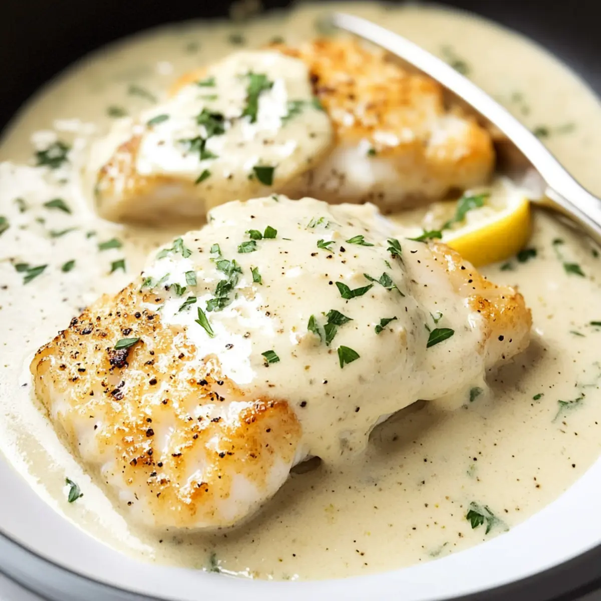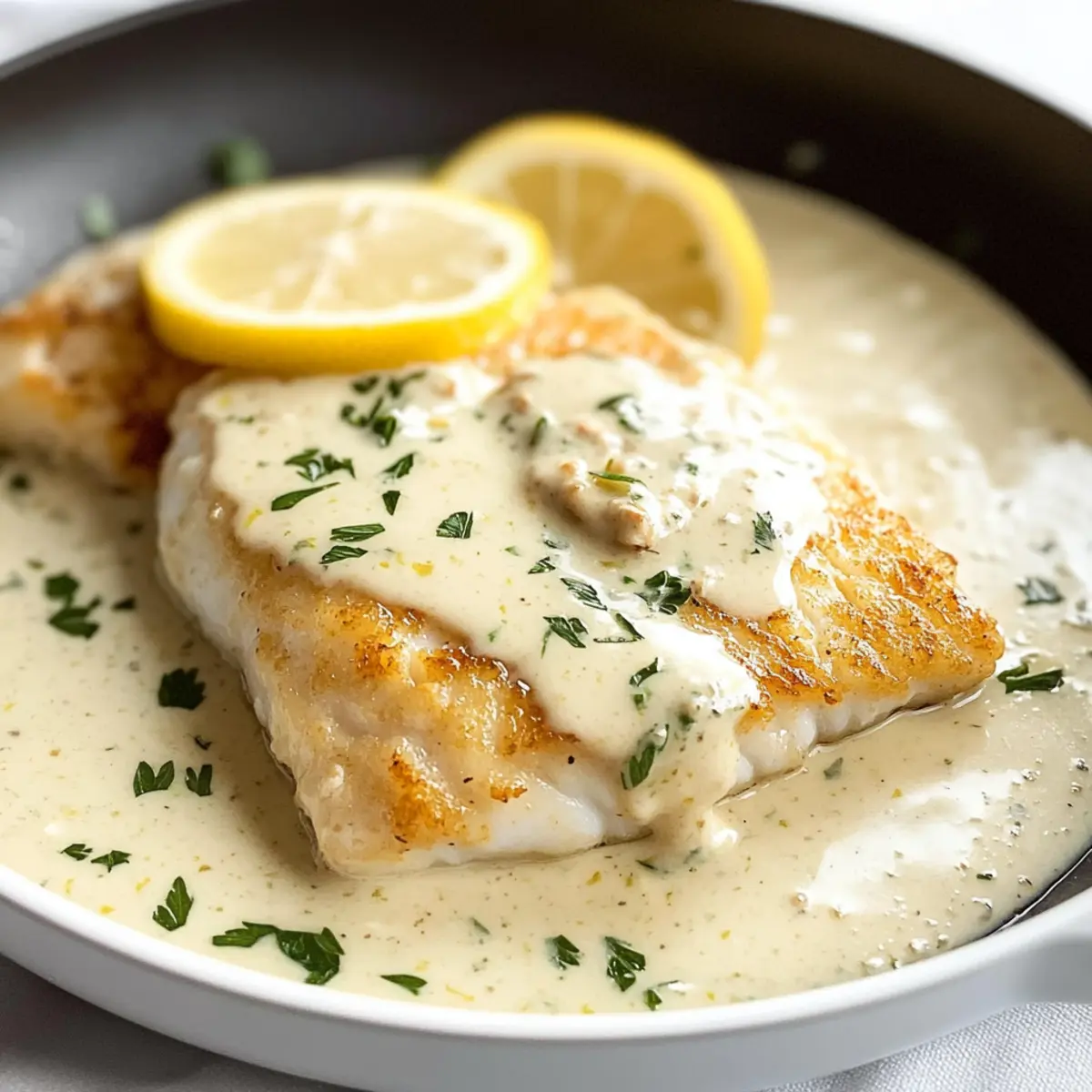 Hast du schon einmal einen anstrengenden Tag mit einem schnellen, aber enttäuschenden Fast-Food-Mahlzeit beendet? Heute möchte ich dir ein Gericht vorstellen, das deine Woche aufhellen wird: Cremiger Zitronen-Parmesan-Kabeljau. Dieses Rezept ist nicht nur in nur 30 Minuten zubereitet, sondern verzaubert mit saftigem Kabeljau in einer köstlichen, cremigen Sauce, die mit der frischen Zitrusnote der Zitrone und dem herzhaften Geschmack von Parmesan harmoniert. Ideal für alle, die sich nach etwas Besonderem sehnen, ohne stundenlang in der Küche zu stehen. Die Kombination aus Cremigkeit und Leichtigkeit macht dieses Gericht zu einem wahren Genuss für deinen Gaumen! Bereit für ein einfaches und schnelles Abendessen, das dich begeistern wird? Lass uns loslegen! Warum wirst du dieses Rezept lieben? Einfachheit: Die Zubereitung ist ganz unkompliziert und benötigt nur grundlegende Kochfähigkeiten – perfekt für jeden! Schnelle Zubereitung: In nur 30 Minuten auf dem Tisch – ideal für hektische Wochentage oder spontane Abendessen mit Freunden. Vielseitig: Du kannst den Kabeljau ganz nach deinem Geschmack anpassen, sei es mit frischem Dill oder Gemüse wie Spinat. Reicher, cremiger Geschmack: Die Kombination aus Zitronensaft und Parmesan verleiht dem Gericht eine unvergleichliche Tiefe, die jedem Gericht einen Hauch von Restaurantqualität verleiht. Begeisterung garantiert: Mit diesem Rezept kannst du deine Liebsten beeindrucken und sie werden nach mehr verlangen – es eignet sich hervorragend für besondere Anlässe oder gemütliche Abende. Für weitere fantastische Ideen schaue dir unseren Artikel über schnelle Abendessen mit Fisch an! Zutaten für cremigen Zitronen-Parmesan-Kabeljau • Hinweis: Hier sind die Zutaten, die du benötigst, um deinen cremigen Zitronen-Parmesan-Kabeljau zuzubereiten. Für den Kabeljau • Kabeljau – Verwende etwa 450 g, in gleich große Stücke geschnitten, um gleichmäßiges Garen zu gewährleisten. • Salz & Pfeffer – Für das Würzen; passe die Menge nach deinem Geschmack an. • Mehl – Hilft, eine leichte Kruste zu bilden; du kannst Weizenmehl oder glutenfreies Mehl verwenden. Für die Sauce • Butter – Verleiht der Sauce Reichtum; zwei Esslöffel zum Braten und ein Esslöffel später für den Geschmack. • Knoblauch – Für ein aromatisches Fundament; fein gehackt sorgt er für eine gleichmäßige Verteilung im Gericht. • Schlagsahne – Kreiert eine luxuriöse, cremige Sauce; verzichte auf Ersatzprodukte, um ein Gerinnen zu vermeiden. • Zitronensaft – Bringt Säure und Frische; frisch gepresst sorgt für den besten Geschmack. • Italienische Gewürzmischung – Fügt zusätzliche Geschmacksnuancen hinzu; optional, aber sehr empfehlenswert. • Parmesankäse – Unverzichtbar für Cremigkeit und Geschmack; frisch gerieben ist am besten. • Frischer Petersilie – Für ein wenig Garnierung und Frische; alternativ kannst du frischen Dill verwenden. Genieße deinen cremigen Zitronen-Parmesan-Kabeljau in vollen Zügen! Schritt-für-Schritt-Anleitung für cremigen Zitronen-Parmesan-Kabeljau Step 1: Kabeljau vorbereiten Lass die Kabeljau-Stücke 15 Minuten bei Zimmertemperatur ruhen, damit sie gleichmäßig garen. Währenddessen kannst du schon einmal eine große Pfanne auf mittlerer Hitze bereitstellen. Dies sorgt dafür, dass die Küchengerüche optimal zur Geltung kommen, und hilft, das Aroma des cremigen Zitronen-Parmesan-Kabeljau zu intensivieren. Step 2: Kabeljau würzen und panieren Würze die Kabeljau-Stücke großzügig mit Salz und Pfeffer. Tauche jedes Stück dann in Mehl und schüttle die überschüssige Menge ab. Diese leichte Panade sorgt für eine perfekte, goldene Kruste, wenn du den Kabeljau brätst. Bereite dich auf eine köstliche, knusprige Textur vor, die die cremige Sauce wunderbar ergänzt. Step 3: Kabeljau braten Erhitze 2 Esslöffel Butter in der vorgeheizten Pfanne bei mittlerer bis hoher Hitze. Lege die schwarz-panierten Kabeljau-Stücke vorsichtig in die Pfanne und brate sie jeweils 2 Minuten pro Seite, bis sie goldbraun sind. Sobald der Kabeljau eine schöne Farbe hat, nimm ihn aus der Pfanne und halte ihn warm – er wird in der cremigen Sauce perfekt nachgaren. Step 4: Sauce zubereiten Reduziere die Hitze der Pfanne auf mittel-niedrig und füge die restliche Esslöffel Butter hinzu. Lass die Butter schmelzen und gib den fein gehackten Knoblauch sowie ½ Esslöffel Mehl hinzu. Rühre das Ganze etwa 1 Minute lang um, bis der Knoblauch aromatisch ist und die Mischung leicht andickt. Dies ist die Grundlage für deine schmackhafte Sauce zum cremigen Zitronen-Parmesan-Kabeljau. Step 5: Sauce verfeinern Gieße die Schlagsahne, den frisch gepressten Zitronensaft und die italienische Gewürzmischung in die Pfanne. Kratze die angebratenen Bits vom Pfannenboden ab und lass die Sauce 2-3 Minuten sanft köcheln. Die Mischung wird beginnen, dick und cremig zu werden, während sich die Aromen entfalten – ein echter Genuss in deinem cremigen Zitronen-Parmesan-Kabeljau. Step 6: Käse und Kräuter hinzufügen Rühre den frisch geriebenen Parmesan und die gehackte Petersilie in die Sauce ein, damit sie optimal schmelzen. Achte darauf, die Sauce gut umzurühren, bis die Käsegeschmäcker gleichmäßig verteilt sind. Diese cremige Kombination wird deinem Kabeljau eine reichhaltige Note verleihen und ihn noch köstlicher machen. Step 7: Kabeljau zurück in die Pfanne Lege den vorgebratenen Kabeljau wieder in die Pfanne und lasse ihn für 2-3 weitere Minuten in der cremigen Sauce erwärmen. Überwache dabei, wie der Kabeljau zart und leicht zerfällt, wenn du mit einer Gabel daran rührst. Diese letzte Phase sorgt für saftigen und geschmackvollen Kabeljau, perfekt für dein Abendessen. Step 8: Anrichten und servieren Serviere den cremigen Zitronen-Parmesan-Kabeljau sofort, indem du großzügig Sauce über jedes Stück gibst. Garnierst du das Gericht mit ein wenig zusätzlicher Petersilie für Farbtupfer und Frische. Genieß