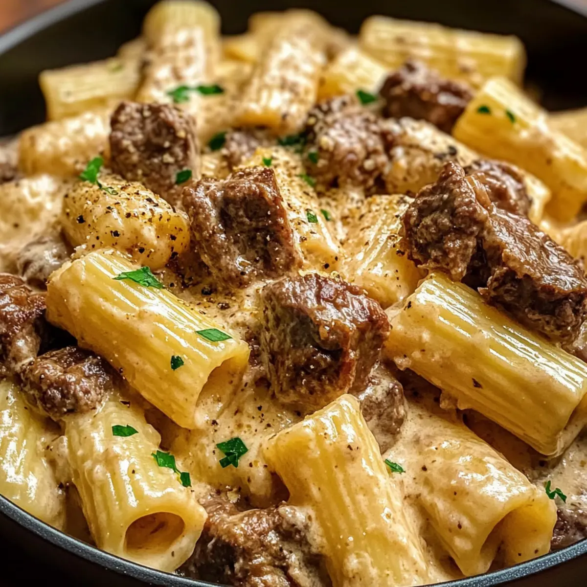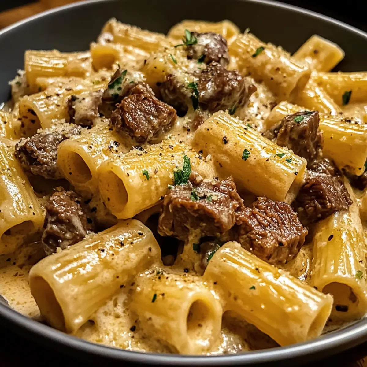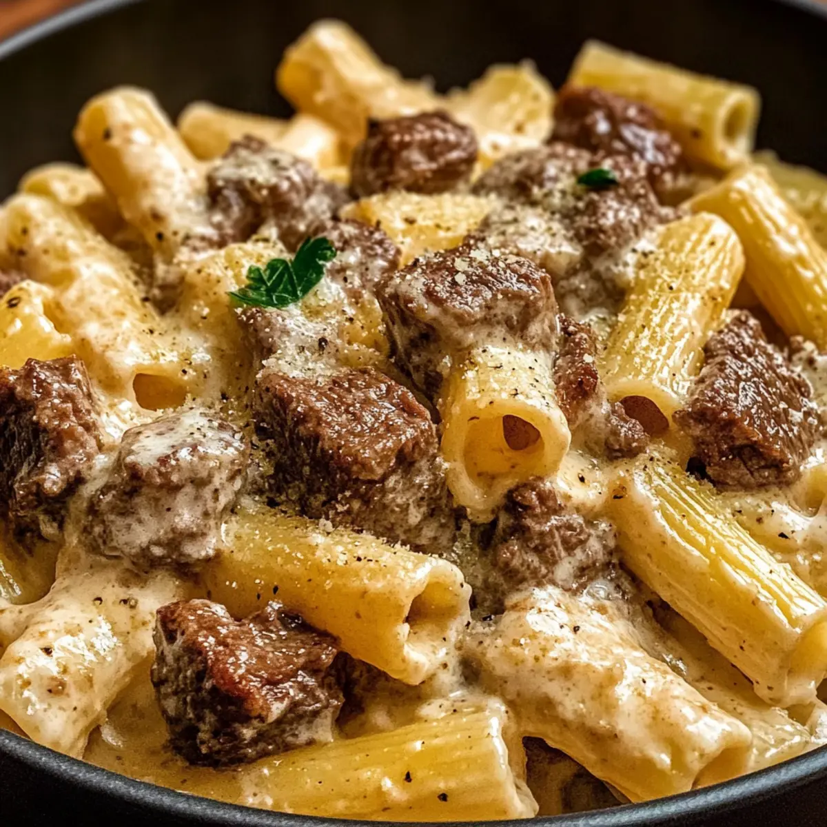 Die Küche ist wie ein liebevolles Familienporträt – jeder Bissen erzählt eine Geschichte. Heute lade ich euch ein, in die verführerische Welt des cremigen Parmesan-Rindfleischs mit Rigatoni einzutauchen. Dieses Gericht ist nicht nur ein Fest für die Sinne, sondern auch der Inbegriff eines schnellen Abendessens, das selbst die anspruchsvollsten Esser beeindrucken wird. Mit zartem Rindfleisch, das in einer samtigen Parmesan-Sahnesauce badet, und den herzhaften Rigatoni ist es eine harmonische Kombination, die Komfort und Genuss vereint. Es eignet sich perfekt für ein gemütliches Familienessen oder ein kulinarisches Highlight an einem hektischen Wochentag. Seid ihr bereit, eure nächste lieblingsabendliche Überraschung zu entdecken? Warum wirst du dieses Rezept lieben? Einfachheit: Die Zubereitung ist kinderleicht und erfordert nur wenige Schritte, sodass du mehr Zeit mit deiner Familie verbringen kannst. Cremige Köstlichkeit: Die Verbindung von zartem Rindfleisch und einer reichhaltigen Parmesan-Sahnesauce sorgt für ein Geschmackserlebnis, das deinen Gaumen verzaubert. Familienfreundlich: Perfekt für ein schnelles Abendessen, das die ganze Familie glücklich macht, besonders wenn die Zeit knapp ist. Vielseitig: Du kannst das Gericht leicht anpassen, zum Beispiel mit verschiedenen Pastas oder Gemüse, um das Rezept nach deinem Geschmack zu variieren. Zeitersparnis: In weniger als 30 Minuten auf dem Tisch, ideal für stressige Wochentage. Lass dich von diesem Rezept inspirieren und entdecke Verwendung von frischen Zutaten für ein noch besseres Geschmackserlebnis! Cremiges Parmesan-Rindfleisch mit Rigatoni Zutaten • Für die Pasta Rigatoni – Die strukturierende Basis des Gerichts, die perfekt die Sauce hält. Du kannst auch andere Pasta wie Penne verwenden. • Für das Fleisch Rindfleisch – Bringt Tiefe und Reichtum in den Geschmack. Wähle mageres Fleisch für zarte Stücke. • Für die Sauce Parmesan – Das Herzstück der cremigen Sauce. Frisch gerieben sorgt für den besten Geschmack. Sahne – Macht die Sauce herrlich cremig. Für eine leichtere Version kannst du auch Halb-Würfel verwenden. • Für die Gewürze Gewürze – Verbessern den Geschmack; italienische Kräuter sind eine tolle Ergänzung. Diese Zutaten vereinen sich zu einem köstlichen Gericht, das sowohl befriedigend als auch ein Genuss für die ganze Familie ist! Schritt-für-Schritt-Anleitung für Cremiges Parmesan-Rindfleisch mit Rigatoni Step 1: Rigatoni kochen Bringe in einem großen Topf gesalzenes Wasser zum Kochen und füge die Rigatoni hinzu. Koche die Pasta nach Packungsanweisung al dente, in der Regel etwa 10-12 Minuten. Rühre gelegentlich um, damit die Nudeln nicht zusammenkleben. Gieße die Rigatoni ab und stelle sie beiseite, während du das cremige Parmesan-Rindfleisch zubereitest. Step 2: Rindfleisch anbraten Erhitze in einer großen, tiefen Pfanne bei mittlerer Hitze etwas Öl. Füge das gewürfelte Rindfleisch hinzu und brate es an, bis es gleichmäßig gebräunt und gar ist, etwa 6-8 Minuten. Rühre das Fleisch regelmäßig um, um es nicht an der Pfanne haften zu lassen. Nimm das Rindfleisch aus der Pfanne und lege es beiseite, während du die Sauce zubereitest. Step 3: Sauce zubereiten In derselben Pfanne, in der du das Rindfleisch gebraten hast, füge die Sahne bei mittlerer Hitze hinzu. Rühre die frischen Parmesanflocken ein und lasse die Mischung köcheln, bis der Käse geschmolzen und die Sauce cremig ist, etwa 3-5 Minuten. Achte darauf, die Sauce ständig umzurühren, damit sie nicht anbrennt. Diese cremige Mischung wird die Basis für dein Cremiges Parmesan-Rindfleisch mit Rigatoni. Step 4: Rindfleisch und Rigatoni kombinieren Wenn die Sauce eine glatte Konsistenz erreicht hat, füge das Rindfleisch wieder in die Pfanne hinzu. Danach gib die abgetropften Rigatoni in die Mischung. Verwende eine Zange oder einen Löffel, um alles sanft zu vermengen, sodass die Pasta gleichmäßig mit der cremigen Sauce umhüllt wird. Dies sollte nur ein paar Minuten dauern, damit sich die Aromen gut verbinden. Step 5: Anrichten und Servieren Sobald alles gut vermischt ist, schmecke das Gericht mit Salz und Pfeffer ab. Serviere das Cremige Parmesan-Rindfleisch mit Rigatoni sofort in warmen Schalen. Garniere nach Belieben mit zusätzlichem frisch geriebenem Parmesan und frischen Kräutern. Diese köstliche Kombination wird nicht nur deinen Tisch, sondern auch die Herzen deiner Familie erobern! Tipps zur Vorbereitung des Cremigen Parmesan-Rindfleischs mit Rigatoni für stressfreie Abende Die Zubereitung des Cremigen Parmesan-Rindfleischs mit Rigatoni lässt sich ganz einfach im Voraus planen! Du kannst das Rindfleisch bis zu 3 Tage im Voraus anbraten und in einem luftdichten Behälter im Kühlschrank aufbewahren, um Zeit zu sparen. Auch die Rigatoni kann bereits gekocht und abgekühlt in einem anderen Behälter aufbewahrt werden. Wenn du bereit bist, das Gericht zu servieren, erhitze das Rindfleisch in einer Pfanne, füge die Sahne und den Parmesan hinzu, und mische dann die vorbereiteten Rigatoni hinein. Achte darauf, alles sanft umzurühren, um die cremige Sauce gleichmäßig zu verteilen. Mit diesen Vorbereitungen genießt du an stressigen Abenden ein köstliches, hausgemachtes Abendessen, das einfach und schnell zubereitet ist! Aufbewahrungstipps für Cremiges Parmesan-Rindfleisch mit Rigatoni Kühlschrank: Bewahre das Cremige Parmesan-Rindfleisch mit Rigatoni in einem luftdichten Behälter im Kühlschrank auf und genieße es innerhalb von 3 Tagen für den besten Geschmack. Gefrierschrank: Du kannst das Gericht bis zu 3 Monate einfrieren. Teile es in Portionen auf und verwende gefrierfeste Behälter oder Gefrierbeutel, um die Frische zu erhalten. Wiedererhitzen: Zum Aufwärmen, erhitze die gefrorenen Portionen langsam in einer Pfanne bei mittlerer Hitze. Füge einen Schuss Sahne hinzu, um die Cremigkeit der Sauce wiederherzustellen. Raumtemperatur: Lass das Gericht nicht länger als 2 Stunden