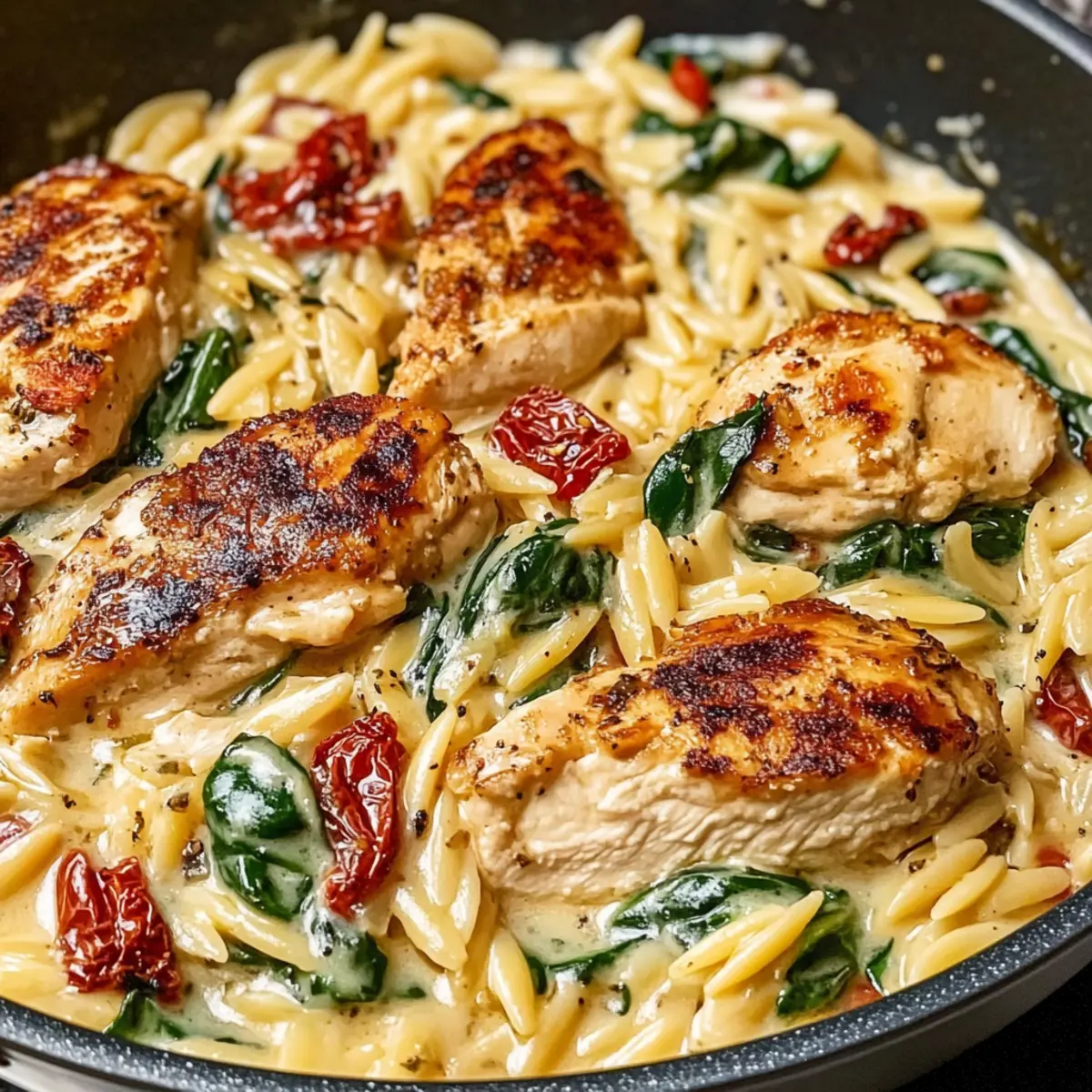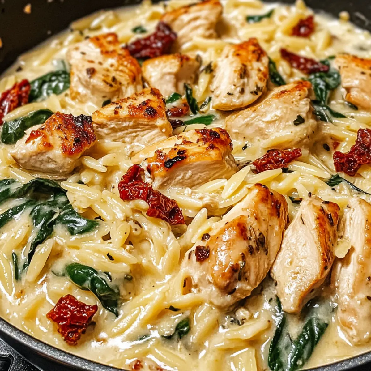 Die Küche duftet verführerisch nach Italien, und mein Magen knurrt bereits vor Vorfreude. Heute teile ich mit euch eines meiner absoluten Lieblingsgerichte: Cremiges toskanisches Hähnchen-Orzo! Dieses Rezept ist nicht nur ein köstlicher Genuss, sondern auch ein echtes One-Pot-Wunder, das sich hervorragend für einen stressfreien Abend eignet. Mit zartem Hühnchen, al dente Orzo-Pasta, sonnengetrockneten Tomaten und frischem Spinat, alles in einer samtigen Parmesan-Cremesauce vereint, wird dieses Gericht zum besten Begleiter an hektischen Wochentagen oder gemütlichen Wochenenden. Und das Beste daran? Es erfordert minimalen Aufwand in der Zubereitung und hinterlässt dennoch einen bleibenden Eindruck. Seid ihr bereit, ein Stück Italien auf euren Tisch zu zaubern? Warum wirst du dieses Rezept lieben? Einfachheit pur: Die Zubereitung ist unkompliziert und erfordert nur grundlegende Kochfertigkeiten, perfekt für jeden Koch. Reichhaltiger, herzhaftiger Geschmack: Die Kombination aus zartem Hähnchen, sonnengetrockneten Tomaten und frischem Spinat schafft ein intensives Geschmackserlebnis. Wunderbare Vielfältigkeit: Ob für ein schnelles Abendessen oder ein gemütliches Sonntagessen, dieses Gericht passt immer. Zeitersparnis garantiert: In nur einem Topf zubereitet, sparst du nicht nur Zeit beim Kochen, sondern auch beim Abwasch! Crowd-Pleaser: Gäste und Familie werden begeistert sein von der Restaurantqualität, die du mit diesem Rezept auf den Tisch bringst. Wenn du nach einem weiteren leckeren One-Pot-Rezept suchst, schau dir doch auch unser Gnocchi mit Pesto an! Cremiges toskanisches Hähnchen-Orzo Zutaten • Entdecke die köstlichen Komponenten für dein perfektes Gericht! Für das Hähnchen Hühnchenbrust (entbeint, ohne Haut) – Hauptquelle für Protein, sorgt für eine herzhafte Basis und sollte gut durchgegart sein. Olivenöl – Ideal zum Anbraten des Hähnchens, es bringt gesunde Fette ins Spiel und verleiht zusätzlichen Geschmack. Für den Orzo Orzo-Nudeln – Die Grundlage des Gerichts, die die Aromen der cremigen Sauce wunderbar aufnimmt; glutenfreie Alternativen sind erhältlich. Für die Sauce Sonnengetrocknete Tomaten – Sie bringen eine süße und umami-reiche Tiefe; können in der Nebensaison durch frische Tomaten ersetzt werden. Knoblauch – Verstärkt den Geschmack mit intensiv-aromatischen Noten; frischer Knoblauch ist vorzuziehen. Schlagsahne – Sorgt für eine reichhaltige, samtige Textur; für eine leichtere Option kann sie durch Brühe oder Kokoscreme ersetzt werden. Parmesan – Verleiht eine salzige, nussige Tiefe; frisch gerieben ist ideal für das beste Schmelzverhalten. Für das Gemüse Spinat – Bringt Nährstoffe und Farbe ins Gericht; kann durch Grünkohl für eine herzhaftigere Textur ersetzt werden. Gewürze und Kräuter Italienische Gewürzmischung – Für ein ausgewogenes Geschmacksprofil; frische Kräuter wie Basilikum und Oregano sind ebenfalls köstliche Alternativen. Salz und Pfeffer – Unerlässlich zum Würzen; nach persönlichem Geschmack anpassen. Verwöhne dich mit diesem köstlichen, cremigen toskanischen Hähnchen-Orzo und genieße die Aromen Italiens direkt in deiner Küche! Schritt-für-Schritt-Anleitung für Cremiges toskanisches Hähnchen-Orzo Schritt 1: Hähnchen anbraten Das Hühnchen mit Salz, Pfeffer und italienischen Gewürzen würzen. Eine große Pfanne bei mittlerer Hitze erhitzen und Olivenöl hinzufügen. Das Hähnchen für 4-5 Minuten pro Seite anbraten, bis es goldbraun und durchgegart ist. Anschließend das Hähnchen aus der Pfanne nehmen und beiseitelegen. Schritt 2: Aromaten anschwitzen In der selben Pfanne den Knoblauch und die sonnengetrockneten Tomaten bei mittlerer Hitze anschwitzen, bis sie aromatisch sind. Dies dauert etwa 1-2 Minuten. Achten Sie darauf, dass der Knoblauch nicht verbrennt, da er sonst bitter wird. Schritt 3: Orzo und Sauce zubereiten Jetzt den trockenen Orzo, die Hühnerbrühe und die Schlagsahne in die Pfanne geben. Bei mittlerer Hitze sanft zum Köcheln bringen. Die Mischung für etwa 8-10 Minuten kochen, dabei gelegentlich umrühren, bis der Orzo die Flüssigkeit aufgesogen hat und zart ist. Schritt 4: Gemüse hinzufügen Sobald der Orzo gar ist, den frischen Spinat und den frisch geriebenen Parmesan einrühren. Der Spinat sollte schnell welken und die Sauce wird währenddessen dicker. Dies dauert etwa 2-3 Minuten. Schritt 5: Hähnchen kombinieren und servieren Das ruhende Hähnchen in Scheiben schneiden und zurück in die Pfanne geben. Kurz auf niedriger Hitze köcheln lassen, damit sich die Aromen verbinden. Sofort servieren und nach Belieben mit zusätzlichem Parmesan und frischen Kräutern garnieren. Was passt gut zum cremigen toskanischen Hähnchen-Orzo? Genieße ein rundum köstliches Essen, das alle Sinne anspricht und perfekt harmoniert. Frischer grüner Salat: Eine Mischung aus knackigem Blattgemüse und einem leichten Dressing bringt Frische und das nötige Gegengewicht zur Cremigkeit des Orzo. Knoblauchbrot: Die knusprige Textur und der aromatische Knoblauchgeschmack passen herrlich zur cremigen Sauce und sind ideal, um jeden Rest auf dem Teller zu genießen. Geröstetes Gemüse: Saisonales Gemüse, wie Zucchini oder Paprika, bringt zusätzliches Aroma und Farbe, sorgt für einen gesunden Crunch und ergänzt die Aromen des Gerichts. Weißwein: Ein glasleichter, trockener Weißwein, wie Pinot Grigio, hebt die Aromen und verleiht dem Essen einen eleganten Touch. Zitronen-Tiramisu: Als Dessert sorgt diese erfrischende Variante eines klassischen Desserts für einen süßen Abschluss und harmoniert hervorragend mit dem toskanischen Flair des Hauptgerichts. Parmesan-Chips: Diese knusprigen Leckerbissen sind perfekt als Snack oder Beilage und verstärken den nussigen Geschmack des Parmesan im Gericht selbst. Experimentiere und finde deine persönlichen Lieblingskombinationen, um das cremige toskanische Hähnchen-Orzo noch mehr zu genießen! Variationen für cremiges toskanisches H