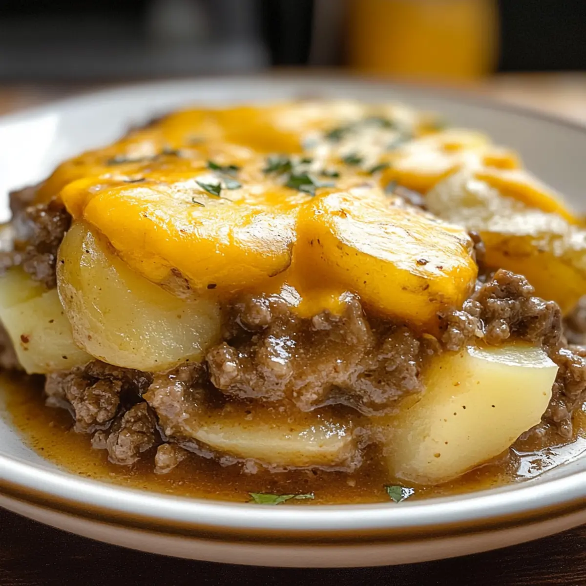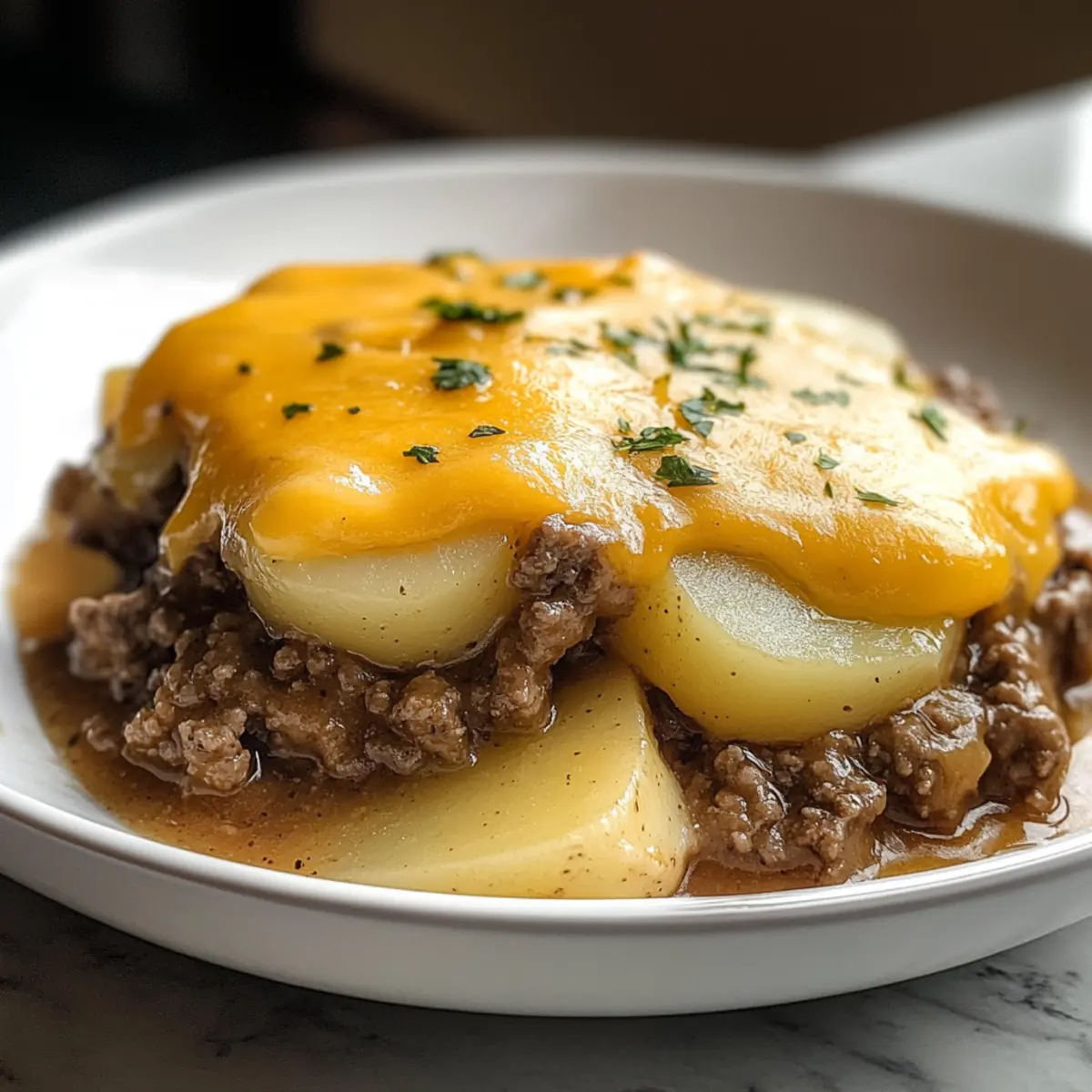 Als ich neulich durch die Küchenschränke stöberte, fiel mir die perfekte Lösung für einen entspannten Abend ein: das Crockpot Hamburger Kartoffelauflauf Rezept! Diese köstliche Kombination aus zartem Hackfleisch, cremigen Kartoffeln und schmelzendem Käse ist nicht nur ein Genuss für die Familie, sondern auch ganz unkompliziert zubereitet. Mit minimalem Aufwand verwandelt sich der Slow Cooker in einen wahren Zauberkasten, der den Raum mit unwiderstehlichen Aromen füllt und ungemein wohltuende Erinnerungen weckt. Zudem ist das Gericht ideal für hektische Tage, da es problemlos im Voraus zubereitet werden kann und sogar eine glutenfreie Option bietet. Neugierig, wie einfach es ist, diese herzliche Mahlzeit auf den Tisch zu bringen? Lass uns gleich loslegen und die Zubereitung entdecken! Warum wirst du dieses Rezept lieben? Einfache Zubereitung: Mit nur wenigen Zutaten und einem minimalen Aufwand zauberst du im Handumdrehen eine herzhafte Mahlzeit. Herzhafter Geschmack: Die Kombination aus zartem Hackfleisch, cremigen Kartoffeln und geschmolzenem Käse sorgt für ein unverwechselbares Geschmackserlebnis, das die ganze Familie begeistern wird. Vielseitig anpassbar: Du kannst das Rezept ganz nach deinem Geschmack abwandeln – probiere beispielsweise verschiedene Käsesorten oder füge Gemüse hinzu für eine zusätzliche Note. Perfekt für die ganze Familie: Ideal für diese hektischen Wochentage, ist dieser Auflauf ein Lieblingsgericht, das wohlige Erinnerungen weckt. Zeitersparnis: Dein Crockpot kümmert sich um alles, während du dich anderen Dingen widmen kannst – so bleibt dir mehr Zeit für die wichtigen Dinge im Leben. Für eine glutenfreie Variante kannst du auf passende Zutaten zurückgreifen. Beginne noch heute mit diesem köstlichen Crockpot Hamburger Kartoffelauflauf Rezept! Crockpot Hamburger Kartoffelauflauf Zutaten • Hier sind die Hauptzutaten für das Rezept, um deinen perfekten Crockpot Hamburger Kartoffelauflauf zuzubereiten! Für das Hauptgericht Hackfleisch – liefert eine herzhafte Basis; für eine leichtere Option kann mageres Rinderhack oder Putenhackfleisch verwendet werden. Zwiebel – sorgt für zusätzlichen Geschmack; kannst du durch Schalotten ersetzen, um eine süßere Note zu erhalten. Kartoffeln – geben dem Gericht Substanz; frische, festkochende Kartoffeln sind ideal, während du auch gefrorene verwenden kannst, wenn sie richtig aufgetaut sind. Gehackte Tomaten – bringen zusätzliche Feuchtigkeit und frische; wähle passierte Tomaten für eine glattere Konsistenz. Nachos Käse Sauce – für eine cremige und würzige Note; ein selbstgemachtes Käsesauce-Rezept kann ebenso verwendet werden. Knoblauchpulver – intensiviert den Geschmack; frischer Knoblauch kann ebenfalls verwendet werden, wenn du es magst. Paprikapulver – fügt eine leichte Rauchnote hinzu; experimentiere mit verschiedenen Paprika-Sorten für mehr Tiefe im Geschmack. Salz und Pfeffer – zum Abschmecken; achte darauf, die Würzung vorsichtig zu dosieren, um den Geschmack der anderen Zutaten nicht zu überdecken. Geriebener Käse – macht das Gericht besonders cremig; verschiedene Käsesorten wie Gouda oder Mozzarella machen den Auflauf spannend und variantenreich. Mit diesen Zutaten ist dein Weg für den leckeren Crockpot Hamburger Kartoffelauflauf geebnet – lass den Slow Cooker seine Magie entfalten! Step-by-Step Instructions für Crockpot Hamburger Kartoffelauflauf Rezept Step 1: Hackfleisch anbraten Erhitze eine große Pfanne bei mittlerer Hitze und gib das Hackfleisch hinein. Brate es an, bis es gleichmäßig braun ist und kein rosa mehr sichtbar ist – dies sollte etwa 5-7 Minuten dauern. Füge dann die gewürfelte Zwiebel hinzu und brate sie weiter, bis sie weich und leicht durchscheinend ist, was weitere 3-4 Minuten in Anspruch nehmen sollte. Step 2: Zutaten in den Crockpot schichten Nimm die geschälten und gewürfelten Kartoffeln und gib sie gleichmäßig in den Crockpot. Darauf verteilst du gleichmäßig das gebratene Hackfleisch mit der Zwiebel. Diese schichtweise Anordnung sorgt dafür, dass der Crockpot Hamburger Kartoffelauflauf eine köstliche Textur erhält und die Aromen sich perfekt vermischen können. Step 3: Flüssigkeiten und Gewürze hinzufügen Öffne die Dose gehackte Tomaten und die Nachos Käse Sauce und gieße beides über die Kartoffeln und das Fleisch im Crockpot. Streue das Knoblauchpulver und Paprikapulver gleichmäßig darüber und würze mit Salz und Pfeffer nach Geschmack. Diese Kombination verleiht dem Gericht eine wunderbare Tiefe und Geschmack. Step 4: Alles gut durchmischen Mit einem großen Löffel oder einem Spatel rührst du die Zutaten vorsichtig um, sodass alles gut miteinander vermischt wird. Achte darauf, dass die Kartoffeln und das Fleisch gleichmäßig mit den Tomaten und der Käsesoße bedeckt sind. Dadurch wird sichergestellt, dass alle Zutaten im Crockpot Hamburger Kartoffelauflauf gleichmäßig garen. Step 5: Crockpot einstellen und garen Setze den Deckel auf den Crockpot und stelle ihn auf niedriger Stufe für 6-8 Stunden ein oder auf hoher Stufe für 3-4 Stunden. Überprüfe während der letzten 30 Minuten die Garstufe, um sicherzustellen, dass die Kartoffeln zart sind und die gesamte Mischung gut durchgezogen ist. Step 6: Käse hinzufügen und schmelzen lassen Wenn du 30 Minuten bis zum Garzeitende hast, streue den geriebenen Käse großzügig über die Mischung im Crockpot. Setze den Deckel wieder auf, damit der Käse schmelzen kann und eine köstliche, cremige Schicht entsteht. Dies verleiht deinem Crockpot Hamburger Kartoffelauflauf die perfekte, geschmolzene Käsekruste. Step 7: Servieren und genießen Sobald die Garzeit abgelaufen ist und der Käse schön geschmolzen ist, ist dein leckere Crockpot Hamburger Kartoffelauflauf fertig zum Servieren. Verwende einen großen Löffel, um die Mischung direkt aus dem Crockpot auf Teller zu portionieren. Genieß die herzhafte Mahlzeit, die ganz einfach zubereitet wurde und