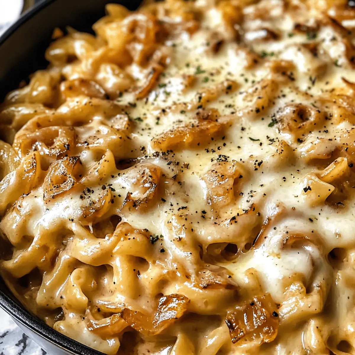 Während ich in meiner Küche stand, drang der verführerische Duft von karamellisierten Zwiebeln in meine Nase und weckte in mir Erinnerungen an die rustikalen Abende bei Freunden. Diese Ein-Topf Französische Zwiebel Pasta ist mein neuer Liebling zu Hause – sie vereint die köstliche Essenz der klassischen französischen Zwiebelsuppe in einem unkomplizierten Nudelgericht. Mit einer cremigen Konsistenz, die ganz ohne schwere Sahne auskommt, ist dieses Rezept nicht nur unglaublich vielseitig, sondern auch perfekt für stressige Wochentage oder gemütliche Familienessen. Die Zubereitung ist einfach und macht die Reinigung zum Kinderspiel – eine wahre Freude für jeden heimischen Koch. Beginnen wir gemeinsam mit dieser köstlichen Kulturreise und entdecken Sie, wie schnell Sie Freunden und Familie ein Gericht servieren können, das nicht nur sättigt, sondern auch begeistert! Bist du bereit, deine Geschmacksknospen auf eine spannende Reise mitzunehmen?
