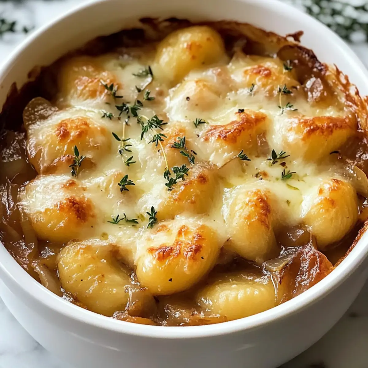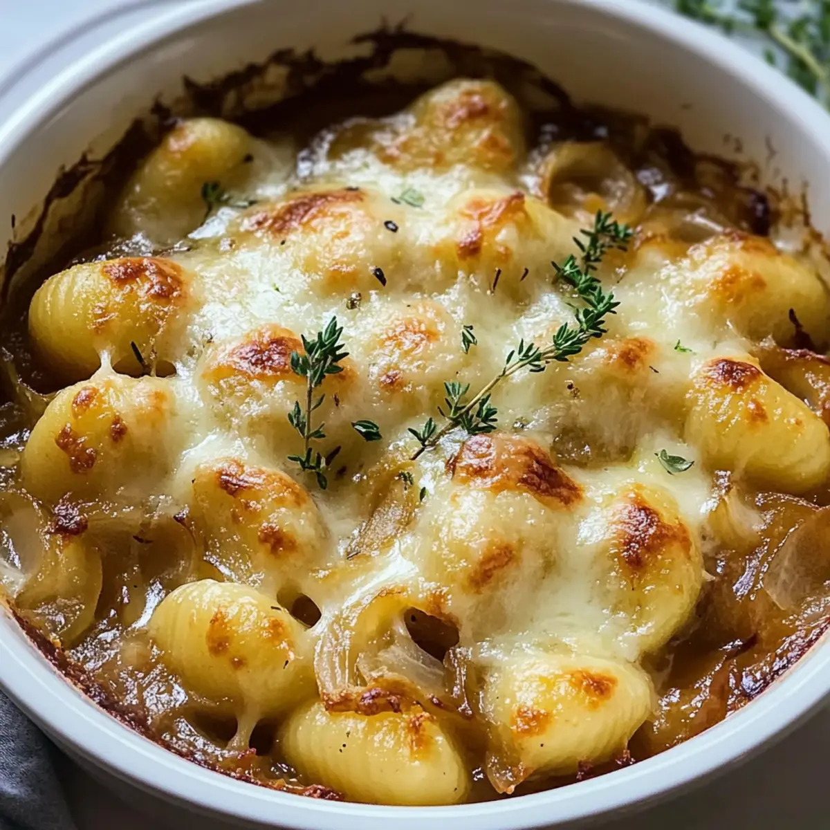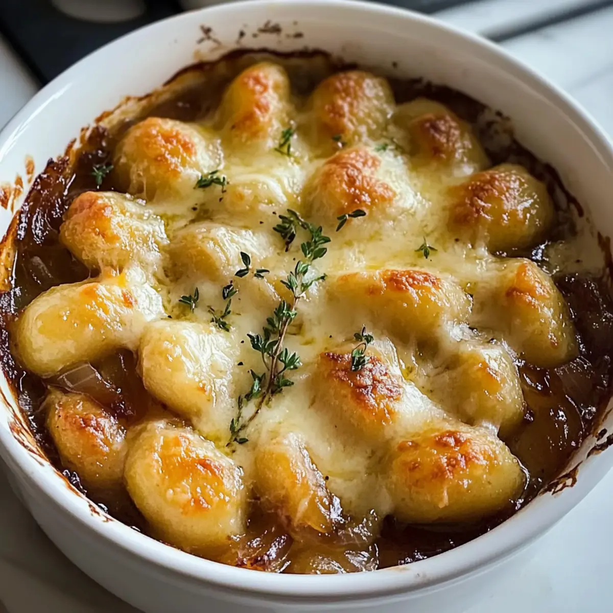 Genießen Sie die Einfach gebackene französische Zwiebeln Gnocchi, die süße Zwiebeln mit zartem Gnocchi und geschmolzenem Käse vereint.