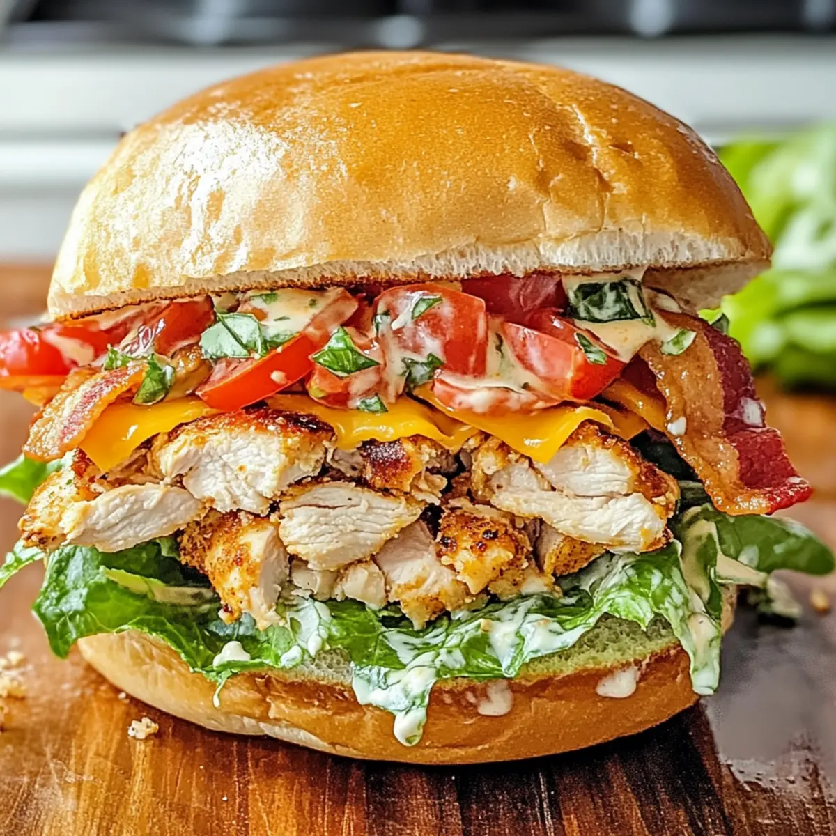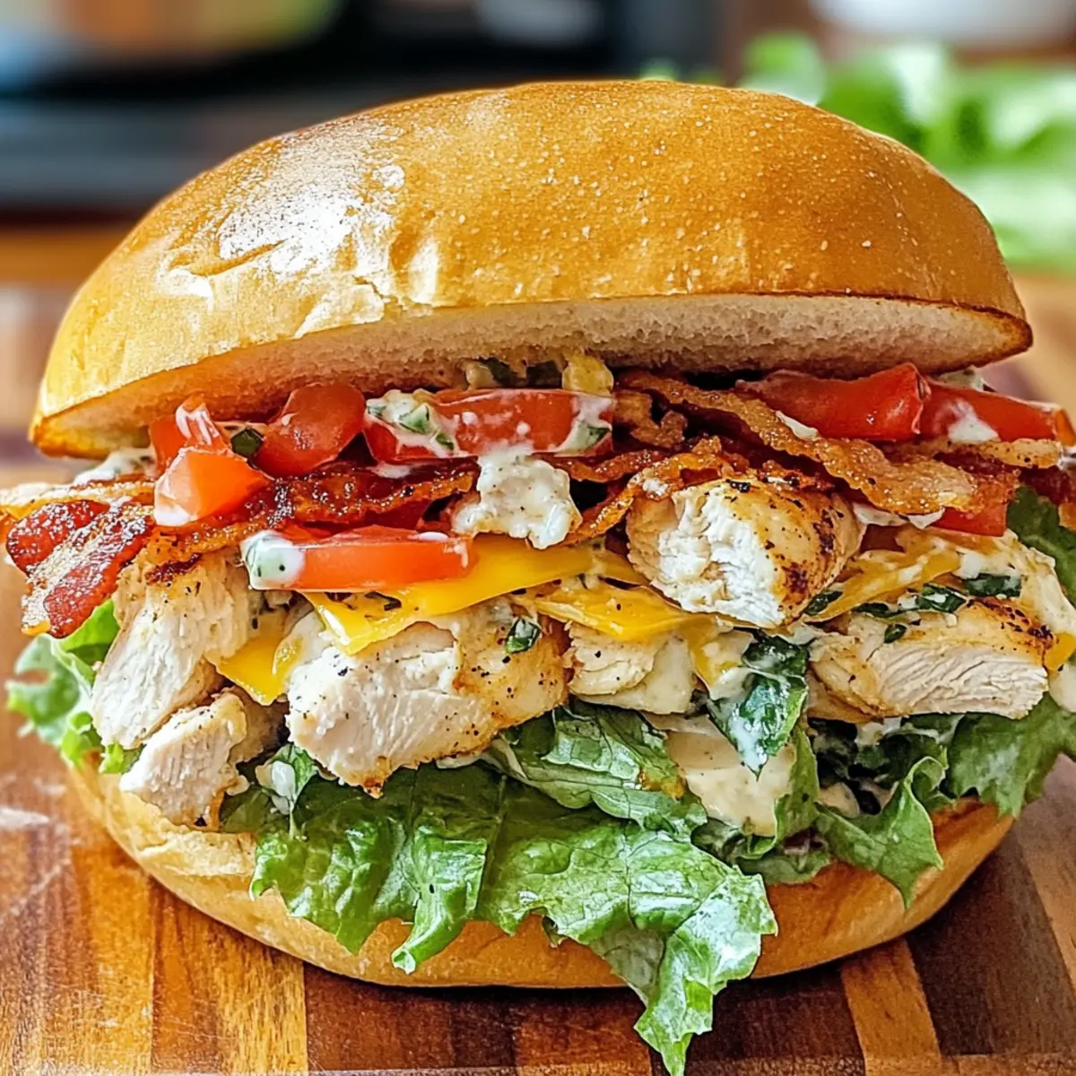 Nehme die frischen Brötchen oder Baguettes und schneide sie längs auf. Beginne mit einer Schicht Salat, gefolgt von den Tomatenscheiben und dem zerkleinerten Hähnchen. Füge dann die Cheddar-Käsescheiben und den knusprigen Bacon hinzu, bevor du optional die Avocadoscheiben und das Ranch-Dressing darüber gibst. Achte darauf, gleichmäßige Schichten zu legen, damit jedes Bissen voller Geschmack ist.