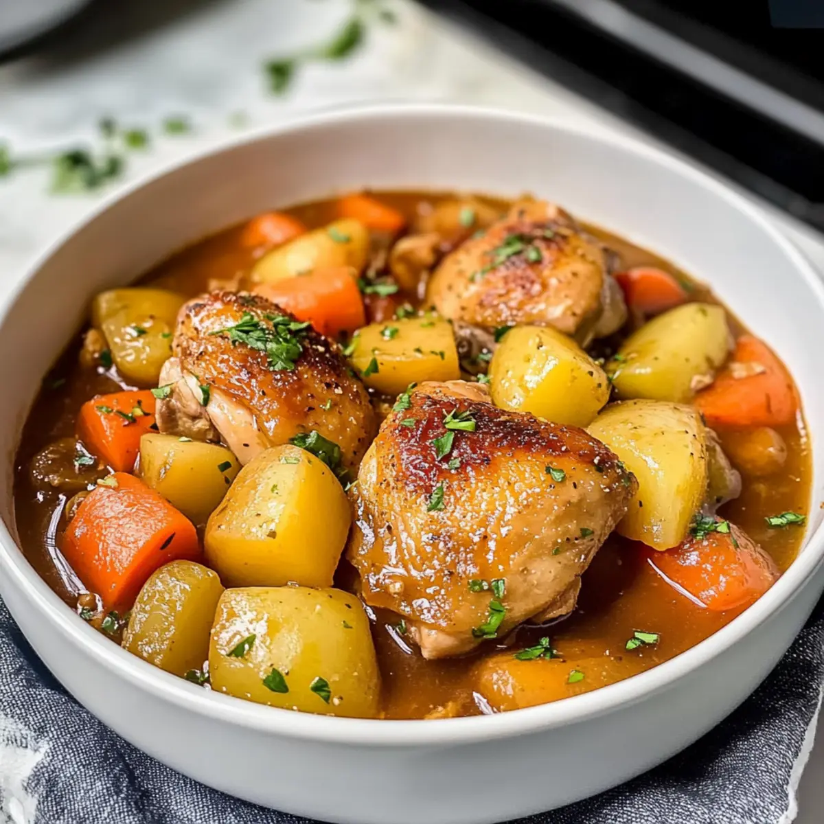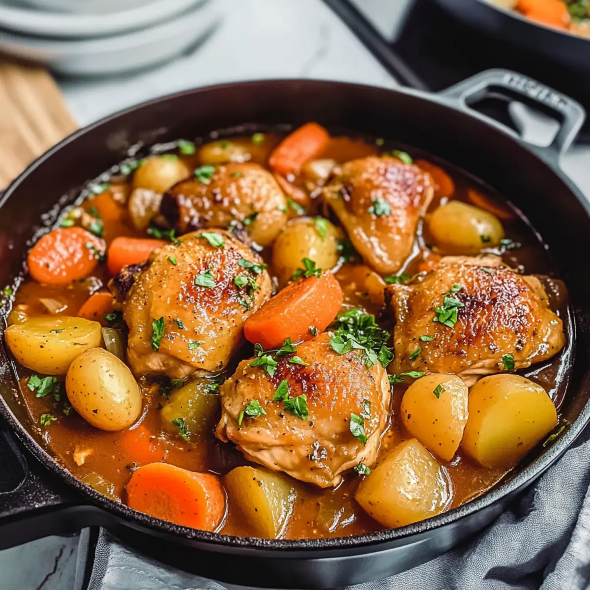 Wenn der Wind draußen pfeift und die Temperaturen sinken, gibt es nichts Besseres als eine Schüssel herzhaften Eintopfs, um die Seele zu wärmen. Mein einfaches Dutch Oven Hähnchen Eintopf Rezept bietet genau das, und ist gleichzeitig unkompliziert in der Zubereitung. Mit saftigen Hähnchenteilen und einer bunten Mischung aus Gemüse, all die Aromen harmonisch vereint in einer dicken, geschmackvollen Brühe – dieses Gericht ist die perfekte Lösung für kalte Abende. Die Kombination aus Komfortessen und gesunden Zutaten macht es zu einem echten Muss für jede Küche. Möchten Sie wissen, wie Sie diesen leckeren Eintopf in nur wenigen Schritten zubereiten können? Dann lassen Sie uns gleich loslegen! Warum werden Sie dieses Rezept lieben? Einfachheit pur: Die Zubereitung dieses Eintopfs erfordert nur grundlegende Kochkenntnisse und einen Dutch Oven – ideal für alle, die gern frisch und selbstgemacht kochen. Herzhafte Aromen: Die Kombination aus Hähnchen, Gemüse und aromatischen Kräutern sorgt für einen vollmundigen Geschmack, der jeden begeistert. Zeitersparnis: Mit nur einem Topf bleibt die Küche sauber und Sie haben mehr Zeit, um das Essen zu genießen! Vielseitigkeit: Fügen Sie nach Belieben zusätzliche Gemüsesorten hinzu, wie z.B. grünen Bohnen oder Mais, um noch mehr Farbe und Nährstoffe zu integrieren. Perfektes Wohlfühlessen: Dieser Eintopf bringt die ganze Familie zusammen und ist ideal für gesellige Essensabende – servieren Sie ihn mit frischem Brot oder Reis für eine volle Mahlzeit. Also, wenn Sie nach einer köstlichen, herzhaften Mahlzeit suchen, die nicht nur gut schmeckt, sondern auch einfach zuzubereiten ist, sind Sie hier genau richtig! Einfacher Dutch Oven Hähnchen Eintopf Zutaten • Dieses Rezept für einen herzhaften Eintopf beinhaltet einfache, frische Zutaten, die Ihnen ein Gefühl von Zuhause vermitteln. Für das Hähnchen Hähnchenteile – 1,5 kg sorgen für eine saftige und geschmackvolle Grundlage; verwenden Sie Oberschenkel für mehr Zartheit. Olivenöl – 2 Esslöffel sorgen für Geschmack und Unterstützung beim Anbraten der Hähnchenteile; Avocadoöl kann ebenfalls verwendet werden. Für das Gemüse Zwiebeln – 2, gewürfelt, bringen eine süße Basis und Tiefe; gelbe Zwiebeln sind besonders empfehlenswert. Karotten – 3, in Scheiben, geben Süße und Farbe; Pariser sind auch eine gute Alternative. Selleriestangen – 2, gewürfelt, bringen Crunch und Aroma; Fenchel kann ebenfalls eine interessante Note bieten. Knoblauch – 4 Zehen, gehackt, verstärken das Aroma; frischer Knoblauch ist immer am besten. Kräuter und Gewürze Thymian – 1 Teelöffel, verleiht frische Kräuternote; frischer Thymian ist intensiver, aber getrockneter funktioniert auch. Rosmarin – 1 Teelöffel, bringt erdige Aromen in den Eintopf; ideal, wenn frisch gehackt. Paprika – 1 Teelöffel, sorgt für einen süßen und milden Kick; verwenden Sie geräucherte Paprika für mehr Tiefe. Für die Brühe und die Konsistenz Hühnerbrühe – 500 ml, bildet die geschmackvolle Basis; selbstgemacht ist am besten, aber gekaufte Brühe funktioniert ebenfalls. Kartoffeln – 200 g, gewürfelt, bieten Reichhaltigkeit und Textur; auch andere Sorten wie Süßkartoffeln können genutzt werden. Abschmecken Salz und Pfeffer – nach Geschmack, um Aromen zu verstärken; probieren Sie während des Kochens, um die perfekte Balance zu finden. Mit diesen Zutaten können Sie das Rezept für den einfachen Dutch Oven Hähnchen Eintopf wunderbar umsetzen! Step-by-Step Instructions für Einfacher Dutch Oven Hähnchen Eintopf Rezept Step 1: Olivenöl erhitzen Erhitzen Sie das Olivenöl in einem großen Dutch Oven bei mittlerer bis hoher Hitze. Warten Sie, bis das Öl heiß ist, aber noch nicht raucht. Anzeichen dafür sind kleine Bläschen an der Oberfläche des Öls. Dies dauert etwa 2 Minuten und sorgt für eine perfekte Grundlage, um das Hähnchen schön anzubraten. Step 2: Hähnchenteile anbraten Fügen Sie die Hähnchenteile mit der Hautseite nach unten hinzu und braten Sie sie etwa 5 Minuten lang an, bis sie goldbraun sind. Wenden Sie die Teile vorsichtig und braten Sie die andere Seite weitere 5 Minuten, bis sie ebenfalls schön gebräunt sind. Danach nehmen Sie das Hähnchen aus dem Topf und stellen es beiseite. Step 3: Gemüse anbraten In dem verbliebenen Öl die gewürfelten Zwiebeln, Karotten, Sellerie und den gehackten Knoblauch hinzufügen. Braten Sie die Mischung für etwa 5 Minuten an, bis die Zwiebeln weich und leicht karamellisiert sind. Rühren Sie regelmäßig um, damit nichts anbrennt und die Aromen gut verteilt werden. Step 4: Gewürze hinzufügen Streuen Sie den Thymian, Rosmarin und Paprika über das Gemüse und rühren Sie gut um, um die Gewürze freizusetzen. Lassen Sie die Mischung 1-2 Minuten kochen, sodass sie sich gut vermischt und die Aromen intensiver werden. Dies hilft, eine geschmackvolle Basis für den Eintopf, den Sie zubereiten, zu schaffen. Step 5: Flüssigkeiten einrühren Gießen Sie die Hühnerbrühe und die gewürfelten Kartoffeln in den Topf. Kratzen Sie dabei den Boden des Dutch Ovens ab, um die braunen Reste der angebratenen Zutaten zu lösen. Diese geben dem Hähnchen Eintopf zusätzliche Tiefe und Geschmack. Rühren Sie alles gut um, um sicherzustellen, dass sich die Zutaten gleichmäßig verteilen. Step 6: Zum Kochen bringen Bringen Sie die Mischung zum Kochen und senken Sie dann die Hitze auf ein mittleres Niveau. Lassen Sie alles köcheln, damit die Aromen sich entfalten können und das Gemüse weich wird. Dies sollte etwa 45 Minuten dauern, wobei Sie zwischendurch gelegentlich umrühren sollten, um ein Anbrennen zu verhindern. Step 7: Mit Gewürzen abschmecken Nach dem Köcheln prüfen Sie die Konsistenz des Eintopfs. Schmecken Sie mit Salz und Pfeffer ab, um die Aromen zu intensivieren. Wenn die Brühe zu dick ist, können Sie etwas weitere Hühnerbrühe hinzufügen. Rühren Sie alles gut um, damit die Gewürze gleichmäßig verteilt w