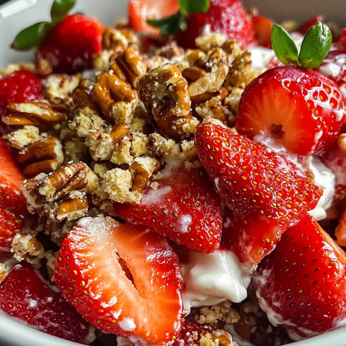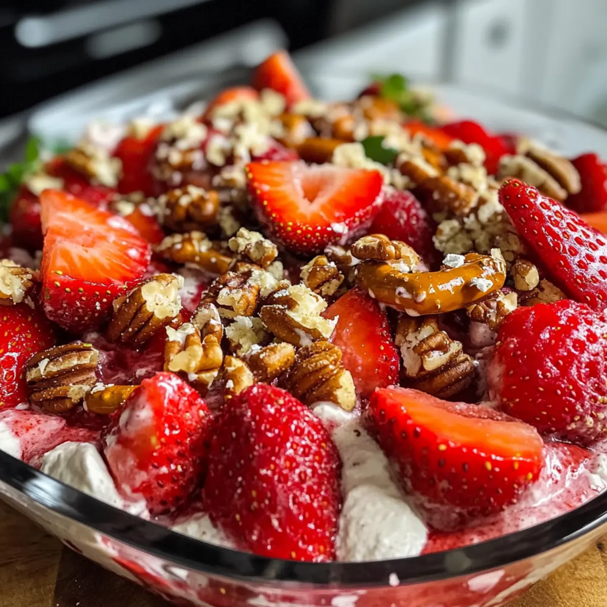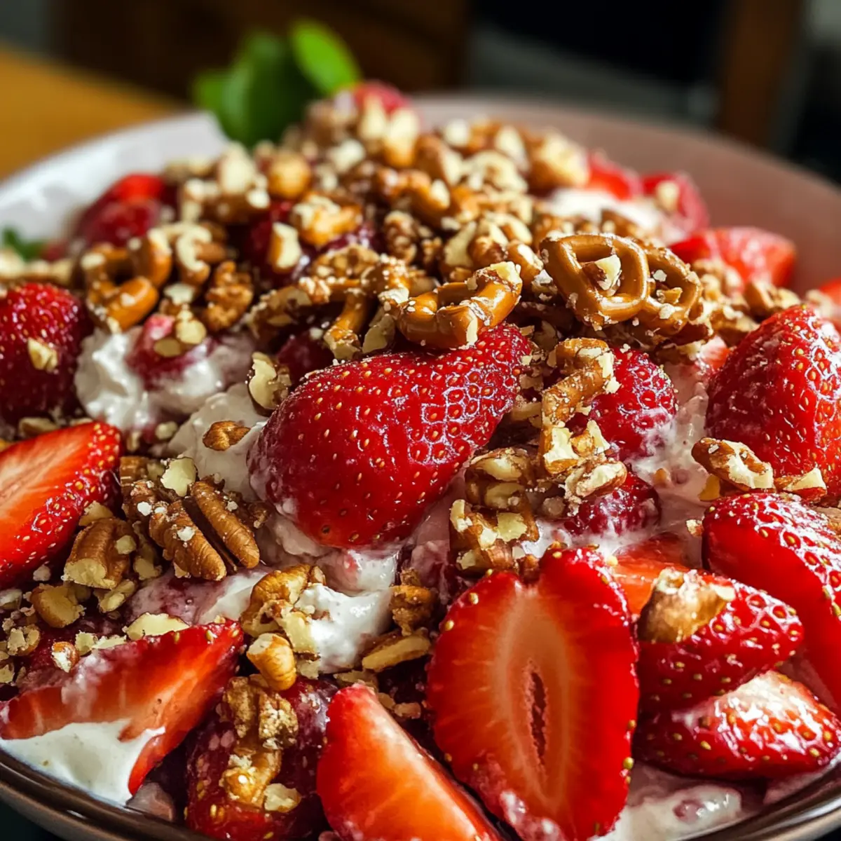 „Braucht ihr eine erfrischende und zugleich nostalgische Nachspeise für euren nächsten Sommertreff? Das war genau mein Gedanke, als ich den Erdbeer-Knusprigen Salat zum ersten Mal zubereitet habe. Diese köstliche Kombination aus saftigen Erdbeeren, knackigen Brezeln und cremigem Frischkäse bringt nicht nur Vielfalt auf den Tisch, sondern lässt sich auch ganz einfach im Voraus zubereiten. Perfekt für Picknicks oder Familienfeiern, sorgt dieser Salat immer wieder für strahlende Gesichter und zufriedene Essensfreunde. Seid ihr bereit, die Geschmacksknospen eurer Lieben zu überraschen und eine deftige Portion Retro zu servieren? Lasst uns gemeinsam in die Zubereitung eintauchen!“ Warum ist dieser Erdbeer-Knuspriger Salat so besonders? Erfrischend und nostalgisch: Dieser Salat kombiniert die Süße von frischen Erdbeeren mit der Knusprigkeit von Brezeln, die Erinnerungen an vergangene Familientreffen weckt. Einfache Zubereitung: Mit nur wenigen Schritten und Zutaten ist der Erdbeer-Knuspriger Salat schnell gemacht, sodass ihr mehr Zeit mit euren Gästen verbringen könnt. Vielseitig und anpassbar: Experimentiert mit verschiedenen Beeren oder Nüssen, um einen einzigartigen Twist zu kreieren und euren persönlichen Geschmack zu treffen. Perfekt für jede Gelegenheit: Ob Picknick oder Sommerfeier, dieser Salat zieht alle Blicke auf sich und sorgt für zufriedene Gesichter. Gesunde Leckerei: Mit frischen Erdbeeren ist er nicht nur lecker, sondern liefert auch wichtige Vitamine für eine gesunde Ernährung. Erdbeer-Knuspriger Salat Zutaten • Die perfekte Mischung für euren Genuss! Für die Brezelmixtur: Zerkleinerte Brezeln – verleihen dem Salat einen salzigen Crunch; glutenfreie Brezeln sind eine tolle Alternative. Gehackte Pekannüsse – bieten nussigen Geschmack und zusätzliche Knusprigkeit; versucht auch Mandeln oder Walnüsse für eine Variation. Brauner Zucker – süßt die Brezelmixtur; weißer Zucker kann als Ersatz verwendet werden. Geschmolzene Butter – bindet die Brezelmixtur; Kokosöl eignet sich wunderbar für eine milchfreie Option. Für die Cremeschicht: Weich gekochter Frischkäse – sorgt für eine reichhaltige, cremige Schicht; griechischer Joghurt ist eine leichtere Variante. Granulierter Zucker – erhöht die Süße der Creme; die Menge kann für eine zuckerreduzierte Version verringert werden. Vanilleextrakt – bringt zusätzlichen Geschmack; Mandel-Extrakt kann auch genutzt werden. Cool Whip – verleiht der Cremeschicht Leichtigkeit; versucht hausgemachte Schlagsahne oder Kokos-Schlagsahne für eine milchfreie Option. Für die Erdbeeren: In Scheiben geschnittene Erdbeeren – die Hauptzutat für Frische und Süße; tauscht sie gegen Blaubeeren oder Himbeeren aus, um Abwechslung zu schaffen. Dieser Erdbeer-Knuspriger Salat hat das Potenzial, jede Zusammenkunft zu einem echten Highlight zu machen! Schritt-für-Schritt-Anleitung für Erdbeer-Knuspriger Salat Step 1: Ofen vorheizen Heize deinen Ofen auf 200°C vor und lege ein Backblech mit Backpapier aus. Dies sorgt dafür, dass die Brezelmixtur gleichmäßig und knusprig wird. Achte darauf, dass der Ofen vollständig aufgeheizt ist, bevor du mit dem nächsten Schritt fortfährst. Step 2: Brezelmixtur vorbereiten Gib in eine große Schüssel 2 Tassen zerkleinerte Brezeln, 1 Tasse gehackte Pekannüsse und 1 Tasse braunen Zucker. Vermische alles gut miteinander. Füge anschließend 1 Tasse geschmolzene Butter hinzu und rühre so lange um, bis die Mischung gleichmäßig verteilt ist. Step 3: Backen Verteile die Brezelmixtur gleichmäßig auf dem vorbereiteten Backblech. Backe sie für 8 bis 10 Minuten, bis die Mischung sprudelt und goldbraun ist. Behalte die Mischung während des Backens im Auge, damit sie nicht anbrennt. Lasse die Mischung anschließend vollständig abkühlen, damit sie knusprig bleibt. Step 4: Cremeschicht zubereiten In einer großen Schüssel vermengst du 2 Packungen weich gekochten Frischkäse, ¾ Tasse granulierten Zucker und 2 Teelöffel Vanilleextrakt. Mische alles gut, bis die Masse schön glatt ist. Füge dann 16 Unzen Cool Whip hinzu und hebe die Mischung vorsichtig unter, um die Luftigkeit der Creme zu erhalten. Stelle die fertige Creme für 30 Minuten in den Kühlschrank. Step 5: Zutaten kombinieren Nimm die gekühlte Cremeschicht aus dem Kühlschrank und füge 4 Tassen in Scheiben geschnittene Erdbeeren hinzu. Mische die Erdbeeren vorsichtig unter, damit sie nicht zerdrückt werden. Danach nimm die abgekühlte Brezelmixtur und hebe sie vorsichtig unter die Erdbeer-Creme-Mischung. Achte darauf, dass sich die Zutaten gleichmäßig verteilen. Step 6: Servieren Jetzt ist dein Erdbeer-Knuspriger Salat bereit zum Servieren! Du kannst ihn in eine schöne Schüssel umfüllen und nach Belieben mit frischen Erdbeeren garnieren. Serviere ihn idealerweise gleich nach der Zubereitung oder kühle ihn nochmals für ein paar Minuten, um ihn erfrischend kalt zu genießen. Expertentipps für Erdbeer-Knuspriger Salat Vollständige Abkühlung: Achte darauf, dass die Brezelmixtur komplett abgekühlt ist, bevor du sie zerbrichst. So bleibt der Salat knusprig. Nicht übermixen: Beim Mischen von Frischkäse und Cool Whip sollte vorsichtig vorgegangen werden, um die Luftigkeit der Creme zu erhalten. Separate Aufbewahrung: Wenn du den Salat im Voraus zubereitest, bewahre die Brezelmixtur separat auf, um die Textur beim Servieren zu erhalten. Variation nutzen: Experimentiere mit verschiedenen Beeren oder Nüssen, um deinen Erdbeer-Knuspriger Salat noch kreativer zu gestalten. Zucker anpassen: Die Zuckermenge kann je nach persönlichem Geschmack angepasst werden, um eine zuckerreduzierte Variante zu erhalten. Was passt zum Erdbeer-Knusprigen Salat? Mit diesen köstlichen Beilagen wird euer Sommersicht noch bunter und schmackhafter. Lasst euch inspirieren! Cremiges Kartoffelpüree: Die samtige Textur des Kartoffelpürees bietet einen schönen Kontrast zur knusprigen Brezelmixtur und hebt die Geschmackser
