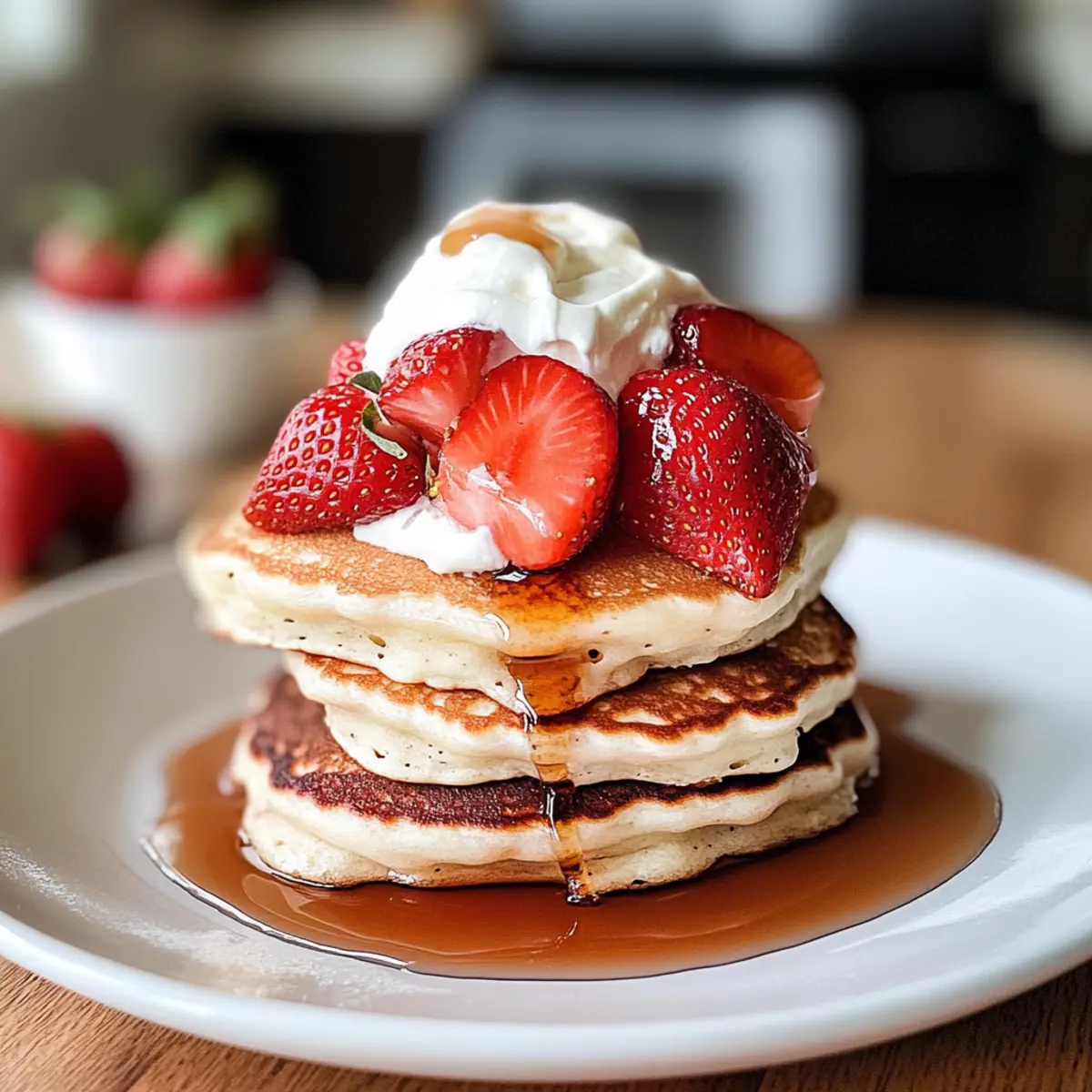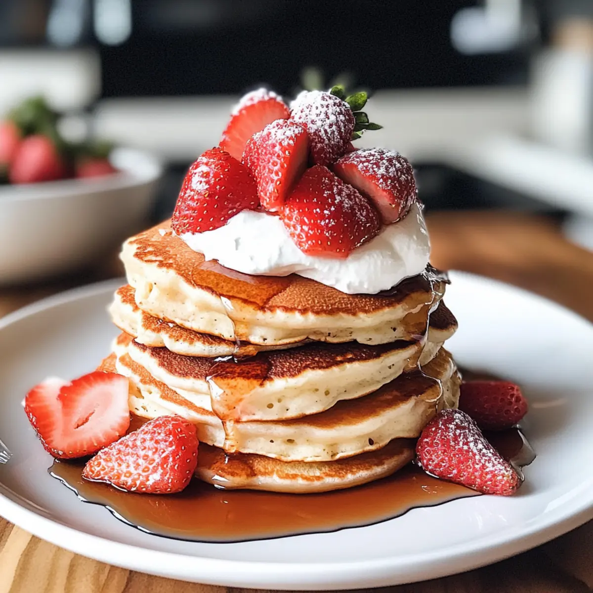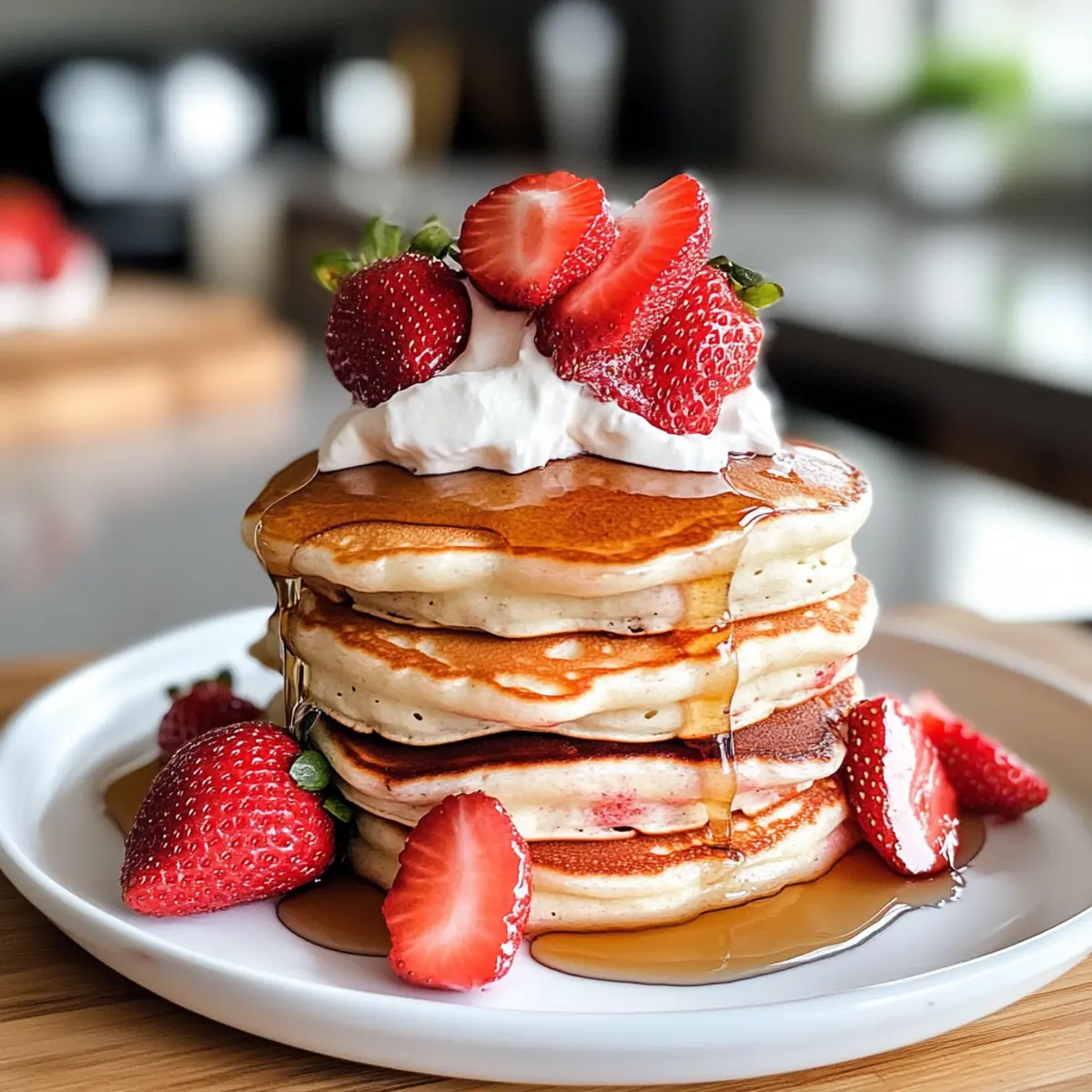 Ein verführerischer Duft von frisch gebratenen Pfannkuchen durchdringt die Küche und weckt sofort Erinnerungen an gemütliche Sonntagsbrunches. Diese Erdbeeren Pfannkuchen sind nicht nur ein Fest für die Sinne, sie sind auch kinderleicht zuzubereiten! Mit ihrer luftigen Konsistenz und dem süßen Geschmack reifer Erdbeeren machen sie jede Mahlzeit zu einem besonderen Erlebnis. Perfekt für faule Morgen oder festliche Anlässe, ist dieses Rezept ideal für alle, die sich nach etwas Hausgemachtem sehnen und gleichzeitig auf die Schnelle etwas Leckeres zaubern möchten. Ob mit frischem Ahornsirup, einem Klecks Sahne oder einer kreativen Kombination von Toppings – die Möglichkeiten sind grenzenlos! Bist du bereit, deine Küche in ein Bistro zu verwandeln? Warum sind diese Erdbeeren Pfannkuchen besonders? Einfachheit: Die Zubereitung ist kinderleicht und benötigt keine speziellen Fähigkeiten – perfekt für Neulinge! Frische: Mit saftigen, frischen Erdbeeren bringen diese Pfannkuchen Farbe und Geschmack auf den Tisch. Vielseitigkeit: Du kannst mit verschiedenen Toppings experimentieren, von Joghurt bis hin zu Nüssen, und so deinen persönlichen Pfannkuchen-Klassiker kreieren. Familienfreundlich: Ideal für die ganze Familie – Kinder lieben sie, und sie eignen sich perfekt für brunchfeiern mit Freunden. Schnell: In weniger als 30 Minuten zubereitet, machen sie das Frühstück zum Kinderspiel! Wenn du nach weiteren köstlichen Ideen suchst, schau dir auch diese Rezepte an: Gurken Radieschen Salat und Kuerbis Hackfleisch Pfanne. Erdbeeren Pfannkuchen Zutaten Für den Teig Allzweckmehl – sorgt für Struktur; verwende glutenfreies Mehl für eine glutenfreie Variante. Zucker – fügt Süße hinzu und verbessert die Bräunung; Kokoszucker ist eine gesunde Alternative. Backpulver – dient als Treibmittel, damit die Pfannkuchen schön fluffig werden; achte darauf, dass es frisch ist. Salz – balanciert die Süße und verstärkt den Geschmack. Vollmilch (oder Alternative) – sorgt für Feuchtigkeit und Reichhaltigkeit; Mandel- oder Hafermilch sind gute milchfreie Optionen. Großes Ei – bindet die Zutaten und trägt zur Reichhaltigkeit bei; für eine vegane Option, verwende Leinsamenmehl mit Wasser. Geschmolzene Butter – trägt zur Geschmacksfülle und Feuchtigkeit bei; kann durch Öl oder vegane Butter ersetzt werden. Frische Erdbeeren – geben einen intensiven Geschmack und Süße; gefrorene Erdbeeren können verwendet werden, achte darauf, diese aufzutauen und gut abzutropfen. Für das Topping Ahornsirup – ideal für einen süßen Abschluss; experimentiere mit Honig für eine andere Geschmacksnote. Schlagsahne – macht die Pfannkuchen extra cremig; veganer Joghurt kann als Alternative verwendet werden. Frische Minze – für einen erfrischenden Geschmack und eine ansprechende Garnitur. Puderzucker – ein Hauch davon macht die Darstellung eleganter; einfach über die Pfannkuchen sieben. Jede Schicht dieser Erdbeeren Pfannkuchen sorgt dafür, dass am Frühstückstisch für jeden etwas dabei ist – perfekte Qualität und Geschmack, die dich an die guten alten Zeiten erinnern! Schritt-für-Schritt-Anleitung für Erdbeeren Pfannkuchen Step 1: Trockenstoffe vermengen In einer großen Schüssel das Allzweckmehl, den Zucker, das Backpulver und das Salz gut vermischen. Verwenden Sie einen Schneebesen, um sicherzustellen, dass alle Trockenstoffe gleichmäßig verteilt sind. Dies dauert etwa 2 Minuten. Achten Sie darauf, dass keine Klumpen zurückbleiben, um einen gleichmäßigen Teig für die Erdbeeren Pfannkuchen zu erzielen. Step 2: Nasse Zutaten vorbereiten In einer separaten Schüssel die Milch, das Ei und die geschmolzene Butter gut miteinander vermengen. Verwenden Sie einen elektrischen Mixer oder einen Schneebesen, um eine glatte Mischung zu erhalten. Diese Mischung sollte dicker sein als die meisten Flüssigkeiten und etwa 3 Minuten gerührt werden, bis alles gut verbunden ist. Step 3: Mischungen kombinieren Gießen Sie nun die nassen Zutaten in die Schüssel mit den trockenen Zutaten. Rühren Sie alles vorsichtig mit einem Holzlöffel oder einem Teigschaber zusammen, bis gerade so ein Teig entsteht. Achten Sie darauf, nicht zu lange zu rühren; ein paar Klumpen sind perfekt für die luftige Konsistenz der Erdbeeren Pfannkuchen. Step 4: Erdbeeren hinzufügen Falten Sie nun die frisch gehackten Erdbeeren vorsichtig in den Teig. Dies sollte sanft geschehen, damit die Erdbeeren nicht zerdrückt werden. Sie sollten die roten, saftigen Fruchtstücke gleichmäßig im Teig verteilt sehen. Dies dauert etwa 1 bis 2 Minuten, um sicherzustellen, dass jede Pancake gleich viel Erdbeeren erhält. Step 5: Pancakes backen Heizen Sie eine antihaftbeschichtete Pfanne bei mittlerer Hitze vor und fetten Sie sie leicht mit etwas Butter oder Öl ein. Geben Sie etwa eine halbe Tasse Teig für jeden Pancake in die Pfanne. Backen Sie die Erdbeeren Pfannkuchen, bis kleine Bläschen auf der Oberseite entstehen (etwa 2 Minuten). Dann vorsichtig umdrehen und weiter backen, bis sie goldbraun sind (ca. 1 Minute). Step 6: Servieren Die fertigen Erdbeeren Pfannkuchen warm servieren, idealerweise mit frischem Ahornsirup oder den gewünschten Toppings. Diese Pfannkuchen sind einfach unwiderstehlich und laden dazu ein, gleich mehrere Portionen zu genießen. Guten Appetit! Einkaufsliste für die Zubereitung: Erdbeeren Pfannkuchen Die Erdbeeren Pfannkuchen sind perfekt für die Vorbereitung, sodass du mehr Zeit für dich und deine Lieben hast! Du kannst den Teig bis 24 Stunden im Voraus zubereiten und in einem luftdichten Behälter im Kühlschrank aufbewahren. Zudem lassen sich die frisch gehackten Erdbeeren bis zu drei Tage vorher vorbereiten; lagere sie in einem Behälter mit Papiertüchern, um überschüssige Feuchtigkeit zu absorbieren und das Verkleben zu vermeiden. Wenn du bereit bist, die Erdbeeren Pfannkuchen zu genießen, erhitze einfach deine Pfanne und backe die Portionen, bis sie goldbraun sind. So 