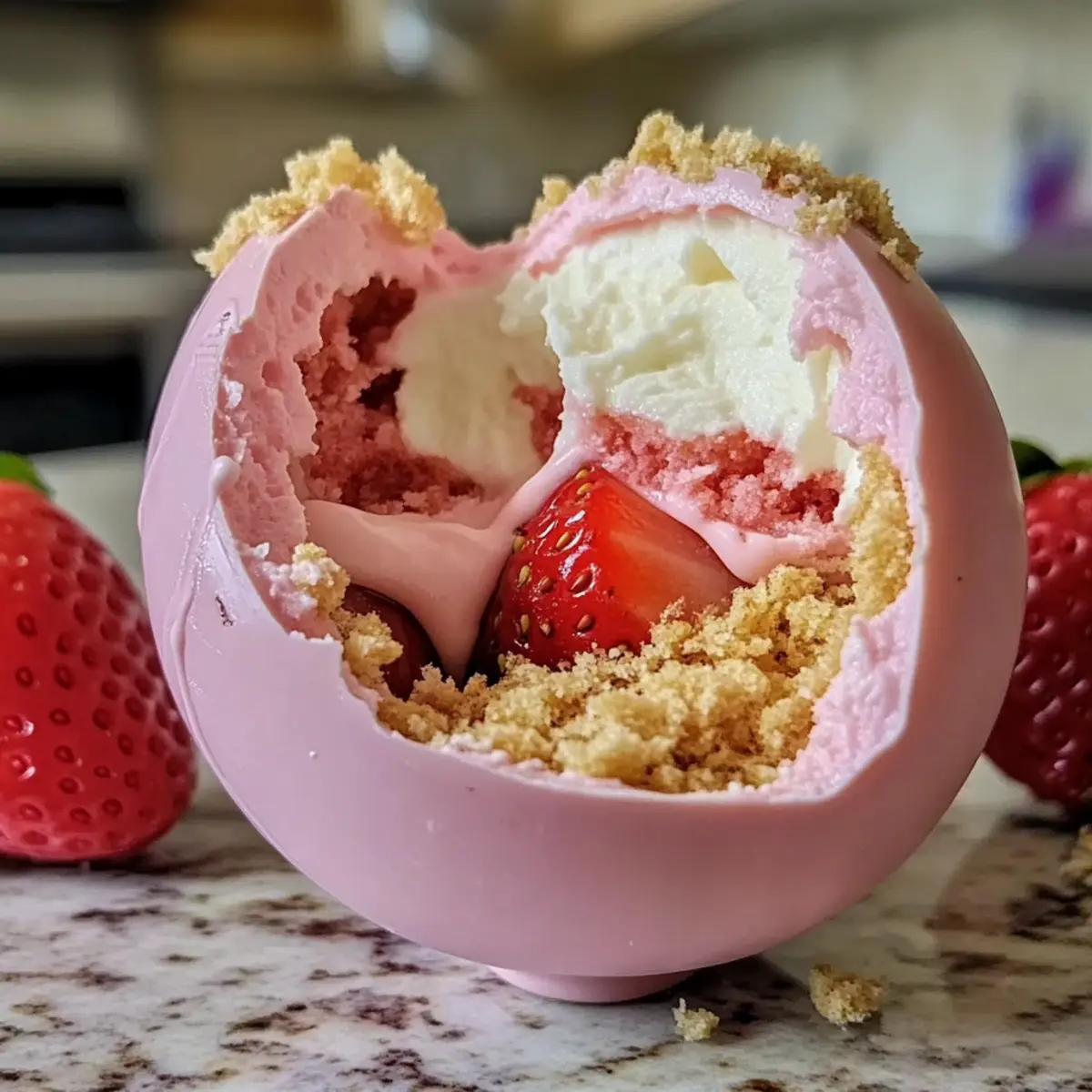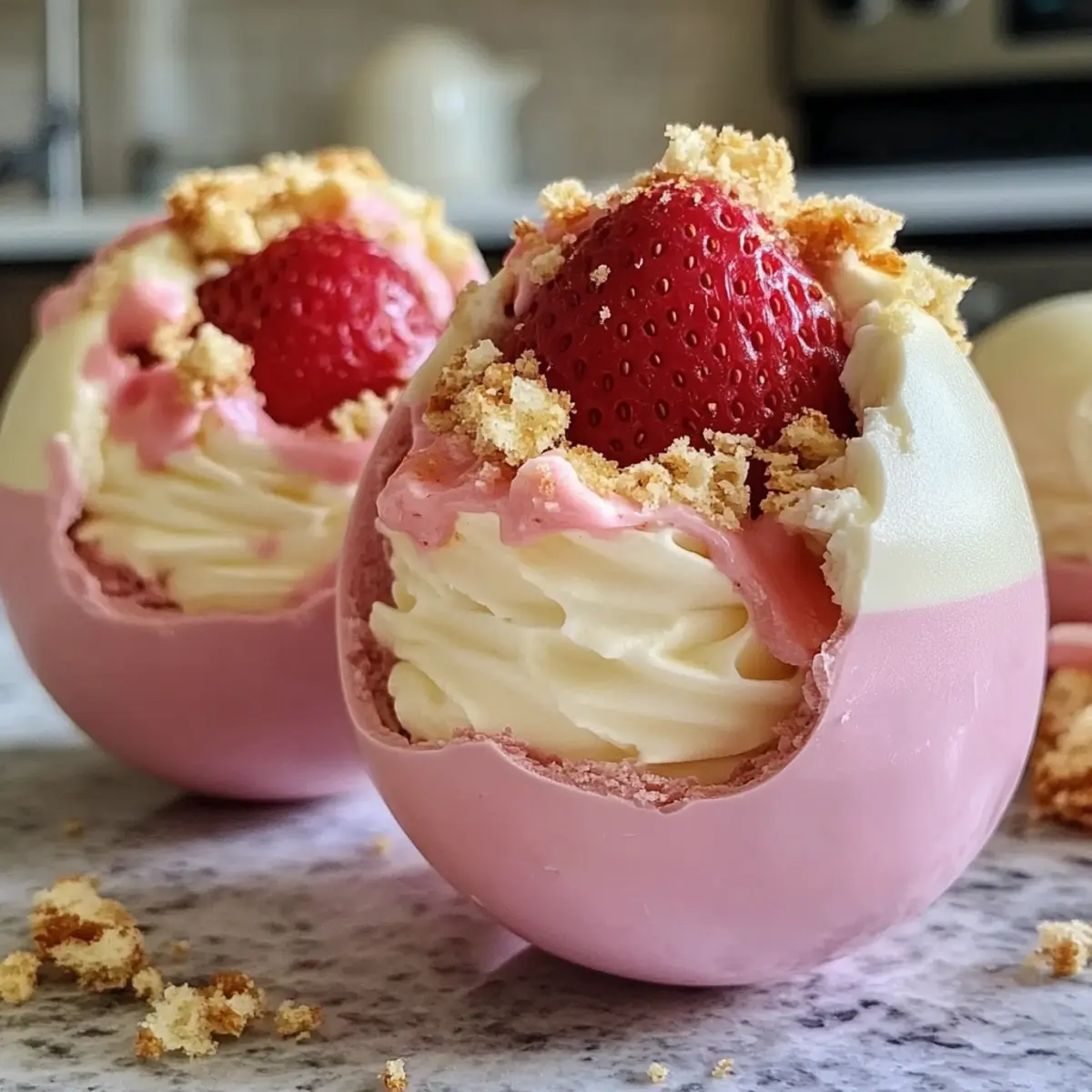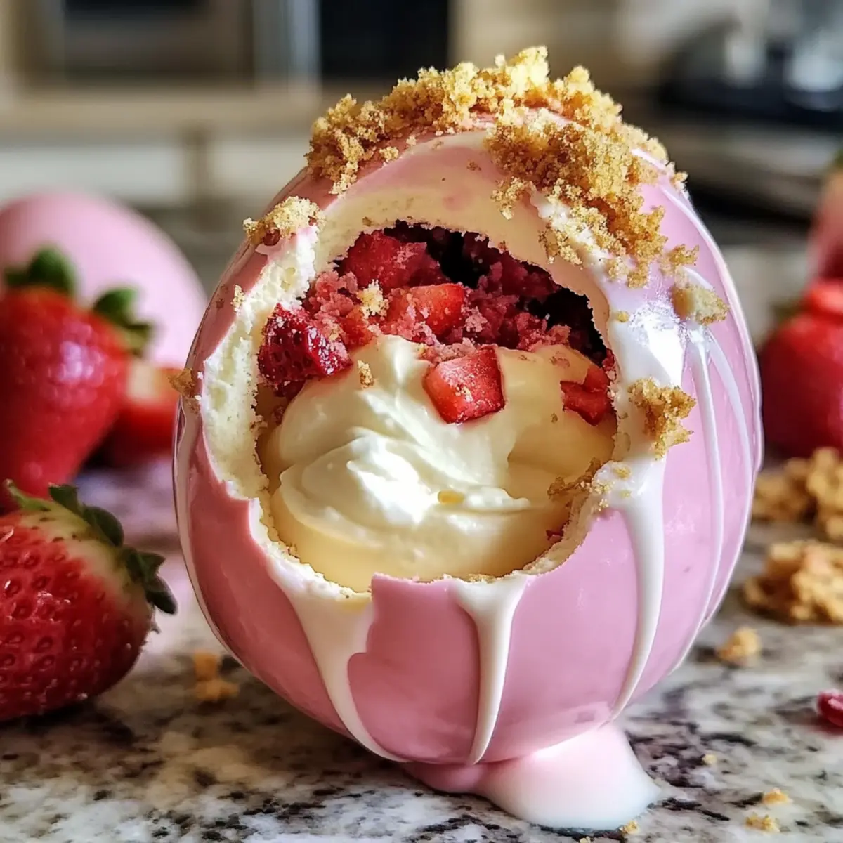 Wenn ich an den Frühling denke, sind es die süßen, saftigen Erdbeeren, die in meinem Kopf die süßesten Erinnerungen wecken. Und was könnte besser dazu passen als die Erdbeerkuchen Osterei Bomben? Diese himmlischen kleinen Kunstwerke sind nicht nur ein aufregendes Spiel mit der klassischen Erdbeertorte, sie bringen auch das Gefühl von festlicher Freude direkt auf euren Tisch. Mit schnellem Zubereiten und einer Mischung aus zartem Schokoladenshell und luftiger Erdbeerfüllung sind diese Bomben der perfekte Genuss für eure Osterfeier. Seid ihr bereit, das Rezept zu erkunden und die süßesten Überraschungen zu kreieren? Warum sind diese Bomben ein Muss? Einzigartige Kreation: Diese Erdbeerkuchen Osterei Bomben vereinen den klassischen Geschmack von Erdbeertorte mit einer spielerischen Form – perfekt für die Osterfeier! Einfachheit: Mit nur wenigen Zutaten ist der Zubereitungsprozess leicht verständlich, selbst für weniger erfahrene Köche. Vielfältiger Genuss: Ob als süßer Abschluss beim Brunch oder ein Highlight bei der Osterfeier, sie begeistern jeden! Atemberaubende Präsentation: Diese Bomben sehen nicht nur toll aus, sondern sind auch ein wahrer Genuss für den Gaumen! Schnelle Zubereitung: Mit wenigen Schritten zaubert ihr im Handumdrehen einen faszinierenden Leckerbissen – ideal für vielbeschäftigte Küchenchefs! Leichte Anpassungen: Variiert die Füllung oder probiert verschiedene Schokoladensorten aus, um jedem Geschmack gerecht zu werden. Lasst euch von den Möglichkeiten überraschen! Erdbeerkuchen Osterei Bomben Zutaten Für die Schokoladenhülle: Weiße Schokoladenstückchen – Diese sorgen für eine zarte und süße Außenschicht; es kann auch dunkle Schokolade verwendet werden, falls gewünscht. Osterei-Formen – Sind ideal zum Formen der Bomben; sorgt dafür, dass die Schokolade gleichmäßig verteilt ist. Für die Füllung: Erdbeeren – Frisch püriert für intensiven Fruchtgeschmack; gefriergetrocknetes Erdbeerpulver kann ebenfalls verwendet werden, um den Geschmack zu intensivieren. Schlagsahne – Verleiht der Füllung eine luftig-leichte Textur; darauf achten, nur bis zu weichen Spitzen zu schlagen, um die perfekte Konsistenz zu erreichen. Vanilleextrakt – Bringt die Aromen wunderbar zur Geltung; keine direkten substitutionsmöglichkeiten empfohlen, um die Authentizität zu bewahren. Kekskrümel – Geben der Füllung einen vertrauten Biss; zerstoßene Shortbread-Kekse können für eine andere Geschmacksrichtung verwendet werden. Diese Erdbeerkuchen Osterei Bomben sind nicht nur ein Fest für das Auge, sondern auch ein Höhepunkt jeder Osterfeier! Schritt-für-Schritt-Anleitung für Erdbeerkuchen Osterei Bomben Step 1: Schokoladenschalen vorbereiten Schmelzt die weißen Schokoladenstückchen in einer mikrowellengeeigneten Schüssel für etwa 1-2 Minuten bei mittlerer Hitze, bis sie glatt sind. Benutzt einen Pinsel, um die Innenseiten der Osterei-Formen gleichmäßig mit der geschmolzenen Schokolade zu bestreichen. Stellt die Formen in den Kühlschrank und lasst sie mindestens 30 Minuten fest werden, bis die Schalen hart sind. Step 2: Füllung zubereiten Schlagt die Schlagsahne in einer großen Schüssel mit einem Handmixer oder einer Küchenmaschine bis sie weiche Spitzen bildet, was etwa 3-4 Minuten dauern sollte. Faltet vorsichtig die pürierten Erdbeeren und den Vanilleextrakt unter die geschlagene Sahne. Diese luftig-leichte Füllung wird das Herzstück eurer Erdbeerkuchen Osterei Bomben. Step 3: Eier zusammenbauen Nehmt die gehärteten Schokoladenschalen aus dem Kühlschrank. Füllt jede Schale vorsichtig mit der Erdbeerfüllung, bis sie etwa drei Viertel voll sind. Streut einige Kekskrümel über die Füllung, um die Textur zu verbessern. Versiegelt die Eier, indem ihr ein wenig geschmolzene Schokolade auf die Öffnung gebt und weitere Hartschicht darauf gebt. Lasst die Eier erneut im Kühlschrank für mindestens 30 Minuten fest werden. Step 4: Formen und Servieren Entfernt die Erdbeerkuchen Osterei Bomben vorsichtig aus den Formen, indem ihr die Schalen sanft drückt. Wenn die Unterseiten unregelmäßig sind, könnt ihr sie mit einem warmen Tuch sanft glätten. Präsentiert die Bomben auf einer hübschen Servierplatte und genießt die bewunderten Blicke! Erdbeerkuchen Osterei Bomben Variationen Eure Kreativität kennt keine Grenzen, wenn es darum geht, diese köstlichen Bomben zu individualisieren und neue Geschmäcker zu entdecken! Dunkle Schokolade: Verwandle die Hülle mit zarter, dunkler Schokolade für einen intensiveren Geschmack. Diese Variante wird besonders Schokoladenliebhaber freuen. Fruchtige Füllung: Tausche Erdbeeren gegen Himbeeren oder Blaubeeren für eine fruchtige Explosion. Diese frischen Veränderungen bringen Abwechslung auf den Tisch! Laktosefrei: Nutze laktosefreie Sahne und Zartbitterschokolade, um diese Leckerei für milchempfindliche Freunde zu zaubern. Ein Genuss für alle! Kekse nach Wahl: Statt Shortcake-Krümel kannst du zerbröselte Oreos für eine schokoladige Note verwenden. Diese süße Wendung wird die Geschmacksknospen überraschen. Nussige Crunch: Füge gehackte Mandeln oder Haselnüsse zu der Füllung hinzu, um einen köstlichen Crunch und zusätzliche Textur zu erzeugen. Ein wahrer Fest für den Gaumen! Kokosnuss-Note: Verwende Kokosmilch anstelle von Sahne für eine tropische Variante und rolle die fertigen Bomben in Kokosraspeln. Diese Variante bringt einen Hauch von Sonne mit sich! Zimtige Würze: Ein Hauch von Zimt in der Füllung verleiht einen unerwarteten, warmen Geschmack und macht jedes Bissen noch gemütlicher. Ideal für die kühleren Frühlingstage! Schaumwein als Begleitung: Serviere die Bomben zu frischem Sekt oder einem spritzigen Weisswein – die perfekte Kombination für festliche Momente. Jede dieser Varianten bietet eine neue Entdeckung und erfreut Gaumen und Herzen. Und wer weiß, vielleicht inspiriert es euch, eure eigenen einzigartigen Kreationen zu entwickeln! Expertentipps 