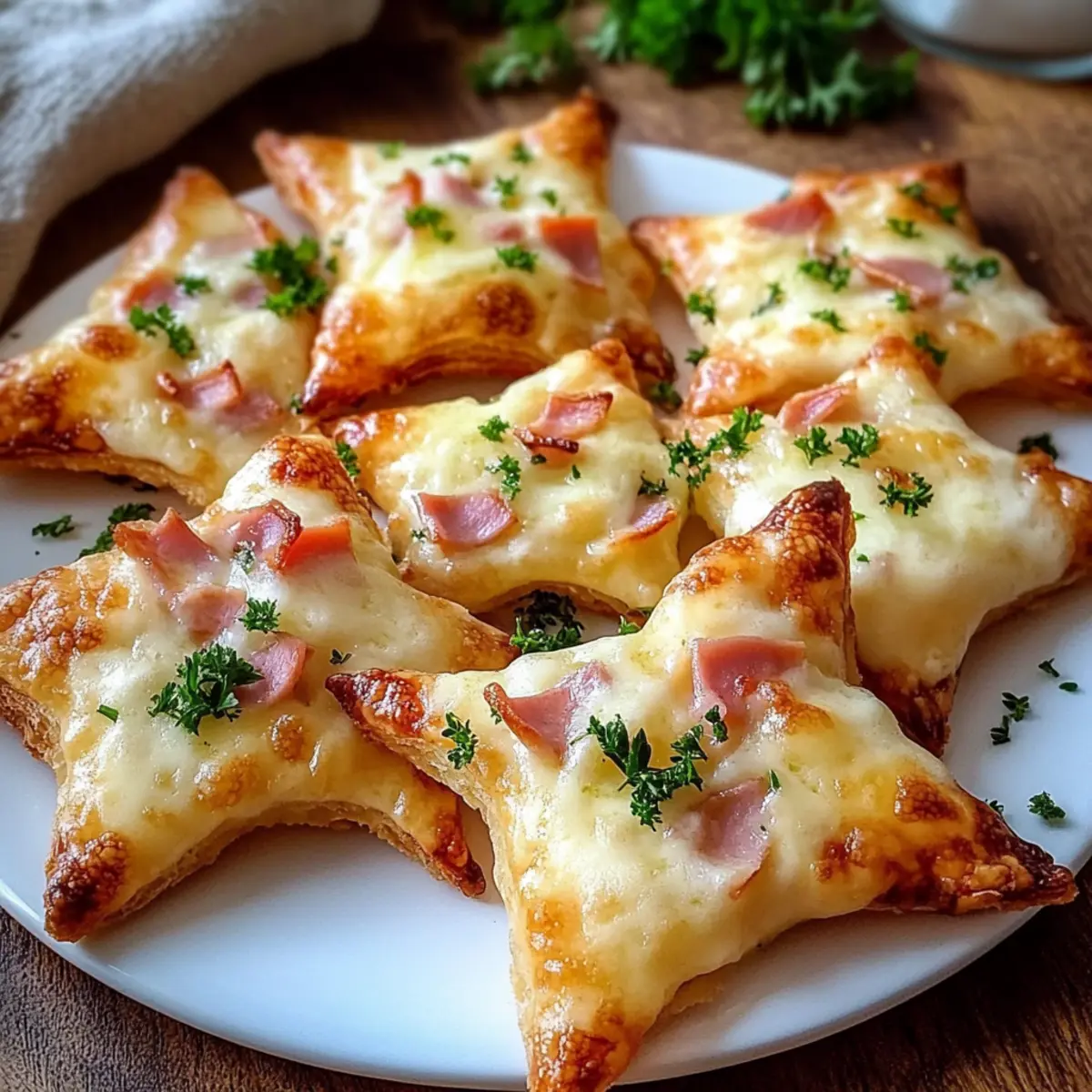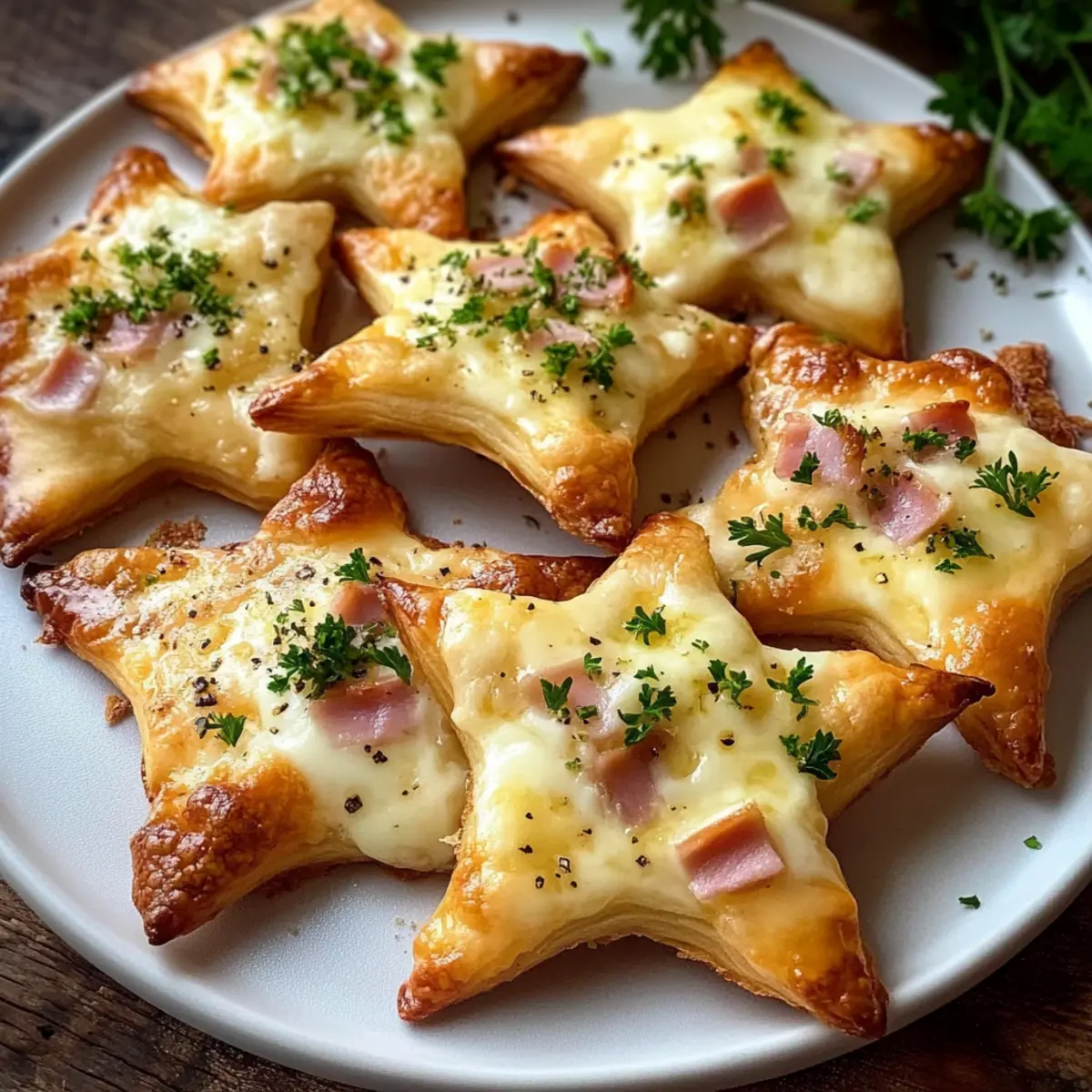Nehme die Flammkuchen-Sterne aus dem Ofen und lasse sie kurz abkühlen. Bestreue sie dann mit frischer, gehackter Petersilie für einen Farbtupfer und zusätzlichen Geschmack. Diese köstlichen Fingerfood-Stücke können warm oder bei Zimmertemperatur serviert werden, ideal für deine Festtafel.
