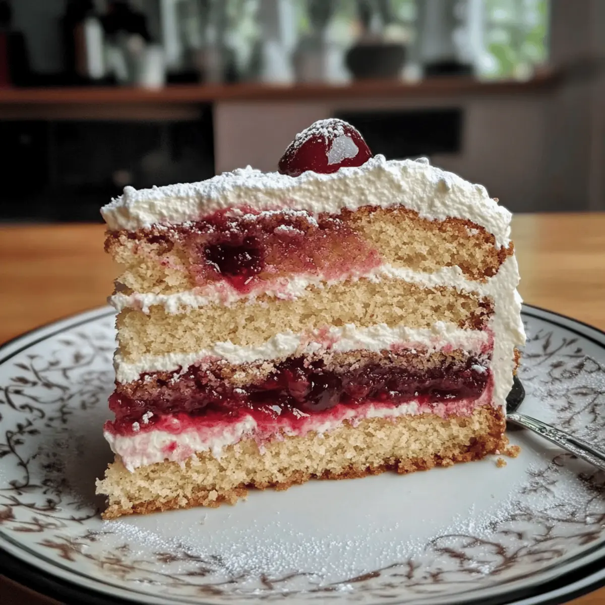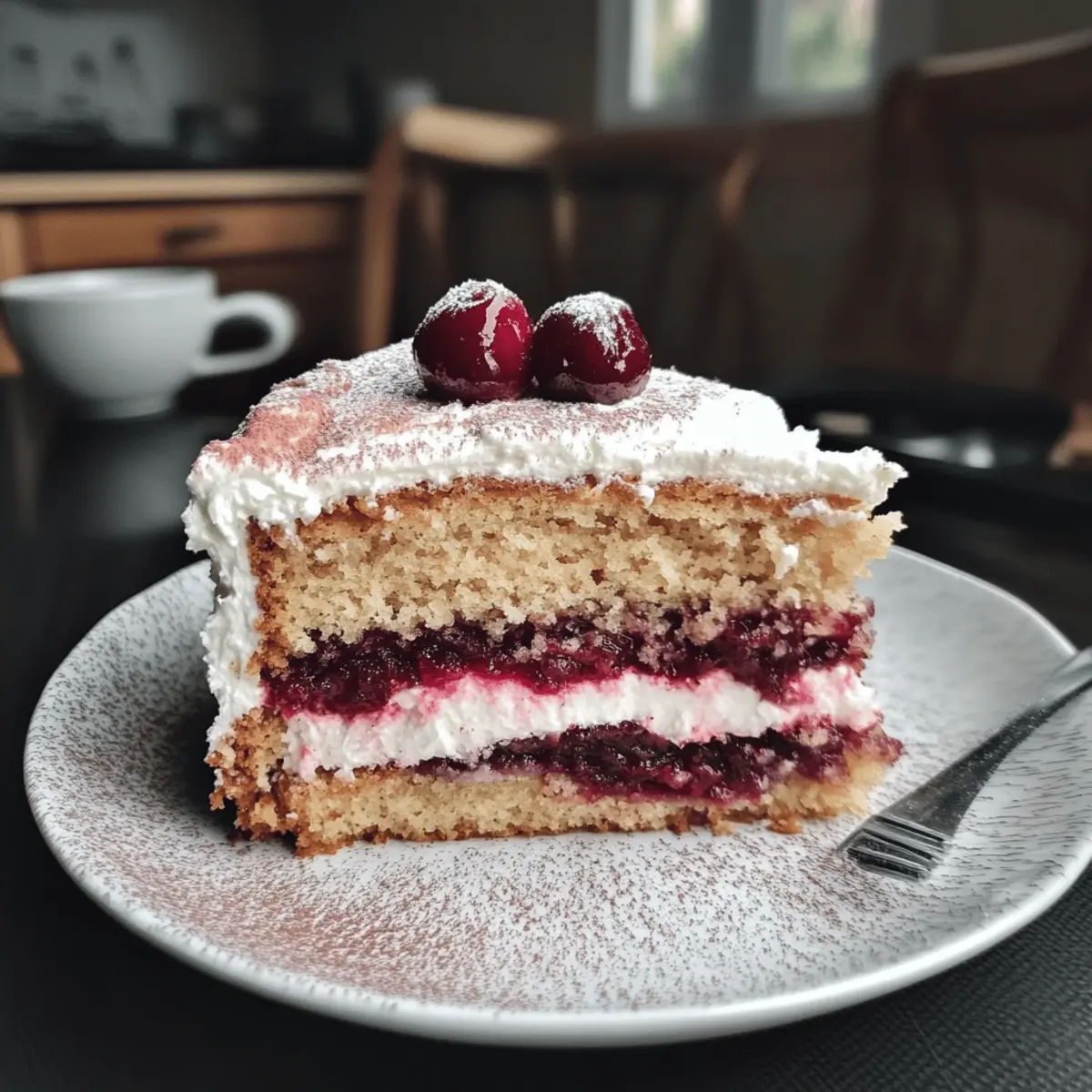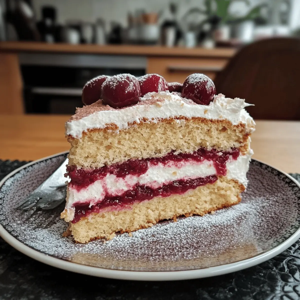 Die frische Brise auf meiner Haut und der verführerische Duft von Zimt durchströmen die Küche, als ich die Zutaten für meine Fruchtige Zimt-Kirsch-Torte vorbereite. Die Kombination aus saftigen Kirschen und warmem Zimt schafft nicht nur eine Geschmacksexplosion, sondern erfüllt auch mein Zuhause mit einem Gefühl von Geborgenheit. Dieses Rezept ist nicht nur eine leichte Süßigkeit, sondern auch ein echter Hingucker für jede Feier – perfekt, um Familie und Freunde zu beeindrucken! Das Beste daran? Es ist einfach zuzubereiten und kann sogar im Voraus gemacht werden. Bist du bereit, den Kochlöffel zu schwingen und den köstlichen Duft deiner eigenen Zimt-Kirsch-Torte zu genießen? Warum wirst du diese Torte lieben? Einfachheit: Das Rezept ist unkompliziert und erfordert nur grundlegende Backfähigkeiten, sodass du mit Leichtigkeit eine beeindruckende Torte zaubern kannst. Reiche Aromen: Die Kombination aus frischen Kirschen und aromatischem Zimt sorgt für ein Geschmackserlebnis, das jeden begeistert. Vielseitigkeit: Ob als Dessert für festliche Anlässe oder einfach nur zum Kaffeeklatsch – diese Torte passt zu vielen Gelegenheiten. Optische Pracht: Die fruchtige Füllung und die samtige Creme machen die Torte nicht nur köstlich, sondern auch zu einem ansprechenden Highlight auf jedem Tisch. Schnell zubereitet: In nur wenigen Schritten erhältst du ein köstliches Ergebnis, das deine Gäste überraschen wird. Wenn du nach weiteren einfachen Desserts suchst, schau dir auch unsere leckeren Kuchenrezepte an! Fruchtige Zimt-Kirsch-Torte Zutaten • Diese Torte ist einfach unwiderstehlich! Für den Teig 4 Eier – Sie liefern die perfekte Struktur und Feuchtigkeit; verwende mittelgroße Eier für ein gleichmäßiges Ergebnis. 200g gemahlene Haselnüsse – Fügen einen nussigen Geschmack hinzu; du kannst sie durch gemahlene Mandeln ersetzen, wenn du eine andere Note wünschst. Zucker – Er bringt die nötige Süße; erwäge die Verwendung von Kokoszucker für einen reichhaltigeren Geschmack. Vanillepaste – Intensiviert das Aroma; pure Vanilleextrakt ist ein guter Ersatz. Backpulver – Ist wichtig für die Lockerheit des Kuchens; achte darauf, dass es frisch ist für beste Ergebnisse. Mehl – Sorgt für die nötige Struktur; allzweck Mehl funktioniert gut, für glutenfreie Varianten nutze eine 1-zu-1 Mischung. Für die Füllung Kirschen – Die Hauptfruchtfüllung; frische Kirschen bieten den besten Geschmack, während du auch auf Dosenware zurückgreifen kannst. Stärke – Verdickt die Kirschfüllung; Arrowroot-Pulver kann ebenfalls verwendet werden. Für die Dekoration 2 Pck. Sahnesteif – Hilft der Sahne, ihre Form zu bewahren; Gelatine ist eine natürliche Alternative, falls gewünscht. Mit diesen Zutaten bist du bestens ausgestattet, um deine eigene Fruchtige Zimt-Kirsch-Torte zu kreieren! Schritt-für-Schritt-Anleitung für die Fruchtige Zimt-Kirsch-Torte Schritt 1: Ofen vorheizen Heize deinen Ofen auf 180°C (350°F) mit Ober-/Unterhitze vor. Um sicherzugehen, dass die Temperatur stimmt, lasse das Gerät etwa 10 Minuten vorheizen, bevor du mit den nächsten Schritten fortfährst. Dies sorgt dafür, dass die Fruchtige Zimt-Kirsch-Torte gleichmäßig gebacken wird. Schritt 2: Eier und Zucker schlagen Schlage die 4 Eier zusammen mit dem Zucker und der Vanillepaste in einer großen Rührschüssel für etwa 10 Minuten, bis die Mischung schön schaumig und hell ist. Verwende einen Handmixer oder eine Küchenmaschine, um eine luftige Konsistenz zu erreichen. Dies ist entscheidend für die fluffige Textur des Kuchens. Schritt 3: Mehl und Nüsse unterheben Siebe das Mehl und das Backpulver in die Schüssel und füge die gemahlenen Haselnüsse hinzu. Mische die Zutaten vorsichtig mit einem Teigschaber, bis alles gut vermengt ist. Achte darauf, nicht zu stark zu rühren, damit die Luftigkeit der Masse erhalten bleibt, was deiner Fruchtigen Zimt-Kirsch-Torte zugutekommt. Schritt 4: Teig backen Gieße den Teig in eine ungereifte Kuchenform und backe ihn etwa 20 Minuten im vorgeheizten Ofen. Überprüfe die Garzeit mit einem Holzstäbchen: Es sollte sauber herauskommen, wenn der Kuchen fertig ist. Lasse die Torte nach dem Backen auf einem Kuchengitter auskühlen. Schritt 5: Torte horizontal schneiden Nachdem die Torte vollständig abgekühlt ist, schneide sie vorsichtig horizontal in zwei gleich dicke Schichten. Dies sorgt dafür, dass die Kirschfüllung gleichmäßig verteilt werden kann. Sei dabei vorsichtig, um die zarte Struktur der Fruchtigen Zimt-Kirsch-Torte nicht zu beschädigen. Schritt 6: Kirschen zubereiten Erhitze die Kirschen in einem kleinen Topf bei mittlerer Hitze, bis sie anfangen zu blubbern. Bewahre den Saft auf, während die Kirschen leicht verkochen. Vermische die Stärke mit etwas Kirschsaft und füge es zu den erhitzten Kirschen hinzu, bis die Mischung eindickt. Lasse die Füllung anschließend etwas abkühlen. Schritt 7: Erste Kuchenschicht belegen Lege die erste Kuchenschicht auf einen Servierplatte und umschließe sie mit dem Kuchenring. Verteile die abgekühlte Kirschfüllung gleichmäßig auf der Kuchenschicht, damit sie gut durchzieht und die Geschmäcker sich verbinden. Schritt 8: Sahne zubereiten Schlage die Sahne zusammen mit dem Sahnesteif, bis sie steif ist. Mische die geschlagene Sahne vorsichtig unter die restlichen Zutaten. Dies verleiht der Fruchtigen Zimt-Kirsch-Torte eine cremige, luftige Schicht, die perfekt zur Kirschfüllung passt. Schritt 9: Torte fertigstellen Setze die zweite Kuchenschicht vorsichtig auf die Kirschfüllung und drücke sie leicht an. Stelle die Torte für mindestens eine Stunde in den Kühlschrank, damit sie fest werden kann und die Aromen sich setzen. So wird deine Fruchtige Zimt-Kirsch-Torte beim Servieren schön schnittfest. Aufbewahrungstipps für Fruchtige Zimt-Kirsch-Torte Kühlschrank: Bewahre die Torte in einem luftdichten Behälter im Kühlschrank auf, um die Frische für bis zu 3 Tage zu erhalten. So bleiben di