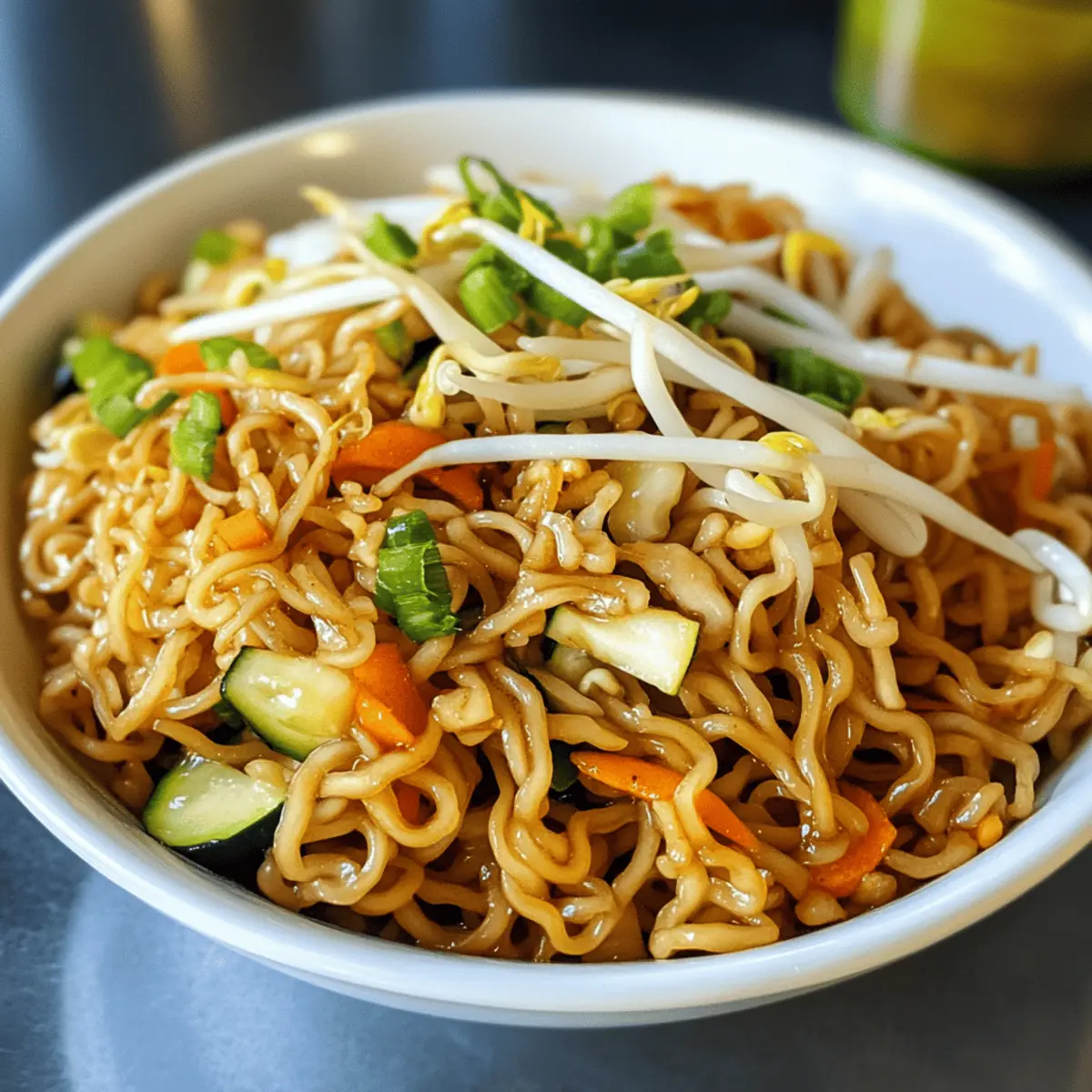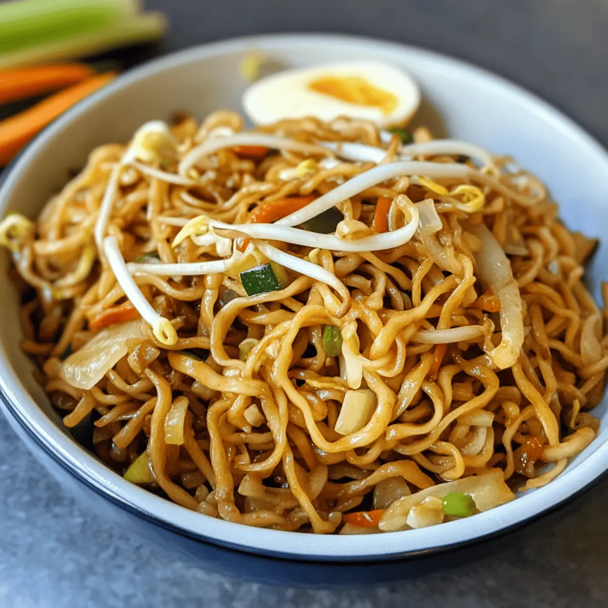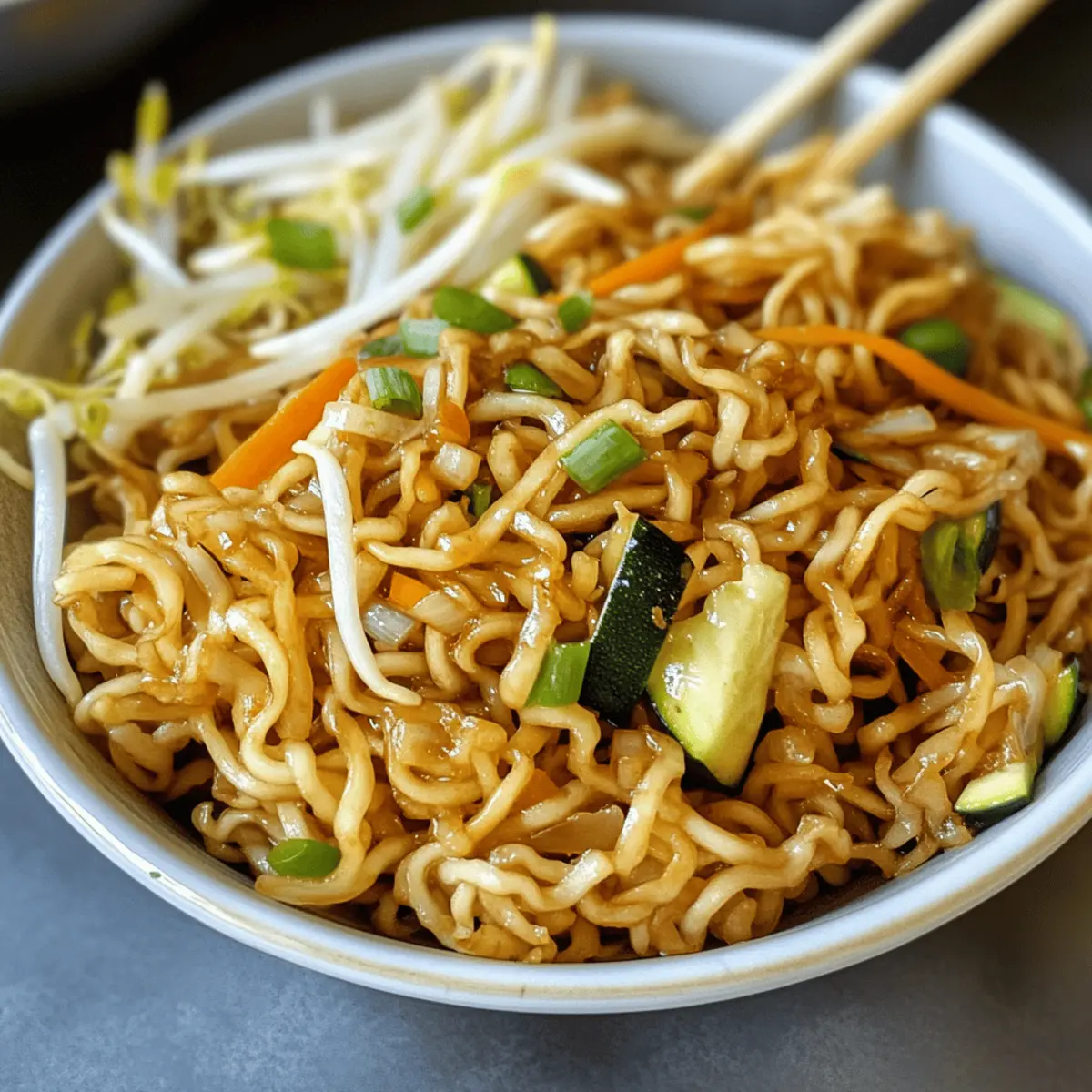 Wusstest du, dass gebratene Nudeln in vielen chinesischen Restaurants für ihre einfache Zubereitung und köstlichen Geschmack geliebt werden? In diesem Rezept für gebratene Nudeln wie beim Chinesen mit Ei und Gemüse vereinen sich knusprige Mie-Nudeln, frisches Gemüse und ein Hauch von Sesamöl zu einem himmlischen Gericht, das du ganz einfach zu Hause nachkochen kannst. Ideal für all jene, die eine schnelle und befriedigende Mahlzeit suchen, bietet dieses Rezept außerdem die Flexibilität, es ganz nach deinem Geschmack anzupassen – ob vegetarisch oder mit Fleisch. Wer kann da schon widerstehen? Lass uns gemeinsam entdecken, wie du dieses leckere Gericht im Handumdrehen zubereiten kannst! Warum sind gebratene Nudeln so besonders? Einfachheit, die begeistert: Dieses Rezept für gebratene Nudeln wie beim Chinesen benötigt nur wenige Zutaten und lässt sich blitzschnell zubereiten. Vielfalt für jeden Geschmack: Ob mit frischem Gemüse oder zartem Fleisch – du kannst ganz nach Belieben variieren! Köstlicher Genuss: Die Kombination aus knusprigen Nudeln, frischem Gemüse und aromatischem Sesamöl bringt einen Hauch von China direkt in deine Küche. Schnell und sättigend: Perfekt für stressige Abende, denn in weniger als 30 Minuten hast du ein schmackhaftes Gericht auf dem Tisch. Entdecke auch mein Rezept für einen Erfrischenden Gurken Zwiebel Delight als perfekte Ergänzung zu deinen gebratenen Nudeln! Fried Noodles wie beim Chinesen mit Ei und Gemüse – Zutaten Für die Nudeln Mie-Nudeln – Hauptbestandteil für eine sättigende Basis. Kann durch Reisnudeln, Udon oder Lai Fun ersetzt werden. Für das Gemüse Zucchini – Bringt Feuchtigkeit und eine leichte Knusprigkeit. Kann durch Paprika oder Brokkoli ersetzt werden. Karotte – Fügt natürliche Süße und Farbe hinzu. Kann durch Erbsen für einen anderen Geschmack ersetzt werden. Sojasprossen – Sorgt für Frische und einen knusprigen Biss. Kann weggelassen oder durch Bohnenkeime ersetzt werden. Zwiebel – Bildet eine herzhafte Grundlage. Schalotten oder Frühlingszwiebeln können als Alternativen verwendet werden. Lauchzwiebeln – Für einen Farbtupfer und milden Zwiebelgeschmack. Verwende Schnittlauch als Ersatz. Für die Aromastoffe Knoblauch – Verbessert das Geschmackserlebnis. Frischer Knoblauch ist ideal; Pulver kann im Notfall benutzt werden. Ingwer – Gibt Wärme und eine besondere Note. Kann durch Knoblauch ersetzt werden, wenn nicht verfügbar. Sesamöl – Verleiht ein nussiges Aroma. Olivenöl kann verwendet werden, der Geschmack ändert sich jedoch. Für die Bindung Eier – Sorgt für Reichhaltigkeit und bindet die Zutaten. Optional für Vegetarier; Silken-Tofu kann als Ersatz verwendet werden. Für die Würze Sojasoße – Wichtige Zutat für umami Tiefe. Verwende natriumarme Sojasauce für eine leichtere Variante. Diese fried noodles wie beim Chinesen mit Ei und Gemüse sind nicht nur schnell zubereitet, sondern auch eine wahre Geschmacksexplosion! Schritt-für-Schritt-Anleitung für gebratene Nudeln wie beim Chinesen mit Ei und Gemüse Schritt 1: Gemüse vorbereiten Schneide alle Gemüse sorgfältig: Zucchini in dünne Streifen, die Zwiebel in kleine Stücke, den Knoblauch fein gehackt und die Lauchzwiebeln in Ringe. Diese frischen Zutaten sind die Basis für die gebratenen Nudeln wie beim Chinesen und sollten gleichmäßig geschnitten werden, um eine einheitliche Garzeit zu gewährleisten. Schritt 2: Nudeln kochen Bring einen großen Topf mit Salzwasser zum Kochen und füge die Mie-Nudeln hinzu. Koche sie entsprechend der Packungsanweisung etwa 4–5 Minuten, bis sie al dente sind. Nach dem Abgießen gut abtropfen lassen, damit die Nudeln nicht matschig werden. Dies ist ein entscheidender Schritt für deine gebratenen Nudeln wie beim Chinesen. Schritt 3: Aromastoffe anbraten Erhitze in einer großen Pfanne oder einem Wok 2 Esslöffel Sesamöl bei mittlerer Hitze. Füge den gehackten Knoblauch und die Zwiebel hinzu und brate sie 2 Minuten lang an, bis sie weich und aromatisch sind. Diese Aromastoffe sind wichtig für den Geschmack deiner gebratenen Nudeln und sorgen für eine köstliche Basis. Schritt 4: Gemüse hinzufügen Gib die Karottenstücke in die Pfanne und brate sie für weitere 2 Minuten an. Danach füge die Zucchini hinzu und brate beides zusammen für etwa 3 Minuten, bis das Gemüse leicht weich, aber noch knackig ist. Rühre gut um, damit die Aromen gleichmäßig verteilt sind und deine gebratenen Nudeln wie beim Chinesen perfekt gewürzt werden. Schritt 5: Nudeln und Gewürze kombinieren Füge die gekochten Nudeln zusammen mit der restlichen Sojasauce und den Sojasprossen in die Pfanne. Brate alles für 5 Minuten bei mittlerer Hitze unter ständigem Rühren an, damit die Nudeln gut mit dem Gemüse und den Aromen vermischt sind. Achte darauf, dass die Nudeln leicht bräunen und knusprig werden. Schritt 6: Eier einarbeiten Nehme die Pfanne kurz vom Herd und schiebe die Nudel-Gemüse-Mischung an den Rand. Schlage nun die Eier direkt in die Mitte der Pfanne und lasse sie einige Sekunden kochen, bevor du sie sanft unter die Nudelmischung hebst. Durch die Eier wird dein Gericht reichhaltiger und bindet die Zutaten perfekt zusammen. Schritt 7: Garnieren und Servieren Gib die übriggebliebenen Lauchzwiebeln über die gebratenen Nudeln wie beim Chinesen und vermenge sie sanft. Serviere die fertigen Nudeln sofort auf Tellern, um die Frische und den Geschmack optimal zur Geltung zu bringen. Diese Kombination aus Aromen und Texturen macht das Gericht zu einem Highlight deiner nächsten Mahlzeit! Was passt perfekt zu gebratenen Nudeln wie beim Chinesen mit Ei und Gemüse? Die Kombination aus herzhaften Aromen und knackigem Gemüse lädt dazu ein, ein komplettes Menü zu kreieren. Cremige Avocado-Salat: Frische Avocado bringt eine buttrige Textur mit in die Mischung und ergänzt die knusprigen Nudeln wunderbar. Eine Idee für einen leichten, erfrischenden Kontrast. Eingelegtes Gemüse: Ein saures 