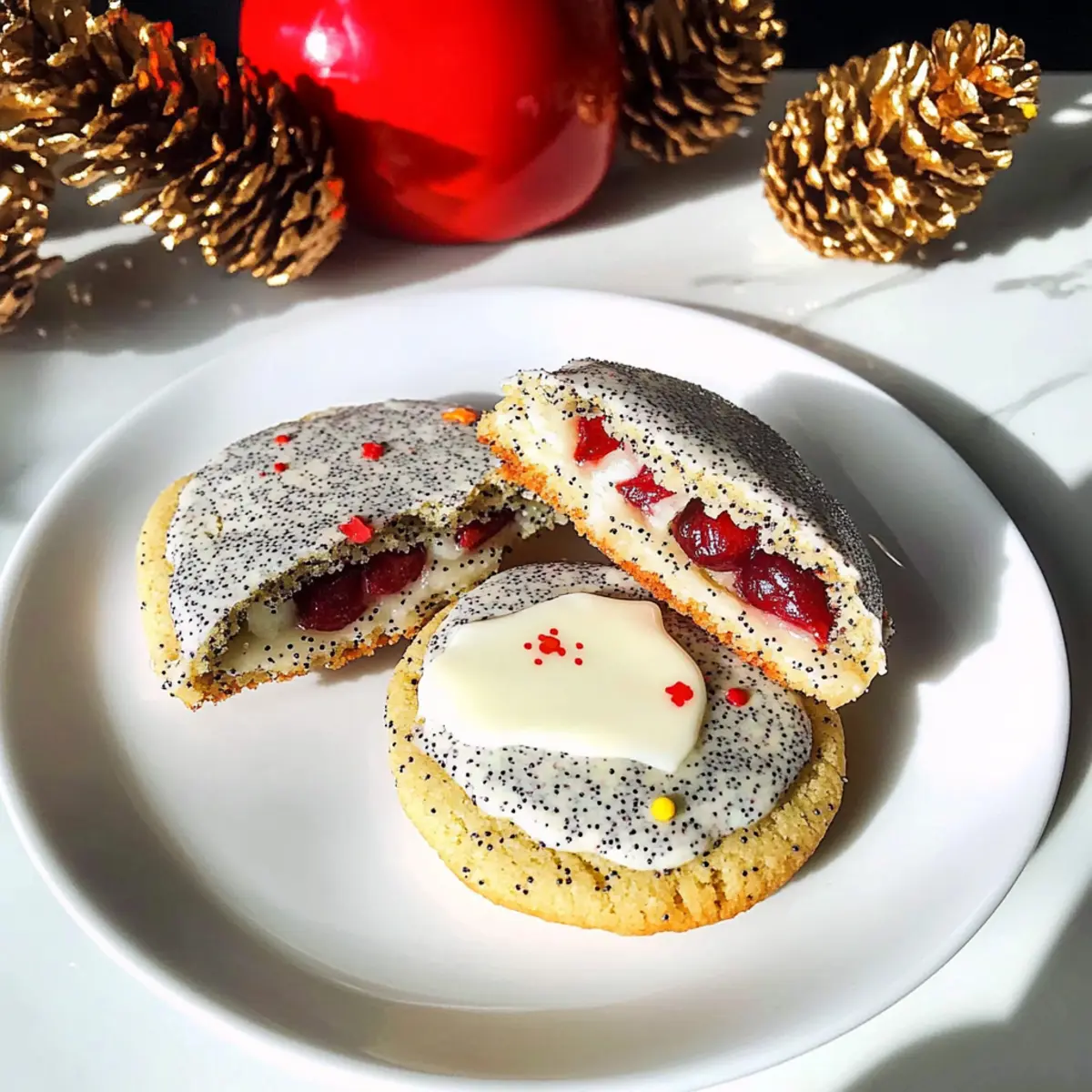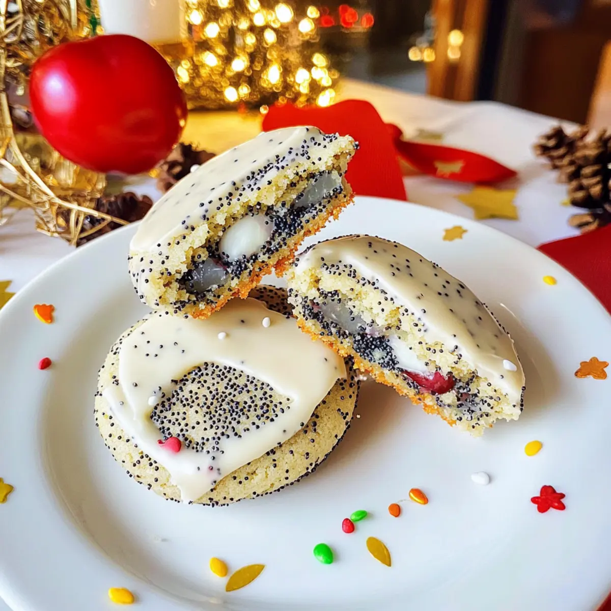 Es ist wieder diese Zeit des Jahres, in der die Küche von köstlichen Aromen erfüllt ist und das Herz beim Gedanken an frisch gebackene Plätzchen höher schlägt. Diese gefüllten Mohnplätzchen mit Kirsch-Marzipan sind nicht nur ein Augen- und Gaumenschmaus, sie bringen auch wunderbare Erinnerungen an festliche Zusammenkünfte zurück. Mit ihrer samtigen Konsistenz und dem nussigen Geschmack der Mohnfülle sind sie eine ideale Wahl für alle, die das Besondere in der Weihnachtszeit lieben. Das Beste daran? Diese einfachen und schnellen Kekse sind ein wahres Party-Highlight und lassen sich wunderbar vorbereiten und aufbewahren. Wer könnte da widerstehen? Lass uns gemeinsam in die Welt der festlichen Backkünste eintauchen und diese köstlichen Mohnplätzchen ausprobieren! Warum sind diese Plätzchen so besonders? Einzigartiger Geschmack: Diese gefüllten Mohnplätzchen kombinieren nussige Mohnnoten mit süßem Kirsch-Marzipan, was jedem Biss eine wunderbare Tiefe verleiht. Einfache Zubereitung: Die Schritte sind klar und einfach, sodass sowohl Anfänger als auch erfahrene Bäcker schnell zum Ziel kommen. Vielfältige Variationen: Experimentiere mit verschiedenen Füllungen wie Himbeerkonfitüre oder anderen Geschmacksrichtungen, um deine eigenen Kreationen zu schaffen. Für jeden Anlass: Perfekt zu Kaffee oder als festlicher Snack auf dem Plätzchenteller – sie bringen auf jede Feier Freude! Langanhaltender Genuss: Diese Kekse sind einfach im Voraus zuzubereiten und lassen sich hervorragend lagern, was sie ideal für hektische Feiertage macht. Mohnplätzchen Zutaten Hier sind die Zutaten, um diese köstlichen gefüllten Mohnplätzchen zuzubereiten: Kaltes Butterschmalz – sorgt für einen reichen, buttrigen Geschmack und zarte Konsistenz; kann durch Butter ersetzt werden. Gemahlener Mohn – verleiht einen einzigartigen nussigen Geschmack und Textur; keine Alternative empfohlen, da er ein Hauptbestandteil ist. Zucker – bringt Süße ins Spiel, um die Aromen auszubalancieren; kann durch Kokoszucker für eine gesündere Option ersetzt werden. Vanillezucker – verstärkt das süße Profil mit feinen Vanille-Noten; kann durch reinen Vanilleextrakt ersetzt werden. Mehl – bildet die Basis des Teigs und sorgt für Stabilität; Allzweckmehl oder eine glutenfreie Mischung sind gute Alternativen. Ei (Größe M) – bindet die Zutaten für einen zusammenhängenden Teig; für eine vegane Option kann ein Chia- oder Leinsamen-Ei verwendet werden. Kirsch-Marzipan-Konfitüre – fügt einen fruchtigen, süßen Kern hinzu; kann durch jede andere Beeren- oder Steinfruchtkonfitüre ersetzt werden. Weiße Kuvertüre – dient zur Dekoration und sorgt für eine süße, glatte Oberflächenbeschichtung; dunkle Schokolade kann für einen bittersüßen Geschmack verwendet werden. Streusel – für die Verzierung; verwende nach Belieben bunte Streusel oder lasse sie weg für einen schlichten Look. Lass uns die beliebten Sonntags Kaffeezeit mit diesen unwiderstehlichen Mohnplätzchen füllen! Schritt-für-Schritt-Anleitung für die gefüllten Mohnplätzchen mit Kirsch-Marzipan Step 1: Teig vorbereiten In einer großen Schüssel das kalte Butterschmalz, den gemahlenen Mohn, Zucker, Vanillezucker, Mehl und das Ei vermengen. Mit den Händen oder einem Rührgerät gut durchkneten, bis ein glatter Teig entsteht. Den Teig in Frischhaltefolie einwickeln und für etwa 30 Minuten in den Kühlschrank stellen, damit er fest wird. Step 2: Plätzchen ausstechen Den Ofen auf 180°C vorheizen und ein Backblech mit Backpapier auslegen. Den gekühlten Teig auf einer bemehlten Arbeitsfläche auf etwa 2 mm Dicke ausrollen. Mit einem runden Ausstecher oder Glas gleichmäßige Kreise ausstechen und diese auf das Backblech legen, sodass genug Platz zwischen den Plätzchen bleibt. Step 3: Plätzchen backen Die Plätzchen auf der mittleren Schiene des vorgeheizten Ofens für 10 bis 12 Minuten backen, bis sie goldgelb sind. Achte darauf, dass die Ränder leicht bräunen, aber die Plätzchen nicht überbacken werden. Nach dem Backen die Plätzchen auf einem Kuchengitter komplett abkühlen lassen. Step 4: Plätzchen füllen Nehme ein Plätzchen und gib einen halben Teelöffel Kirsch-Marzipan-Konfitüre auf die Unterseite. Decke es mit einem zweiten Plätzchen ab, sodass die Füllung zwischen beiden Keksen eingeklemmt ist. Wiederhole diesen Vorgang, bis alle Plätzchen gefüllt sind. Step 5: Plätzchen dekorieren Die weiße Kuvertüre über einem Wasserbad schmelzen, bis sie glatt und flüssig ist. Tauche die obere Hälfte jedes Plätzchens in die geschmolzene Schokolade und bestreue sie sofort mit bunten Streuseln. Lass die Schokolade fest werden, bevor du die gefüllten Mohnplätzchen servierst oder aufbewahrst. Vorbereitungen für gefüllte Mohnplätzchen mit Kirsch-Marzipan Diese gefüllten Mohnplätzchen mit Kirsch-Marzipan sind perfekt für die Vorbereitung, um dir Zeit in der hektischen Weihnachtszeit zu sparen! Du kannst den Teig bis zu 24 Stunden im Voraus zubereiten und im Kühlschrank lagern – das hält ihn frisch und wird das Ausstechen viel einfacher. Die Plätzchen können ebenfalls schon 3 Tage vorher gebacken und in einer luftdichten Dose aufbewahrt werden, sodass sie schön weich bleiben. Wenn du bereit bist, sie zu füllen, einfach einen halben Teelöffel Kirsch-Marzipan-Konfitüre zwischen zwei Kekse geben und mit geschmolzener Kuvertüre dekorieren. So genießt du herrliche frisch gebackene Kekse mit minimalem Aufwand, wann immer du einen süßen Snack möchtest! Was passt zu gefüllten Mohnplätzchen mit Kirsch-Marzipan? Kreiere mit diesen köstlichen Keksen eine unvergessliche Kaffeestunde, die allen Freude bereitet! Frisch gebrühter Kaffee: Der kräftige Geschmack des Kaffees harmoniert perfekt mit der Süße der Plätzchen und sorgt für ein ausgewogenes Geschmackserlebnis. Eine Tasse frisch gebrühter Kaffee ist die ideale Begleitung für diese festlichen Kleinigkeiten. Earl Grey Tee: Der aromatische D