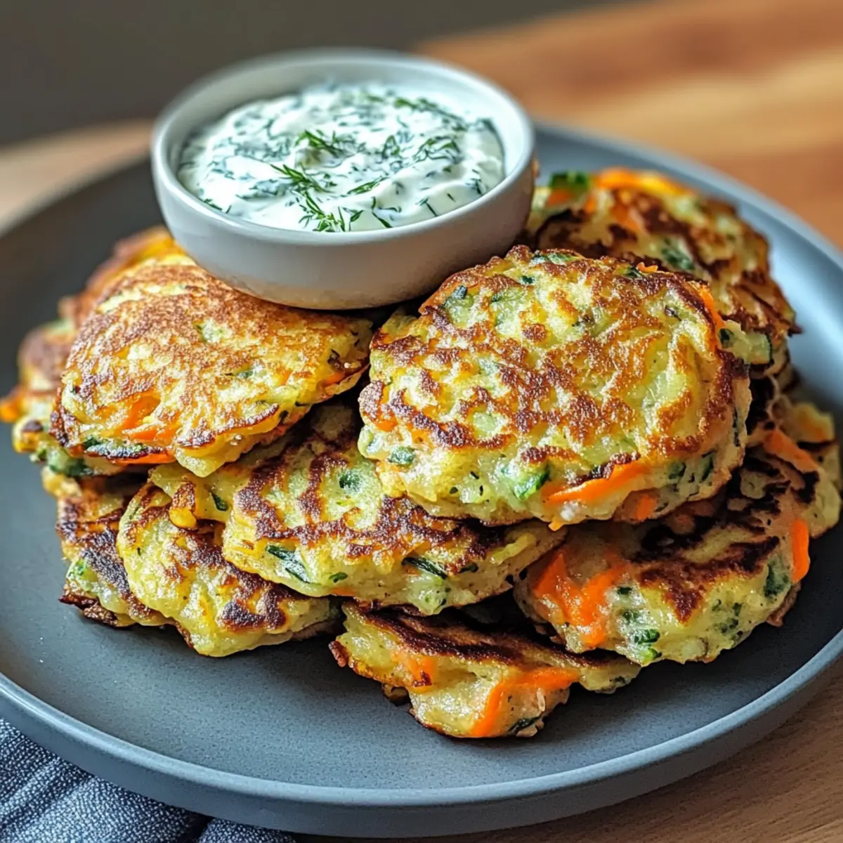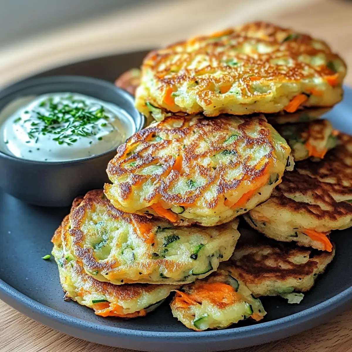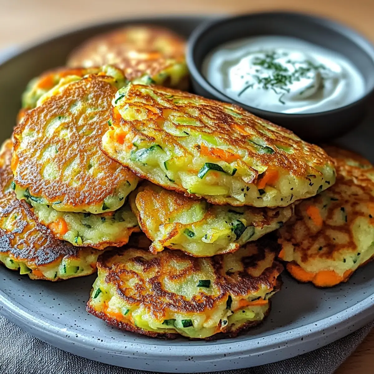 Hast du schon einmal in die Welt der Gemüsepfannkuchen eingetaucht? Diese knusprigen Leckereien sind nicht nur ein Fest der Farben, sondern auch eine großartige Möglichkeit, frisches Gemüse in einem einfachen, aber leckeren Gericht zu genießen. Die Rezeptur für Gemüsepfannkuchen mit Kräuterdip vereint knackiges, geraspeltes Gemüse in einem luftig-leichten Teig, der mit einer cremigen Kräuterdip serviert wird. Perfekt für all diejenigen, die sich nach schnellem und gesundem Essen sehnen, bieten diese Pfannkuchen nicht nur eine köstliche Wahl für Frühstück oder Mittagessen, sondern sind auch ein Hit bei der ganzen Familie. Lust auf eine einfache Zubereitung und innovative Abwandlung, die sowohl Vegetarier als auch Gesundheitsbewusste anspricht? Lass uns zusammen in diese köstliche vegane Auszeit eintauchen! Warum sind Gemüsepfannkuchen so beliebt? Vielseitigkeit: Diese Pfannkuchen lassen sich mühelos an deine Vorlieben anpassen. Ob Zucchini, Karotten oder Spinat – verwende einfach dein Lieblingsgemüse. Gesundheitlich: Mit einem hohen Anteil an frischem Gemüse sind sie eine gesunde Option für jede Mahlzeit. Einfach und schnell: In wenigen Schritten zubereitet, sind sie ideal für stressige Tage, wenn es schnell gehen muss. Familienfreundlich: Selbst die kleinsten Gemüseverweigerer werden ein Stück von diesen leckeren Pfannkuchen probieren wollen! Für eine interessante Wendung kannst du unseren Kräuterdip zur Verfeinerung hinzufügen, der das Geschmackserlebnis perfekt abrundet. Gemüsepfannkuchen Zutaten Hier sind alle Zutaten, die du für die Zubereitung der köstlichen Gemüsepfannkuchen mit Kräuterdip benötigst! Für den Teig Geraspeltes Gemüse (2 Tassen) – Verwende eine Mischung aus Karotten, Zucchini und Paprika; saisonales Gemüse kann auch hervorragend ersetzt werden. Mehl (1 Tasse) – Gibt Struktur; kann durch glutenfreies Mehl ersetzt werden für eine glutenfreie Variante. Eier (2) – Dienen als Bindemittel und sorgen für eine reichhaltige Konsistenz; für eine vegane Option verwende 1/4 Tasse Apfelmus oder ein Leinsamen-Ei. Milch (1 Tasse) – Fügt Feuchtigkeit hinzu; kann durch pflanzliche Alternativen wie Mandel- oder Hafermilch ersetzt werden. Backpulver (1 TL) – Unterstützt beim Aufgehen für eine fluffige Textur. Salz (1 TL) – Verstärkt den Geschmack; nach Geschmack anpassen. Pfeffer – Ergänzt die Würze nach Belieben. Öl (2 EL) – Wird zum Braten verwendet; kann durch Olivenöl oder Avocadoöl ersetzt werden. Frische Kräuter (z.B. Petersilie, Schnittlauch) – Bringen Frische; sowohl in den Pfannkuchen als auch im Dip verwenden. Für den Kräuterdip Griechischer Joghurt (200g) – Basis des Dips und sorgt für Cremigkeit; pflanzlicher Joghurt kann als milchfreie Variante verwendet werden. Zitronensaft (1 TL) – Bringt Frische; frischer Saft ist bevorzugt. Knoblauch (1 Zehe) – Fügt Tiefe hinzu; kann für einen milderen Geschmack weggelassen werden. Gehackte frische Kräuter – Verstärken die Frische im Dip. Salz und Pfeffer – Für die Würze; nach Bedarf anpassen. Mit diesen Zutaten bist du bestens gerüstet, um die köstlichen Gemüsepfannkuchen mit Kräuterdip zuzubereiten! Schritt-für-Schritt-Anleitung für Gemüsepfannkuchen mit Kräuterdip Step 1: Gemüse vorbereiten Wasche, schäle und raspel oder hacke das Gemüse fein. Du kannst eine Kombination aus Karotten, Zucchini und Paprika verwenden. Bereite etwa 2 Tassen geraspeltes Gemüse vor, das die Grundlage für deine Gemüsepfannkuchen bildet. Dies sorgt nicht nur für Geschmack, sondern auch für eine schöne Farbvielfalt in deinen Pfannkuchen. Step 2: Teig anrühren In einer großen Schüssel mischst du das Mehl, die Eier, die Milch, das Backpulver, das Salz und den Pfeffer. Rühre alles gut durch, bis eine glatte Teigmasse entsteht. Dies dauert etwa 2-3 Minuten. Achte darauf, dass keine Klumpen mehr im Teig sind, um eine gleichmäßige Konsistenz zu gewährleisten. Step 3: Gemüse und Kräuter hinzufügen Falte nun das vorbereitete Gemüse sowie die gehackten frischen Kräuter vorsichtig in den Teig. Dies gibt den Gemüsepfannkuchen mit Kräuterdip nicht nur mehr Geschmack, sondern sorgt auch für eine schöne Textur. Mische alles sanft, damit die Zutaten gleichmäßig verteilt sind, und lass den Teig für etwa 10 Minuten ruhen. Step 4: Öl erhitzen Erhitze in einer großen Pfanne bei mittlerer Hitze 2 Esslöffel Öl, bis es heiß ist. Du kannst einen kleinen Tropfen Teig hinein geben, um zu testen, ob das Öl heiß genug ist. Wenn der Teig sofort brutzelt, ist das Öl bereit für die Pfannkuchen. Achte darauf, dass das Öl nicht zu rauchen beginnt. Step 5: Pfannkuchen goldbraun braten Gib portionierte Mengen des Teigs (etwa eine halbe Kelle) in die Pfanne und koche die Pfannkuchen für etwa 3-4 Minuten auf jeder Seite, bis sie goldbraun sind. Achte darauf, dass du nicht zu viele auf einmal brätst, damit die Temperatur konstant bleibt. Wende die Pfannkuchen vorsichtig mit einem Pfannenwender, um ein Anhaften zu vermeiden. Step 6: Kräuterdip zubereiten Während die Pfannkuchen braten, kannst du den Kräuterdip zubereiten. Mische in einer separaten Schüssel 200 g griechischen Joghurt mit 1 Teelöffel Zitronensaft, einer zerdrückten Knoblauchzehe und den gehackten frischen Kräutern. Rühre alles gut durch und schmecke den Dip mit Salz und Pfeffer ab. Das gibt dem Dip eine erfrischende Note. Step 7: Servieren Sobald die Gemüsepfannkuchen mit Kräuterdip goldbraun und knusprig sind, lege sie auf einen warmen Teller. Serviere die warmen Pfannkuchen gemeinsam mit dem Kräuterdip auf der Seite. Diese Pfannkuchen eignen sich hervorragend als leichter Snack oder als Beilage. Lass dir die köstlichen Geschmäcker schmecken! Lagerung und Einfrieren von Gemüsepfannkuchen Kühlschrank: Bewahre übrig gebliebene Gemüsepfannkuchen in einem luftdichten Behälter im Kühlschrank auf, wo sie bis zu 2 Tage frisch bleiben. Einfrieren: Friere die Pfannkuchen in Schichten mit