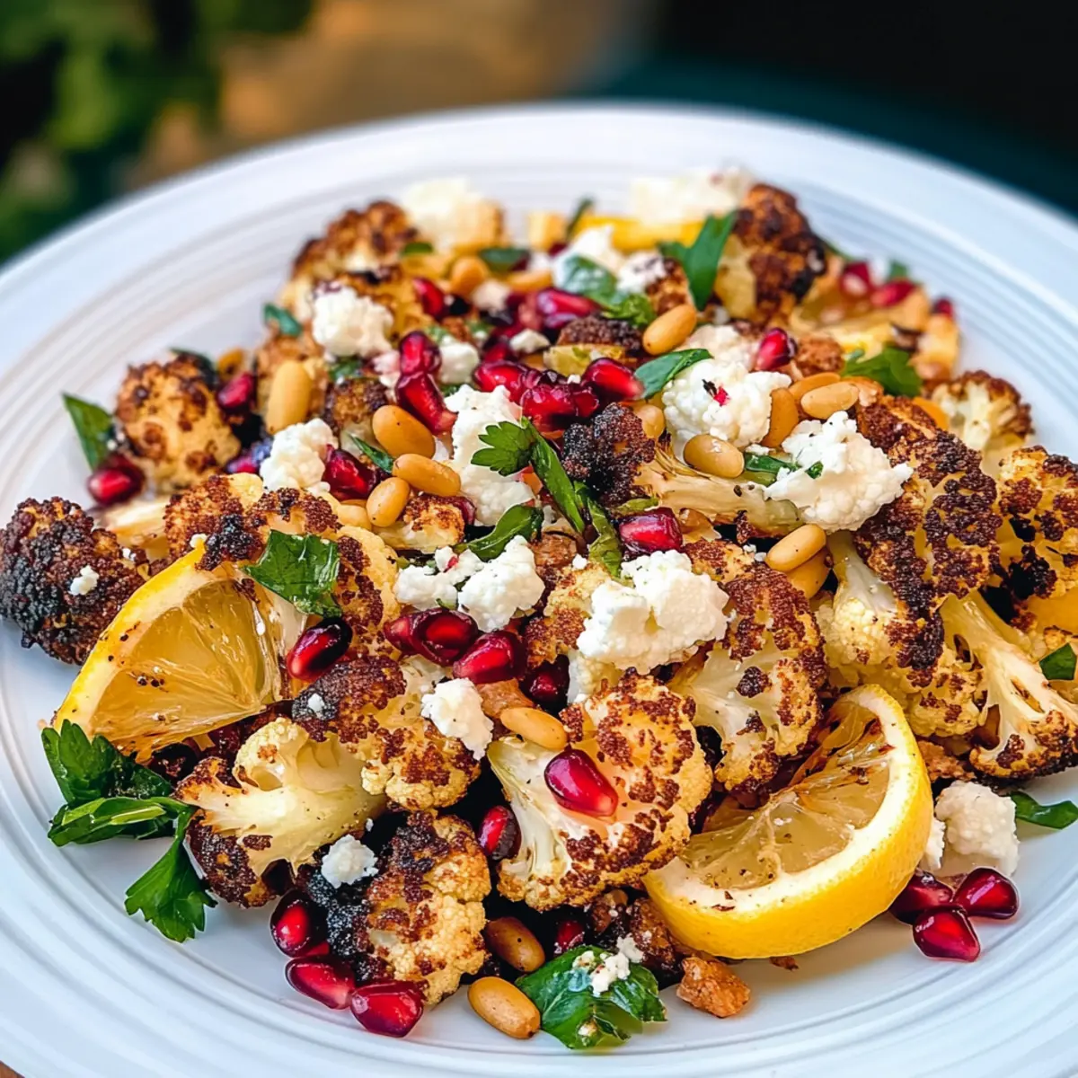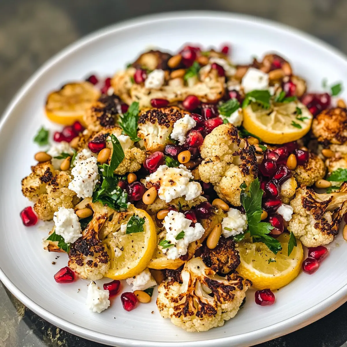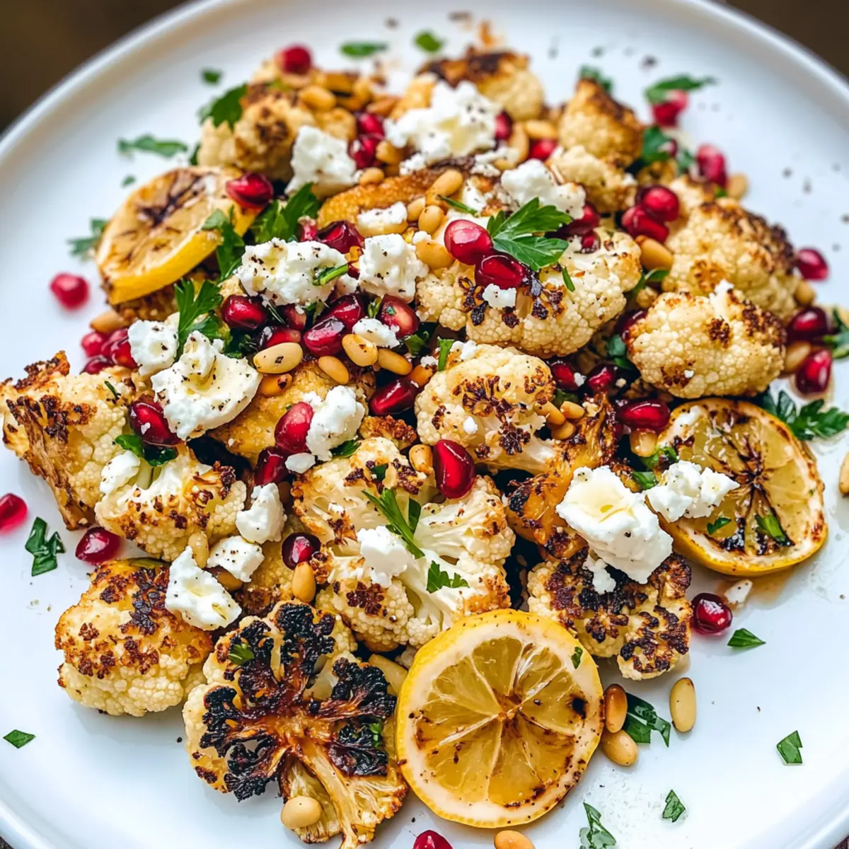 Hast du schon einmal darüber nachgedacht, wie ein einfaches Gemüse wie Blumenkohl zu einem wahren Kulinarik-Star werden kann? In meinem Rezept für Gerösteten Blumenkohlsalat mit Zitrone, Granatapfel und Feta vereinen sich leuchtende Farben und unwiderstehliche Aromen, um eine Steigerung deiner Gemüsesalate zu bieten. Diese gesunde Sensation ist nicht nur in weniger als 30 Minuten zubereitet, sondern verwandelt auch die schlichte Blumenkohl-Röschen in ein Highlight deiner nächsten Mahlzeit. Der nussige Tahini-Dressing und die süßen Granatapfelkerne sorgen für einen Geschmackskick, der für jeden Anlass geeignet ist. Bist du bereit, deinem Gemüse eine neue, aufregende Wendung zu geben? Warum wirst du diesen Blumenkohlsalat lieben? Einfachheit: Der Geröstete Blumenkohlsalat ist schnell und unkompliziert zuzubereiten – perfekt für vielbeschäftigte Tage. Vibrante Farben: Mit leuchtendem Granatapfel und goldenen Zitronenscheiben ist dieser Salat ein echter Hingucker auf jedem Tisch. Reichhaltiger Geschmack: Dank der Kombination von Tahini und Feta entsteht eine harmonische Mischung aus nussigen und cremigen Aromen, die jeden Bissen zu einem Genuss macht. Vielseitigkeit: Er passt großartig zu gegrilltem Fleisch, Fisch oder als eigenständiges Gericht für Vegetarier. Gesundheitsbewusst: Dieser Salat ist nicht nur köstlich, sondern auch nährstoffreich und voller Ballaststoffe, ideal für gesundheitsbewusste Genießer. Entdecke auch Gesunde Salate für jede Gelegenheit, um noch mehr Inspiration zu finden! Gerösteter Blumenkohlsalat Zutaten • Entdecke die leckeren Zutaten für einen gesunden Gerösteten Blumenkohlsalat, der voller Geschmack steckt! Für den Salat Blumenkohl – ein wahres Superfood, vollgepackt mit Nährstoffen; wähle frische, feste Köpfe ohne dunkle Stellen. Olivenöl – verleiht reichhaltigen Geschmack und hilft beim Rösten; kann durch Pflanzen- oder Avocadoöl ersetzt werden. Chili-Pulver – sorgt für eine angenehme Wärme; passe die Menge nach deinem Geschmack an. Knoblauchpulver – verstärkt die herzhaften Aromen; frisch gehackter Knoblauch kann verwendet werden. Salz & Pfeffer – unerlässlich für die Würze; nach Belieben anpassen. Zitrone – wird geröstet für eine herrliche Säure und Süße; verwende nur frische Zitronen. Granatapfelkerne – bieten Süße und attraktive Farbe; frische Kerne sind am besten; getrocknete Cranberries können alternativ verwendet werden. Feta-Käse – fügt Cremigkeit und salzige Noten hinzu; kann durch Ziegenkäse ersetzt werden. Pinienkerne – sorgen für einen knusprigen Biss; Walnüsse oder Pekanntnüsse können ebenfalls verwendet werden. Petersilie – bringt Frische und Farbe; kann durch Koriander ersetzt werden. Für das Dressing Tahini – die Basis des Dressings, welche einen nussigen Geschmack verleiht; darauf achten, dass es frisch ist. Frischer Zitronensaft – hellt das Dressing auf; frischer Saft sorgt für das beste Aroma. Minced Garlic – verleiht dem Dressing eine würzige Note; gerösteter Knoblauch sorgt für einen milderen Geschmack. Warmes Wasser – hilft, die Konsistenz des Dressings anzupassen; nach Bedarf verwenden, um die gewünschte Dicke zu erreichen. Schritt-für-Schritt-Anleitung für Gerösteten Blumenkohlsalat mit Zitrone, Granatapfel und Feta Step 1: Ofen vorheizen Heize den Ofen auf 220°C vor und lege zwei Backbleche mit Aluminiumfolie aus. Dies hilft, das Ankleben des Gemüses zu verhindern und erleichtert die Reinigung. Während der Ofen aufheizt, kannst du die Blumenkohlröschen vorbereiten, damit alles bereit ist, wenn die Temperatur erreicht ist. Step 2: Blumenkohl würzen Schneide den Blumenkohl in gleichmäßige Röschen und gib sie in eine große Schüssel. Vermische die Blumenkohlröschen mit Olivenöl, Chili-Pulver, Knoblauchpulver, Salz und Pfeffer. Stelle sicher, dass alle Stücke gut bedeckt sind, damit sie gleichmäßig rösten. Dies gibt dem Gerösteten Blumenkohlsalat von Anfang an einen tollen Geschmack. Step 3: Gemüse verteilen Verteile die gewürzten Blumenkohlröschen gleichmäßig auf einem der Backbleche. Auf dem zweiten Blech legst du die in Scheiben geschnittenen Zitronen aus. Diese werden ebenfalls geröstet und verleihen dem Salat eine wunderbare Süße und Säure. Step 4: Rösten des Gemüses Backe den Blumenkohl für 25-30 Minuten, bis er goldbraun und zart ist, und wende ihn nach der Hälfte der Garzeit, um eine gleichmäßige Röstung zu gewährleisten. Die Zitronenscheiben sollten 18-24 Minuten backen, bis sie goldbraun und karamellisiert sind. Achte darauf, dass die Zitronen nicht verbrennen; sie sind perfekt, wenn sie lecker duften. Step 5: Abkühlen lassen Nimm das Gemüse aus dem Ofen und lasse die Röstwaren kurz abkühlen. Ein kurzes Warten sorgt dafür, dass sich die Aromen setzen und der Blumenkohlsalat leichter zu handhaben ist, wenn du ihn anrichtest. Step 6: Anrichten des Salats Bereite einen schönen Servierteller vor und verteile die gerösteten Blumenkohlröschen darauf. Streue die Granatapfelkerne, den zerbröckelten Feta, die gerösteten Pinienkerne und die gehackte Petersilie gleichmäßig über den Salat, um ein farbenfrohes und schmackhaftes Ergebnis zu erzielen. Step 7: Tahini-Dressing zubereiten In einer Schüssel mischst du Tahini, frischen Zitronensaft, gehackten Knoblauch und Salz. Füge nach Bedarf warmes Wasser hinzu, um die gewünschte Konsistenz zu erreichen. Rühre gut um, bis das Dressing cremig und geschmeidig ist. Dies sorgt für den perfekten Abschluss des Gerösteten Blumenkohlsalats. Step 8: Servieren Träufle das Tahini-Dressing gleichmäßig über den Salat und garniere ihn mit den gerösteten Zitronenscheiben. Serviere den Gerösteten Blumenkohlsalat warm oder bei Raumtemperatur. Er ist eine wunderbare Beilage oder eignet sich hervorragend als Hauptgericht für eine gesunde Mahlzeit. Vorbereitung für deinen Gerösteten Blumenkohlsalat Wenn du Zeit sparen möchtest, ist dieser Geröstete Blumenkohlsal
