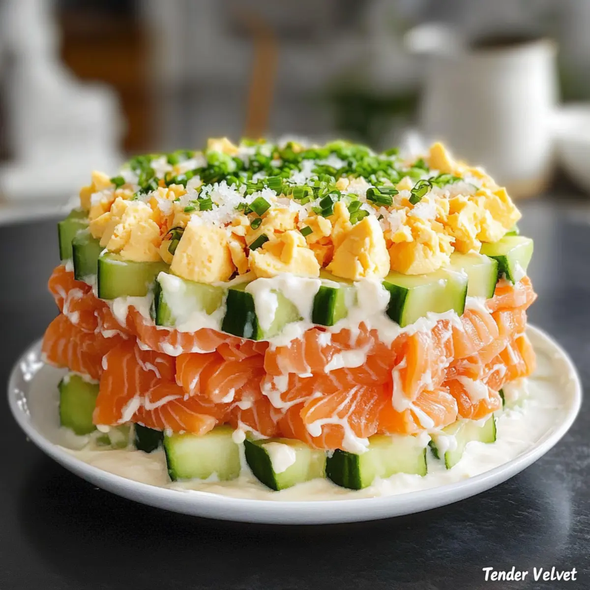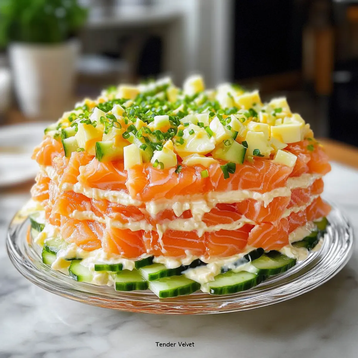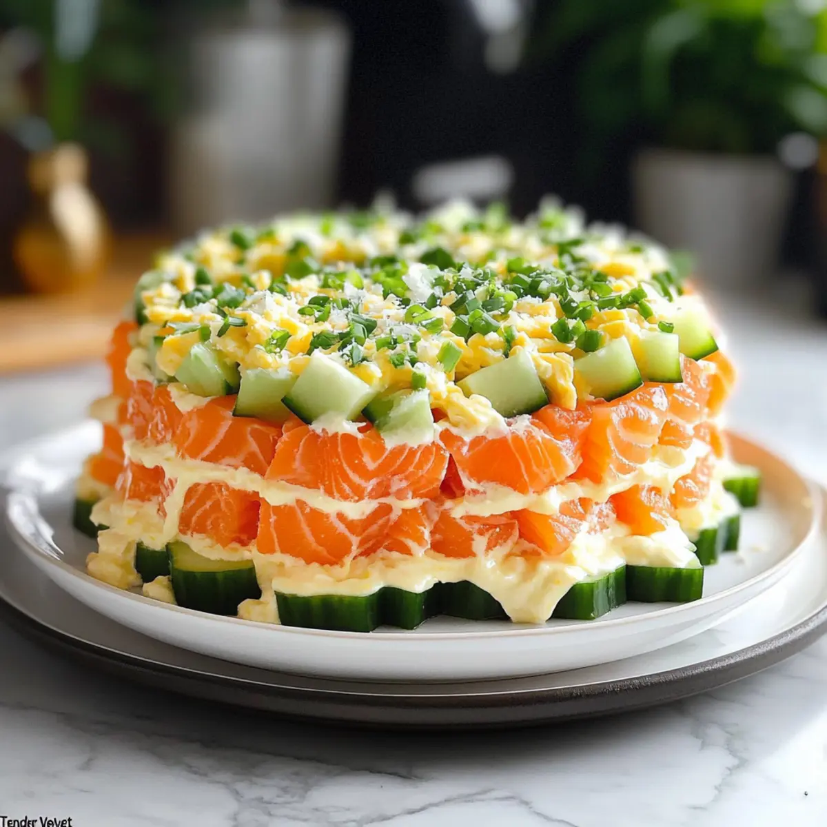 Was für eine Überraschung, als ich neulich einen eleganten Leckerbissen entdeckt habe, der einfach jeden begeistert: der Geschichtete Lachs-Salat “Zarte Samt”! Diese köstliche Kreation vereint zarte Schichten von leicht gesalzenem Lachs, cremiger Mayonnaise und knackigen Gurken in einer Art und Weise, die sowohl das Auge als auch den Gaumen erfreut. Ideal für besondere Anlässe, bietet dieser kalte Salat eine erfrischende und gleichzeitig reichhaltige Geschmackserfahrung. Und das Beste? Die Zubereitung ist schnell und unkompliziert, sodass du mehr Zeit mit deinen Gästen verbringen kannst. Neugierig, wie du diesen Showstopper selbst kreieren kannst? Lass uns in die Details eintauchen! Warum wirst du dieses Rezept lieben? Eleganz auf dem Teller: Dieser Geschichtete Lachs-Salat “Zarte Samt” ist nicht nur ein Fest fürs Auge, sondern auch ein echtes Geschmackserlebnis. Einfachheit pur: Die Zubereitung benötigt keine ausgeklügelten Kochkünste – entspann dich in der Küche! Vielfältige Variationen: Ob du den Lachs durch geräucherte Varianten ersetzt oder eine vegetarische Option wählst, der Salat bleibt ein Hit. Erfrischender Crunch: Die knackigen Gurken und der cremige Käse sorgen für eine harmonische Textur, die begeistert. Ideale Portionsgröße: Dieser kalte Salat eignet sich perfekt für Partys oder als Füller für ein leichtes Mittagessen. Schau dir auch unsere Tipps zu Lagerung und Haltbarkeit an, damit alles frisch bleibt! Geschichteter Lachs-Salat “Zarte Samt” Zutaten • Hinweis: Hier sind die Zutaten für den köstlichen Geschichteten Lachs-Salat “Zarte Samt”, perfekt für jeden Anlass! Für den Salat: Leicht gesalzener Lachs – sorgt für einen reichen Geschmack und eine zarte Textur; geräucherter Lachs kann für mehr Intensität verwendet werden. Mayonnaise – bringt Cremigkeit in den Salat und hilft, die Schichten zusammenzuhalten; ersetze sie durch griechischen Joghurt für eine leichtere Variante. Hartgekochte Eier – bieten zusätzliche Cremigkeit und Protein; stelle sicher, dass sie fein gerieben sind, um gleichmäßige Schichten zu garantieren. Frische Gurken – fügen einen erfrischenden Crunch hinzu; klein würfeln und trocken tupfen, um ein Durchweichen zu vermeiden. Geriebener Käse (halbhart) – verstärkt die Cremigkeit und das Geschmacksprofil; wähle deinen Lieblingskäse für die beste Erfahrung. Gehackte Frühlingszwiebeln – verleihen einen milden Zwiebelgeschmack; fein hacken für eine gleichmäßige Verteilung. Frischer Dill (zum Garnieren) – bringt einen zarten Kräutergeschmack und steigert die optische Anziehung; verwende auch Schnittlauch oder Zitronenschnitze für eine spannende Abwandlung. Mit diesen Zutaten kannst du den Geschichteten Lachs-Salat “Zarte Samt” ganz einfach zubereiten und deine Gäste beeindrucken! Step-by-Step Instructions für Geschichteten Lachs-Salat “Zarte Samt” Step 1: Zutaten vorbereiten Koche die Eier in einem Topf mit kochendem Wasser für etwa 10 Minuten, damit sie hartgekocht sind. Anschließend die Eier abkühlen lassen, schälen und fein reiben. Währenddessen die Gurken klein würfeln, trocken tupfen und die Frühlingszwiebeln fein hacken, um eine gleichmäßige Verteilung in deinem Geschichteten Lachs-Salat “Zarte Samt” zu gewährleisten. Step 2: Form vorbereiten Richte einen runden Ringmold oder eine Springform (15–18 cm Durchmesser) auf einem weißen Keramikteller ein. Diese Form hilft dir, die Schichten ordentlich aufeinanderzulegen und sorgt für eine elegante Präsentation, die deinem Geschichteten Lachs-Salat “Zarte Samt” den perfekten Rahmen verleiht. Step 3: Schichten des Salats Beginne mit dem geriebenen Ei als unterster Schicht und drücke es leicht an, um eine stabile Basis zu schaffen. Darauf eine dünne Schicht Mayonnaise gleichmäßig verteilen, um der nächsten Schicht Halt zu geben. Achte darauf, diese Schichten mit Sorgfalt aufzutragen, um die Struktur deines Geschichteten Lachs-Salats zu wahren. Step 4: Gemüse und Käse hinzufügen Füge eine Mischung aus gehackten Frühlingszwiebeln und geriebenem Käse zur vorherigen Schicht hinzu und verteile sie gleichmäßig. Diese Mischung sorgt für zusätzlichen Geschmack und Cremigkeit. Danach kommt die gewürfelte Gurke (ohne Mayonnaise) darauf, um den knackigen Charakter des Salats zu bewahren. Step 5: Weitere Schichten aufbauen Wechsle mit einem weiteren Layer von geriebenem Käse oder einer Mischung aus Eiern und Mayonnaise. Diese abwechselnden Schichten aus cremigen und knackigen Zutaten machen deinen Geschichteten Lachs-Salat “Zarte Samt” besonders ansprechend. Achte darauf, jede Schicht gleichmäßig zu verteilen und gut anzudrücken. Step 6: Abschluss mit Lachs Beende die Schichtung mit der leicht gesalzenen oder geräucherten Lachsschicht. Drücke den Lachs sanft an, damit er sich gut mit den anderen Schichten verbindet. Diese letzte Schicht gibt deinem Geschichteten Lachs-Salat “Zarte Samt” den entscheidenden Geschmack und die feine Textur. Step 7: Fertigstellen und kühlen Verziere die Oberseite des Salats mit dekorativ aufgespritzt Mayonnaise und garniere ihn mit einem frischen Dillzweig. Decke den Salat ab und lasse ihn für 1–2 Stunden im Kühlschrank ruhen. Dies ist wichtig, damit die Aromen gut durchziehen und die Präsentation kühl und frisch bleibt, bevor du ihn servierst. Variationen & Austauschmöglichkeiten für Geschichteter Lachs-Salat Pimp deinen Geschichteten Lachs-Salat “Zarte Samt” mit kreativen Anpassungen, die jeden Gaumen erfreuen! Geräucherter Lachs: Ersetze den leicht gesalzenen Lachs für ein intensiveres Aroma und verkoste die herzhafte Note. Vegetarische Version: Nutze marinierte Champignons oder geröstete Rote Bete; veganer Joghurt fügt die notwendige Cremigkeit hinzu. Low-Calorie-Option: Ersetze Mayonnaise durch griechischen Joghurt; das Ergebnis ist leicht und erfrischend, ohne auf Genuss zu verzichten. Extra Crunch: Füge geröstete Kürbiskerne oder 