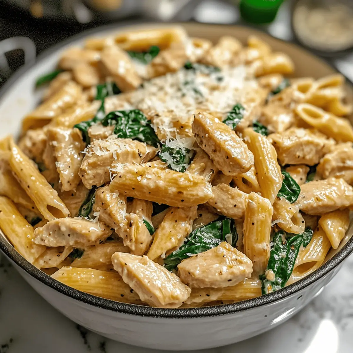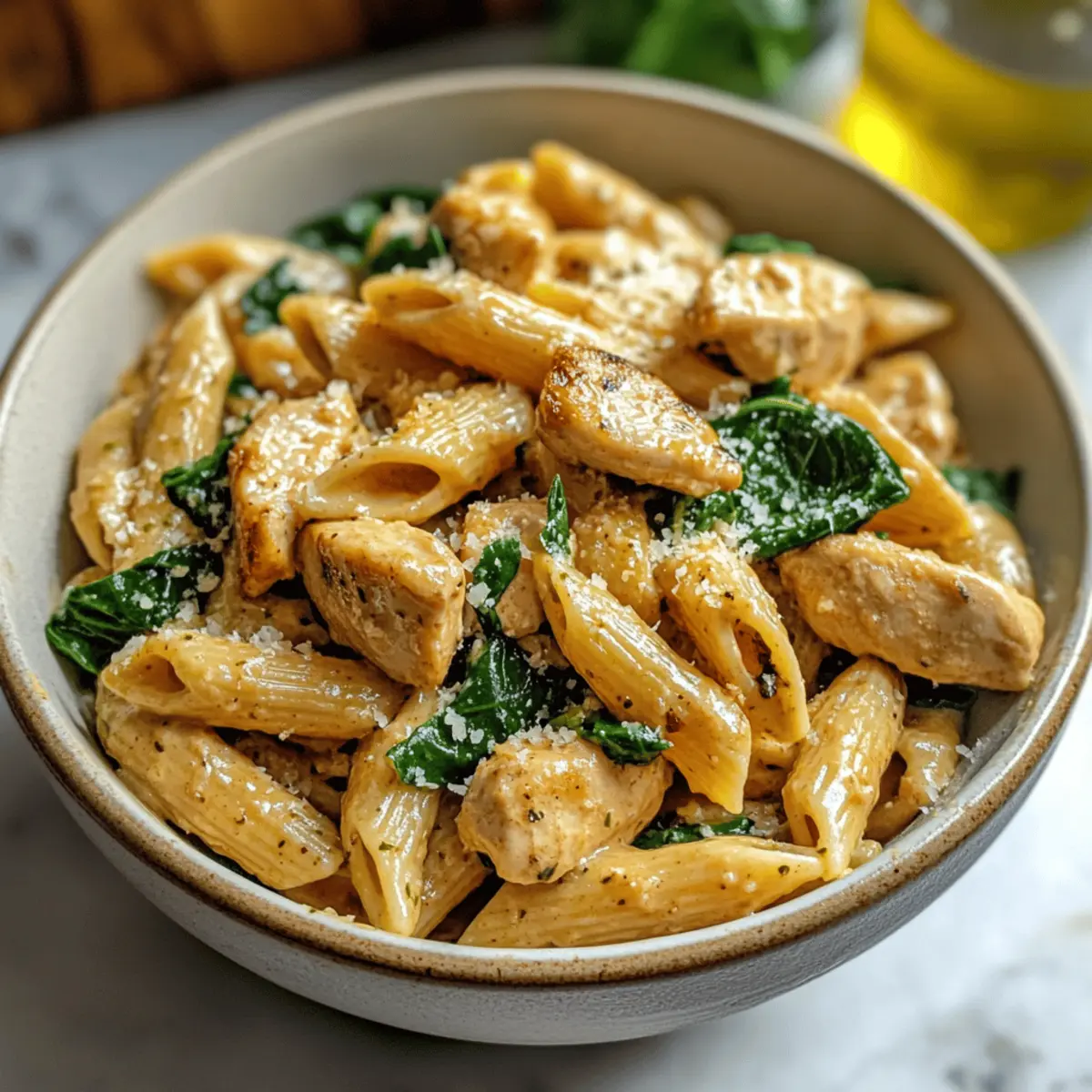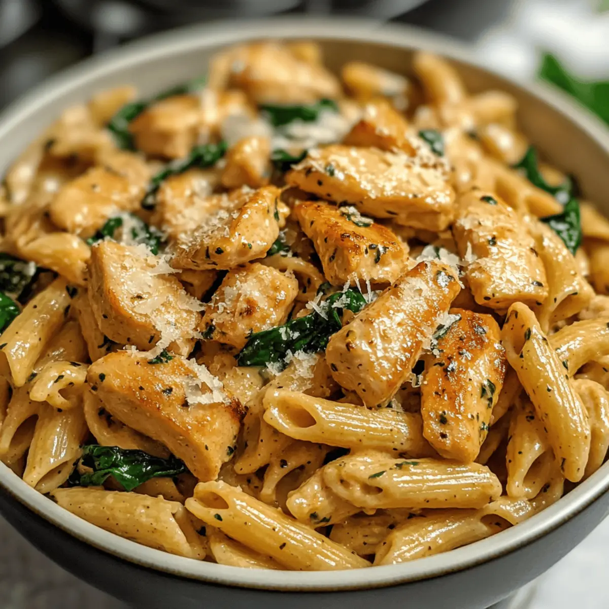 Es war ein hektischer Abend, und ich stand in der Küche mit dem unaufhörlichen Geräusch des Magenknurrens im Hintergrund. Ich wusste, dass ich etwas Leckeres und Gesundes zaubern wollte, das sowohl sättigend als auch nahrhaft ist. So entstand mein Gesunde Knoblauch-Parmesan-Hühnchen-Pasta Rezept, das eine wunderbar cremige und leicht cheesy Note bietet, ohne die Schwere typischer Pasta-Gerichte. Dieses Rezept erfordert nur wenig Zeit in der Küche und ist perfekt, wenn die Energiereserven nach dem Training wieder aufgetankt werden müssen. Mit zartem Hähnchen, vollwertiger Pasta und einer köstlichen yogurthaltigen Sauce ist es nicht nur ein Genuss, sondern unterstützt auch deine Fitnessziele. Bist du bereit, deine Geschmacksnerven zu verwöhnen und gleichzeitig auf deine Gesundheit zu achten? Lass uns gleich mit dem Kochen beginnen! Warum wirst du dieses Rezept lieben? Gesundheit: Diese Pasta vereint leckere Aromen mit gesunden Zutaten, ideal für bewusste Esser. Schnell und einfach: In weniger als 30 Minuten zauberst du ein köstliches Gericht, perfekt für stressige Abende. Vielseitig: Du kannst mit Gemüse oder verschiedenen Proteinen wie Garnelen oder Tofu variieren, um es ganz nach deinem Geschmack anzupassen. Cremig und befriedigend: Die Kombination aus griechischem Joghurt und Parmesan bietet eine reichhaltige Sauce, ohne dass es schwer im Magen liegt. Energiegeladen: Der ballaststoffreiche Vollkornpasta und das mageres Hähnchen halten dich lange satt und unterstützen deine Fitnessziele. Lass dich auch von unseren Variationen inspirieren und bring noch mehr Farbe auf deinen Teller! Gesunde Knoblauch-Parmesan-Hühnchen-Pasta Zutaten Hinweis: Dieses Rezept ist vollgepackt mit gesunden Zutaten für eine köstliche Mahlzeit. Vollkornpasta – liefert Ballaststoffe und komplexe Kohlenhydrate für langanhaltende Energie; für glutenfreie Optionen einfach glutenfreie Pasta verwenden. Würfeliges Hühnchenbrustfilet – sorgt für mageres Protein, welches für die Muskelreparatur und -wachstum unerlässlich ist. Olivenöl – fügt gesunde Fette hinzu; du kannst es auch durch Avocadoöl oder Pflanzenöl ersetzen. Gehackter Knoblauch – verstärkt den Geschmack und sorgt für Tiefe; frischer oder aus dem Glas sind austauschbar. Vollkornmehl – dient zum Andicken der Sauce; kann für eine glutenfreie Variante durch Mandelmehl ersetzt werden. Hühnerbrühe – liefert eine herzhafte Basis für die Sauce; verwende nach Möglichkeit natriumarme Varianten für mehr Gesundheit. Fettarme Milch – trägt zur Cremigkeit bei, ohne zusätzliche Kalorien; pflanzliche Milch kann ebenfalls verwendet werden. Griechischer Joghurt – ist eine gesunde Alternative zu Sahne, fügt Cremigkeit und Protein hinzu; auf keinen Fall kochen, um das Gerinnen zu vermeiden. Geriebener Parmesan – sorgt für Geschmack und Reichhaltigkeit; frisch gerieben ist für die beste Textur ideal. Spinat (optional) – sorgt für Farbe und Nährstoffe; du kannst auch Grünkohl oder andere Blattgemüse verwenden. Salz, Pfeffer, Paprika, italienische Gewürzmischung – essentielle Gewürze; nach Belieben anpassen. Genieße die gesunde Knoblauch-Parmesan-Hühnchen-Pasta in vollen Zügen! Schritt-für-Schritt-Anleitungen für das Gesunde Knoblauch-Parmesan-Hühnchen-Pasta Rezept Step 1: Pasta kochen Bring einen großen Topf mit Salzwasser zum Kochen und füge die Vollkornpasta hinzu. Koche die Pasta für etwa 8-10 Minuten, bis sie al dente ist. Achte darauf, die Pasta zwischendurch zu probieren. Hebe 1/4 Tasse des Nudelwassers auf, bevor du die Pasta abgießt und beiseite stellst. Step 2: Hähnchen vorbereiten Erhitze in einer großen Pfanne 2 Esslöffel Olivenöl bei mittlerer Hitze. Füge das gewürzte, gewürfelte Hühnchen hinzu und brate es etwa 5-6 Minuten lang, bis es goldbraun und durchgegart ist. Nimm das Hähnchen aus der Pfanne und stelle es beiseite, während du mit der Sauce fortfährst. Step 3: Sauce zubereiten Gib in dieselbe Pfanne etwas mehr Olivenöl hinzu und erhitze es. Füge den gehackten Knoblauch hinzu und brate ihn etwa 1-2 Minuten, bis er duftet, aber nicht bräunt. Streue das Vollkornmehl darüber und rühre, um eine Roux zu bilden. Nach 1 Minute langsam Hühnerbrühe und fettarme Milch einrühren, bis die Sauce innerhalb von 2-3 Minuten eindickt. Step 4: Komponenten kombinieren Reduziere die Hitze und rühre den griechischen Joghurt sowie den geriebenen Parmesan in die Sauce ein, bis alles geschmolzen und gut vermischt ist. Gib das gebratene Hühnchen und die Pasta zurück in die Pfanne und vermische alles gründlich. Wenn du Spinat verwendest, füge ihn jetzt hinzu und rühre kurz, bis er verwelkt. Step 5: Servieren Verteile die Gesunde Knoblauch-Parmesan-Hühnchen-Pasta auf Tellern. Garniere sie nach Belieben mit frischer Petersilie und zusätzlichem Parmesan. Serviere das Gericht sofort, um die cremige Textur und den leckeren Geschmack optimal zu genießen. Lagerungstipps für Gesunde Knoblauch-Parmesan-Hühnchen-Pasta Raumtemperatur: Lass die Pasta vor dem Lagern vollständig abkühlen, um Kondensation zu vermeiden. Bei Zimmertemperatur nicht länger als 2 Stunden aufbewahren. Kühlschrank: Bewahre die Gesunde Knoblauch-Parmesan-Hühnchen-Pasta in einem luftdichten Behälter im Kühlschrank auf. Sie bleibt bis zu 4 Tage frisch. Gefrierschrank: Für eine längere Lagerung kannst du die Pasta einfrieren. Stelle sicher, dass sie in einem gefriergeeigneten Behälter ist, und halte sie bis zu 3 Monate. Wiedererwärmung: Beim Aufwärmen füge etwas Hühnerbrühe oder Milch hinzu, um die cremige Konsistenz der Sauce wiederherzustellen. Erhitze sie langsam auf dem Herd oder in der Mikrowelle. Expertentipps für das Gesunde Knoblauch-Parmesan-Hühnchen-Pasta Rezept Griechischer Joghurt: Achte darauf, ihn nach dem Kochen hinzuzufügen, um ein Gerinnen zu vermeiden und die cremige Textur zu bewahren. Hähnchen würzen: Würze das Hühnchen gut, bevor du es brätst, um den gesamten Geschmack im Gerich