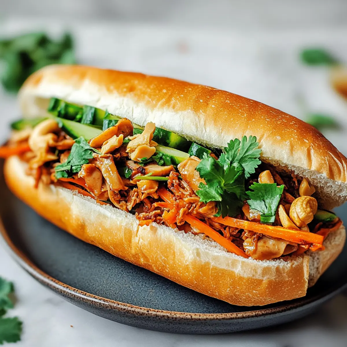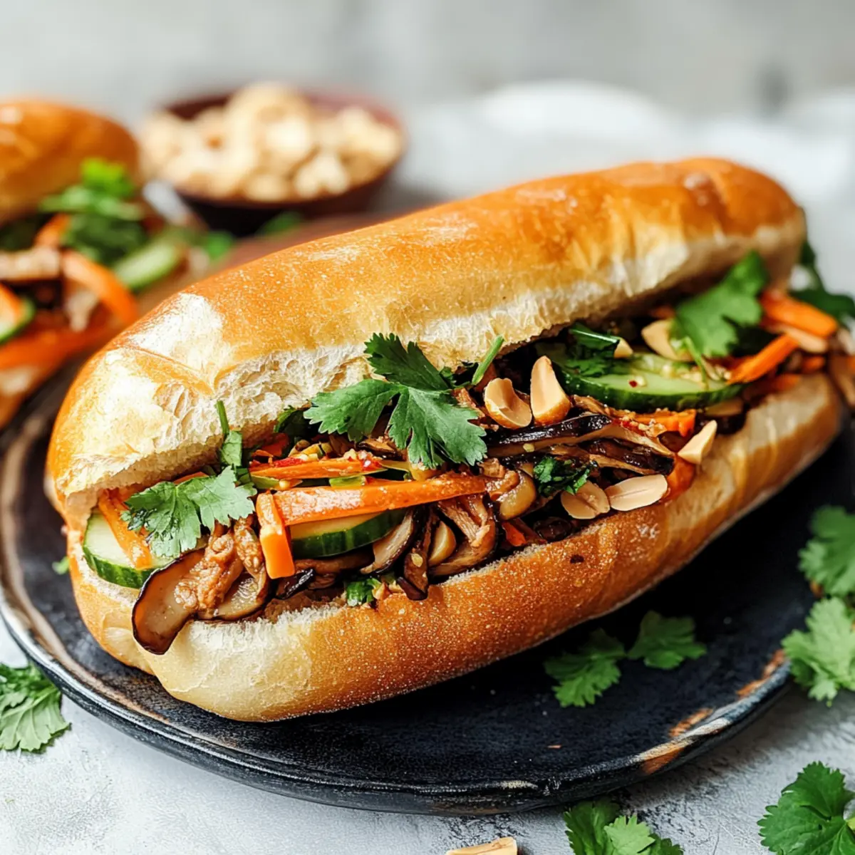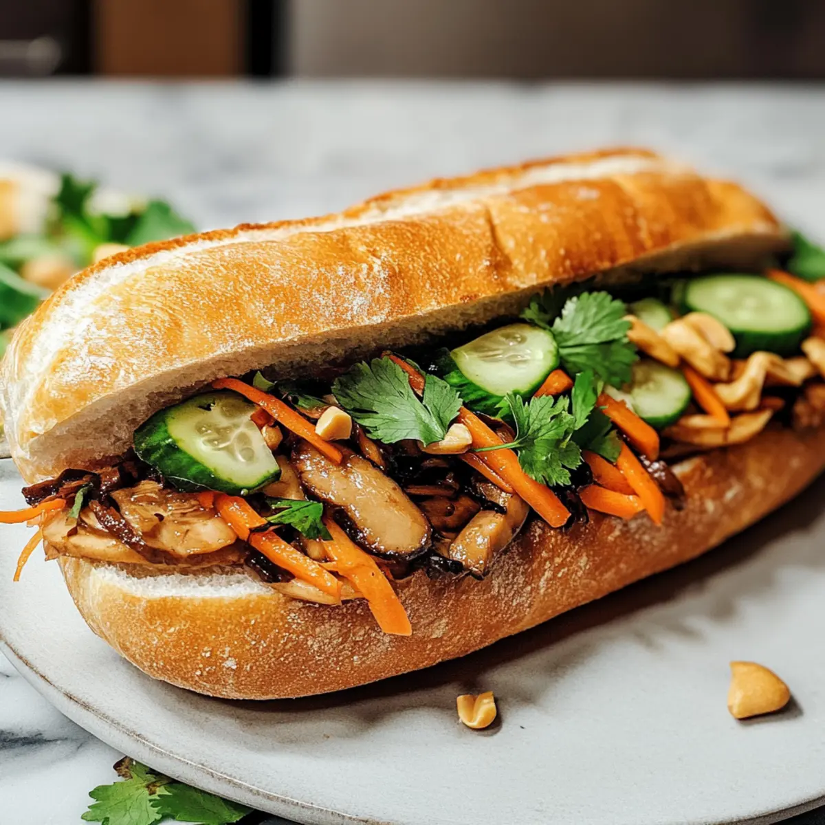 Es ist faszinierend, wie ein einfaches Baguette in der asiatischen Küche zu einem Geschmackserlebnis werden kann. Die Vietnamreise meines Freundes brachte mir nicht nur leckere Souvenirs, sondern auch das Rezept für das unbestrittene Highlight: das leckere, vegane Gezogene Pilz Banh Mi. Diese schnell zubereitete Speise ist nicht nur eine wahre Gaumenfreude, sondern zeigt auch die köstliche Vielseitigkeit von king oyster Pilzen, die in diesem Rezept mit einer aromatischen Fünf-Gewürze-Soße verfeinert werden. Ergänzt mit knackigen, eingelegten Möhren und cremiger veganer Mayo wird jedes Banh Mi zu einem kleinen Fest der Aromen. Perfekt für ein schnelles Abendessen oder als herzhafter Snack – es gibt kaum etwas Befriedigenderes! Bist du bereit, die Geheimnisse dieses leckeren Rezepts zu entdecken? Warum ist dieses Rezept einzigartig? Vielfalt: Dieses Gezogene Pilz Banh Mi vereint die Aromen der vietnamesischen Küche mit der Vielseitigkeit von veganen Zutaten. Schnelligkeit: Die Zubereitung benötigt nur wenige Schritte und ist ideal für geschäftige Tage. Texturen: Der Kontrast zwischen der knusprigen Kruste des Baguettes und den zarten, gewürzten Pilzen macht jeden Biss zu einem Genuss. Gesundheit: Dieses Gericht ist nicht nur köstlich, sondern auch nährstoffreich und perfekt für Veganer. Genuss für alle: Egal ob für dich allein oder zum Teilen – dieses Banh Mi zaubert jedem ein Lächeln ins Gesicht! Probiere es aus und erlebe die vielfältigen Möglichkeiten, die veganes Essen bietet. Zutaten für Gezogene Pilz Banh Mi • Entdecke die unerlässlichen Zutaten für ein köstliches, veganes Banh Mi! Für die Pilze King Oyster Pilze – bieten eine fleischige Textur und intensiven Umami-Geschmack; verwende große Exemplare für die besten Ergebnisse. Sojasauce – verleiht Tiefe und Würze; Tamari ist eine glutenfreie Alternative. Zucker – balanciert die Aromen in der Marinade; kannst es auch mit Kokoszucker ersetzen. Knoblauch & Schalotte – intensivieren den Gesamtgeschmack; fein zerhackt für beste Integration. Fünf-Gewürze-Pulver – bringt aromatische Noten; ersetze es bei Bedarf mit einer Mischung aus Zimt, Sternanis und Nelken. Für das Einlegen Karotten – sorgen für Knusprigkeit und Säure; eine traditionelle Variante ist das Ersetzen durch Daikon-Rettich. Essig – gibt dem Einlegeprozess die nötige Säure; wähle zwischen Reis- oder Apfelessig. Für die Beigaben Vegane Mayo – sorgt für Cremigkeit; kann durch jede bevorzugte pflanzliche Aufstrichvariante ersetzt werden. Gurke – bringt Frische; dünn geschnittene Schlangengurken sind ideal. Frischer Koriander und Salat – bringen zusätzliche Frische und Texturen; sehr empfehlenswert! Geröstete Erdnüsse – zum Garnieren, geben Knusprigkeit und Nussigkeit. Für das Baguette Baguette – dient als Basis und sollte knusprig und frisch sein; idealerweise frisch aus der Bäckerei oder selbstgemacht. Schritt-für-Schritt-Anleitung für Gezogene Pilz Banh Mi Step 1: Karotten einlegen Vermenge in einer Schüssel 4 Esslöffel Zucker, 1 Teelöffel Salz, 120 ml Wasser und 120 ml Essig, bis sich der Zucker aufgelöst hat. Füge die fein geraspelten Karotten hinzu und lasse sie mindestens 1 Stunde im Kühlschrank ziehen, idealerweise über Nacht, um den perfekten Crunch und die säuerliche Note zu erzielen. Step 2: Pilze vorbereiten Heize den Ofen auf 175°C vor. Reinige die King Oyster Pilze gründlich unter fließendem Wasser. Zerteile sie anschließend der Länge nach und reibe sie in dünne Streifen, um eine optimal fleischige Textur für dein Gezogene Pilz Banh Mi zu erhalten. Step 3: Pilze backen Gib die zerkleinerten Pilze in eine Schüssel und beträufle sie mit 1 Esslöffel Pflanzenöl. Mische gut, sodass alle Stücke gleichmäßig überzogen sind, und verteile sie dann auf einem Backblech. Backe die Pilze etwa 20 Minuten lang, bis sie leicht getrocknet und goldbraun sind. Step 4: Pilze würzen Nimm die Pilze aus dem Ofen und gib sie in eine Pfanne. Füge 2 Esslöffel Sojasauce, 1 Teelöffel Zucker, 1 gehackte Knoblauchzehe, 1 gehackte Schalotte sowie 1 Teelöffel Fünf-Gewürze-Pulver hinzu. Brate alles bei mittlerer Hitze für 5-7 Minuten, bis fast alle Flüssigkeit verdampft ist und die Aromen intensiv werden. Step 5: Banh Mi zusammenstellen Halbiere frische Baguettes und bestreiche jede Seite großzügig mit veganer Mayo. Belege die Unterseite mit frischen Salatblättern und Koriander, gefolgt von den würzigen pulled King Oyster Pilzen, eingelegten Karotten und dünn geschnittenem Gurken. Streue geröstete Erdnüsse darüber und füge nach Belieben eine scharfe Sauce hinzu. Was passt gut zu Gezogenen Pilz Banh Mi? Ein köstliches Banh Mi braucht die perfekten Begleiter, um das Geschmackserlebnis zu vervollständigen. Lass dich von diesen harmonischen Kombinationen inspirieren! Cremiger Krautsalat: ergänzt die Textur und bietet einen frischen, knusprigen Kontrast zu den zarten Pilzen. Er ist einfach zuzubereiten und verleiht einen extra Crunch. Scharfe Sriracha-Sauce: bringt eine würzige Kick, perfekt um die Geschmacksnuancen des Banh Mi hervorzuheben. Ein paar Tropfen reichen aus, um die Aromen lebendig zu machen. Herbaler Eistee: ein erfrischendes Getränk, das den herzhaften Geschmack des Banh Mi ausgleicht. Die frischen Kräuter unterstützen die Aromen und sorgen für ein harmonisches Trinkerlebnis. Mango-Salat: aus reifer Mango, Limette und frischem Koriander, bietet eine süß-säuerliche Note, die die herzhaften Elemente des Banh Mi perfekt ergänzt. Er ist leicht und erfrischend. Geröstete Erdnüsse: als knuspriges Topping oder Snack dazu, geben extra Biss und Nussigkeit, die den Geschmack des Banh Mi unterstreicht. Kokosmilchreis: ein süßes Dessert, das einen schönen Abschluss nach dem herzhaften Banh Mi bietet. Die cremige Konsistenz und der milde Geschmack sind eine süße Verführung. Chili-Limetten-Nüsse: für einen herzhaften Snack zwischendurch, der die Würze und Frische 