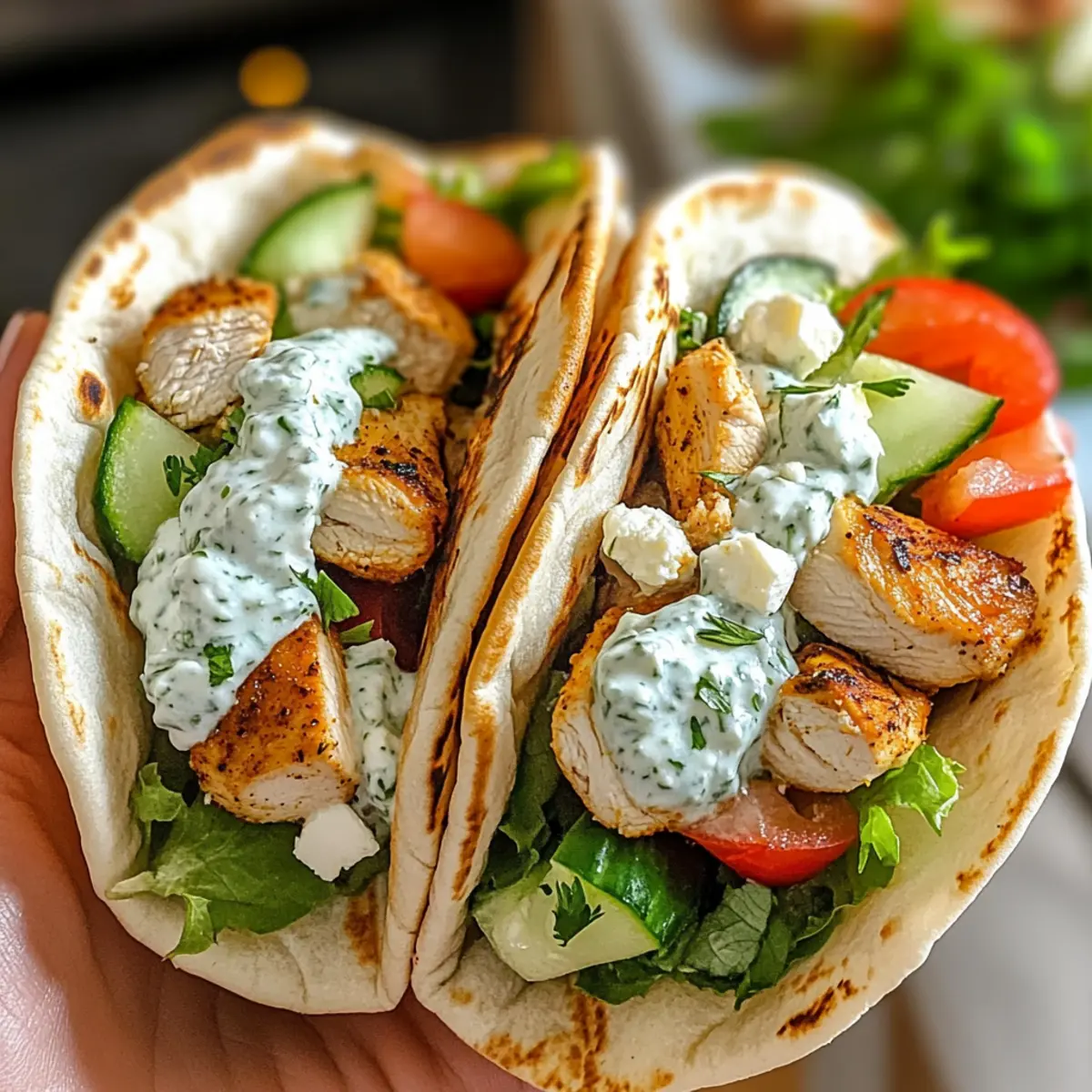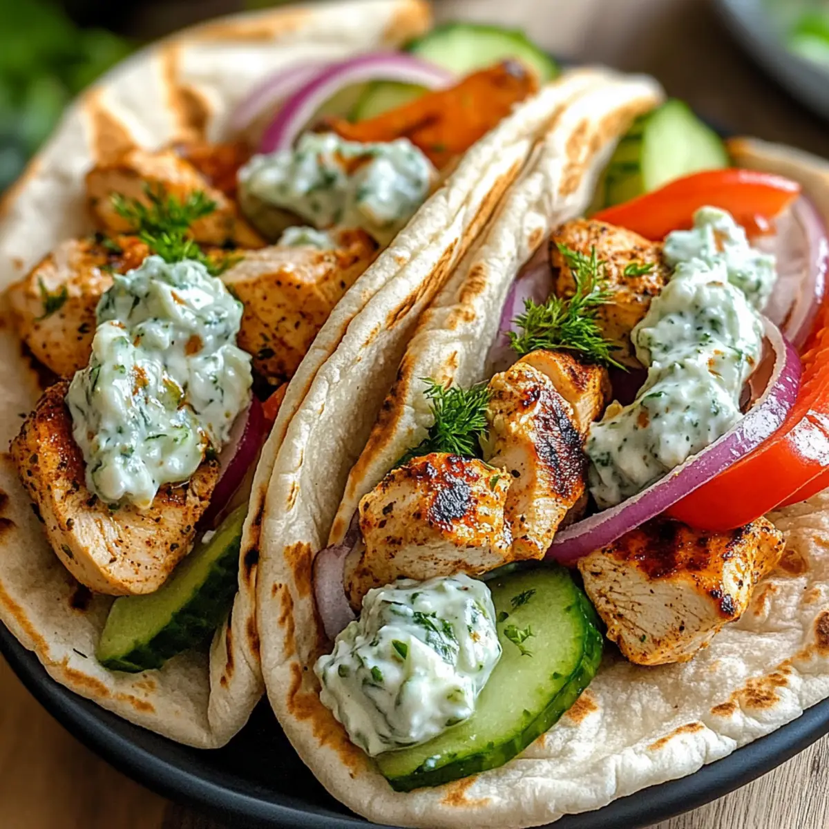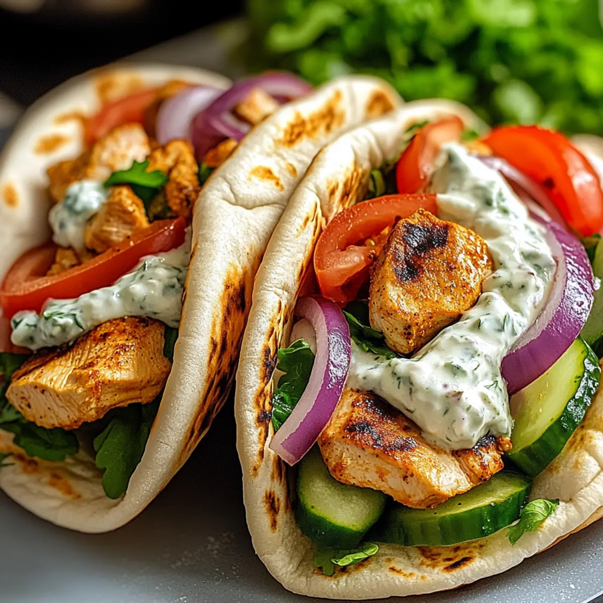 Stell dir vor, du sitzt in einem sonnigen Café an der Küste Griechenlands, während der Duft von frischem Brot und Gewürzen durch die Luft weht. Diese Vorstellung ist genau das, was du mit meinen Griechischen Hähnchen-Pitas mit Tzatziki & Feta auf den Tisch holen kannst! In nur 25 Minuten zauberst du eine gesunde, proteinreiche Mahlzeit, die selbst den größten Fast Food-Liebhaber begeistert. Ob du sie für ein unkompliziertes Abendessen oder ein schnelles Mittagessen zubereitest, diese Pitas sind nicht nur schnell zubereitet, sondern bieten auch die Möglichkeit, sie ganz nach deinem Geschmack anzupassen – von vegetarischen Varianten bis hin zu würzigeren Versionen. Bist du bereit, deinen Gaumen auf eine mediterrane Reise zu schicken? Warum sind diese Pitas so beliebt? Schnelligkeit: In nur 25 Minuten hast du ein köstliches Gericht auf dem Tisch, perfekt für hektische Tage. Vielseitigkeit: Du kannst die Pitas leicht anpassen, sei es mit würzigen Chili oder frischem Gemüse, um deinen persönlichen Geschmack zu treffen. Gesundheit: Die Kombination aus proteinreicher Hähnchenbrust und cremigem Tzatziki sorgt für eine nahrhafte Mahlzeit, die dir Energie gibt. Frische Aromen: Die mediterranen Geschmäcker durch Gewürze und frisches Gemüse machen jedes Bissen zu einem Erlebnis. Fantasievolle Variationen: Probiere vegetarische Optionen mit Kichererbsen oder Gurken, um neue Geschmackserlebnisse zu entdecken. Familienfreundlich: Diese Pitas sind ein Hit bei Groß und Klein und eignen sich ideal für gesellige Abende oder Familienessen. Griechische Hähnchen-Pitas Zutaten • Diese Zutaten bilden die Grundlage für deine köstlichen Griechischen Hähnchen-Pitas mit Tzatziki & Feta! Für das Hähnchen Hähnchenbrust – sorgt für eine magere, proteinreiche Basis; easy to substitute with firm tofu for vegetarians. Für das Tzatziki Griechischer Joghurt – verleiht eine cremige Textur und einen säuerlichen Geschmack, der die Saucigkeit erhöht. Feta-Käse – bietet einen salzigen Reichtum; kann durch Ziegenkäse ersetzt werden, wenn du etwas anderes probieren möchtest. Gurke – fügt Frische und Crunch hinzu; alternativ kann geriebene Zucchini verwendet werden. Knoblauch – intensiviert den Geschmack; kann für eine mildere Sauce weggelassen werden. Für das Pita-Brot Pita-Brot – die perfekte Basis für die Füllung; Vollkornoptionen sind erhältlich für eine gesündere Wahl. Für die frischen Gemüse Frisches Gemüse (z.B. Salat, Tomate, Zwiebel) – erhöht den Crunch und den Nährwert; wähle saisonale Gemüse für den besten Geschmack. Mit diesen Zutaten bist du bereit, ein schnelles und gesundes Gericht zu zaubern, das nicht nur den Gaumen erfreut, sondern auch mit Freunden und Familie geteilt werden kann! Schritt-für-Schritt-Anleitung für Griechische Hähnchen-Pitas mit Tzatziki & Feta Step 1: Hähnchen vorbereiten Schneide die Hähnchenbrust in gleichmäßige Stücke, so dass sie gleichmäßig garen. Erhitze eine beschichtete Pfanne bei mittlerer Hitze und füge einen Esslöffel Olivenöl hinzu. Brate das Hähnchen für etwa 5-7 Minuten pro Seite, bis es goldbraun ist und eine Innentemperatur von 75°C (165°F) erreicht. Das Hähnchen sollte außen knusprig und innen saftig sein. Step 2: Tzatziki zubereiten In einer Schüssel vermischst du griechischen Joghurt, zerbröckelten Feta, geriebene Gurke und fein gehackten Knoblauch. Füge eine Prise Salz und Pfeffer hinzu, um den Geschmack zu verstärken, und rühre alles gründlich um, bis die Zutaten gut verbunden sind. Lass das Tzatziki für mindestens 15 Minuten im Kühlschrank, damit die Aromen sich entfalten können. Step 3: Pita erwärmen Während das Tzatziki zieht, wärmst du die Pita-Brote. Du kannst sie entweder in einer trockenen Pfanne bei mittlerer Hitze etwa 1-2 Minuten pro Seite rösten oder im Toaster auf mittlerer Stufe leicht toasten. Die Pita sollte warm und weich sein, perfekt für die Füllung der Griechischen Hähnchen-Pitas. Step 4: Pitas befüllen Sobald das Hähnchen gar und das Tzatziki vorbereitet ist, schneide die warmen Pitas auf und lege sie auf einen Teller. Fülle jede Pita großzügig mit den geschnittenen Hähnchenstücken. Toppe sie mit einer großzügigen Portion Tzatziki und füge frisches Gemüse wie Salat, Tomaten und Zwiebeln hinzu, um zusätzliches Crunch und Frische zu verleihen. Step 5: Servieren Serviere die Griechischen Hähnchen-Pitas sofort, solange sie warm sind. Du kannst optional einen Spritzer Olivenöl über die gefüllten Pitas träufeln, um den Geschmack zu intensivieren. Genieße dieses köstliche, gesunde Gericht in geselliger Runde oder als schnelles Mittagessen! Tipps für die besten Griechischen Hähnchen-Pitas Hähnchen gleichmäßig schneiden: Achte darauf, die Hähnchenbrust in gleichmäßige Stücke zu schneiden, damit sie gleichmäßig garen und schön saftig bleiben. Tzatziki im Voraus machen: Bereite das Tzatziki mindestens 15 Minuten vorher zu, damit die Aromen der Griechischen Hähnchen-Pitas richtig zur Geltung kommen. Pfanne für optimale Bräunung: Verwende eine schwere Pfanne, um das Hähnchen zu braten, damit es schön bräunt und die Säfte sich gut halten. Warmes Pita-Brot: Erwärme die Pitas direkt vor dem Befüllen, damit sie weich bleiben und nicht reißen, wenn du sie füllst. Frisches Gemüse wählen: Nutze saisonales Gemüse für die Füllung, um den Geschmack deiner Griechischen Hähnchen-Pitas noch zu verbessern. Was passt zu Griechischen Hähnchen-Pitas mit Tzatziki & Feta? Erlebe die perfekte Kombination von Aromen und Texturen, die deine Mahlzeit zu einem unvergesslichen Genuss machen. Griechischer Salat: Frische Tomaten, Gurken und Oliven ergänzen die würzigen Aromen der Pitas wunderbar. Dieser Salat bringt nicht nur Farbe, sondern auch knusprige Frische auf deinen Teller. Gegrilltes Gemüse: Zucchini und Paprika, leicht gewürzt und gegrillt, bieten ein rauchiges Aroma, das hervorragend mit der cremigen Tzatziki harmoniert. Diese K