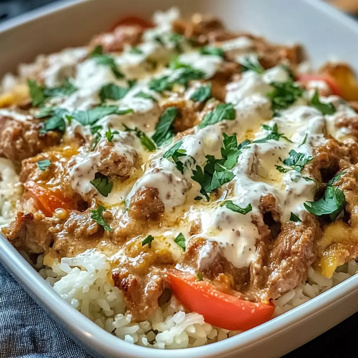 Genieße die Aromen von Gyrosstreifen in cremiger Schmandsoße, serviert mit Reis – ein perfektes Gericht für hektische Abende.