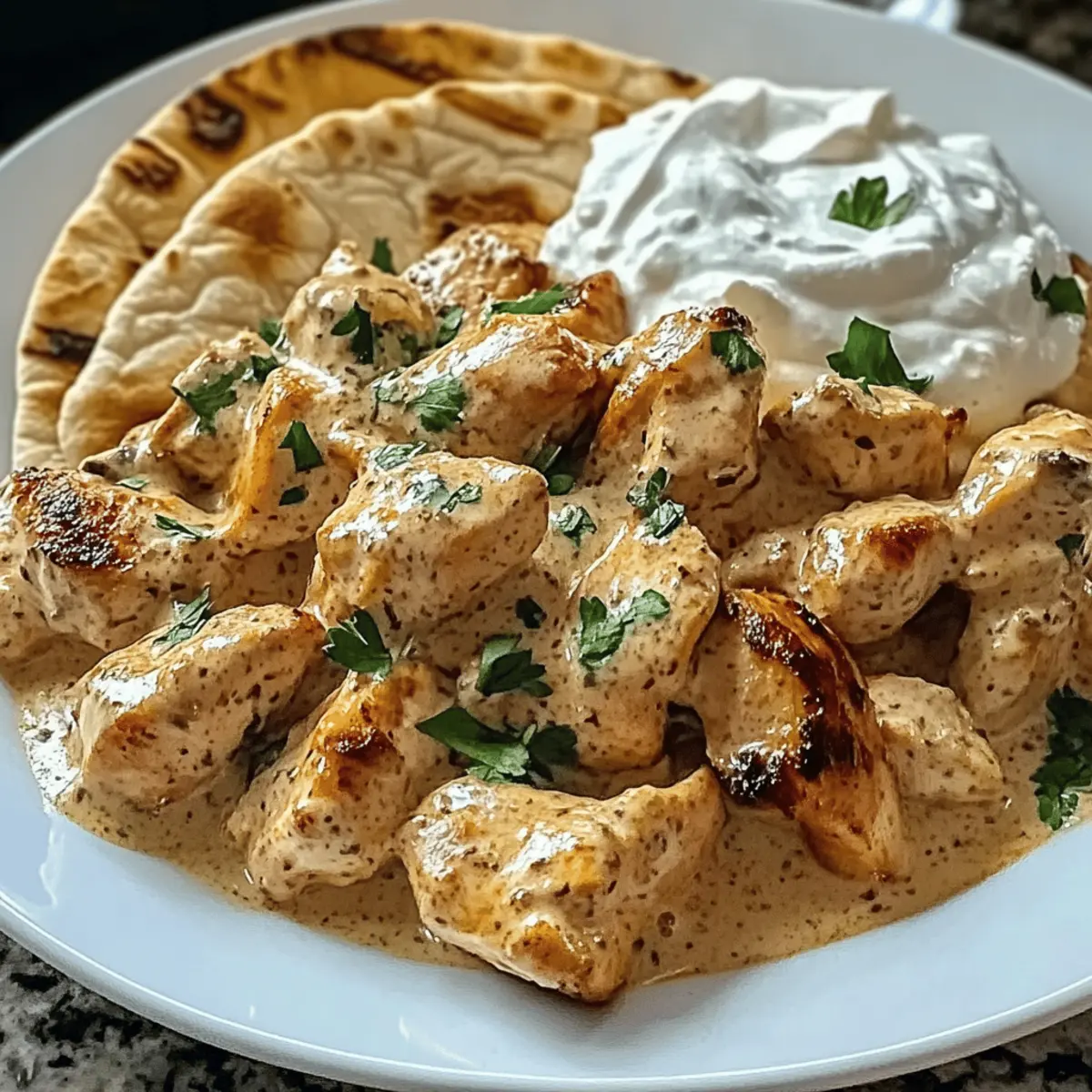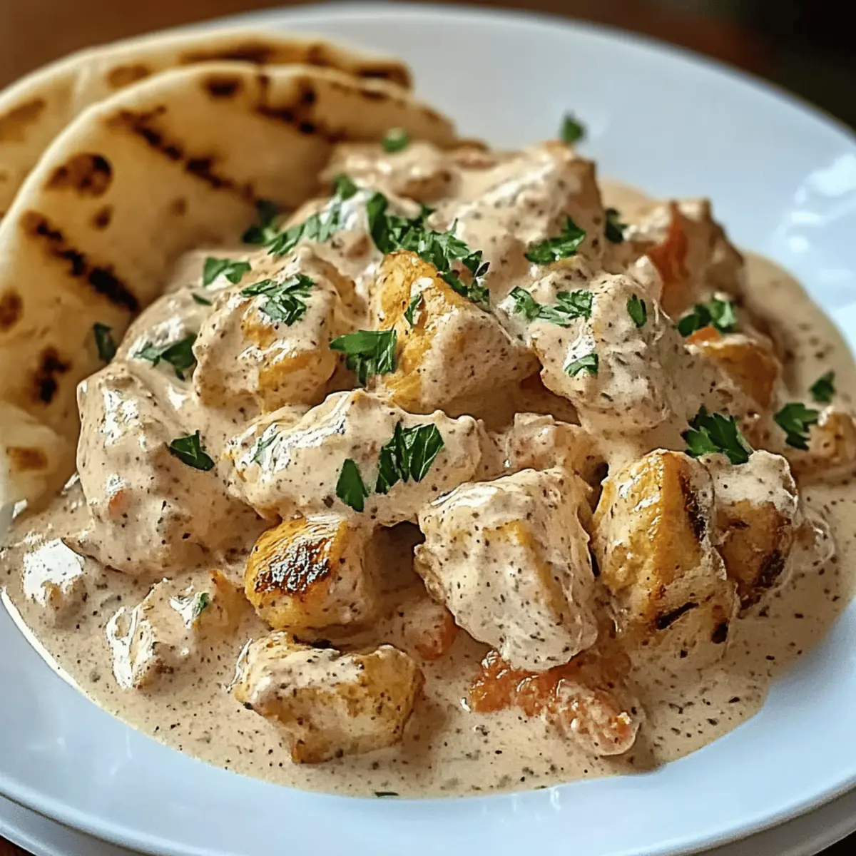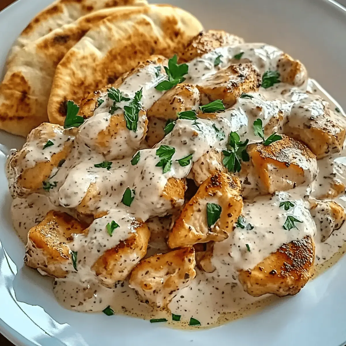 „Könnte ich mal bitte einen Hauch von Sommer haben?“ fragte mein Freund, während wir in der winterlichen Kälte saßen. Diese Hähnchengyros in Schmandsoße haben uns die Antwort gegeben! Mit saftigen Hähnchenstreifen, die in einer aromatischen Gewürzmischung mariniert und in einer cremigen Schmandsoße gebettet sind, ist dieses Rezept nicht nur ein wahrer Gaumenschmaus, sondern auch der perfekte Kompromiss für eine schnelle und einfache Abendmahlzeit. In nur 40 Minuten zaubern Sie ein Gericht, das die ganze Familie begeistert – ideal für stressige Wochentage! Wenn Sie also auf der Suche nach herzhaftem Soulfood sind, das trotzdem leicht zuzubereiten ist, dann scrollen Sie weiter und entdecken Sie, wie Sie sich diese köstliche Reise direkt in Ihre Küche bringen können. Warum lieben Sie Hähnchengyros in Schmandsoße? Köstliche Einfachheit: Mit nur wenigen Zutaten gelingt dieses Gericht schnell und problemlos – perfekt für alle, die keine Zeit für aufwendige Kochprojekte haben. Vielseitigkeit: Passen Sie das Rezept an, indem Sie Gemüse wie Paprika oder Zucchini hinzufügen, um noch mehr Farbe und Geschmack zu bekommen. Familienfreundlich: Dieses Gericht kommt bei Groß und Klein gleichermaßen gut an und sorgt für strahlende Gesichter am Esstisch. Herzhafter Genuss: Die Kombination aus zartem Hähnchen und cremiger Schmandsoße schafft ein unvergessliches Geschmackserlebnis, das an warme Sommertage erinnert. Wenn Sie noch mehr leckere Ideen brauchen, werfen Sie einen Blick auf unsere schnellen Abendessen. Tragbarer Komfort: Ideal zum Servieren mit Pita-Brot oder Reis, sodass jeder nach Herzenslust schlemmen kann. Hähnchengyros in Schmandsoße Zutaten Wichtig: Diese Zutaten sind die Basis für ein köstliches und schnelles Gericht, das Ihrer Familie sicherlich schmecken wird! Hähnchenbrustfilet – Hauptprotein, zart und fettarm; für mehr Geschmack auch Hähnchenschenkel verwenden. Gyrosgewürz – Aromatische Gewürzmischung, die das authentische Gyros-Aroma verleiht; nach Geschmack anpassen. Olivenöl – Für Marinade und zum Braten, bringt zusätzlichen Reichtum; alternativ kann auch Pflanzenöl verwendet werden. Schmand – Cremige Basis für die Sauce; kann durch Sauerrahm oder griechischen Joghurt ersetzt werden, wenn gewünscht. Zwiebel – Sorgt für Süße und tiefen Geschmack beim Anbraten; alternativ kann auch Schalotte verwendet werden. Knoblauch – Verstärkt das Geschmackserlebnis; für eine bessere Integration fein hacken oder Knoblauchpulver verwenden. Zitronensaft – Fügt Säure hinzu und belebt das Gericht; kann bei Bedarf durch weißen Essig ersetzt werden. Salz und Pfeffer – Essenziell zur Würzung; nach Belieben anpassen. Paprikapulver – Bringt Farbe und erdigen Geschmack; für mehr Tiefe kann auch geräuchertes Paprikapulver verwendet werden. Frische Petersilie (optional) – Garnierung für Frische und Farbe; kann weggelassen werden, falls nicht vorhanden. Pita-Brot oder Reis – Empfohlene Beilagen, ideal zum Servieren für ein vollständiges Essen. Schritt-für-Schritt-Anleitung für Hähnchengyros in Schmandsoße Schritt 1: Hähnchen vorbereiten Zuerst schneiden Sie das Hähnchenbrustfilet in dünne, gleichmäßige Streifen. Dies sorgt dafür, dass die Hähnchenstücke gleichmäßig garen und schön zart werden. Nutzen Sie ein scharfes Küchenmesser und einen stabilen Schneidebrett. Achten Sie darauf, die Stücke nicht dicker als 1 cm zu schneiden. Schritt 2: Marinade zubereiten In einer Schüssel vermengen Sie das Olivenöl, Gyrosgewürz, Paprikapulver, Zitronensaft sowie Salz und Pfeffer. Rühren Sie alles gut durch, bis eine homogene Marinade entsteht. Geben Sie die geschnittenen Hähnchenstreifen in die Schüssel und stellen Sie sicher, dass diese gut mit der Marinade bedeckt sind. Lassen Sie das Ganze mindestens 15 Minuten ziehen, um den Geschmack zu intensivieren. Schritt 3: Zwiebel und Knoblauch anbraten Während das Hähnchen mariniert, hacken Sie die Zwiebel und den Knoblauch fein. Erhitzen Sie in einer großen Pfanne etwas Olivenöl bei mittlerer Hitze. Fügen Sie die Zwiebel und den Knoblauch hinzu und braten Sie diese für etwa 3–4 Minuten, bis sie weich und leicht goldbraun sind. Achten Sie darauf, dass der Knoblauch nicht verbrennt, da er bitter werden könnte. Schritt 4: Hähnchen anbraten Jetzt können Sie die marinierten Hähnchenstreifen in die Pfanne geben. Kochen Sie das Hähnchen bei mittlerer Hitze für etwa 8–10 Minuten, gelegentlich umrühren, bis sie goldbraun und vollständig durchgegart sind. Die äußere Oberfläche sollte schön knusprig sein, während das Innere zart bleibt. Schritt 5: Schmandsoße zubereiten Für die Schmandsoße mischen Sie in einer separaten Schüssel den Schmand, Zitronensaft, Salz und Pfeffer gut durch. Falls gewünscht, können Sie auch gehackte Petersilie unterrühren, um der Soße mehr Frische zu geben. Halten Sie die Schmandsoße bereit, während das Hähnchen gart. Schritt 6: Hähnchen mit der Soße kombinieren Sobald das Hähnchen fertig ist, nehmen Sie die Pfanne vom Herd und geben Sie die Schmandsoße zum Hähnchen. Rühren Sie vorsichtig um, bis alles gut vermischt ist. Erhitzen Sie die Mischung bei schwacher Hitze für ein paar Minuten, ohne sie zum Kochen zu bringen, um ein Gerinnen zu vermeiden. Schritt 7: Anrichten und servieren Nun können Sie die Hähnchengyros auf Teller anrichten. Garnieren Sie optional mit frischer Petersilie für extra Farbe und Geschmack. Servieren Sie die Hähnchengyros in Schmandsoße zusammen mit Pita-Brot oder Reis für ein vollständiges, herzhaftes Gericht, das die ganze Familie begeistern wird. Aufbewahrungstipps für Hähnchengyros in Schmandsoße Kühlschrank: Bewahren Sie die Reste in einem luftdichten Behälter im Kühlschrank auf, wo sie bis zu 3 Tage frisch bleiben. Freezer: Für längere Aufbewahrung können Sie die Hähnchengyros in Schmandsoße portionsweise in Gefrierbehältern einfrieren. Sie sind bis zu 3 Monate haltbar. 