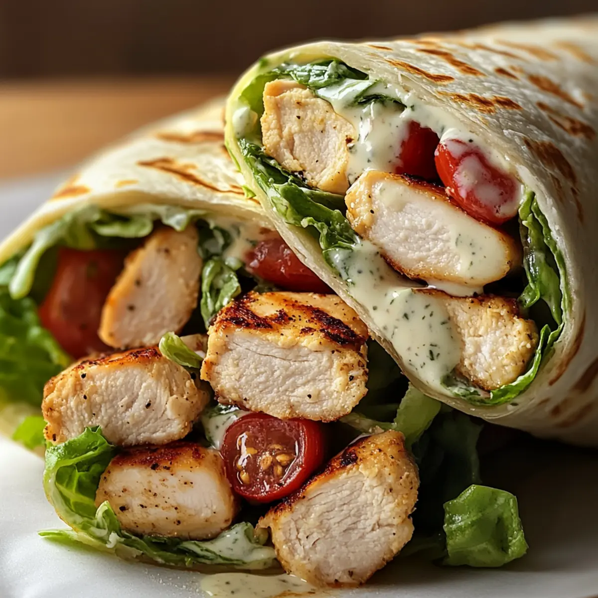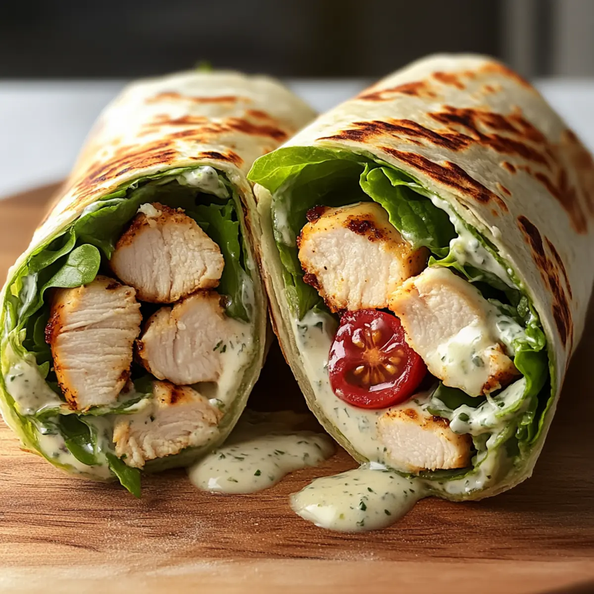 Es war ein sonniger Nachmittag, und ich hatte einfach Lust auf etwas Frisches und leichtes, aber trotzdem herzhaftes. Plötzlich kam die Idee: Hausgemachte Hähnchen-Caesar-Wraps! Diese köstliche Kombination aus zart gegrilltem Hähnchen, knackigem Römersalat und einer erfrischenden griechischen Joghurt-Dressing ist perfekt für ein schnelles Mittagessen oder ein entspanntes Abendessen. Der Clou? Sie sind nicht nur unglaublich einfach zuzubereiten, sondern auch eine gesunde Alternative zur klassischen Variante – ganz ohne Mayo. Durch die Verwendung frischer Zutaten und proteinreicher Hähnchenstücke wird jede Biss zu einem kleinen Genussmoment. Neugierig, wie ihr diese schnellen Wraps selbst zubereiten könnt? Lasst uns gemeinsam in die Küche starten! Warum sind diese Wraps so besonders? Einfachheit, die begeistert: Mit nur wenigen Zutaten und in nur wenigen Schritten verwandelt ihr frische Lebensmittel in ein köstliches Gericht. Gesund und nahrhaft: Diese Hähnchen-Caesar-Wraps sind reich an Protein dank des gegrillten Hähnchens und enthalten kein Mayo – perfekt für gesundheitsbewusste Feinschmecker! Variationsvielfalt: Ob mit knusprigen Chicken Tenders oder zartem Rotisserie-Hähnchen, ihr könnt nach Belieben anpassen! Perfekte Textur: Der knackige Römersalat und die crunchy Croutons sorgen für ein tolles Mundgefühl. Zeitsparend: Ideal für ein schnelles Mittagessen oder ein unkompliziertes Abendessen – diese Wraps sind im Handumdrehen fertig! Crowd-Pleaser: Egal ob bei Freunden oder Familie, diese Wraps kommen immer gut an und sind ein Hit auf jeder Zusammenkunft. Probiert dazu doch mal eine leckere frische Obstsalat als Beilage aus! Hausgemachte Hähnchen-Caesar-Wraps Zutaten • Um eure Neugier zu wecken, hier sind die notwendigen Zutaten für diese köstlichen Wraps! Für die Füllung Gekochtes Hähnchen – sorgt für reichlich Protein; ihr könnt auch zartes Rotisserie-Hähnchen oder knusprige Chicken Tenders verwenden. Römersalat – bringt frischen Crunch; achtet darauf, dass er knackig und trocken ist, oder benutzt Butterkopfsalat für eine weichere Textur. Cherrytomaten – bieten eine süße und säuerliche Note; halbiert für einfaches Mischen oder durch gewürfelte Gurken ersetzen für einen anderen Geschmack. Parmesankäse – verleiht eine herzhafte Tiefe; frisch geriebener Käse sorgt für den besten Geschmack. Croutons – tragen zur Knusprigkeit bei; stellt sicher, dass sie frisch sind, oder macht sie selbst für das beste Erlebnis. Caesar-Dressing – unverzichtbar für den Geschmack; die hausgemachte griechische Joghurt-Dressing macht es leichter und gesünder, während gekauftes Dressing weniger empfohlen wird. Mehltortillas – dienen als Wrap-Basis; ihr könnt sie auch durch Vollkorn- oder glutenfreie Tortillas ersetzen, je nach Vorliebe. Hiermit steht eurer kulinarischen Reise zu den hausgemachten Hähnchen-Caesar-Wraps nichts mehr im Weg! Schritt-für-Schritt-Anleitung für Hausgemachte Hähnchen-Caesar-Wraps Schritt 1: Zutaten mischen In einer großen Schüssel die gekochten Hähnchenstücke, den knackigen Römersalat, die halbierten Cherrytomaten, den frisch geriebenen Parmesan und die Croutons sorgfältig vermengen. Achten Sie darauf, dass alles gut verteilt ist, damit jede Zutat gleichmäßig zur Geltung kommt. Dies sollte etwa 5 Minuten dauern, um sicherzustellen, dass die gewünschten Texturen und Farben vereint sind. Schritt 2: Dressing hinzufügen Geben Sie nun das hausgemachte griechische Joghurt-Caesar-Dressing zu den Zutaten in der Schüssel. Mit einem großen Löffel oder einer Zange alles gründlich vermengen, bis die Mischung gleichmäßig mit dem Dressing überzogen ist. Dies sorgt für eine köstliche und cremige Textur, die die Aromen perfekt miteinander verbindet. Dieser Schritt sollte etwa 3 Minuten in Anspruch nehmen. Schritt 3: Tortilla vorbereiten Nehmen Sie eine Mehltortilla und legen Sie sie flach auf ein sauberes Schneidebrett oder eine Arbeitsplatte. Beginnen Sie, die Füllung in einer langen Linie in der Mitte der Tortilla anzurichten, wobei an den Seiten ausreichend Platz für das Falten bleibt. Dies erleichtert das Rollen und sorgt dafür, dass der Wrap gut gefüllt ist, ohne zu überquellen. Dieser Schritt dauert nur eine Minute. Schritt 4: Wrap rollen Falten Sie nun die beiden Seiten der Tortilla über die Füllung, um die mittleren Zutaten zu umschließen. Beginnen Sie an der Unterseite und rollen Sie die Tortilla straff nach oben zu einem kompakten Wrap. Achten Sie darauf, dass die Füllung gut eingeklemmt bleibt. Dies sollte nicht länger als 2 Minuten in Anspruch nehmen, damit die Tortilla frisch bleibt. Schritt 5: Optional sichern und servieren Falls nötig, stecken Sie einen oder zwei Zahnstochern in den Wrap, um ihn an Ort und Stelle zu halten. Schneiden Sie den Wrap diagonal in zwei Hälften für eine ansprechende Präsentation. Die hausgemachten Hähnchen-Caesar-Wraps sind nun bereit, serviert zu werden! Genießen Sie sie sofort, um die Frische und den Crunch zu bewahren. Meal Prep für Hausgemachte Hähnchen-Caesar-Wraps Diese Hausgemachten Hähnchen-Caesar-Wraps sind ideal für die Essensvorbereitung und helfen euch, Zeit in einer geschäftigen Woche zu sparen! Ihr könnt die meisten Komponenten bis 3 Tage im Voraus vorbereiten. Kocht das Hähnchen und mischt es mit dem gewaschenen Römersalat und den Cherrytomaten. Bewahrt diese Mischung in einem luftdichten Behälter im Kühlschrank auf. Das Dressing kann ebenfalls bis zu 24 Stunden im Voraus zubereitet und separat aufbewahrt werden, um ein Durchweichen der Zutaten zu verhindern. Wenn es Zeit zum Servieren ist, rollen ihr die vorgefertigte Mischung einfach in die Tortillas und genießt die frischen, knusprigen Wraps, die genauso köstlich sind wie frisch zubereitet! Was passt zu Hausgemachten Hähnchen-Caesar-Wraps? Genießen Sie den perfekten Begleiter zu diesen köstlichen Wraps, der Ihre Mahlzeit noch aufregender macht. Frischer Obstsalat: Die sü