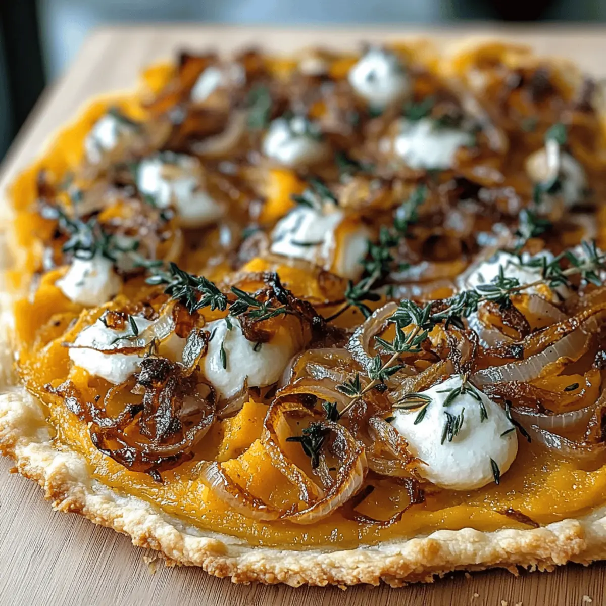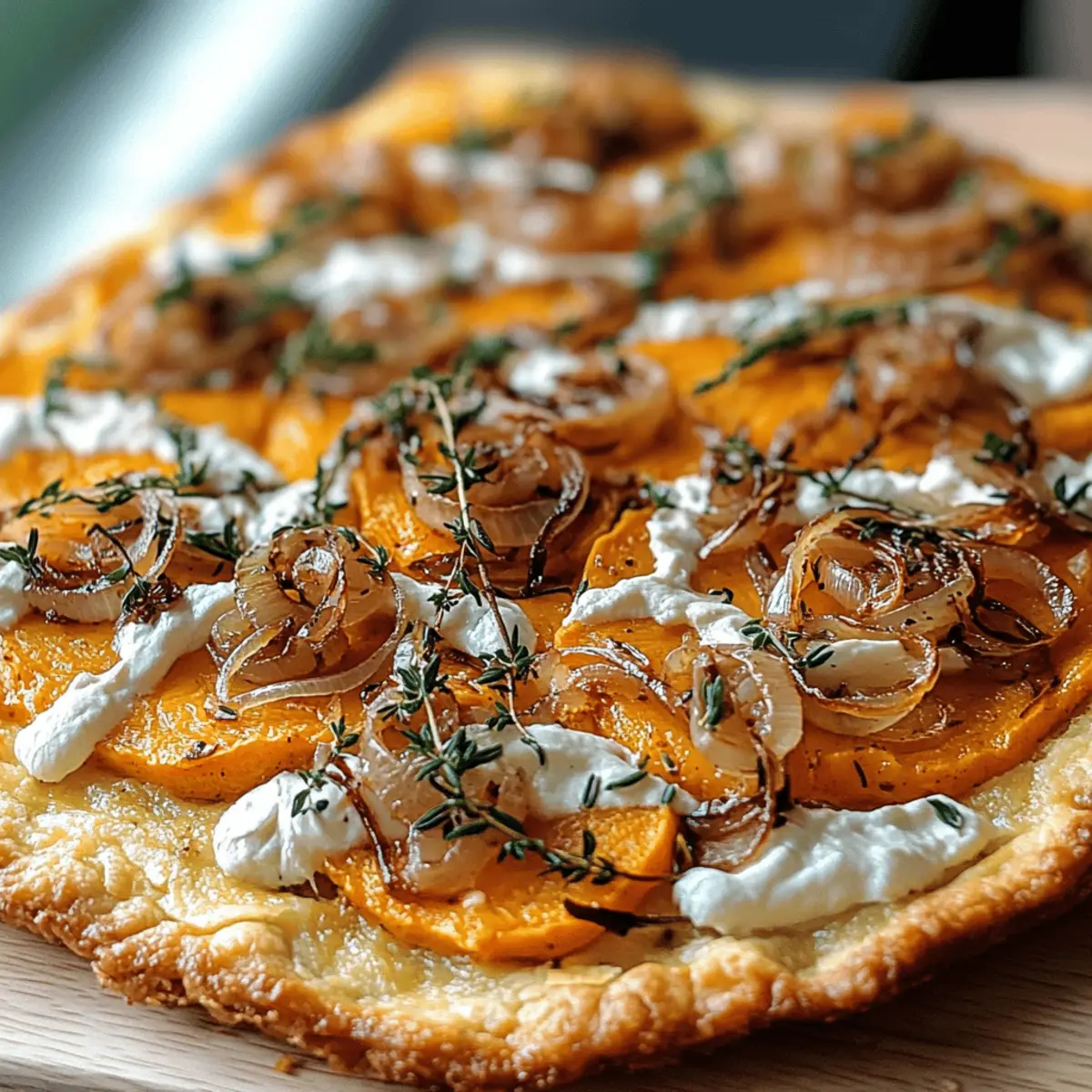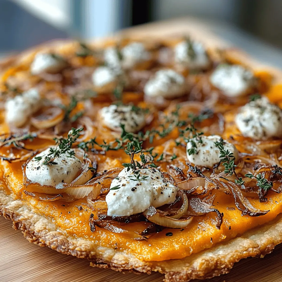 Das Geräusch der knusprigen Teigkruste, die in den heißen Ofen gleitet, lässt mich sofort in die Gemütlichkeit des Herbstes eintauchen. Mein Rezept für den herbstlichen Kürbis-Flammkuchen ist nicht nur eine Feier der Saison, sondern auch eine wahre Freude für die Seele. Mit einer zarten, knusprigen Basis, die mit samtigem Kürbispüree und süßen, karamellisierten Zwiebeln belegt ist, wird dieses Gericht zum Highlight jeder Zusammenkunft. Egal, ob du ein schnelles Abendessen für die Familie oder ein beeindruckendes Fingerfood für deine Freunde zaubern möchtest – dieses Rezept bietet dir die perfekte Lösung. Und das Beste: Es ist vegetarisch, lässt sich leicht vegan und glutenfrei abwandeln. Bist du bereit, dein Küchenabenteuer zu beginnen? Warum wirst du diesen Flammkuchen lieben? Einfachheit: Die Zubereitung dieses herbstlichen Kürbis-Flammkuchens ist schnell und unkompliziert, ideal für Kochliebhaber jeden Niveaus. Herzhafter Geschmack: Die Kombination aus süßen, karamellisierten Zwiebeln und cremigem Kürbispüree sorgt für einen geschmacklichen Hochgenuss. Vielseitigkeit: Ob als Hauptgericht oder schmackhafte Vorspeise, du kannst die Zutaten nach Belieben anpassen, um deine Gäste zu begeistern. Saisonale Frische: Mit frischen Zutaten der Herbsternte wird dieser Flammkuchen zum perfekten Begleiter für deine herbstlichen Gatherings. Entdecke auch unsere Variationen für vegane und glutenfreie Optionen! Küchenlust: Lass dich von diesem Rezept inspirieren und bringe den Hauch des Herbstes direkt auf deinen Tisch – ein Genuss, den man nicht verpassen sollte! Herbstlicher Kürbis-Flammkuchen Zutaten • Für die Teigbasis: Weizenmehl (Typ 405) – Serviert als Hauptbestandteil des Teiges; kann durch eine glutenfreie Mehlmischung ersetzt werden. Salz – Verstärkt den Geschmack des Teiges; keine Alternativen nötig. Olivenöl – Sorgt für Feuchtigkeit und Reichtum im Teig; kann durch geschmolzenes Kokosöl für die vegane Variante ersetzt werden. Lauwarmes Wasser – Aktiviert den Teig; darauf achten, dass das Wasser warm, aber nicht heiß ist. • Für den Belag: Kürbispüree – Hauptgeschmacksträger und sorgt für eine cremige Textur; sowohl hausgemacht als auch aus der Dose geeignet. Crème fraîche – Fügt der Kürbisschicht Cremigkeit hinzu; für die vegane Option einfach pflanzliche Crème fraîche verwenden. Muskatnuss – Verleiht einen warmen, erdigen Geschmack; frisch gerieben ist bevorzugt, aber auch gemahlene ist akzeptabel. Zwiebeln (gelb) – Karamellisiert für Süße und Tiefe; rote Zwiebeln können für einen anderen Geschmack verwendet werden. Butter – Dient zum Karamellisieren der Zwiebeln; kann durch Olivenöl für die vegane Option ersetzt werden. Frische Thymianblätter – Fügt eine kräuterige Note hinzu; andere Kräuter wie Rosmarin können ebenfalls verwendet werden. Ziegenkäse (optional) – Sorgt für eine würzige Cremigkeit; für die vegane Variante weglassen oder durch veganen Feta ersetzen. Schwarzer Pfeffer – Verstärkt den Gesamtgeschmack; frisch gemahlen wird für den besten Geschmack empfohlen. Diese Zutaten sind die Grundlage, um den köstlichen herbstlichen Kürbis-Flammkuchen zu kreieren, der nicht nur lecker, sondern auch eine wunderbare Möglichkeit ist, die Aromen des Herbstes zu genießen. Schritt-für-Schritt-Anleitungen für den herbstlichen Kürbis-Flammkuchen Step 1: Ofen vorheizen Heize den Ofen auf 250°C (482°F) vor und stelle ein Backblech oder einen Pizzastein hinein, damit es heiß wird. So erhält der herbstliche Kürbis-Flammkuchen eine knusprige Unterlage. Dies dauert etwa 10 Minuten, während du den Rest der Zutaten vorbereitest. Step 2: Teig zubereiten Mische 250 g Weizenmehl und 1 Teelöffel Salz in einer Schüssel. Gib 2 Esslöffel Olivenöl und 150 ml lauwarmes Wasser hinzu. Knete den Teig mit den Händen, bis er glatt und elastisch ist. Der Teig sollte nicht klebrig sein. Lass ihn für 15 Minuten unter einem Tuch ruhen, sodass er entspannen kann. Step 3: Zwiebeln karamellisieren Erhitze in einer Pfanne 2 Esslöffel Butter bei mittlerer Hitze. Füge 2 in Ringe geschnittene Zwiebeln hinzu und brate diese für 15-20 Minuten, bis sie goldbraun und weich sind. Rühre gelegentlich um, damit sie gleichmäßig karamellisieren. Stelle die Zwiebeln danach beiseite. Step 4: Kürbisschicht vorbereiten In einer Schüssel vermischst du 200 g Kürbispüree mit 100 g Crème fraîche, einer Prise frisch geriebener Muskatnuss, Salz und schwarzem Pfeffer nach Geschmack. Rühre alles gut um, bis eine glatte Masse entsteht. Diese Kürbisschicht verleiht deinem Flammkuchen die cremige Basis. Step 5: Teig ausrollen Bestäube dein Arbeitsflächen leicht mit Mehl und rolle den Teig dünn aus, bis er eine rechteckige oder ovale Form hat, ca. 3-4 mm dick. Achte darauf, dass der Teig gleichmäßig ist, damit der herbstliche Kürbis-Flammkuchen gleichmäßig backt. Step 6: Flammkuchen zusammenstellen Lege den ausgerollten Teig auf ein mit Backpapier belegtes Blech. Verteile die Kürbisschicht gleichmäßig auf dem Teig, wobei du 1 cm Rand frei lässt. Belege den Flammkuchen dann mit den karamellisierten Zwiebeln, frischen Thymianblättern und optional crumbled Ziegenkäse. Step 7: Backen Schiebe den Flammkuchen in den vorgeheizten Ofen und backe ihn 12-15 Minuten lang, bis die Ränder schön knusprig und leicht goldbraun sind. Halte ein Auge darauf, um sicherzustellen, dass der Flammkuchen nicht zu dunkel wird. Step 8: Servieren Nehme den Flammkuchen aus dem Ofen und lasse ihn kurz abkühlen. Schneide ihn in Stücke und serviere ihn heiß für ein optimales Geschmackserlebnis. Genieße den aromatischen herbstlichen Kürbis-Flammkuchen als Hauptgericht oder köstliche Vorspeise. Einfaches Meal Prep für den herbstlichen Kürbis-Flammkuchen Du kannst diesen herbstlichen Kürbis-Flammkuchen perfekt im Voraus vorbereiten, ideal für stressfreie Abendessen an hektischen Wochentagen! Der Teig lässt sich bis zu 24 Stunden i