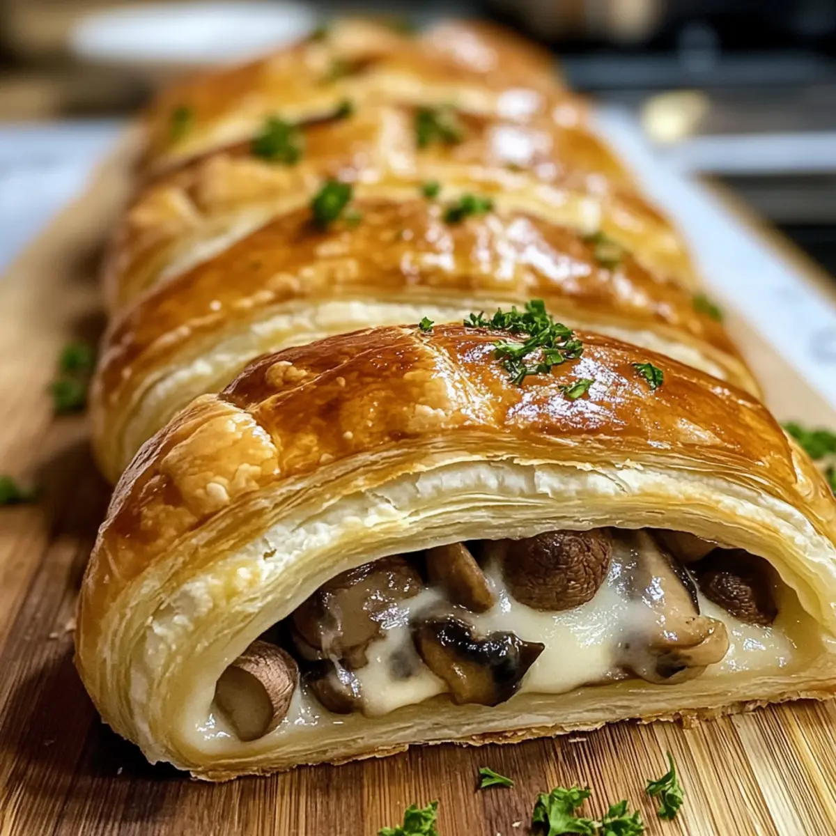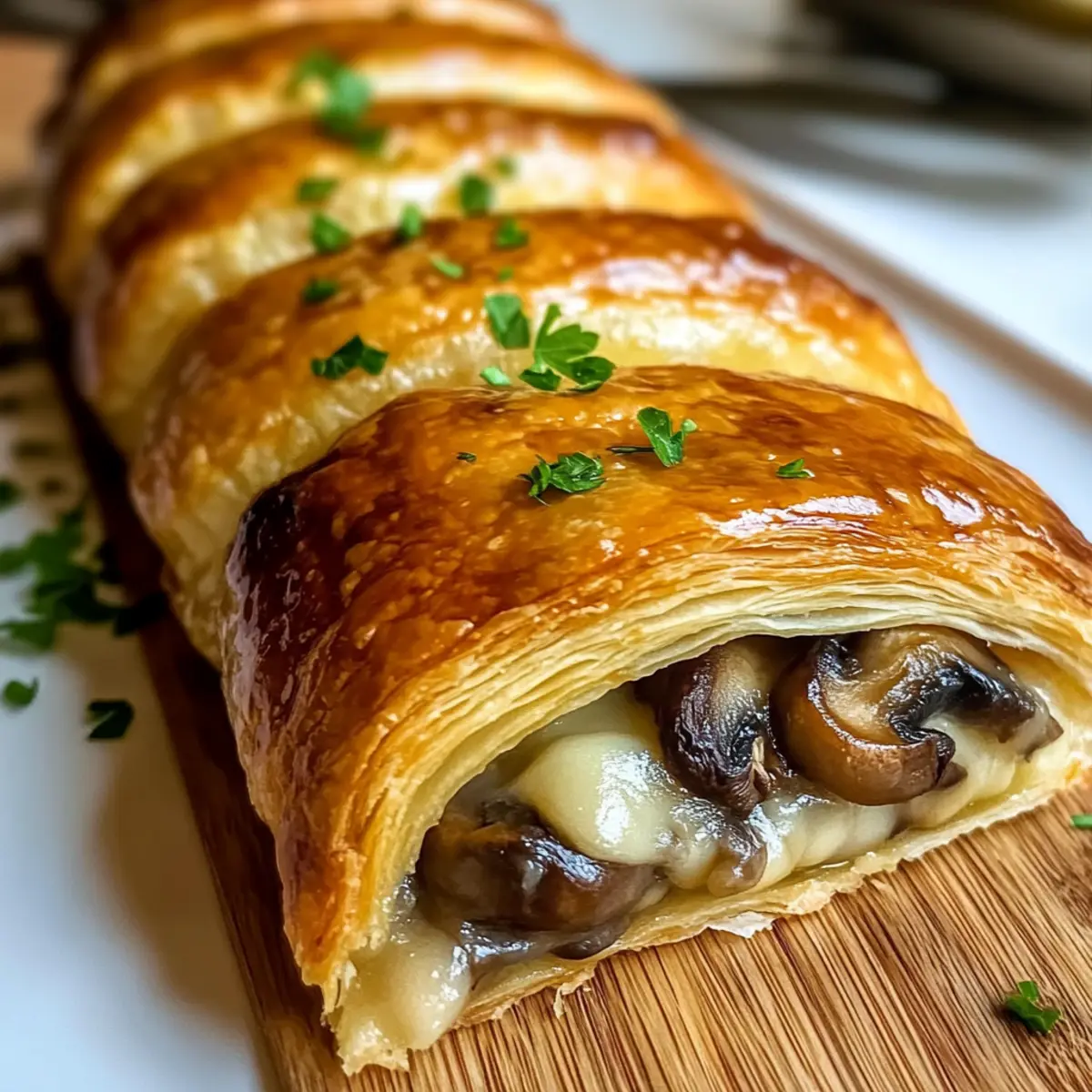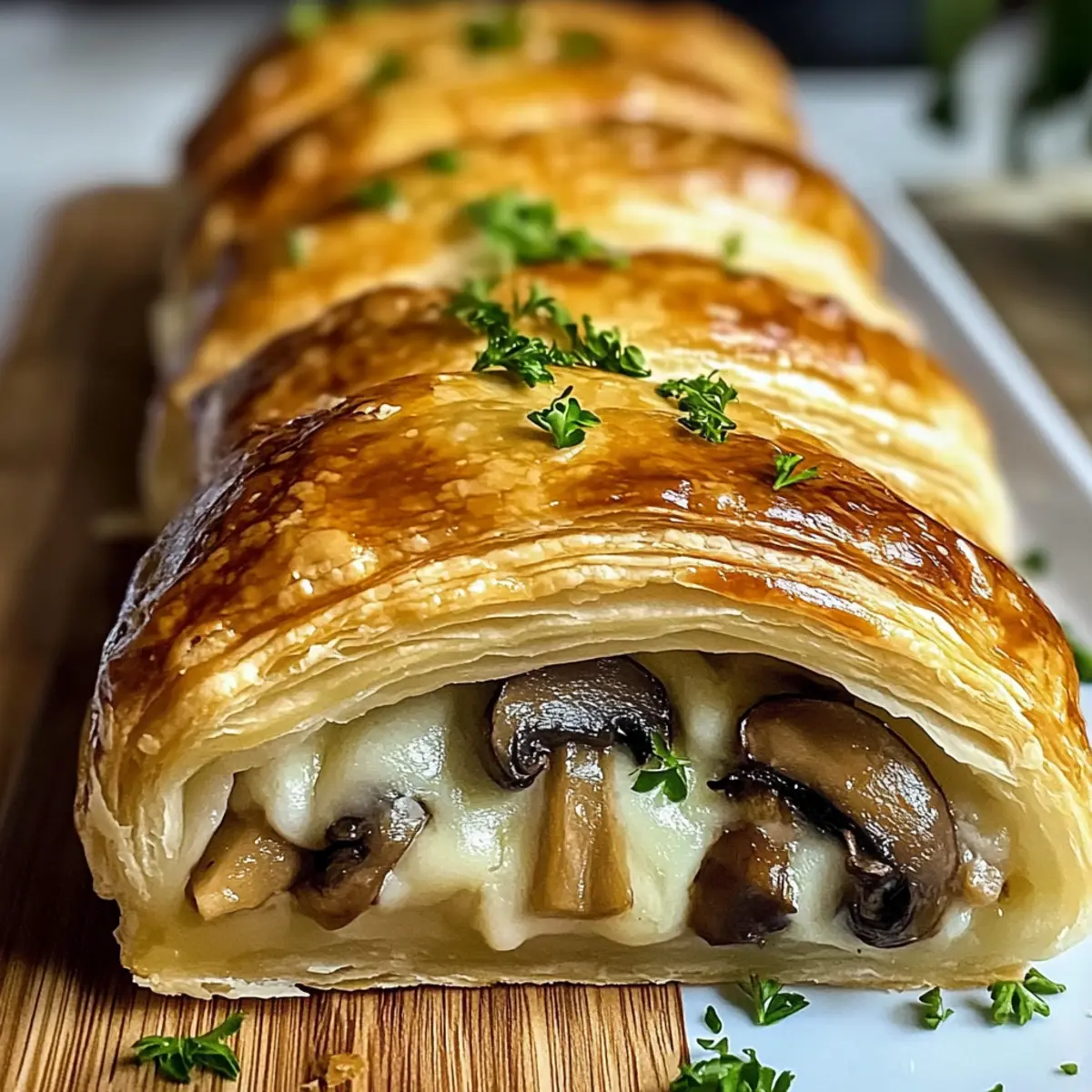 Lass den Zopf nach dem Backen für 10 Minuten ruhen, damit er sich setzen kann. Garniere ihn nach Belieben mit frischer Petersilie und serviere ihn warm als herzhaften Genuss. Dein herzhafter Pilz- und Gruyère-Blätterteig-Zopf ist nun bereit, deine Gäste zu begeistern!