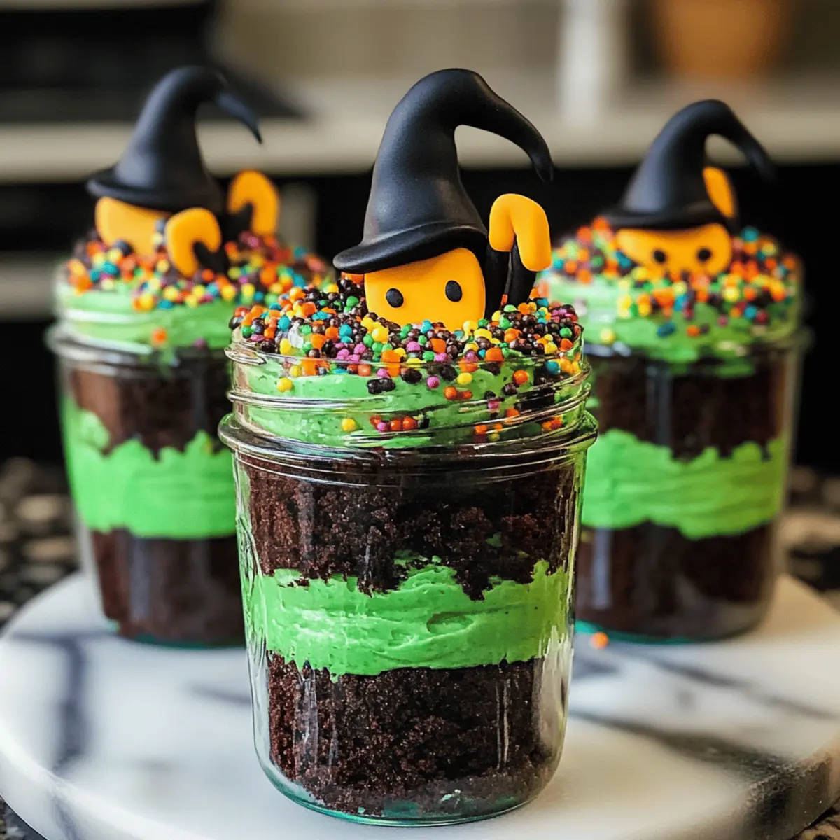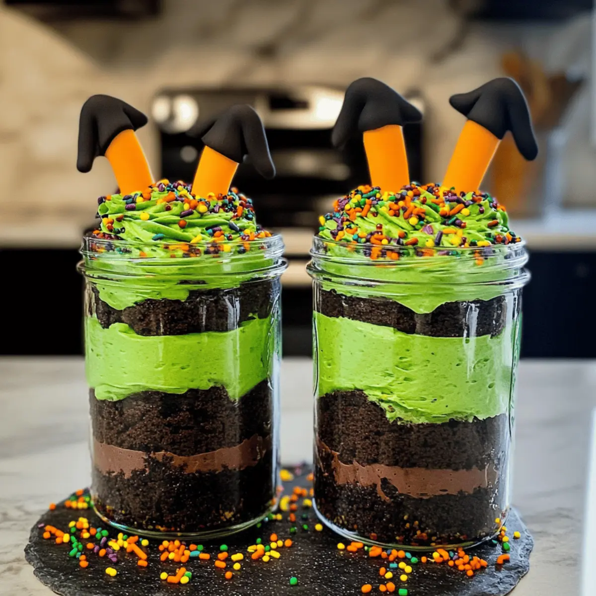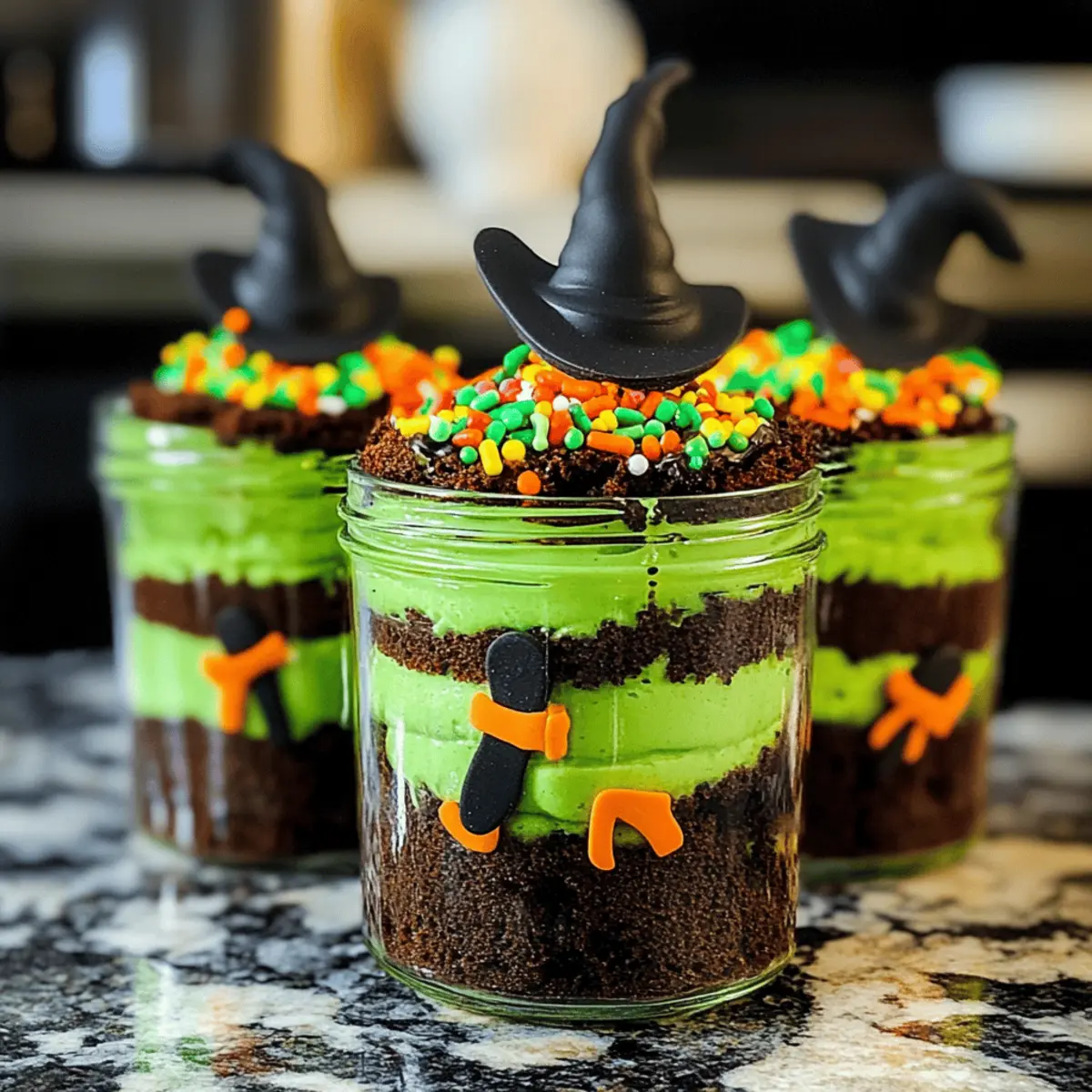 Ein köstliches und einfaches Rezept für Hexenbrühe Halloween Kuchen Gläser, perfekt für gruselige Feiern.