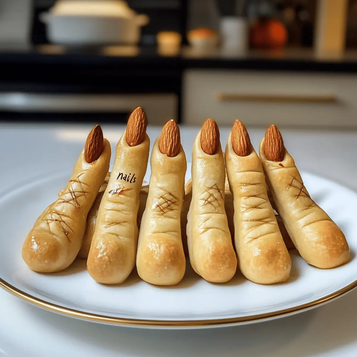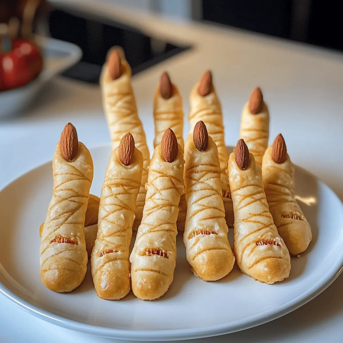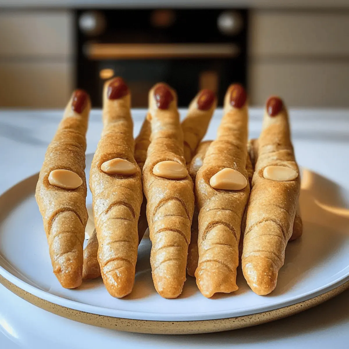 Wenn Halloween näher rückt, bringt jede festliche Vorbereitung eine prickelnde Vorfreude mit sich. Ich erinnere mich an die ersten Male, als ich Hexenfinger Brotstangen zubereitete – die Gesichter meiner Freunde und Familie, als sie diese gruseligen Leckerbissen sahen, waren unbezahlbar! Diese Brotstangen sind nicht nur ein amüsanter Hingucker auf jedem Tisch, sondern auch überraschend einfach zuzubereiten. Mit einem knusprigen Äußeren und einer weichen, köstlichen Füllung sind sie die perfekte Ergänzung für jede Halloween-Feier oder Familienabendessen. Und das Beste? Sie sind anpassbar und können sogar glutenfrei zubereitet werden! Bei all den kreativen Möglichkeiten zur Personalisierung werden Sie sicher eine Version finden, die jedem gefällt. Bereit, Ihre Gäste zum Staunen zu bringen? Lassen Sie uns eintauchen! Warum sind diese Hexenfinger Brotstangen einzigartig? Einfachheit: Die Herstellung dieser gruseligen Brotstangen erfordert nur grundlegende Backfähigkeiten und ist schnell umzusetzen. Anpassungsfähig: Mit verschiedenen Gewürzen und Dips können Sie die Geschmacksrichtung nach Ihren Wünschen gestalten. Familienfreundlich: Diese Brotstangen sind nicht nur eine Halloween-Sensation, sondern auch eine familiengerechte Aktivität, die Kinder lieben werden. Gesellig und spaßig: Ideal für Partys oder und um Freunde zu beeindrucken – die Reaktionen werden unvergesslich sein! Vielfalt im Geschmack: Von herzhaft bis leicht scharf, mit einfachen Zutaten verzaubert dieses Rezept jeden Gaumen. Wagen Sie es, kreativ zu werden und experimentieren Sie mit verschiedenen Aromen – vielleicht mit einem türkischen Pasta Rezept als begleitendem Gericht oder einem schwedischen Blaubeer Rezept als süßem Abschluss! Hexenfinger Brotstangen Zutaten • Diese Zutaten sorgen für ein schaurig-leckeres Ergebnis! Für den Teig Pizzateig – 1 Pfund; er bildet die Grundlage und Struktur. Verwenden Sie selbstgemachten oder gekauften Teig für mehr Bequemlichkeit. Eier – 1, geschlagen; sorgt für eine glänzende, goldene Oberfläche beim Backen. Olivenöl – 2 Esslöffel; fügt Geschmack hinzu und fördert die Bräunung. Salz – eine Prise; verstärkt den Geschmack. Für die “Nägel” Mandeln oder Kürbiskerne – sie dienen als ‘Nägel’; Mandeln sorgen für einen visuellen Hingucker und Crunch, während Kürbiskerne eine nussfreie Alternative darstellen können. Für die Gewürze Knoblauchpulver – gibt eine kräftige Geschmacksnote ab. Rosmarin oder bevorzugte Gewürze – verleihen zusätzliche Frische; passen Sie diese nach Ihrem Geschmack an. Für das gruselige Aussehen Rote Lebensmittelfarbe – optional; fügt einen ‘blutigen’ Effekt an den Fingerspitzen hinzu. Experimentieren Sie auch mit verschiedenen Gewürzen und Dips, um Ihr Hexenfinger Brotstangen Abendessen Rezept zu verfeinern! Schritt-für-Schritt-Anleitung für das Hexenfinger Brotstangen Abendessen Rezept Schritt 1: Backblech vorbereiten Belegen Sie ein Backblech mit Backpapier, um ein Ankleben der Hexenfinger Brotstangen zu verhindern. Dies sorgt dafür, dass die Brotstangen nach dem Backen leicht abgenommen werden können. Heizen Sie den Ofen auf 190°C vor, um eine optimale Bräunung zu erzielen. Schritt 2: Teig ausrollen Nehmen Sie den Pizzateig und rollen Sie ihn gleichmäßig mit einem Nudelholz auf einer bemehlten Fläche aus. Schneiden Sie den Teig in etwa 1-2 cm breite Streifen, die später die Fingerform der Brotstangen ergeben. Achten Sie darauf, dass die Streifen gleichmäßig sind, damit sie gleichmäßig backen. Schritt 3: Brotstangen formen Nehmen Sie jeden Teigstreifen und formen Sie ihn zu einem fingerähnlichen Shape, indem Sie ihn leicht verdrehen oder rollen. Drücken Sie die Enden des Teigs spitz zu, um die Fingerform zu betonen. Dies verleiht Ihren Hexenfinger Brotstangen ein realistischeres Aussehen, das Ihre Gäste beeindrucken wird. Schritt 4: Mandeln hinzufügen Drücken Sie jeweils eine Mandel oder Kürbiskern an das Ende jeder Brotstange, um einen ‘Nagel’ zu formen. Dies gibt den Hexenfinger Brotstangen nicht nur einen gruseligen Look, sondern fügt auch einen köstlichen Crunch hinzu. Achten Sie darauf, die Mandeln gut zu platzieren, damit sie beim Backen nicht abfallen. Schritt 5: Mit Ei bestreichen Schlagen Sie ein Ei in einer Schüssel und verwenden Sie einen Pinsel, um die Brotstangen sorgfältig mit dem geschlagenen Ei zu bestreichen. Dies sorgt für eine schöne, goldene und glänzende Oberfläche der Hexenfinger Brotstangen beim Backen. Seien Sie großzügig, damit jede Stange gut beschichtet ist. Schritt 6: Backen Schieben Sie das Backblech mit den geformten Hexenfinger Brotstangen in den vorgeheizten Ofen. Backen Sie sie für 15-20 Minuten, bis sie goldbraun und knusprig sind. Halten Sie ein Auge auf die Brotstangen, denn die Backzeit kann je nach Ofen variieren und das perfekte Ergebnis zu erzielen, ist entscheidend. Schritt 7: Abkühlen und servieren Sobald die Hexenfinger Brotstangen goldbraun sind, nehmen Sie das Backblech aus dem Ofen und lassen Sie sie einige Minuten abkühlen. Optional können Sie an den Spitzen der Brotstangen etwas rote Lebensmittelfarbe auftragen, um einen blutigen Effekt zu erzielen. Servieren Sie diese gruseligen Leckereien warm mit einem dip Ihrer Wahl! Hexenfinger Brotstangen Variationen & Substitutionen Lassen Sie Ihrer Kreativität freien Lauf und passen Sie dieses spooky Rezept nach Ihrem Geschmack an! Entdecken Sie verschiedene Möglichkeiten, die Ihren Hexenfinger Brotstangen eine persönliche Note geben. Würzig: Fügen Sie eine Prise Cayenne oder Chili-Flocken hinzu, um einen zusätzlichen Kick zu erleben. Mit dieser scharfen Note werden Ihre Gäste ins Schwitzen kommen! Käse-Liebhaber: Bestreuen Sie die Brotstangen vor dem Backen mit geriebenem Parmesan oder Cheddar für einen extra herzhaften Geschmack. Der schmelzende Käse sorgt für eine köstliche Kruste! Frische Kräuter: Vermischen Sie frische Kräuter wie Rosmar