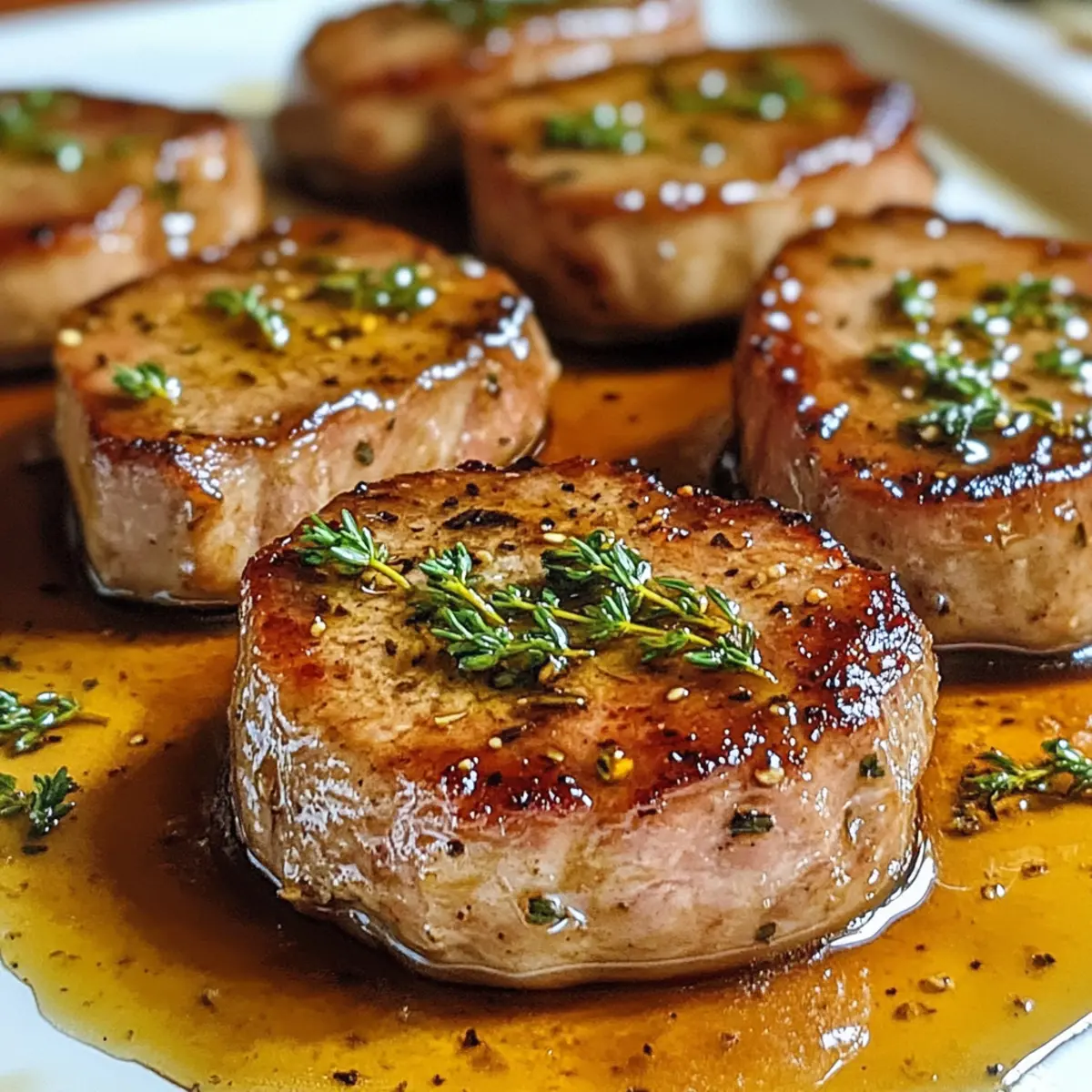 Nehmen Sie die Medaillons vom Herd und lassen Sie sie 5 Minuten ruhen. Dies hilft dabei, die Säfte des Fleisches zu bewahren. Garnieren Sie die Medaillons zum Servieren mit frisch gehacktem Thymian oder Petersilie, um zusätzliche Frische und Farbe hinzuzufügen. Jetzt sind die Honig-Knoblauch-Glasierte Schweinefilet-Medaillons bereit, um genossen zu werden!