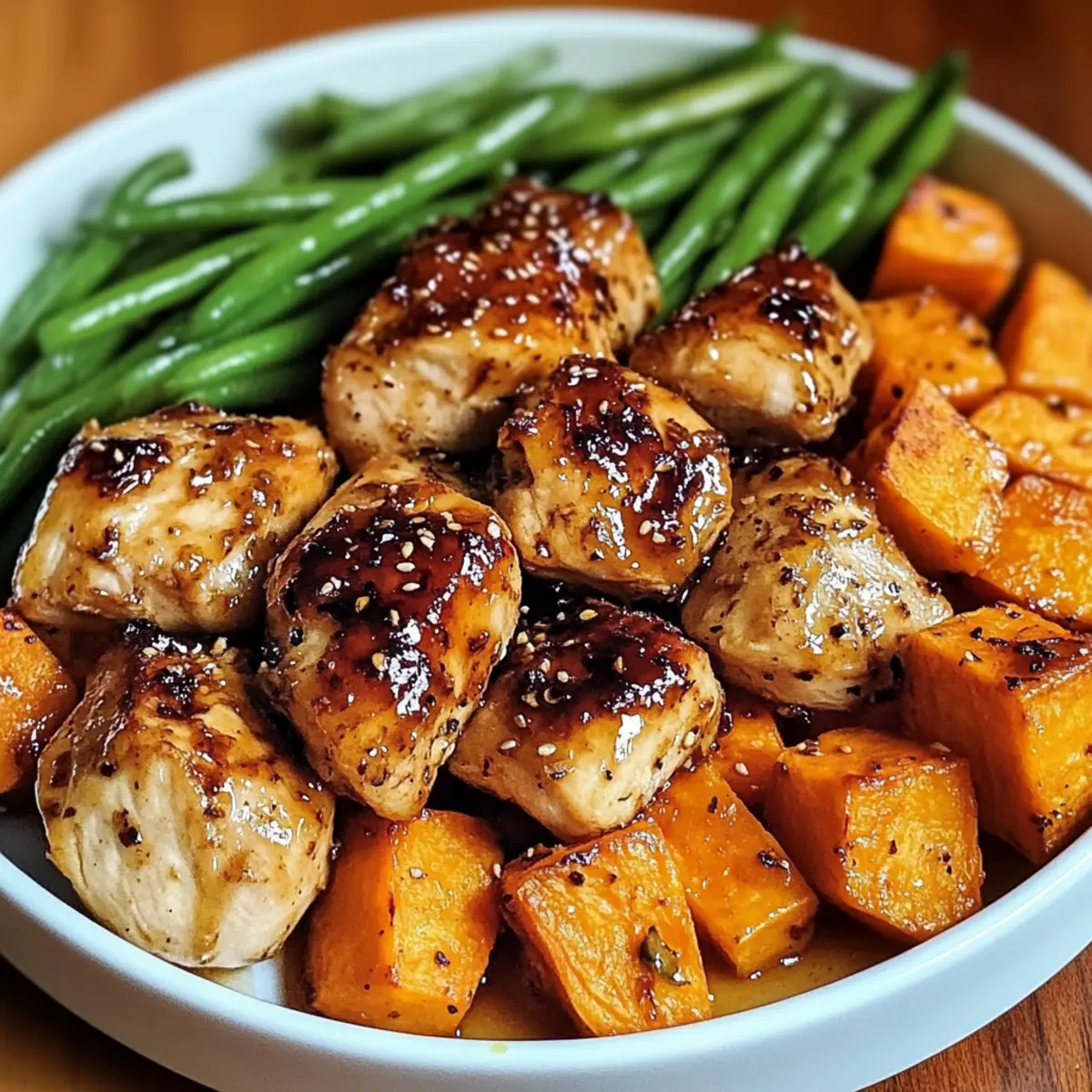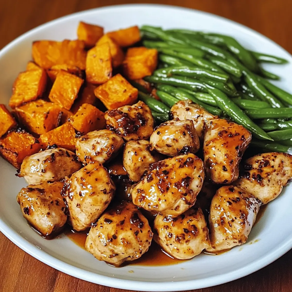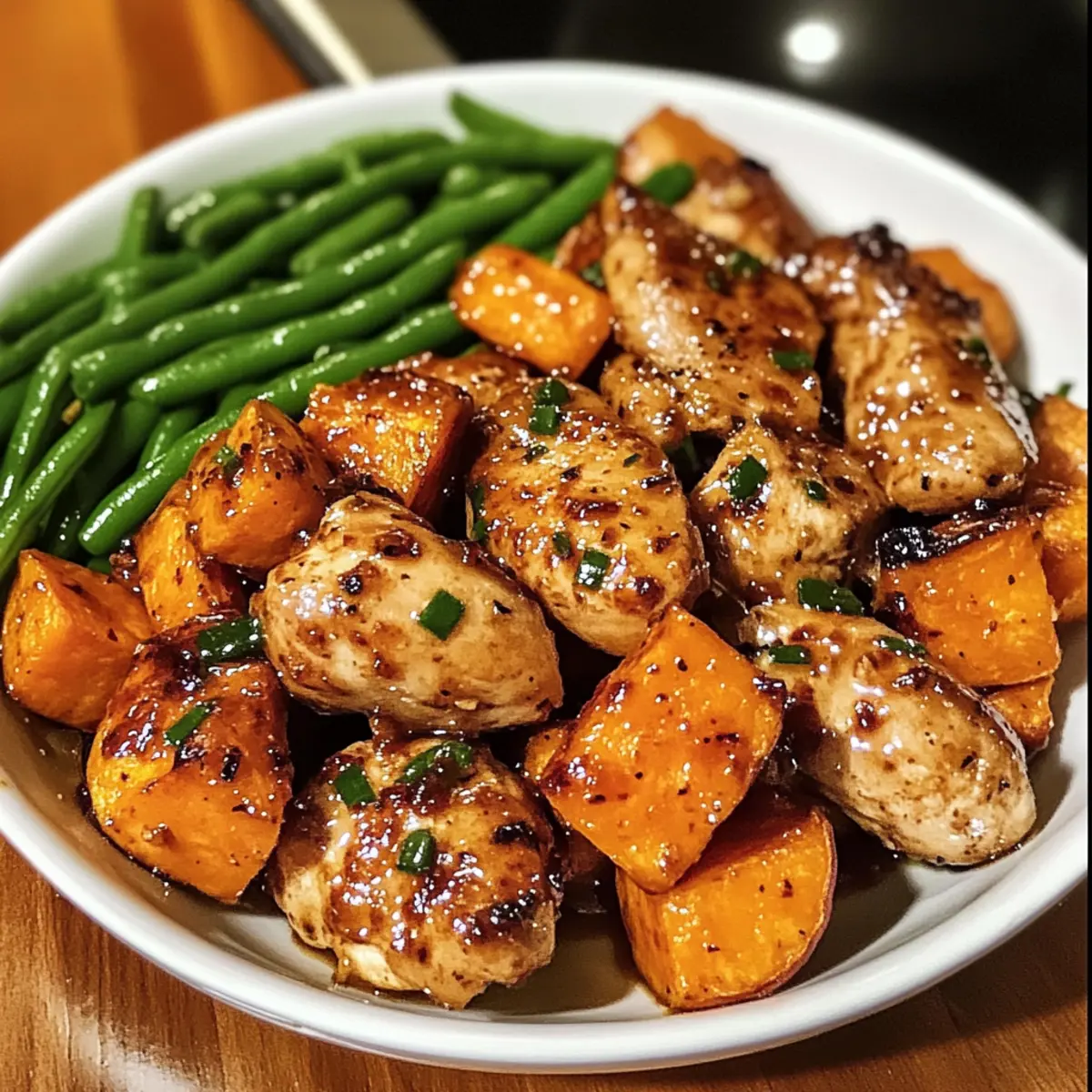 Wenn ich nach einem langen Tag nach Hause komme, wünsche ich mir oft ein schnelles, aber geschmackvolles Essen, das mich umarmt wie eine warme Decke. Genau hier kommt das Honig-Knoblauch-Hähnchen und die Süßkartoffel ins Spiel – ein einfaches Rezept für ein köstliches One-Pan-Gericht, das in weniger als einer Stunde auf dem Tisch steht. Der süßlich-klebrige Geschmack des marinierten Hähnchens kombiniert mit den sanft gerösteten Süßkartoffeln und knackigen grünen Bohnen ist nicht nur eine Freude für den Gaumen, sondern auch ein wahrer Augenschmaus. Perfekt für hektische Wochentage, bietet dieses Gericht auch eine wunderbare Flexibilität in den Aromen und ist glutenfrei, sodass es vielen verschiedenen Ernährungsweisen gerecht wird. Seid ihr bereit, diesen köstlichen Höhepunkt eurer nächsten Familienmahlzeit zu entdecken? Warum wirst du dieses Rezept lieben? Einfache Zubereitung: In weniger als 30 Minuten hast du ein köstliches Abendessen, ohne die Küche in ein Chaos zu verwandeln. Vielseitigkeit: Du kannst dieses Gericht nach Belieben anpassen – füge deine Lieblingsgemüse hinzu oder probiere verschiedene Gewürze aus. Aromatische Kombination: Der süßliche Geschmack des Honigs harmoniert perfekt mit dem herzhaften Knoblauch und sorgt für ein Geschmackserlebnis, das begeistert. Gesunde Ernährung: Mit Süßkartoffeln und frischem Gemüse bringt dieses Rezept nicht nur Geschmack, sondern auch eine Vielzahl an Nährstoffen auf den Tisch. Familienfreundlich: Das gesamte Gericht wird auf einem Blech zubereitet – weniger Geschirr, weniger Stress! Du wirst im Nu die Herzen deiner Liebsten erobern. Erfahre mehr über andere leichte Rezepte für Wochentage oder lasse dich von unseren gesunden Beilagenideen inspirieren! Honig-Knoblauch-Hähnchen Zutaten Für das Hähnchen • Hähnchen (ohne Knochen, ohne Haut) – Hauptproteinquelle; Verwende Hähnchen mit Knochen für zusätzlichen Geschmack, achte dann jedoch auf die Kochzeit. • Honig – Süßungsmittel für die klebrige Glasur; Ersetze ihn durch Ahornsirup für eine vegane Option. • Sojasauce – Fügt umami Tiefe und Salzgehalt hinzu; Nutze Tamari oder Kokosaminos für eine glutenfreie Variante. • Knoblauch (gehackt) – Sorgt für aromatischen Geschmack; Frischer Knoblauch ist für Authentizität am besten. • Olivenöl – Wird für das Marinieren und über das Gemüse geträufelt; verbessert den Geschmack und die Feuchtigkeit. • Paprika – Gibt eine Prise Rauchigkeit und Farbe; Chili-Pulver kann als scharfer Ersatz verwendet werden. • Thymian (getrocknet oder frisch) – Kräuter, die erdige Noten hinzufügen; kann mit Rosmarin für ein anderes Geschmacksprofil ersetzt werden. • Salz & Pfeffer – Wichtige Gewürze, um den Gesamtgeschmack zu heben; nach Geschmack anpassen. Für die Beilagen • Süßkartoffeln (geschält und gewürfelt) – Grundkarbohydrate; bieten Süße und Nährstoffe; normale Kartoffeln können verwendet werden, ändern jedoch das Geschmacksprofil. • Grüne Bohnen (geputzt) – Fügt Farbe und Textur hinzu; kann durch Spargel oder Brokkoli ersetzt werden. Schritt-für-Schritt-Anleitung für Honig-Knoblauch-Hähnchen und Süßkartoffel Step 1: Hähnchen marinieren Zuerst das Hähnchen vorbereiten, indem du in einer Schüssel Honig, Sojasauce, Knoblauch, Olivenöl, Paprika, Thymian, Salz und Pfeffer gut miteinander vermischst. Anschließend das Hähnchen darin wenden, bis es vollständig bedeckt ist, und für mindestens 30 Minuten (bis zu 8 Stunden für maximalen Geschmack) in den Kühlschrank stellen, um die Aromen einziehen zu lassen. Step 2: Süßkartoffeln vorbereiten Während das Hähnchen mariniert, die Süßkartoffeln schälen und in gleichmäßige Würfel schneiden. Die Würfel in eine Schüssel geben und mit Olivenöl, Salz und Pfeffer vermengen, bis sie gut überzogen sind. Diese gewürzten Süßkartoffeln gleichmäßig auf einem mit Backpapier ausgelegten Blech verteilen. Step 3: Süßkartoffeln vorbacken Das Backblech mit den Süßkartoffeln in den vorgeheizten Ofen bei 200°C (400°F) schieben und 15 Minuten backen, bis die Süßkartoffeln leicht weich sind und sich die Ränder zu kräuseln beginnen. Diese Vorbackzeit sorgt dafür, dass sie beim späteren Backen zart und köstlich werden. Step 4: Zutaten kombinieren Nach 15 Minuten die Süßkartoffeln aus dem Ofen nehmen und sie zur Seite schieben. Das marinierte Hähnchen auf die gegenüberliegende Seite des Blechs legen und die vorbereiteten grünen Bohnen um das Hähnchen herum anordnen. Über das gesamte Gericht den restlichen Marinade darüberträufeln, um zusätzlichen Geschmack zu verleihen. Step 5: Backen Das Blech zurück in den Ofen stellen und 20-25 Minuten lang backen, bis das Hähnchen vollständig durchgegart ist und eine Kerntemperatur von 75°C (165°F) erreicht hat. Die Gemüse sollten zart, aber noch bissfest sein. Achte auf eine goldbraune Farbe des Hähnchens, um sicherzustellen, dass es perfekt ist. Step 6: Anrichten und servieren Nach dem Backen das Blech aus dem Ofen nehmen und das Gericht auf eine große Servierplatte anrichten. Mit dem ausgetretenen Bratensaft beträufeln, um einen zusätzlichen Geschmackskick zu geben. Nach Belieben mit frischer Petersilie oder geschnittenen Frühlingszwiebeln garnieren und direkt servieren. Hilfreiche Tricks für Honig-Knoblauch-Hähnchen Marinierungszeit verlängern: Lasse das Hähnchen länger marinieren, um die Geschmäcker noch intensiver zu machen; ideal sind bis zu 8 Stunden für maximalen Geschmack. Kochtemperatur beachten: Achte darauf, dass das Hähnchen die Kerntemperatur von 75°C (165°F) erreicht; das sorgt für saftiges und sicheres Essen. Gleichmäßiges Würfeln: Schneide die Süßkartoffeln gleich groß, damit sie gleichmäßig garen; ungleiche Stücke können unterschiedliche Garzeiten haben. Ofen nicht überfüllen: Sorge dafür, dass alle Zutaten genügend Platz auf dem Blech haben; so kann die heiße Luft gut zirkulieren und sorgt