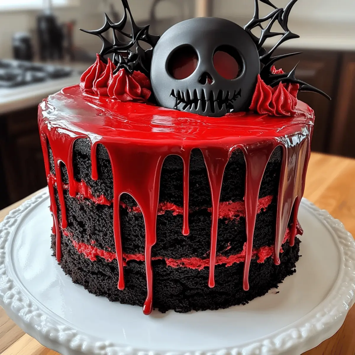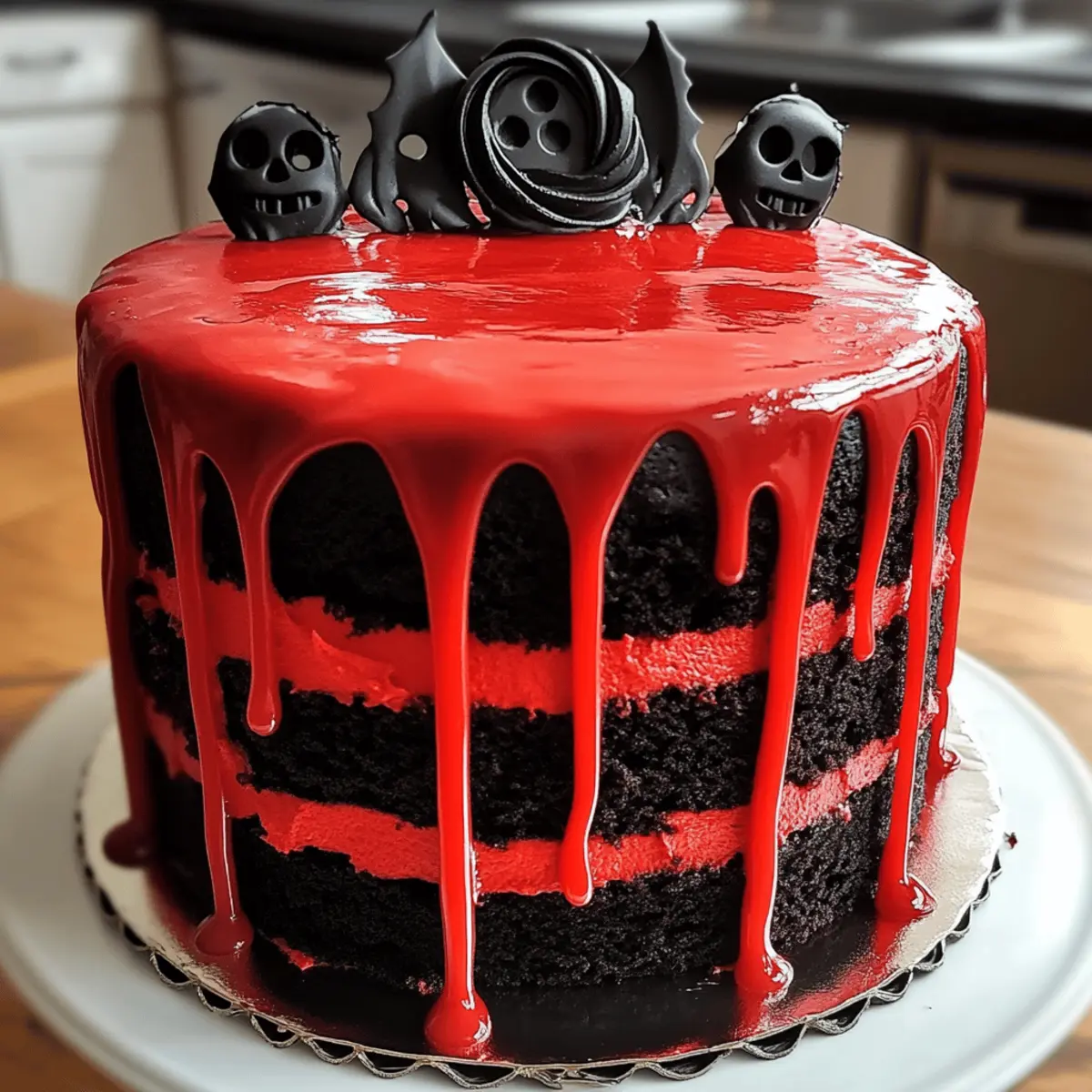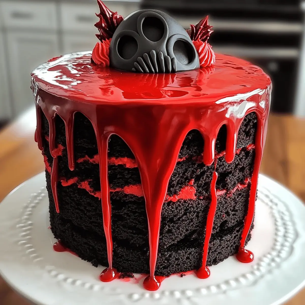 Ich kann kaum glauben, dass wieder Halloween vor der Tür steht! Diese Zeit des Jahres bringt nicht nur gruselige Kostüme, sondern auch die Möglichkeit, unsere Küchen in kreative Werkstätten zu verwandeln. Wenn du auf der Suche nach einem Rezept bist, das sowohl das Auge als auch den Gaumen erfreut, dann ist mein Horror-Kuchen-Rezept in Form einer schwarz-roten Scream-Masken-Torte genau das Richtige für dich. Mit seinen schokoladigen oder rot-velvet-haltigen Schichten und der seidigen schwarzen Kakaobuttercreme ist dieser Kuchen nicht nur ein Hingucker für deine Halloween-Feier, sondern auch schnell zubereitet und ein absoluter Publikumsmagnet. Wer kann schon einem Stück dieser gruselig-süßen Köstlichkeit widerstehen? Lass uns gemeinsam in die Welt des schrecklich leckeren Backens eintauchen! Bist du bereit für die Herausforderung? Warum wirst du dieses Rezept lieben? Einfache Zubereitung: Die Schritte sind klar und unkompliziert, sodass jeder, unabhängig von den Backfähigkeiten, die Scream-Masken-Torte mühelos meistern kann. Visuelles Spektakel: Die Kombination aus schwarz und rot zieht alle Blicke auf sich und macht deinen Kuchen zum echten Hingucker auf jeder Halloween-Feier. Unwiderstehlicher Geschmack: Die Kombination von schokoladigem oder rot-velvet-haltigem Teig mit der köstlichen schwarzen Kakaobuttercreme garantiert, dass dieser Kuchen nicht nur toll aussieht, sondern auch fantastisch schmeckt. Vielseitige Dekorationsmöglichkeiten: Du kannst mit dem Design spielen und verschiedene Themen umsetzen. Ob als schaurige Torte oder sogar für andere festliche Anlässe – die Möglichkeiten sind endlos! Schnell und zeitsparend: Mit nur wenigen Zutaten und einem schnellen Backprozess bist du in kürzester Zeit bereit, diese gruselige Köstlichkeit zu servieren. Lass dich außerdem von unseren Variation Ideen inspirieren, um die Torte an deine eigenen Vorlieben anzupassen! Horror-Kuchen-Zutaten • Für die Herstellung des schaurig-süßen Kuchens benötigt man einige essentielle Zutaten. Für den Teig: Allzweckmehl (310 g) – Fügt dem Kuchen Struktur hinzu; ersetze es durch Kuchenmehl für eine leichtere Konsistenz. Zucker (300 g) – Bringt die Süße und hilft beim Bräunen; eine Alternative könnte die Textur beeinflussen. Buttermilch (240 ml) – Sorgt für Feuchtigkeit und Zartheit; kann durch Joghurt oder Milch mit Essig ersetzt werden. Schwarzes Kakaopulver (60 g) – Verstärkt die dunkle Farbe und den reichen Geschmack des Kuchens; verwende normales Kakaopulver für einen milderen Geschmack. Backsoda (1 TL) und Backpulver (1 TL) – Lassen den Kuchen aufgehen; achte darauf, sie frisch zu halten. Salz (½ TL) – Balanciert die Süße und verstärkt den Geschmack. Große Eier (3) – Dienen als Bindemittel und verleihen Reichtum; Flascheier sind eine vegane Option. Essig (1 EL) – Reagiert mit dem Backpulver für die charakteristische Farbe der roten Teige; weglassen, wenn du Schokoladenkuchen machst. Vanilleextrakt (2 TL) – Optimiert den gesamten Geschmack. Verwende reines Vanilleextrakt für beste Ergebnisse. Pflanzenöl (180 ml) – Sorgt für Feuchtigkeit; schmelzte Butter gibt einen reicheren Geschmack. Gel-Lebensmittelfarbe (Rot & Schwarz) – Liefert intensive Farben, ohne die Konsistenz des Teigs zu verändern. Für die schwarze Kakaobuttercreme: Ungesalzene Butter (230 g) – Hauptfett für das Frosting, sorgt für eine glatte Textur. Puderzucker (375 g) – Süßt und verdickt das Frosting; nach Geschmack anpassen. Schwarzes Kakaopulver (60 g) – Verleiht dem Frosting Farbe und Geschmack. Milch oder Sahne (1 EL) – Um das Frosting auf die gewünschte Konsistenz zu verdünnen. Für den roten Tropfen: Zucker-Schmelze oder weiße Schokolade (90 g) – Für den tropfenden Effekt; kann durch rote gefärbte weiße Schokolade ersetzt werden. Schlagsahne (60 ml) – Zum Schmelzen und für eine gießbare Konsistenz; nach Dicke anpassen. Für die Dekoration: Weiße Fondant oder Modellschokolade – Für die Erstellung der Scream-Maske. Schwarze essbare Gel-Farbe oder Marker – Für die Details der Maske. Das Horror-Kuchen-Rezept verwandelt deine Halloween-Feier in ein unvergessliches Erlebnis! Schritt-für-Schritt-Anleitung für das Horror-Kuchen-Rezept Schwarz-rote Scream-Masken-Torte Step 1: Ofen vorheizen und Backformen vorbereiten Heize deinen Ofen auf 175 °C vor und bereite drei 20 cm große Kuchenformen vor, indem du sie einfettest und mit Backpapier auslegst. Dies verhindert, dass der Teig an der Form kleben bleibt und erleichtert das Herausnehmen des Kuchens später. Die Temperatur ist ideal für eine gleichmäßige und schöne Backentwicklung. Step 2: Trockene Zutaten mischen Sichte in einer großen Schüssel das Allzweckmehl, schwarzes Kakaopulver, Backpulver, Backsoda und Salz gründlich zusammen. Diese Mischung sorgt für einen gleichmäßigen Gärungsprozess und eine perfekte Textur des Kuchens. Achte darauf, dass keine Klümpchen im Mehl sind, um eine glatte Teigbasis zu erhalten. Step 3: Feuchte Zutaten kombinieren In einer separaten Schüssel verrühre Zucker, Eier, Öl, Vanilleextrakt und die gewünschte Lebensmittelfarbe, bis alles gut vermischt ist. Die Mischung sollte eine leicht schaumige Konsistenz erreichen, was etwa 3–4 Minuten dauert. Diese Zutaten sorgen für Süße und Saftigkeit in deiner Horror-Kuchen-Torte. Step 4: Trockene und feuchte Zutaten vereinen Integriere nun die trockenen Zutaten schrittweise in die feuchte Mischung, abwechselnd mit der Buttermilch. Beginne und ende mit den trockenen Zutaten. Rühre vorsichtig, bis ein glatter Teig entsteht. Diese Technik hilft, einen gut durchmischten und luftigen Teig zu gewährleisten. Step 5: Teig aufteilen und backen Verteile den Teig gleichmäßig auf die vorbereiteten Kuchenformen und stelle sie in den vorgeheizten Ofen. Backe die Kuchen für 25–30 Minuten. Sie sind fertig, wenn ein Zahnstocher in der Mitte sauber herauskommt. Lass die Kuchen nach dem Backen vollständig
