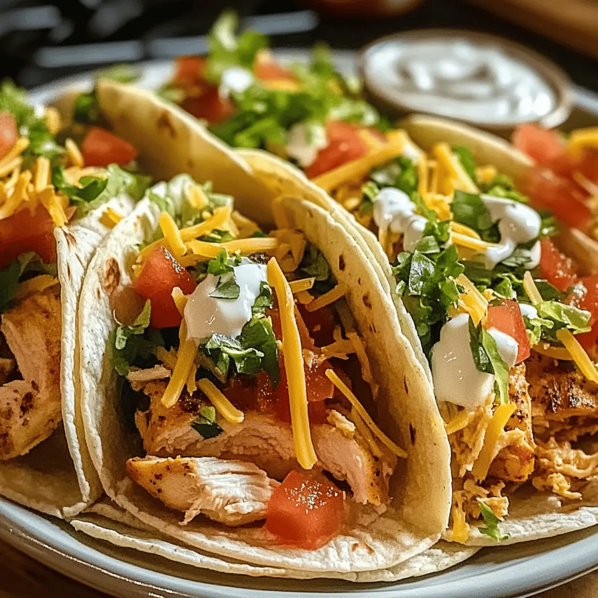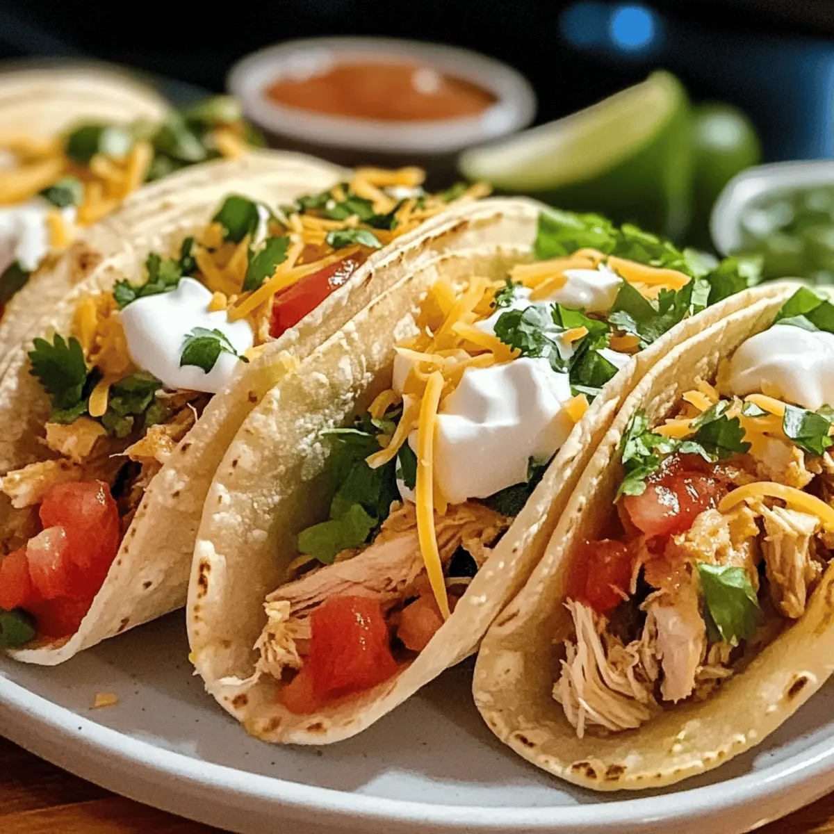 Es gibt kaum etwas Befriedigenderes, als die eigene Küche zu betreten und die Zutaten für ein köstliches Abendessen zu versammeln. Wenn du nach einem Rezept suchst, das einfach vorzubereiten ist und die gesamte Familie begeistert, sind meine Hühnchen-Tacos genau das Richtige für dich! Diese schnellen Tacos kombinieren zarte, saftige Hühnchenstücke mit frischen, bunten Toppings, die sie nicht nur zu einer Gaumenfreude machen, sondern auch zu einem perfekt anpassbaren Abendessen. Ob du es lieber mild oder scharf magst, mit diesen Hühnchen-Tacos bringst du Schwung in deinen Speiseplan. Sind du bereit, in die Welt der Aromen einzutauchen und deine eigenen köstlichen Kreationen zu erstellen? Lass uns loslegen! Warum solltest du Hühnchen-Tacos lieben? Einfachheit in der Zubereitung: Dieses Rezept ist schnell und unkompliziert, perfekt für Kochanfänger und vielbeschäftigte Menschen. Vielfältige Anpassungsmöglichkeiten: Du kannst die Toppings nach deinem Geschmack variieren – von scharfer Salsa bis hin zu frischem Gemüse. Köstlicher Geschmack: Die Kombination aus zartem Hühnchen und frischen Zutaten bietet ein wahres Geschmackserlebnis, das die ganze Familie begeistern wird. Gesunde Mahlzeit: Mit frischen Zutaten kannst du eine gesunde Ernährung fördern, während die Tacos gleichzeitig sättigend sind. Für noch mehr köstliche Inspiration, schau dir auch unsere Rezepte für schnelle Salate oder leckere Salsas an! Hühnchen-Taco Zutaten Für das Hühnchen • Hähnchenbrustfilet – Hauptprotein, das Geschmack und Struktur verleiht; für einen saftigeren Biss können auch Hähnchenschenkel verwendet werden. • Olivenöl – Macht das Hühnchen zart und fügt Reichhaltigkeit hinzu; substituiere mit Gemüse- oder Avocadoöl, wenn gewünscht. • Paprikapulver – Steigert die Farbe und bringt eine milde Süße; geräuchertes Paprikapulver verleiht einen intensiveren Geschmack. • Kreuzkümmel – Für den authentischen Taco-Geschmack wichtig; kannst mit gemahlenem Koriander ersetzen, wenn du eine mildere Note bevorzugst. • Knoblauchpulver – Für aromatische Tiefe; frischer Knoblauch kann auch verwendet werden, achte aber auf die Menge. • Salz und Pfeffer – Essentielle Gewürze, um die Aromen zu maximieren. Für die Tacos • Tortillas – Der Träger für die Füllung; wähle zwischen Mais- oder Weizentortillas; Vollkornvarianten sind gesünder. • Gehackter Salat – Für den frischen Crunch; Spinat ist eine nährstoffreiche Alternative. • Gewürfelte Tomaten – Fügt Feuchtigkeit und Frische hinzu; bei Nichtverfügbarkeit können auch Dosentomaten verwendet werden. • Geriebener Käse – Für die Cremigkeit; wähle Cheddar, Monterey Jack oder eine milchfreie Option. • Sour Cream (optional) – Fügt Cremigkeit hinzu; griechischer Joghurt ist eine gesündere Wahl. • Salsa (optional) – Bringt Würze mit einem spritzigen Geschmack; entweder selbstgemacht oder gekauft. • Frische Korianderblätter (optional) – Garnierung, die die Aromen ergänzt; weglassen, wenn du keinen Koriander magst. Mit diesen Zutaten wirst du unwiderstehliche Hühnchen-Tacos zaubern, die deine Familie begeistern werden! Schritt-für-Schritt-Anleitung für Hühnchen-Tacos Step 1: Hähnchen vorbereiten Schneide die Hähnchenbrustfilets in kleine Würfel und mariniere sie für etwa 10 Minuten in einer Mischung aus Olivenöl, Paprikapulver, Kreuzkümmel, Knoblauchpulver, Salz und Pfeffer. Diese Marinade sorgt für einen intensiven Geschmack der Hühnchen-Tacos und macht das Fleisch zart und saftig. Step 2: Hähnchen braten Erhitze eine mittelgroße Pfanne bei mittlerer Hitze. Gib die marinierten Hähnchenwürfel hinein und brate sie für 8-10 Minuten, bis sie vollständig durchgegart sind und eine goldene Farbe haben. Achte darauf, die Stücke gelegentlich umzurühren, damit sie gleichmäßig bräunen und nicht anbrennen. Step 3: Tortillas aufwärmen Während das Hühnchen brät, kannst du die Tortillas in einer separaten Pfanne oder in der Mikrowelle erwärmen. Erhitze sie für etwa 20-30 Sekunden, bis sie warm und biegsam sind. Dadurch lassen sich die Hühnchen-Tacos einfacher füllen und verzehren. Step 4: Tacos zusammenstellen Nimm die warmen Tortillas und platziere eine Portion des gebratenen Hähnchens in der Mitte. Toppe sie großzügig mit gehacktem Salat, gewürfelten Tomaten und geriebenem Käse. Wenn du möchtest, füge auch Sour Cream und Salsa hinzu, um zusätzliche Cremigkeit und Geschmack zu bieten. Step 5: Servieren Garnieren die fertigen Hühnchen-Tacos mit frischen Korianderblättern, wenn du das magst. Serviere die Tacos sofort warm und genieße sie mit Familie und Freunden. Diese köstlichen Hühnchen-Tacos sind perfekt für ein geselliges Abendessen! Expert Tips für Hühnchen-Tacos Hühnchen richtig marinieren: Die Marinade sollte mindestens 10 Minuten einziehen, um den Geschmack optimal zu entfalten. Dadurch werden deine Hühnchen-Tacos noch aromatischer. Pfanne nicht überfüllen: Achte darauf, das Hühnchen in einer einzelnen Schicht zu braten. Überfüllte Pfannen führen zu ungleichmäßiges Garen und verhindert eine schöne Bräunung. Tortillas vorwärmen: Erwärme die Tortillas, bevor du sie füllst. Warme Tortillas lassen sich besser rollen und brechen nicht so leicht. Frische Zutaten wählen: Verwende frisches Gemüse und Kräuter für die Toppings. So steigerst du den Geschmack und die Nährstoffe deiner Hühnchen-Tacos. Variationen ausprobieren: Probier verschiedene Toppings und Salsas aus – vom scharfen Jalapeño bis hin zu süßem Mango-Salsa, um den perfekten Geschmack für jeden Gaumen zu finden. Lagerungstipps für Hühnchen-Tacos Kühlschrank: Bewahre übrig gebliebenes Hühnchen in einem luftdichten Behälter auf; es bleibt bis zu 3 Tage frisch. Gefrierschrank: Du kannst das marinierte Hühnchen bis zu 3 Monate einfrieren. Stelle sicher, dass es gut verpackt ist, um Gefrierbrand zu vermeiden. Wiedererwärmen: Erhitze die Hühnchen-Tacos in de