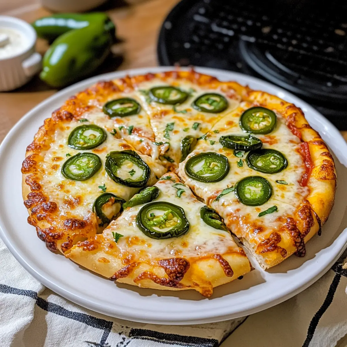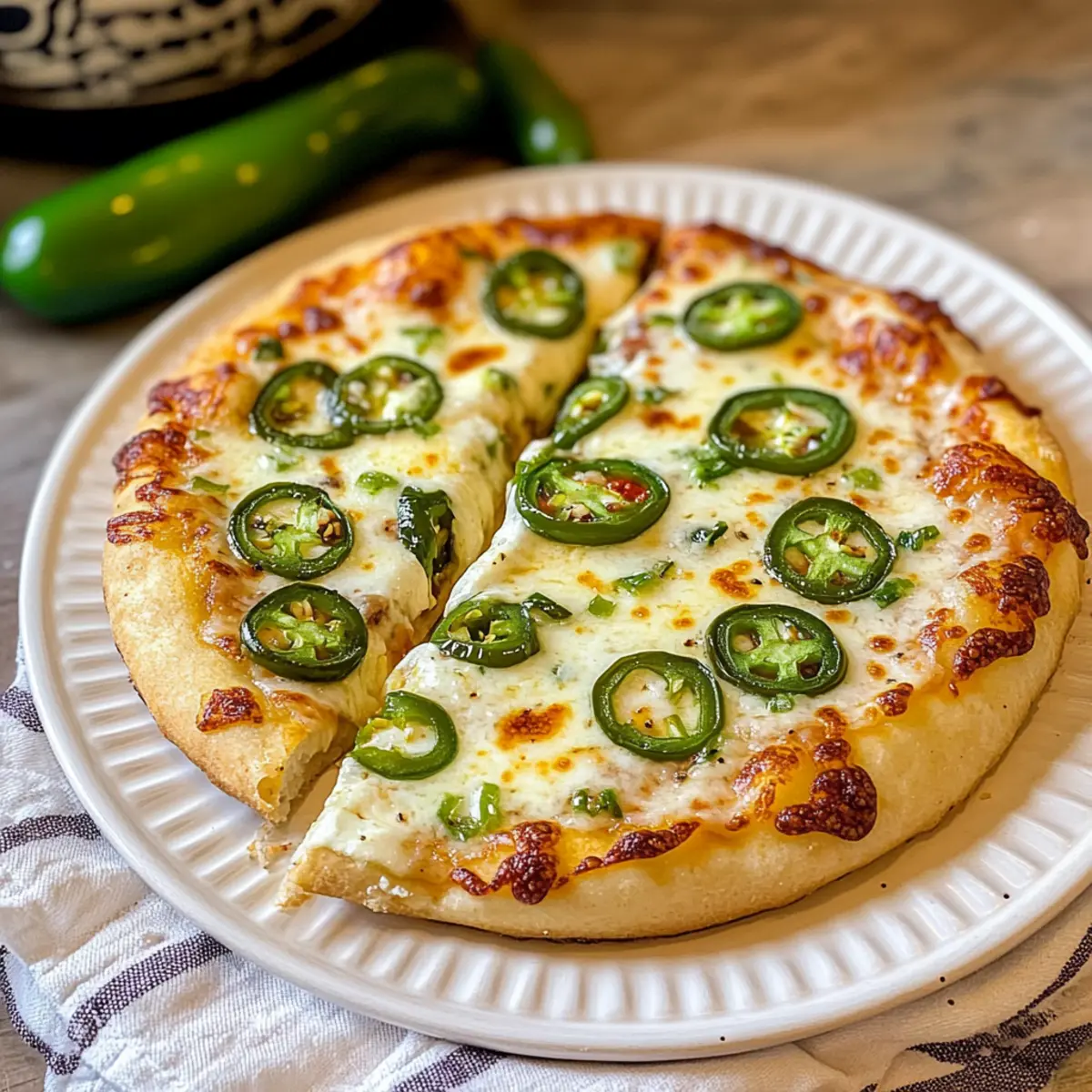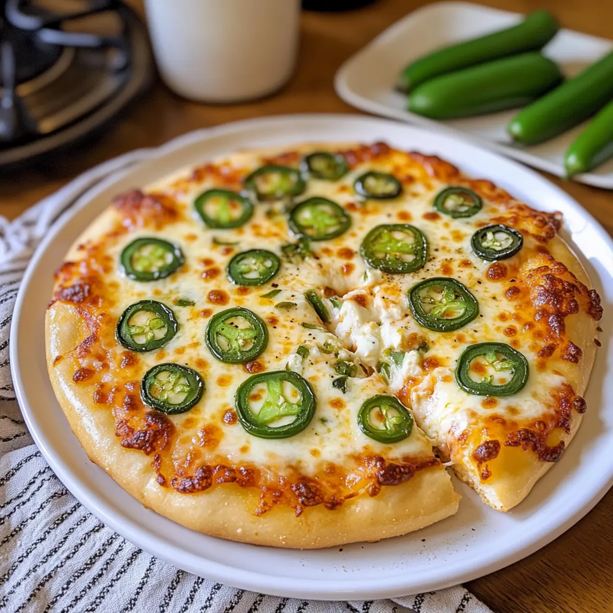 „Ich kann es kaum fassen, wie einfach es ist, meine beiden Lieblingsspeisen in einem Gericht zu vereinen: Pizza und Jalapeño-Popper! Diese Jalapeño-Popper-Pizza bringt die würzige Cremigkeit von Jalapeño-Popern auf einen knusprigen Pizzaboden und überzeugt in weniger als 30 Minuten. Ihr cremiger Frischkäse-Teig verleiht der Pizza eine ganz besondere Note, während der zart schmelzende Käse und die frischen Jalapeños für das perfekte Geschmackserlebnis sorgen. Ideal für schnelle Abendessen oder lebhafte Partys, ist dieses Rezept nicht nur ein Genuss für die Geschmacksknospen, sondern bietet auch zahlreiche Anpassungsmöglichkeiten. Wie scharf darf es sein? Lass uns gemeinsam herausfinden, welche Käsevariationen du ausprobieren möchtest!“ Warum wirst du dieses Rezept lieben? Einzigartiger Geschmack: Die Kombination aus würzigen Jalapeños und cremigem Frischkäse sorgt für eine Geschmacksexplosion. Schnelle Zubereitung: In weniger als 30 Minuten ist deine Jalapeño-Popper-Pizza fertig – perfekt für ein schnelles Abendessen. Anpassungsfähig: Du kannst die Schärfe und die Käsesorten nach Belieben anpassen, um dein perfektes Gericht zu kreieren. Käsevielfalt: Frischkäse, Mozzarella und Monterey Jack harmonieren hervorragend und bieten eine tolle Schmelzstruktur. Beliebter Party-Snack: Diese Pizza ist ein Hit bei Gästen und verwandelt jede Feier in ein Geschmackserlebnis. Zutaten für Jalapeño-Popper-Pizza • Hier sind die notwendigen Zutaten für deine köstliche Jalapeño-Popper-Pizza. Für den Teig Pizzateig – als Basis kannst du fertigen oder selbstgemachten Teig verwenden, je nach deinem Zeitbudget. Für die Füllung Frische Jalapeños – sie sorgen für die nötige Schärfe und Geschmack; ohne Kerne ist die Pizza milder. Frischkäse – gibt der Pizza ihre cremige Textur; verwende ihn weich, damit er sich leicht verstreichen lässt. Mozzarella – sorgt für die klassische Käseigkeit und Schmelz; frisch gerieben ist am besten. Monterey Jack – ergänzt den Mozzarella mit einem leicht anderen Geschmack; du kannst auch Cheddar oder Pepper Jack verwenden. Knoblauchpulver – verstärkt die Geschmackstiefe. Zwiebelpulver – bringt eine herzliche Würze. Salz & schwarzer Pfeffer – unverzichtbar zur Abrundung des Geschmacks. Für die Garnitur Schnittlauch (optional) – für einen frischen Geschmack und eine schöne garnierung. Diese Zutaten machen deine Jalapeño-Popper-Pizza zu einem unwiderstehlichen Genuss! Schritt-für-Schritt-Anleitung für Jalapeño-Popper-Pizza Step 1: Ofen vorheizen Heize deinen Ofen auf 230°C (450°F) vor. Lege ein Pizzablech mit Backpapier aus, damit die Pizza nicht kleben bleibt. Dies trägt dazu bei, dass der Boden gleichmäßig durchbackt und knusprig wird, während du die anderen Zutaten vorbereitest. Step 2: Teig formen Nimm den Pizzateig und forme ihn auf dem vorbereiteten Blech zu einem Kreis mit einem Durchmesser von ungefähr 25 cm. Achte darauf, dass der Teig gleichmäßig dick ist, damit er überall gleichmäßig backt. Es sollte ein schöner, runder Pizzaboden entstehen, der gut zur Jalapeño-Popper-Pizza passt. Step 3: Frischkäse-Mischung zubereiten In einer Schüssel vermischst du den weichen Frischkäse mit Knoblauchpulver, Zwiebelpulver, Salz und schwarzem Pfeffer. Rühre die Mischung gründlich um, bis sie schön cremig und glatt ist. Diese aromatische Basis sorgt für die würzige Note deiner Jalapeño-Popper-Pizza und macht sie besonders lecker. Step 4: Frischkäse auftragen Verteile die Frischkäse-Mischung gleichmäßig auf dem Pizzateig, lass dabei einen kleinen Rand von etwa 1 cm. Achte darauf, dass der Frischkäse überall gut verteilt ist, damit jeder Biss die cremige Füllung beinhaltet. Step 5: Käse und Jalapeños hinzufügen Lege die Mozzarella-Scheiben gleichmäßig über die Frischkäse-Schicht und streue anschließend den Monterey Jack Käse darüber. Dann belege die Pizza großzügig mit frischen Jalapeño-Scheiben, die du je nach Schärfewunsch vorbereiten kannst. Step 6: Pizza backen Schiebe die Jalapeño-Popper-Pizza in den vorgeheizten Ofen und backe sie 15 bis 20 Minuten lang, bis der Rand goldbraun und knusprig ist. Du solltest sehen, wie der Käse schön schmilzt und leicht blubbert – das ist das Zeichen, dass deine Pizza fast fertig ist! Step 7: Abkühlen und garnieren Nach dem Backen nimm die Pizza aus dem Ofen und lasse sie einige Minuten abkühlen. Garniere die fertige Pizza mit frischem Schnittlauch, um einen zusätzlichen Farb- und Geschmacksakzent zu setzen, bevor du sie in Stücke schneidest und servierst. Was passt zu Jalapeño-Popper-Pizza? Diese feurige Pizza ist nicht nur köstlich, sondern kann auch wunderbar mit verschiedenen Beilagen kombiniert werden, um ein komplettes Menü zu kreieren. Cremige Guacamole: Sie bringt eine frische, cremige Komponente ins Spiel und mildert die Schärfe der Jalapeños. Perfekt zum Dippen! Frischer grüner Salat: Knackige Blattsalate harmonieren ideal mit der herzhaften Pizza und sorgen für eine ausgewogene Mahlzeit. Scharfe Salsa: Eine würzige Salsa ergänzt die Aromen der Jalapeño-Popper-Pizza und verleiht dem Abendessen eine feurige Note. Eisgekühltes Bier: Ein kaltes, erfrischendes Bier wirkt erfrischend und passt bestens zu den kräftigen Aromen der Pizza. Zitronen-Limonade: Die süß-säuerliche Erfrischung der Limonade gleicht die Würze der Pizza aus und liefert einen spritzigen Kontrast. Dessert mit Schokolade: Ein schokoladiges Dessert wie Brownies sorgt für einen süßen Abschluss, der die scharfen Aromen der Pizza wunderbar abrundet. Vorbereitung der Jalapeño-Popper-Pizza für stressfreies Kochen Diese Jalapeño-Popper-Pizza ist perfekt für Meal Prep! Du kannst den Pizzateig bis zu 24 Stunden im Voraus zubereiten und im Kühlschrank lagern, indem du ihn gut in Frischhaltefolie einwickelst, um ein Austrocknen zu verhindern. Die Frischkäse-Mischung lässt sich ebenfalls vorbereiten und bleibt im Kühlschrank für bis zu 3 