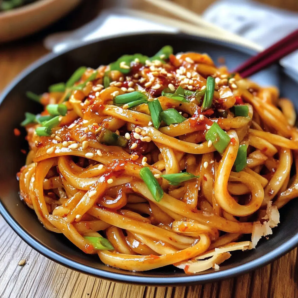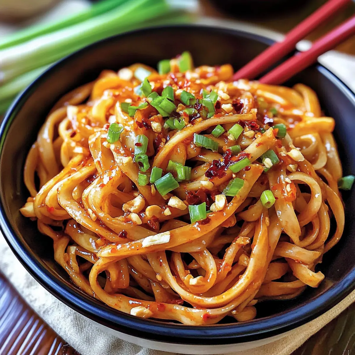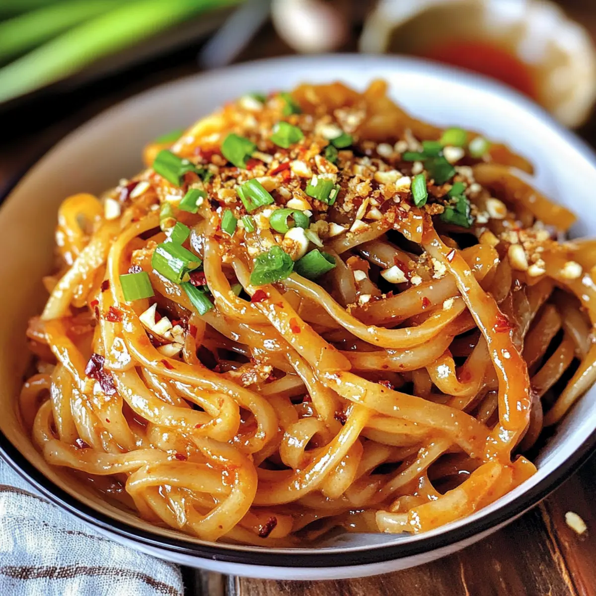 Es ist wie ein kleiner Wettlauf gegen die Zeit: Der Hunger kriecht heran, und ich habe nur 10 Minuten, um ein schmackhaftes, würziges Gericht auf den Tisch zu zaubern. Die Knoblauch-Chili-Öl-Nudeln sind mein Geheimtipp für solche Situationen! Mit einem aufregenden Mix aus knusprigem Knoblauch, scharfen Chili und nussigem Sesam bietet dieses Rezept nicht nur eine schnelle Lösung für den Alltag, sondern macht auch jeden Bissen zu einem kleinen Geschmackserlebnis. Die flexiblen Variationen, die glutenfreie Optionen erlauben, machen diese Nudeln zu einer perfekten Wahl für alle, die mal etwas Neues probieren möchten. Neugierig, wie du dieses köstliche Gericht in wenigen Minuten zubereiten kannst? Lass uns gleich loslegen! Warum sind Knoblauch-Chili-Öl-Nudeln genial? Schnelligkeit: In weniger als 10 Minuten kreierst du ein außergewöhnliches Gericht, das perfekt in einen hektischen Alltag passt. Würzige Aromen: Die Kombination aus frischem Knoblauch, scharfen Chili und nussigem Sesam sorgt für eine Geschmacksexplosion, die jeden Bissen unvergesslich macht. Anpassungsfähig: Du kannst die Nudeln nach Belieben austauschen – ob glutenfrei oder mit Vollkorn, für alle Vorlieben ist etwas dabei! Vielfältig: Ob allein oder als Basis für Gemüse und Proteine, diese Nudeln sind wahre Alleskönner. Probiere sie zusammen mit chinesischen Salz-Pfeffer-Hühnerflügeln für ein komplettes Menü! Küchenfreundlich: Alle Zutaten sind leicht erhältlich und die Zubereitung benötigt nur eine Pfanne, was den Abwasch minimal hält und die Freude maximiert. Lieblingsgericht: Ob für einen schnellen Imbiss oder als beeindruckendes Essen für Gäste, Knoblauch-Chili-Öl-Nudeln sind immer ein Hit! Knoblauch-Chili-Öl-Nudeln Zutaten • Hier sind die köstlichen Zutaten, die du benötigst! Für die Nudeln Breite Weizennudeln – Diese sind die Hauptquelle für Kohlenhydrate und geben Struktur; du kannst sie auch durch Reisnudeln ersetzen, um glutenfrei zu sein. Öl – Dies wird verwendet, um die Aromen zu rösten und die Chili-Öl-Mischung zu erzeugen; normales Pflanzenöl eignet sich hervorragend. Für das Aroma Knoblauch – Füge einen scharfen, herzhaften Geschmack hinzu; verwende nur frischen Knoblauch für die besten Ergebnisse. Frühlingszwiebeln – Sie sorgen für frischen, kräuterigen Geschmack; benutze sowohl die grünen als auch die weißen Teile für einen vollen Geschmack. Rote Chiliflocken – Diese geben die nötige Schärfe; passe die Menge je nach gewünschtem Schärfegrad an. Weiße Sesamsamen – Fügen einen nussigen Geschmack hinzu; geröstete Sesamsamen liefern ein intensiveres Aroma. Für die Würze Rotes Chilipulver oder geräucherte Paprika – Provide additional warmth; smoked paprika is milder and perfect for a gentle flavor. Hühnerbrühpulver – Verstärkt den herzhaften Umami-Geschmack; kann weggelassen oder durch Gemüsebrühe ersetzt werden, um das Gericht vegetarisch zu gestalten. Dunkle Sojasauce – Verleiht eine reichhaltige Farbe und Tiefe; in einer Notlage kannst du auch normale Sojasauce verwenden, verringere dann die Menge. Helle Sojasauce – Sie fügt Salzigkeit hinzu; hier ist eine Verwechslung mit der dunklen Sojasauce zu vermeiden. Reisessig (oder Weißweinessig) – Balanciert die Aromen mit Säure; sei hier vorsichtig im Umgang, eine kleine Menge reicht aus. Brauner Zucker – Bringt einen Hauch von Süße, um die Schärfe auszugleichen; kann auch durch Honig ersetzt oder ganz weggelassen werden. Geröstetes Sesamöl – Gibt dem Gericht den letzten Pfiff; verwende es sparsam, da es stärker ist als normales Sesamöl. Entdecke die köstlichen Möglichkeiten mit diesen Knoblauch-Chili-Öl-Nudeln, die schnell zubereitet sind und wunderbare Geschmäcker vereinen! Schritt-für-Schritt-Anleitung für Knoblauch-Chili-Öl-Nudeln Step 1: Nudeln kochen Bringe in einem großen Topf Wasser zum Kochen und füge die breiten Weizennudeln hinzu. Koche sie gemäß den Anweisungen auf der Verpackung, bis sie al dente sind, normalerweise etwa 6-8 Minuten. Wenn die Nudeln fertig sind, bewahre ¼ Tasse des stärkehaltigen Wassers auf, bevor du sie abgießt. Step 2: Aromatische Zutaten anbraten Erhitze in einer großen Pfanne bei mittlerer Hitze etwas Öl. Gib den gewürfelten Knoblauch und den weißen Teil der Frühlingszwiebeln hinzu. Füge die roten Chiliflocken und die Sesamsamen hinzu und brate alles für etwa 2-3 Minuten an, bis der Knoblauch goldbraun und die Zwiebeln knusprig sind. Pass auf, dass der Knoblauch nicht verbrennt! Step 3: Gewürze hinzufügen Streue das rote Chilipulver oder die geräucherte Paprika in die Pfanne und brate sie für eine weitere Minute an, damit sich die Aromen entfalten. Rühre gut um und achte darauf, dass die Mischung nicht anbrennt. Die Pfanne wird jetzt sehr duftend sein, und die Farben der Gewürze sollten lebendig erscheinen. Step 4: Stärkewasser einfüllen Gieße das zuvor aufbewahrte stärkehaltige Wasser in die Pfanne, um das Kochen der Aromen zu stoppen. Rühre kräftig um, damit sich alles gut vermischt. Du wirst feststellen, dass die Sauce eine glänzende Konsistenz annimmt, während sie beginnt, sich zu verbinden. Step 5: Würzen und vermischen Füge das Hühnerbrühpulver, die dunkle und helle Sojasauce, den Reisessig, das geröstete Sesamöl und den braunen Zucker in die Pfanne. Rühre alles gut um, damit sich die Aromen vollständig entfalten. Die Sauce sollte jetzt einen reichem, würzigen Geschmack haben — ideal für die Knoblauch-Chili-Öl-Nudeln. Step 6: Nudeln einarbeiten Gib die heißen, gekochten Nudeln direkt in die Pfanne mit der Sauce. Mische alles gut durch, sodass die Nudeln gleichmäßig mit der würzigen Sauce überzogen sind. Achte darauf, dass du die Nudeln zügig umrührst, damit sie die köstlichen Aromen vollständig aufnehmen. Step 7: Servieren und garnieren Richte die Knoblauch-Chili-Öl-Nudeln auf Tellern an und garniere sie mit zusätzlichem Chili-Crisp, Sesamsamen und den restlichen grünen